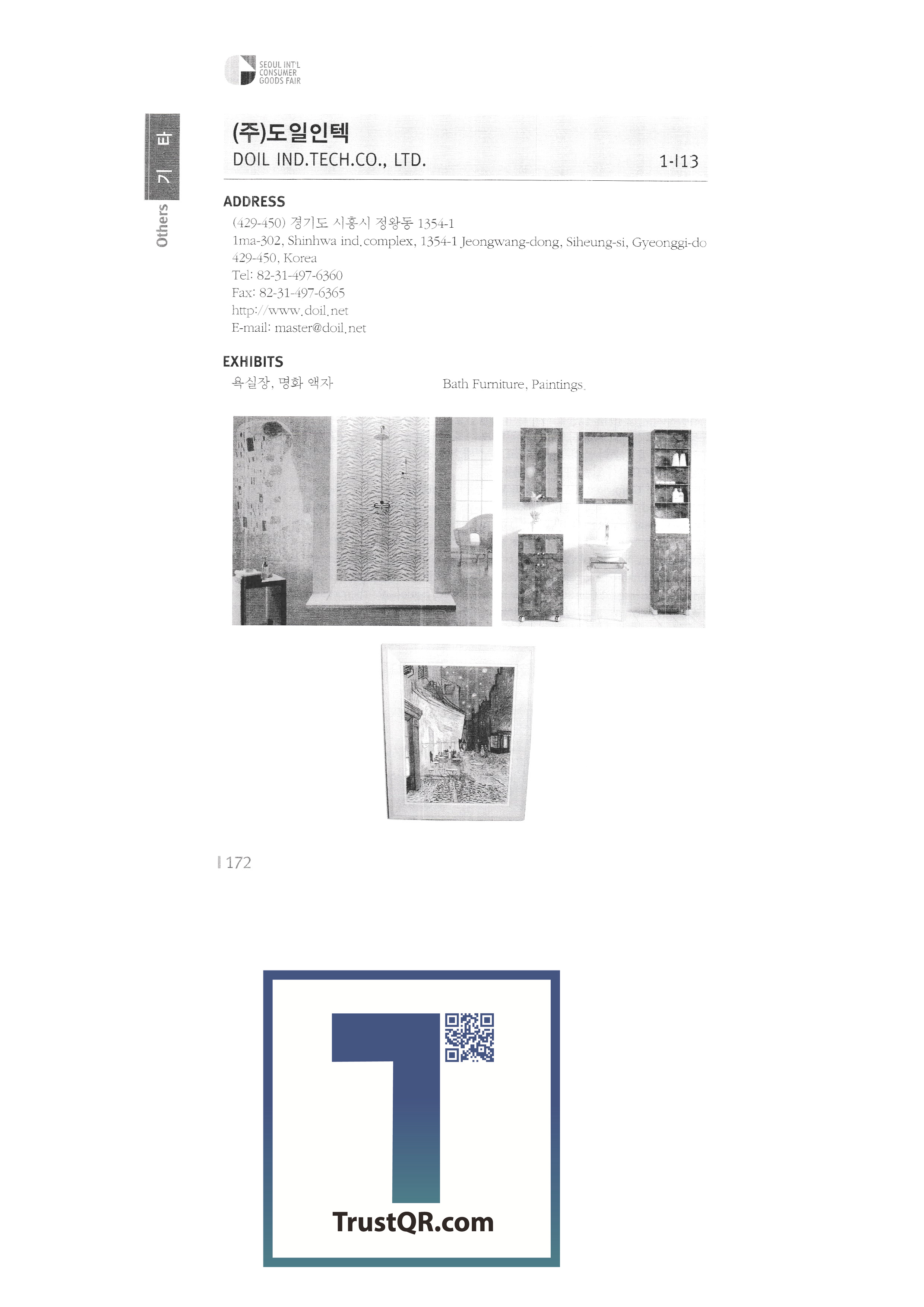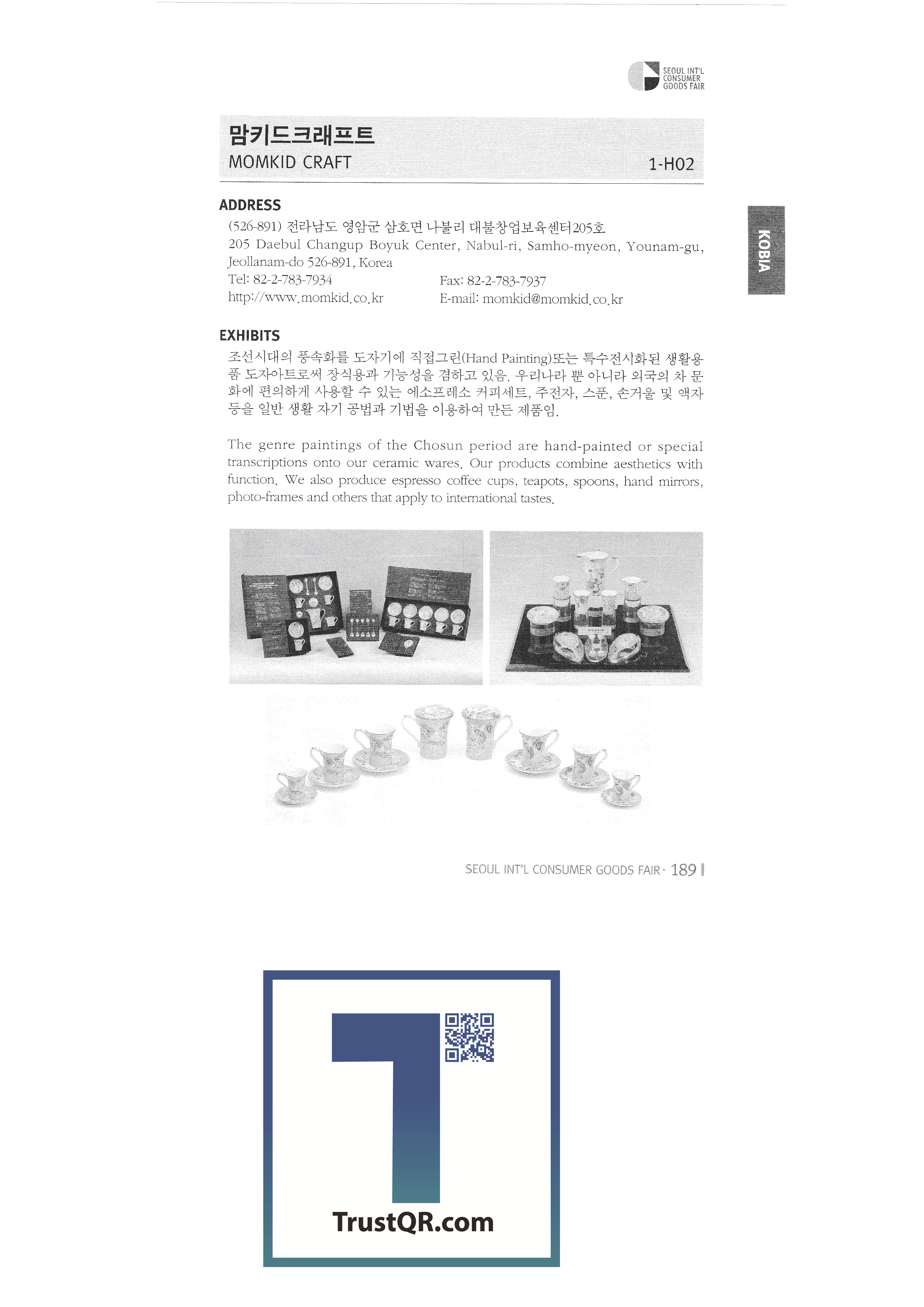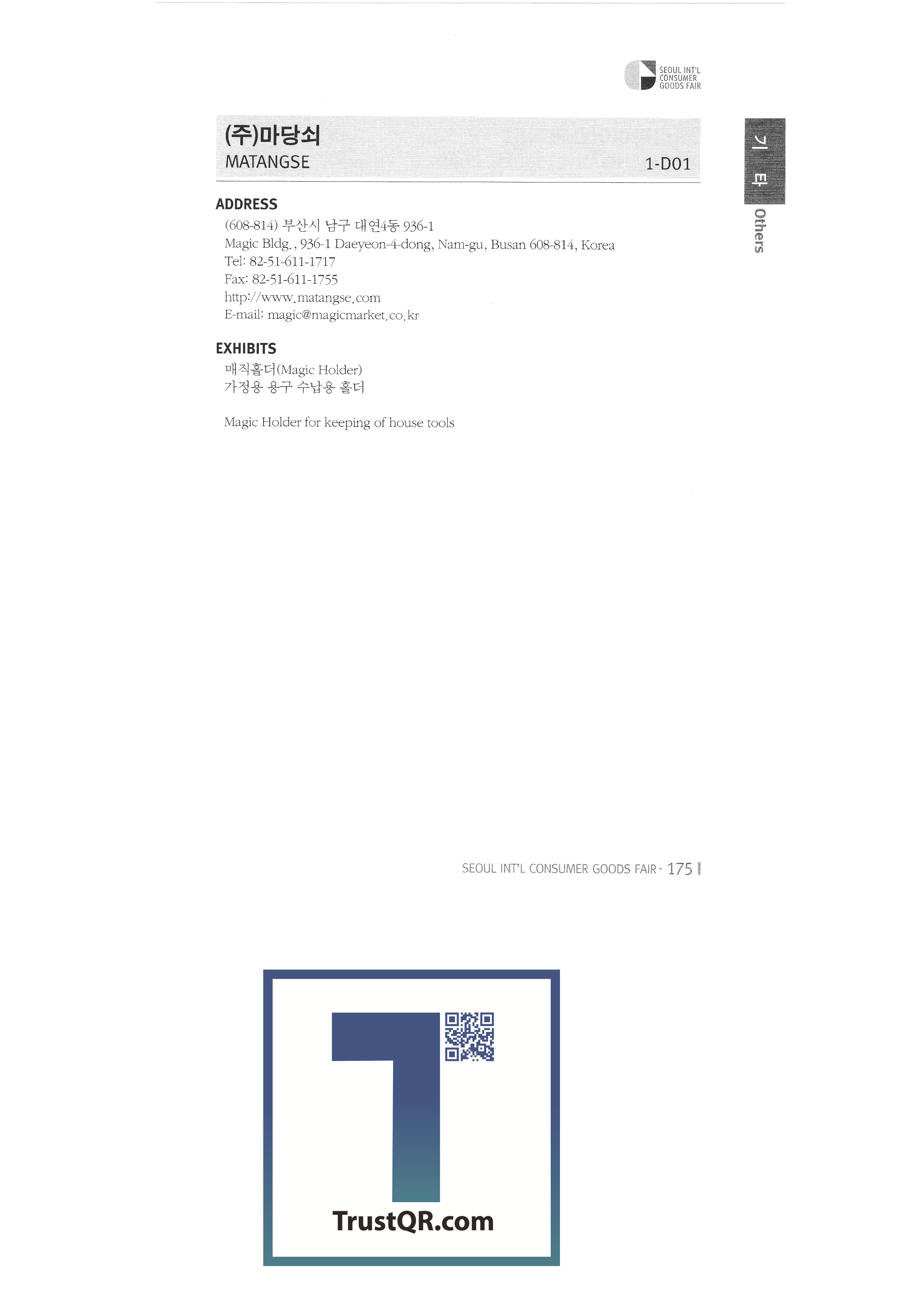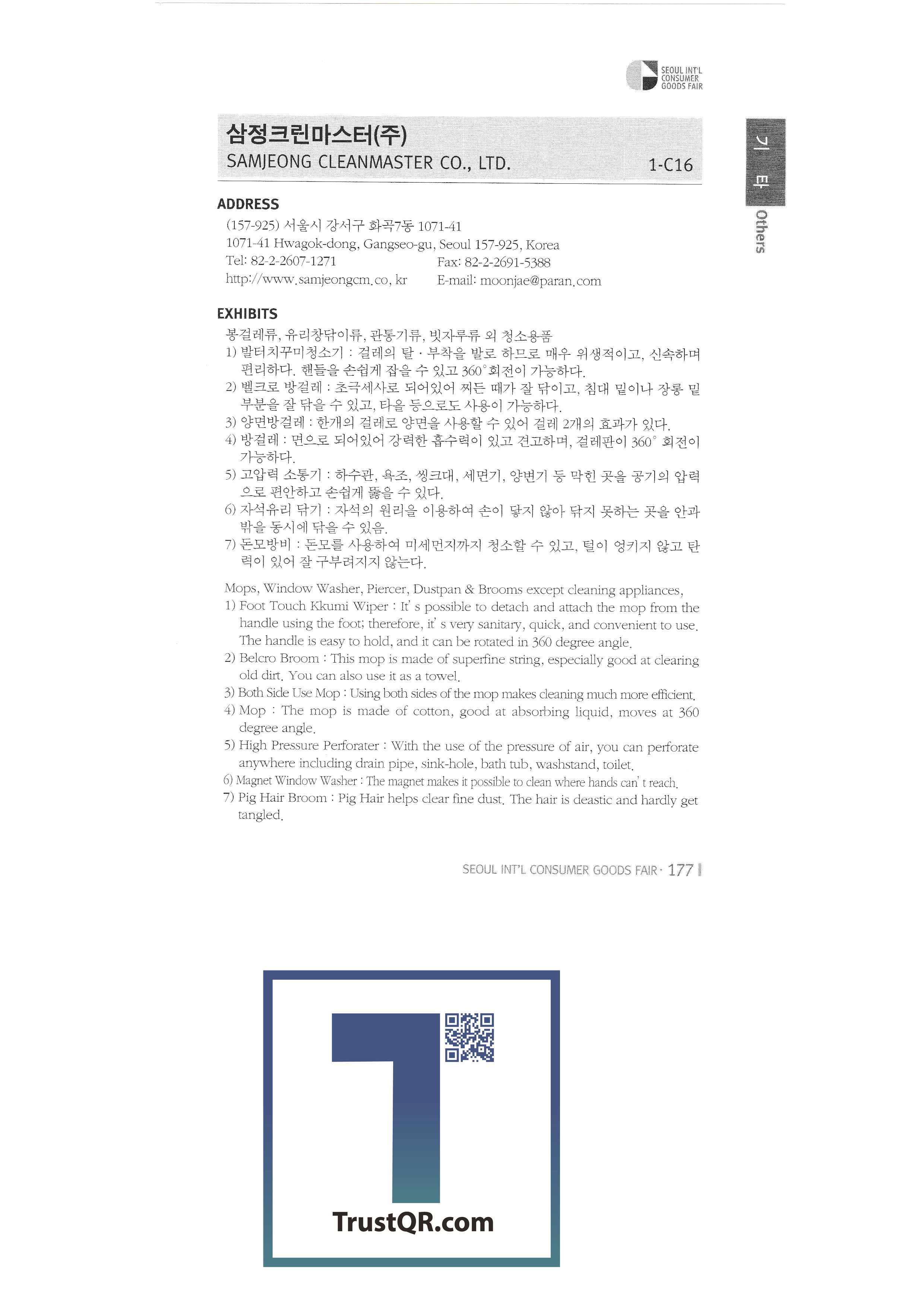 2005, International Consumer Goods Fair, Onebio Co., Ltd. James Vision KMG Co., Ltd. Tech Worm Geoseong Co., Ltd. Geumgye Food Doil Intech Digital sign Richmine Madangsoe Co., Ltd. Maekyung Bias Guide Samjung Clean Master Co., Ltd. Smit Industry A-Tech Co., Ltd. Euphoresis Co., Ltd. Zephyr Industry Co., Ltd. Powerlet Co., Ltd. Phil Aroma Hannaeum Co., Ltd. Hana Tools Co., Ltd. Korea Business Incubation Association Gaiamo Co., Ltd. Daishin Horticultural Corporation Mom Kid Craft Shinhwa BLOWER Sevio Co., Ltd. MWC Wanseok Engineering Woori Culture Wooyeon MS Korea Clean System Seoul Regional Small and Medium Business Administration Dowzone Farm Move Zone J Yushin Hat Yupyeong Technology Co., Ltd. Movens JC Tech Co., Ltd. Jinyang Medical Trade Charmsori Electronic Communication |