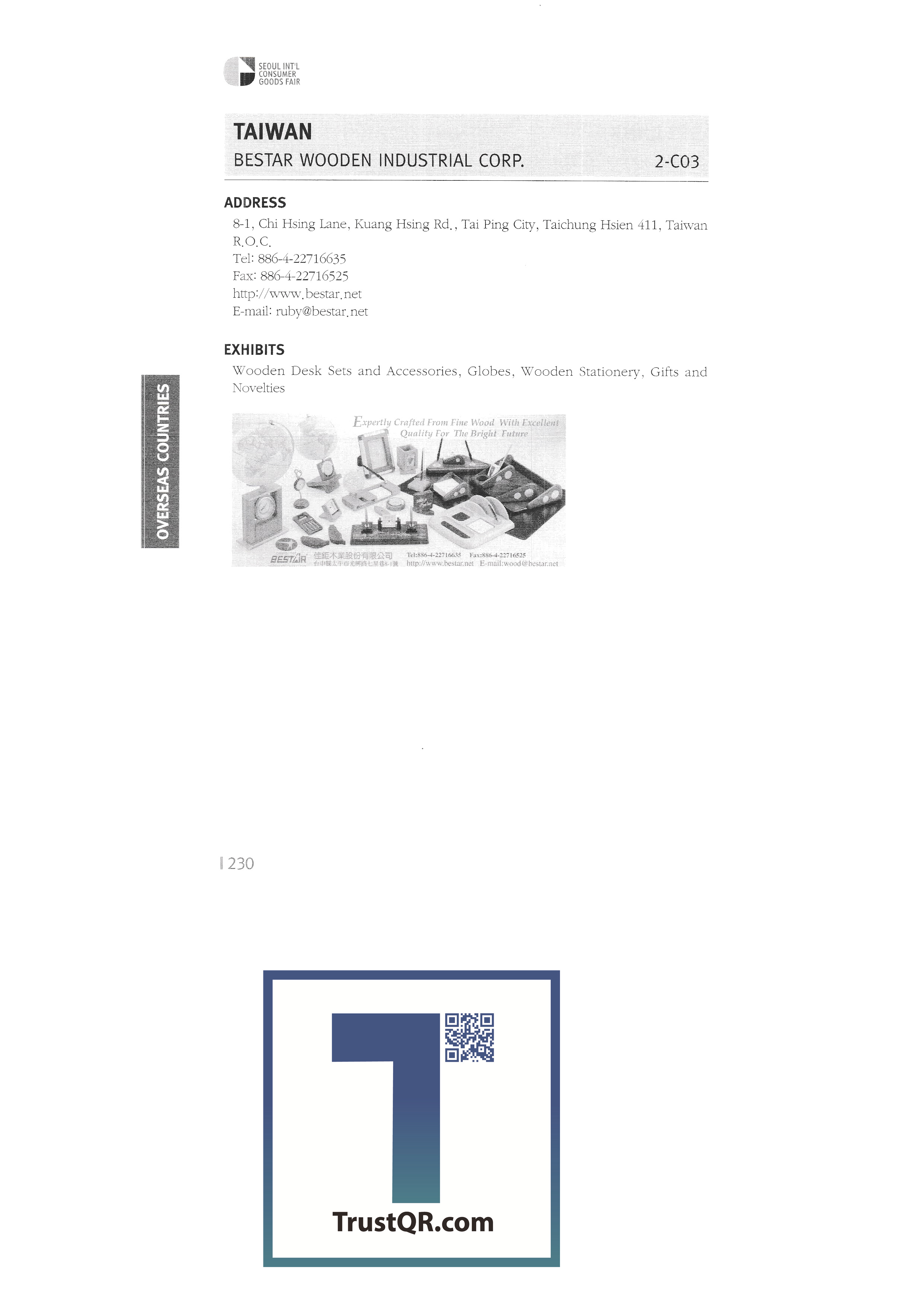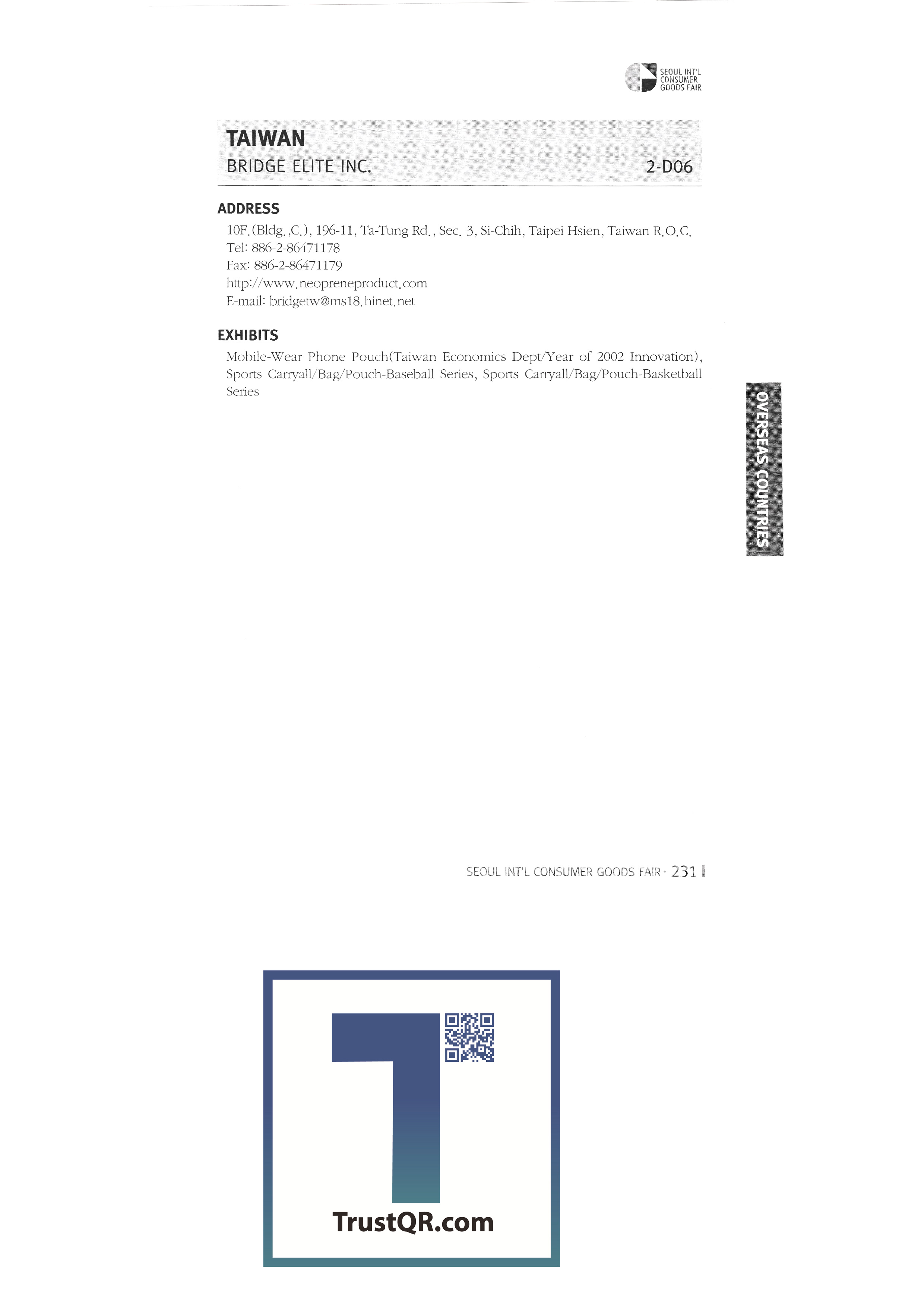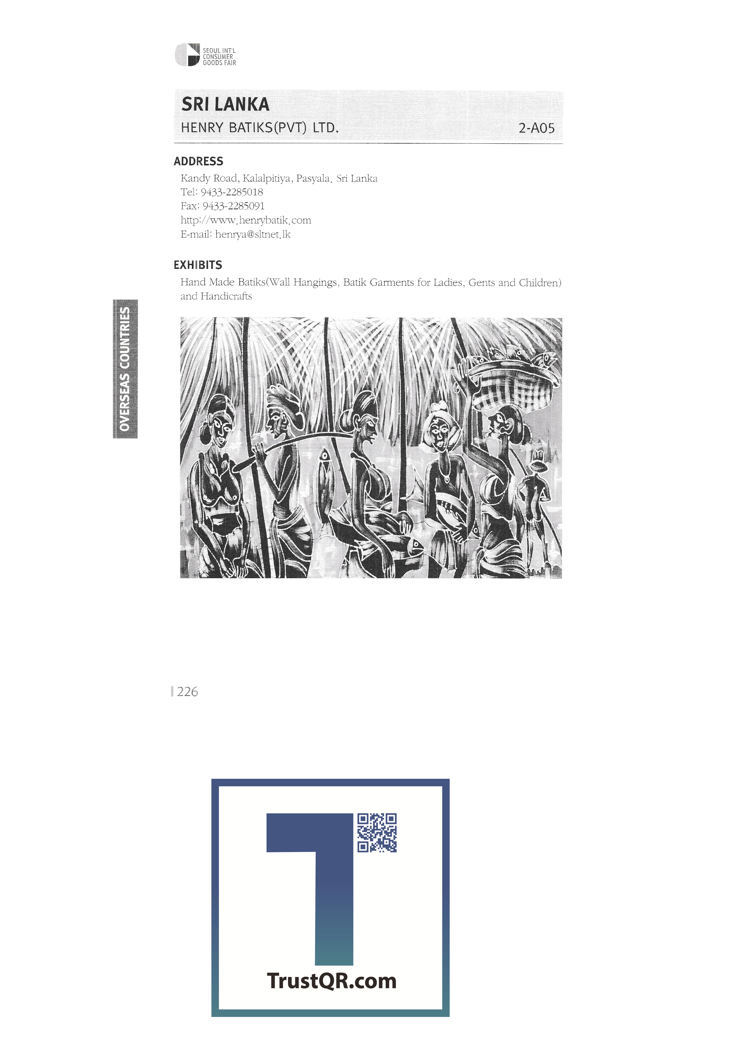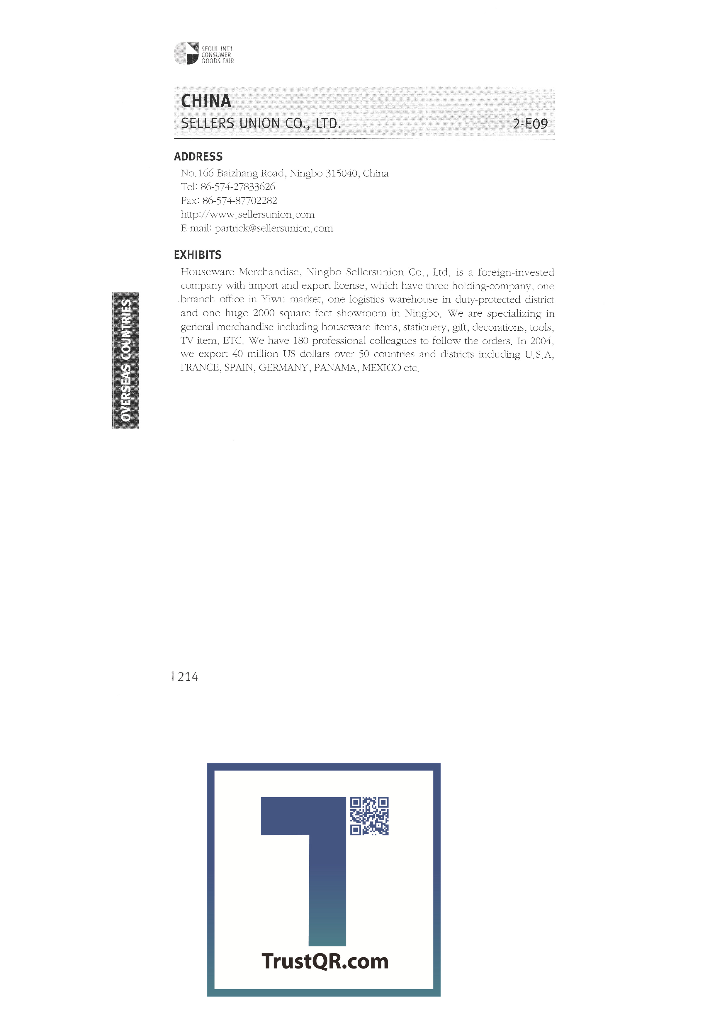 2005, International Consumer Goods Fair, Clinton Pacifico Co., Ltd. Herbal Medicine Village PROMED KOREA PTY.LTD. CHANGSHU LIBAO DECORATIVE MATERIAL CO.,LTD CHAOAN ZHENYUAN HARDWARE PRODUCTS CO.,LTD SELLERS UNION CO.,LTD SHANGIHAI SCHOLAR'S CERAMICS & ART CO., LTD SUZHOU HUA HENG HOME TEXTILE CO.,LTD XIAMEN TAIMAO UMBRELLA & DAILY EXPENSES PRODUCTS CO.,LTD RED STAR CERAMICS LIMITED CORDIALE IMPEX PVT.LTD HOYU INDUSTRY INC. 25 HOURS WATCH GALLERY SANSON HOUSWERE & KITCHENWARE PROJECTS CRYSTAL QUALITY EXPORTS GREEN WAY ASIA ENTERPRISES HEIM ENGINEERING HENRY BATIKS(PVT) LTD MACKWOODS LIMITED SRI LANKA EXPORT DEVELOPMENT BOARD(EDB) SUVIK EXPO(PVT) LTD BESTAR WOODEN INDUSTRIAL CORP BRIDGE ELITE INC CHARMING IDEA ENTERPRISE CO.,LTD CHIU KUANG HSING CO.,LTD CHUAN MEI HARDWARE INTERNATIONAL CO.,LTD CHUNG KWAN ENTERPRISE CO.,LTD DUTECK INDUSTRIAL CO.,LTD FINE EARTH ENTERPRISE LTD GOOD YARD ENTERPRISE CO.,LTD HNK INT'L CO.,LTD INLIR IND.CORP. NEW GREEN LIFE CORP SMOOTH SAILING INDUSTRY CO.,LTD SOLIDEX INTERNATIONAL INC. SOUNDER TAIWAN CORP STARLING CO.,LTD SYCLE CMW INDUSTRIAL CO.,LTD |