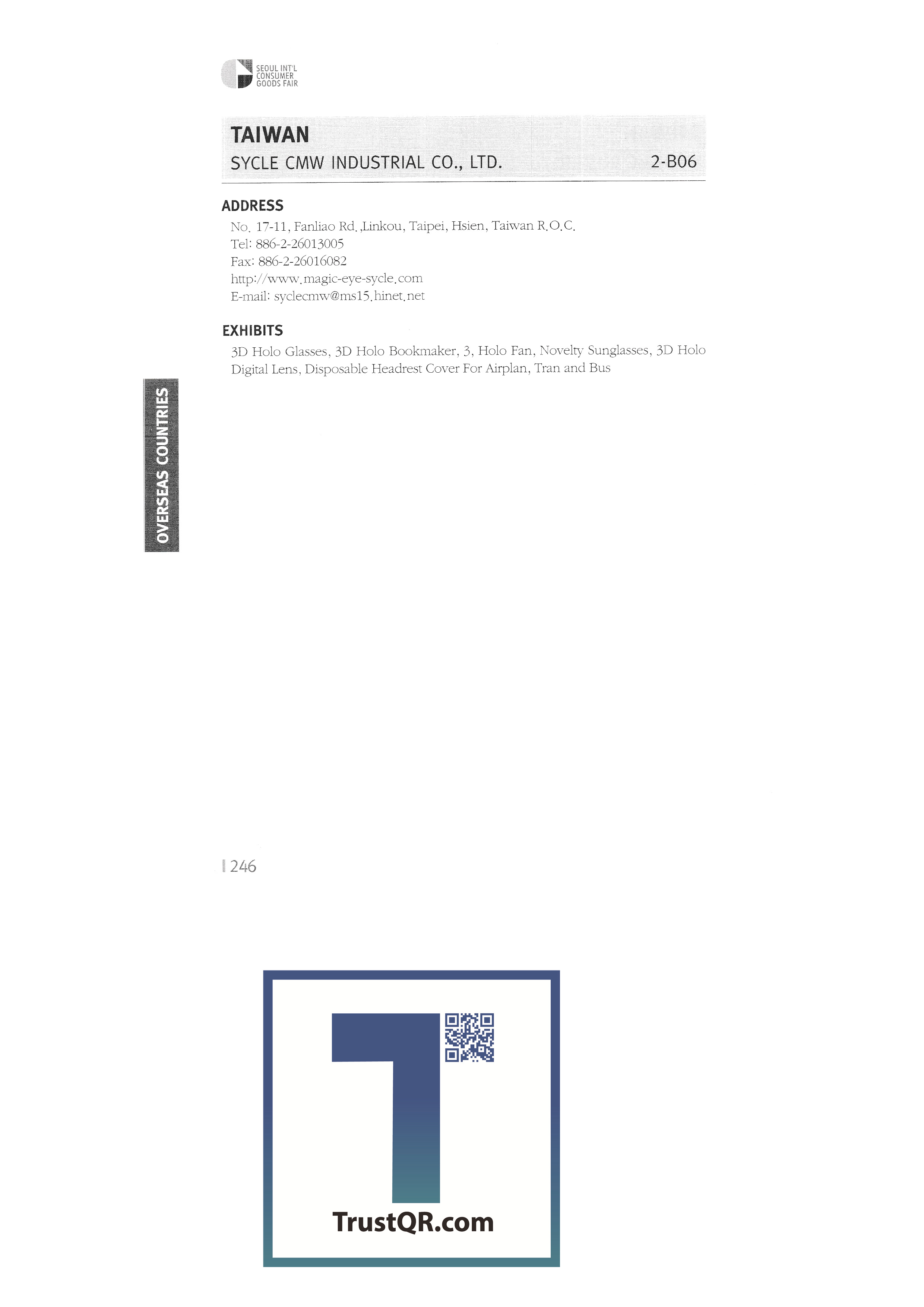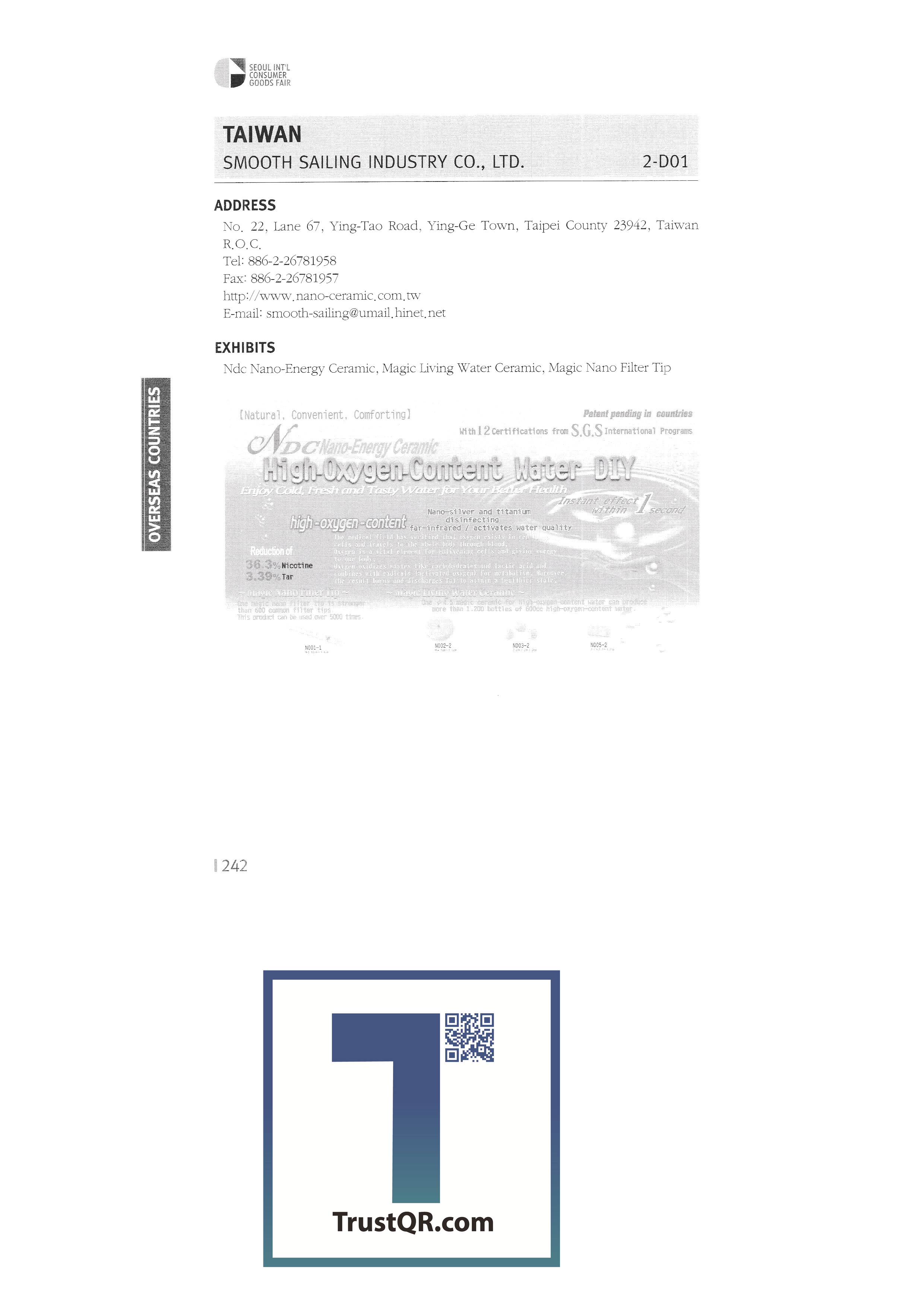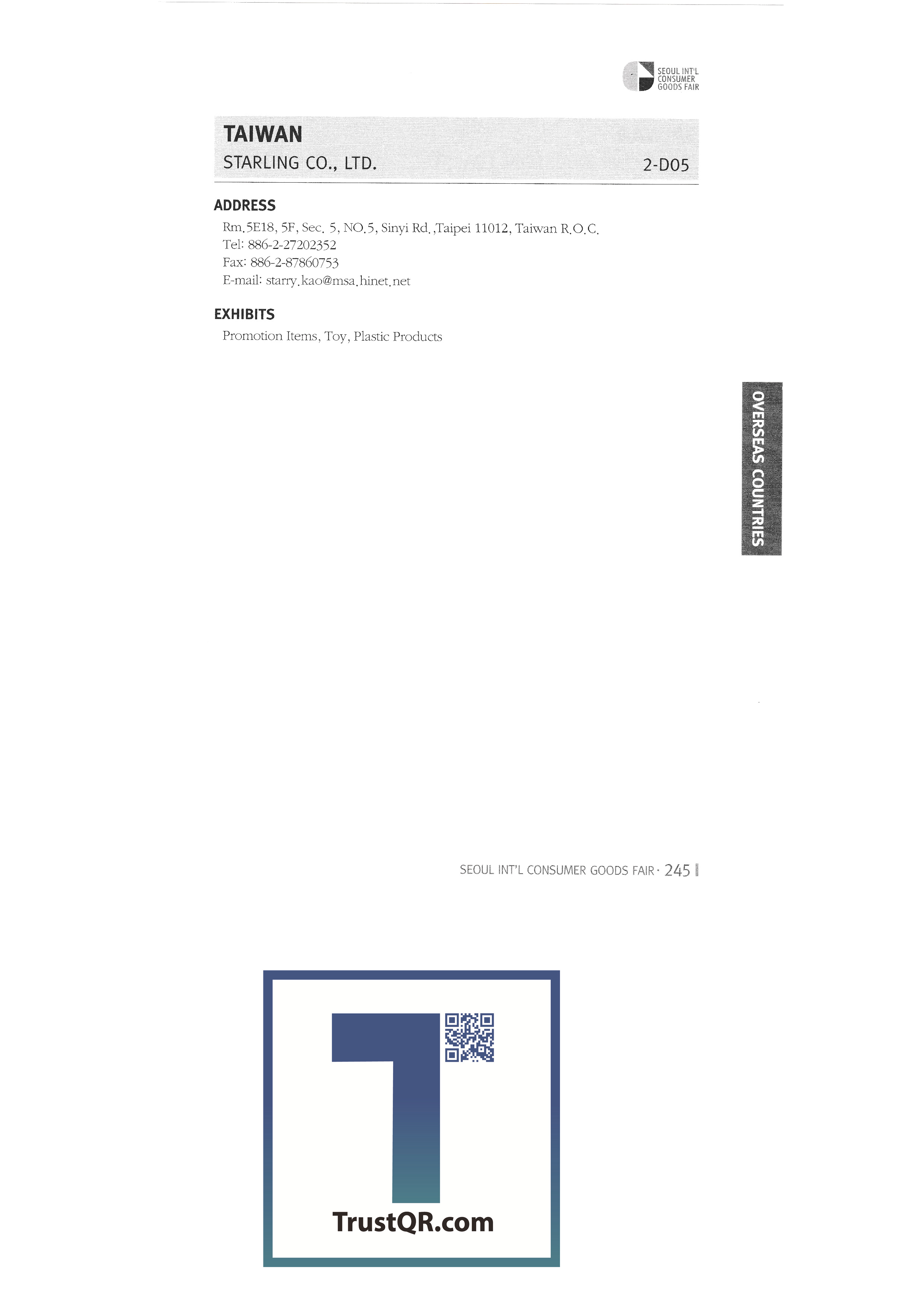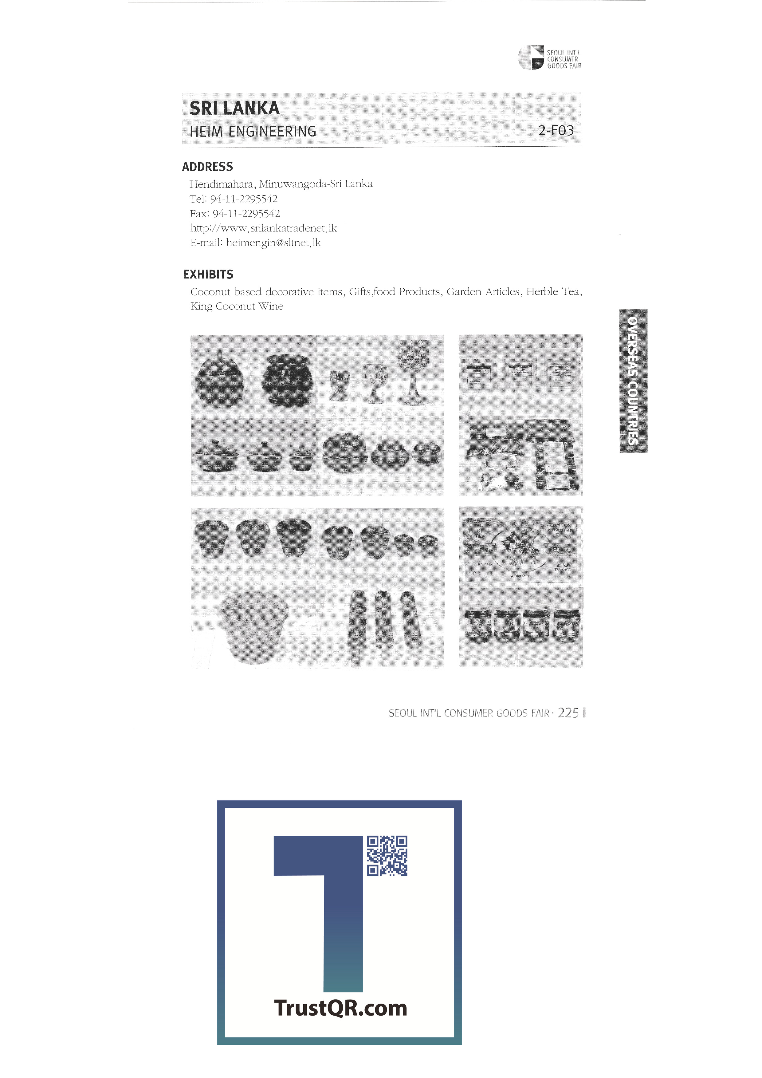 2005, International Consumer Goods Fair, Clinton Pacifico Co., Ltd. Herbal Medicine Village PROMED KOREA PTY.LTD. CHANGSHU LIBAO DECORATIVE MATERIAL CO.,LTD CHAOAN ZHENYUAN HARDWARE PRODUCTS CO.,LTD SELLERS UNION CO.,LTD SHANGIHAI SCHOLAR'S CERAMICS & ART CO., LTD SUZHOU HUA HENG HOME TEXTILE CO.,LTD XIAMEN TAIMAO UMBRELLA & DAILY EXPENSES PRODUCTS CO.,LTD RED STAR CERAMICS LIMITED CORDIALE IMPEX PVT.LTD HOYU INDUSTRY INC. 25 HOURS WATCH GALLERY SANSON HOUSWERE & KITCHENWARE PROJECTS CRYSTAL QUALITY EXPORTS GREEN WAY ASIA ENTERPRISES HEIM ENGINEERING HENRY BATIKS(PVT) LTD MACKWOODS LIMITED SRI LANKA EXPORT DEVELOPMENT BOARD(EDB) SUVIK EXPO(PVT) LTD BESTAR WOODEN INDUSTRIAL CORP BRIDGE ELITE INC CHARMING IDEA ENTERPRISE CO.,LTD CHIU KUANG HSING CO.,LTD CHUAN MEI HARDWARE INTERNATIONAL CO.,LTD CHUNG KWAN ENTERPRISE CO.,LTD DUTECK INDUSTRIAL CO.,LTD FINE EARTH ENTERPRISE LTD GOOD YARD ENTERPRISE CO.,LTD HNK INT'L CO.,LTD INLIR IND.CORP. NEW GREEN LIFE CORP SMOOTH SAILING INDUSTRY CO.,LTD SOLIDEX INTERNATIONAL INC. SOUNDER TAIWAN CORP STARLING CO.,LTD SYCLE CMW INDUSTRIAL CO.,LTD |