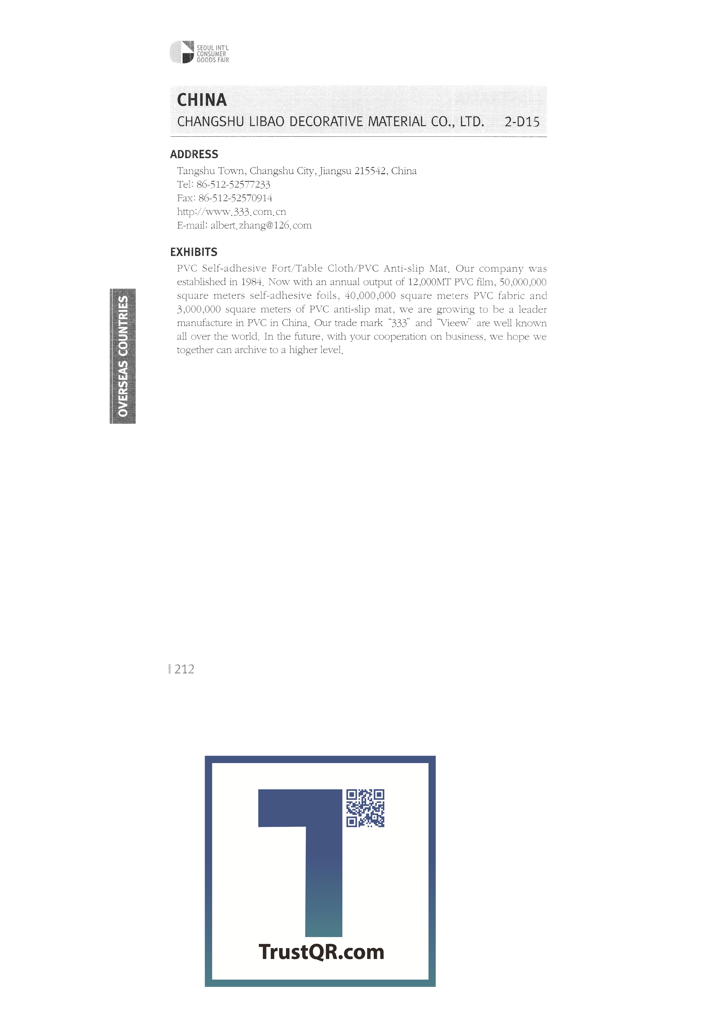2005年国际消费品博览会, 克林顿 太平洋有限公司 草药村 PROMED KOREA PTY.LTD。 常熟市立宝装饰材料有限公司 潮安镇远五金制品有限公司 卖方联盟有限公司 上海书香陶瓷艺术有限公司 苏州华恒家纺有限公司 厦门太茂日用百货有限公司 红星陶瓷有限公司 CORDIALE IMPEX PVT.LTD 和友实业股份有限公司 25小时手表画廊 SANSON HOUSWERE和厨房项目 晶体质量出口 绿道亚洲企业 海姆工程 亨利·巴蒂克斯(PVT)有限公司 麦克伍德有限公司 斯里兰卡出口发展局(EDB) SUVIK EXPO(PVT)LTD 百达木业股份有限公司 桥精英公司 佳意实业有限公司 潮光兴有限公司 川美五金国际有限公司 中关企业有限公司 迪特克实业有限公司 精细地球企业有限公司 佳院实业有限公司 汉克国际有限公司 INLIR IND.CORP。 新绿生活股份有限公司 顺风帆实业有限公司 SOLIDEX INTERNATIONAL INC。 台湾声纳股份有限公司 STARLING CO。,LTD SYCLE CMW INDUSTRIAL CO。,LTD |