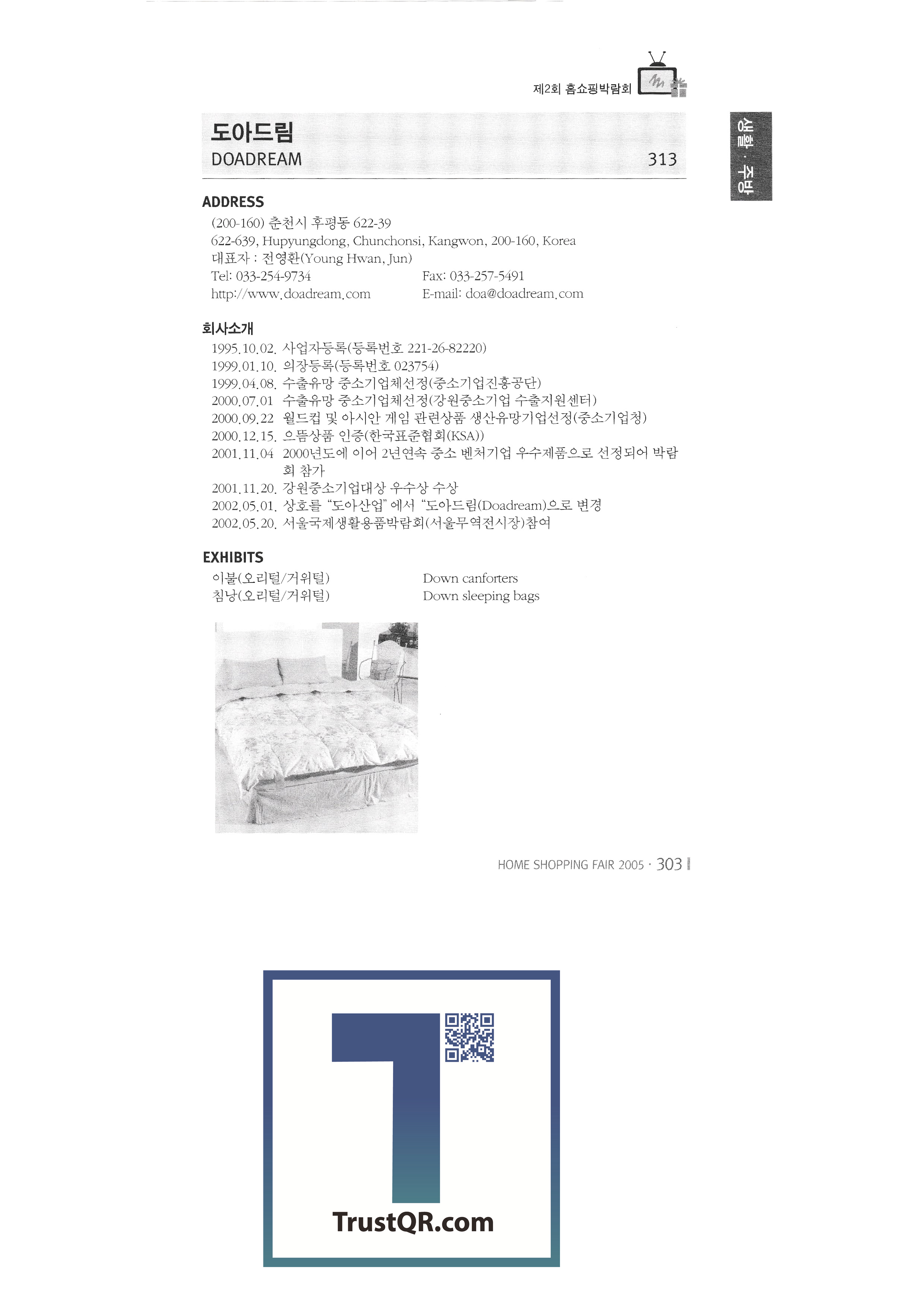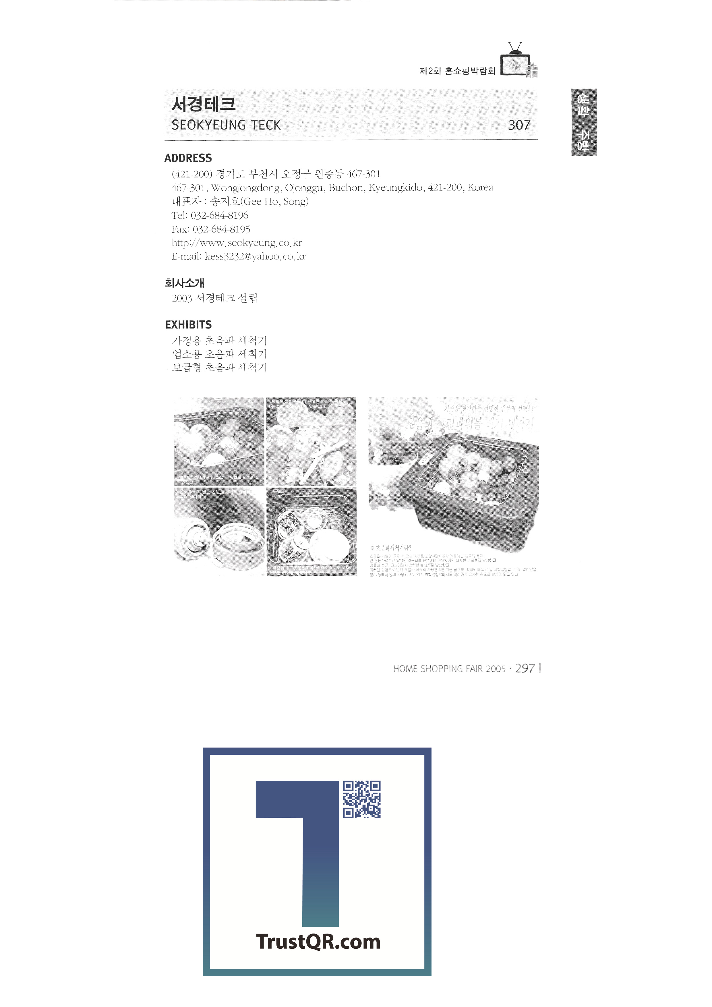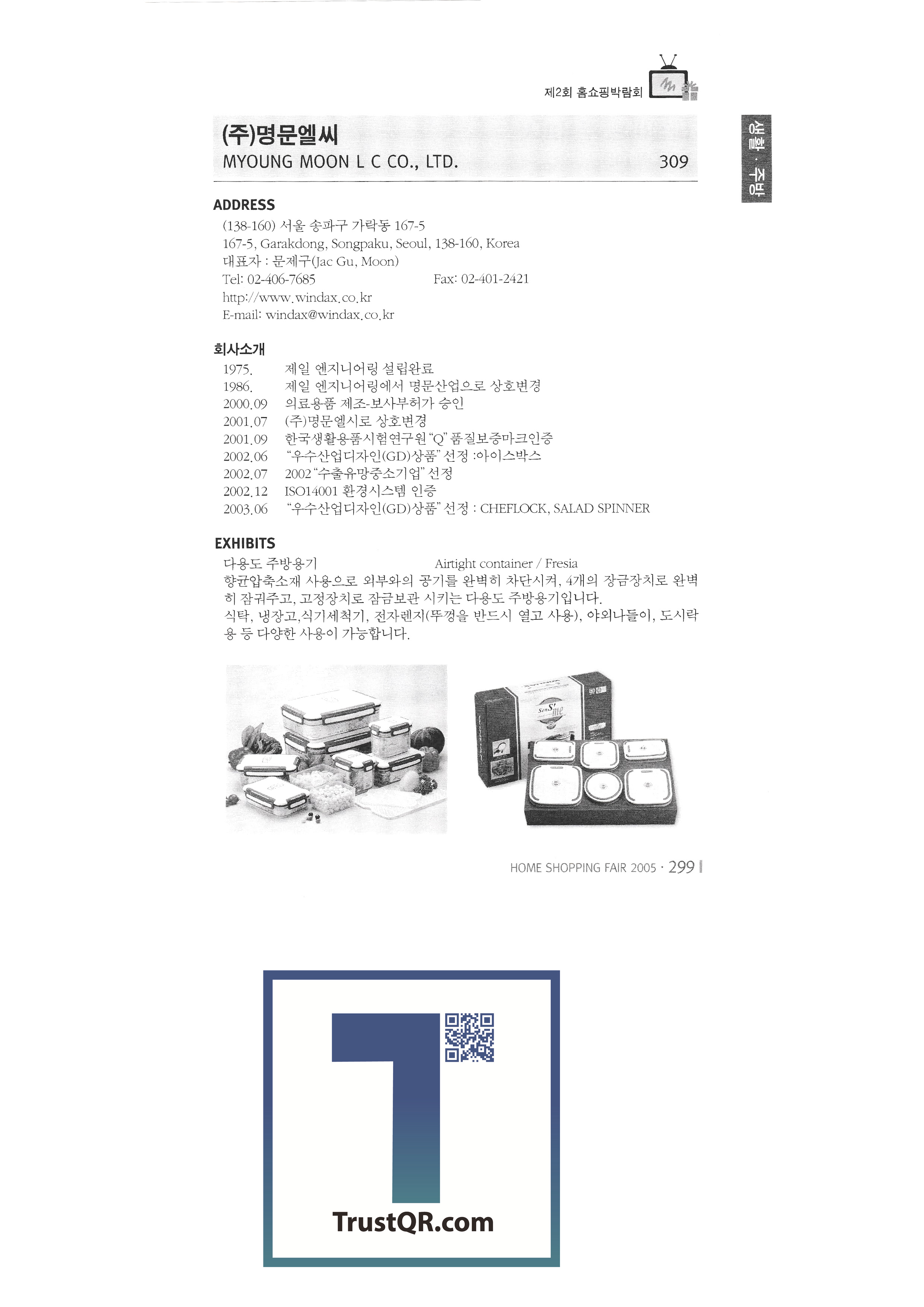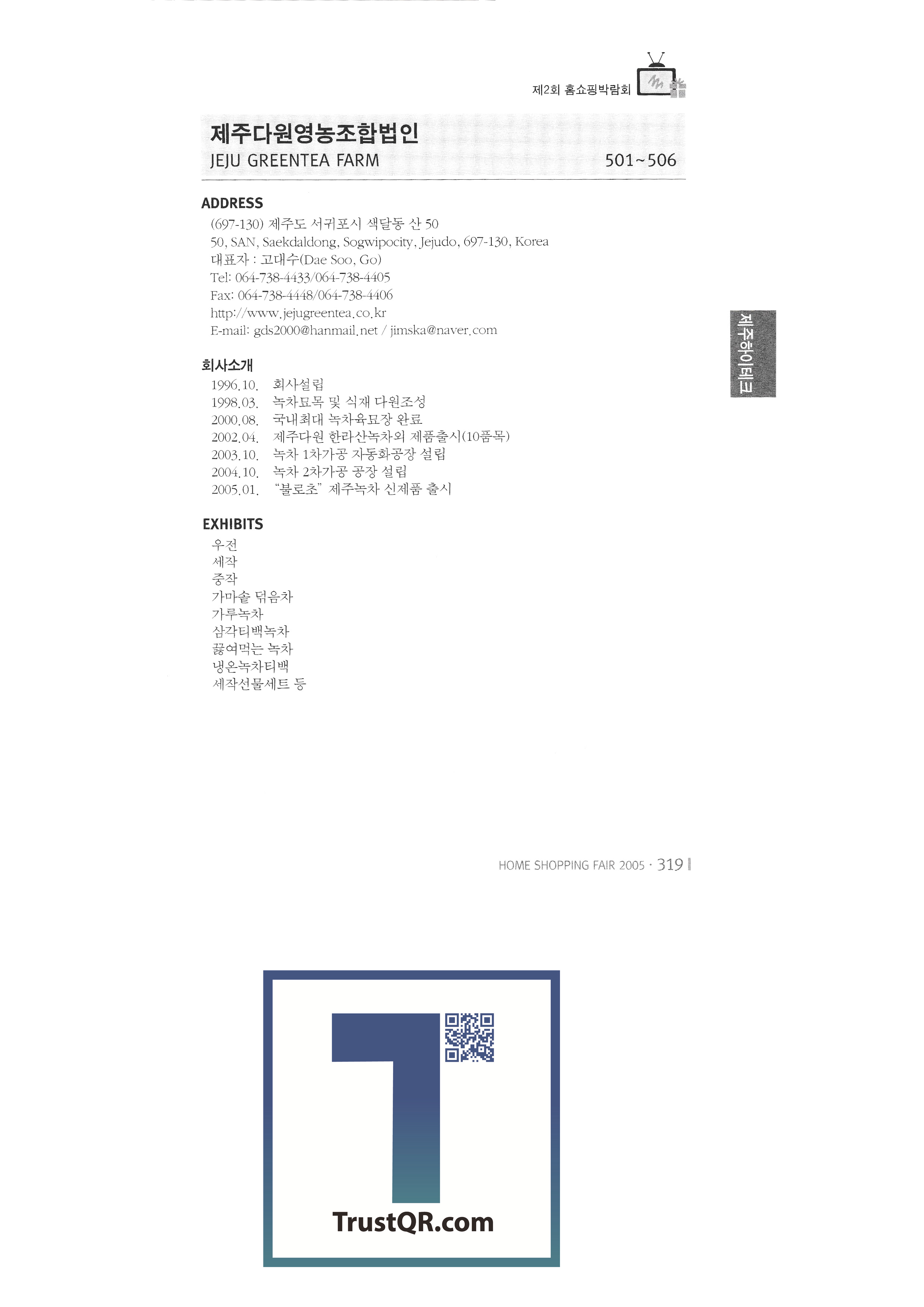 2005, International Consumer Goods Fair, MD Korea Dazzle Co., Ltd. Woori Foods Meerworld J&C Hyunjin Gardening Dong-A Trading Manu Crystal Neo & Neo Seokyung Tech Jungwoo C&C Myeongmoon LC Vision Art Co., Ltd. Perfect Neck Need MDPro Doa Dream Janus Airfall Corporation O'Queen Sungbu Trading Co., Ltd. Aintech information K.I.C.A Booheung Medical Co., Ltd. Coas Zenic Hanil World Co., Ltd. Bunix Inc. Day System Co., Ltd. Jeju High-Tech Industry Promotion Agency Aran Jeju Love Jeju Dawon Farming Association Corporation |