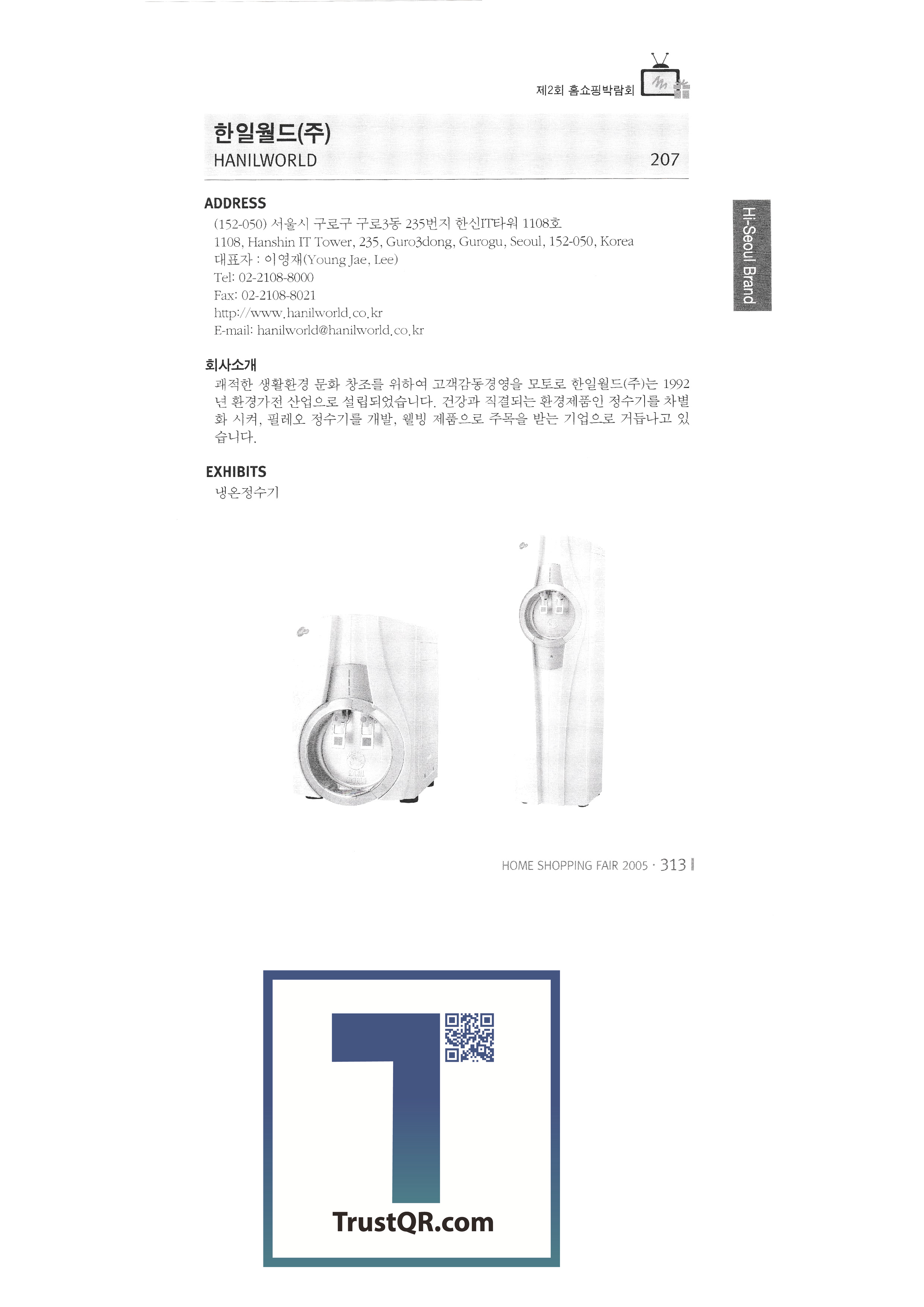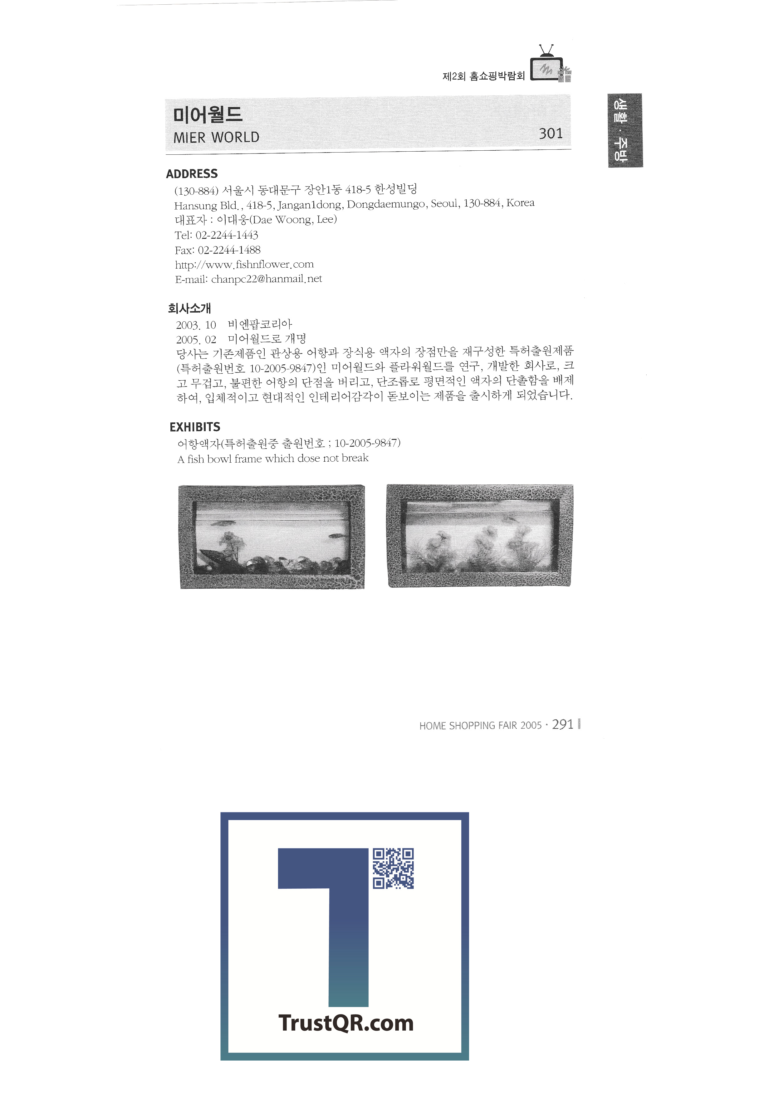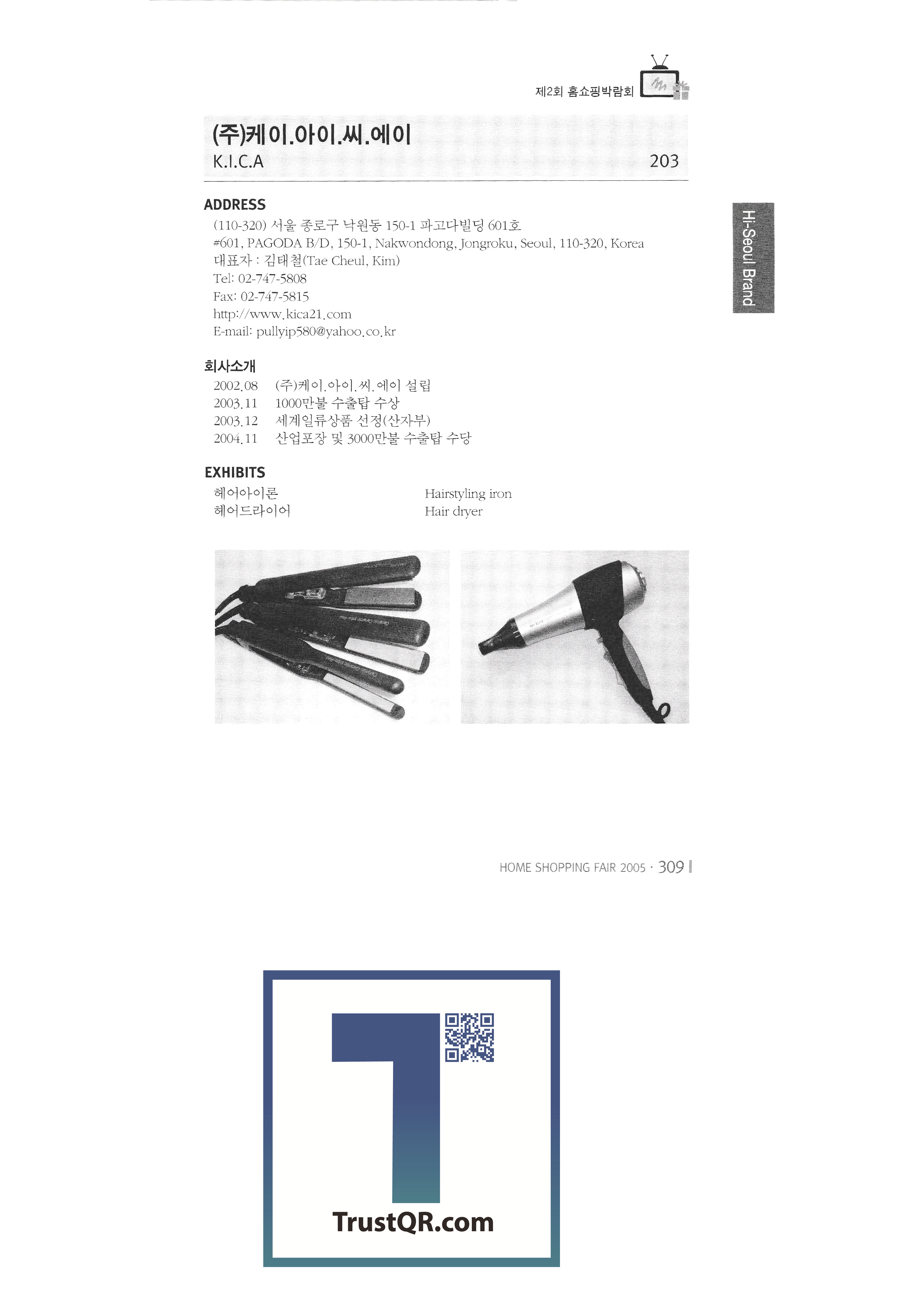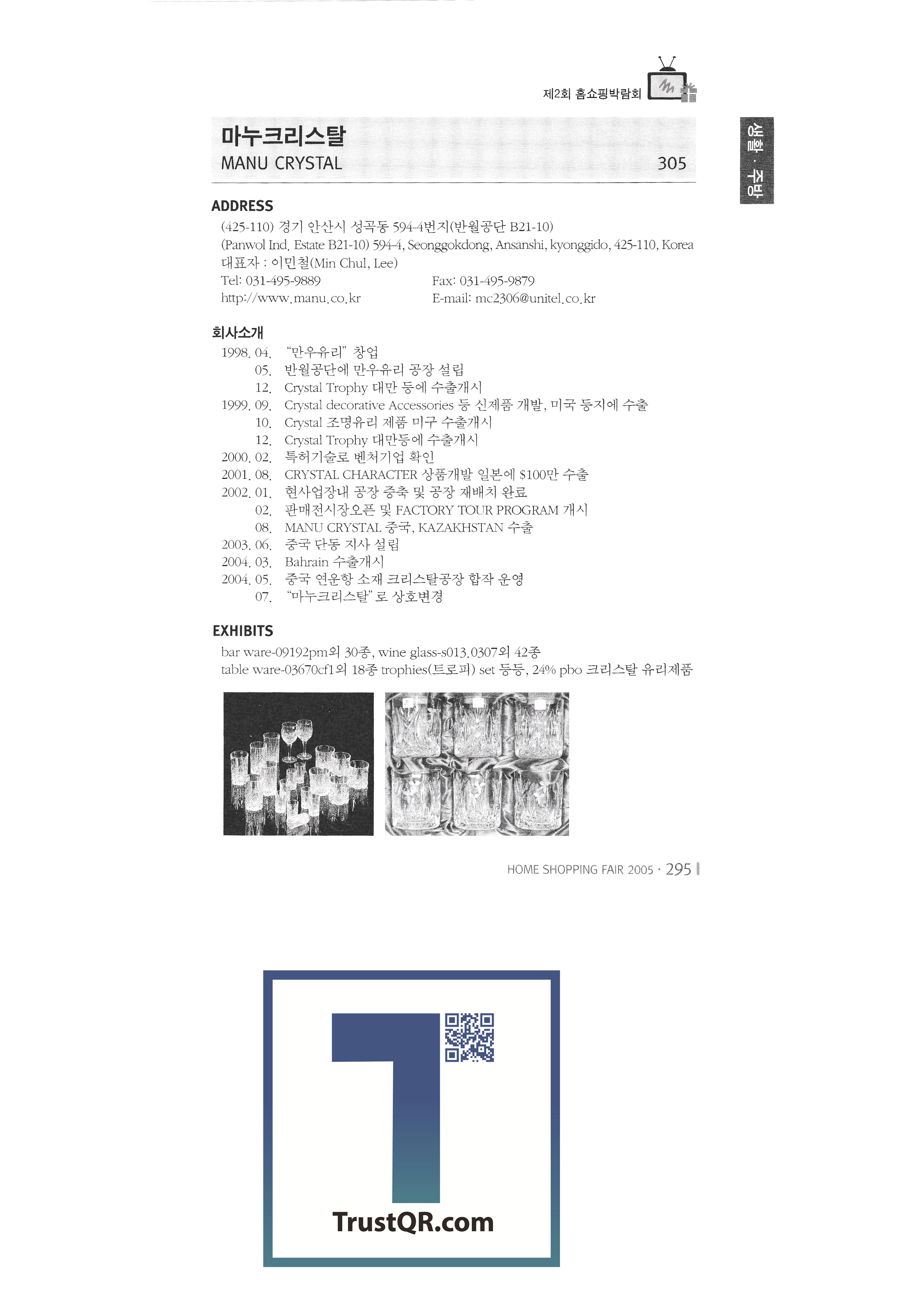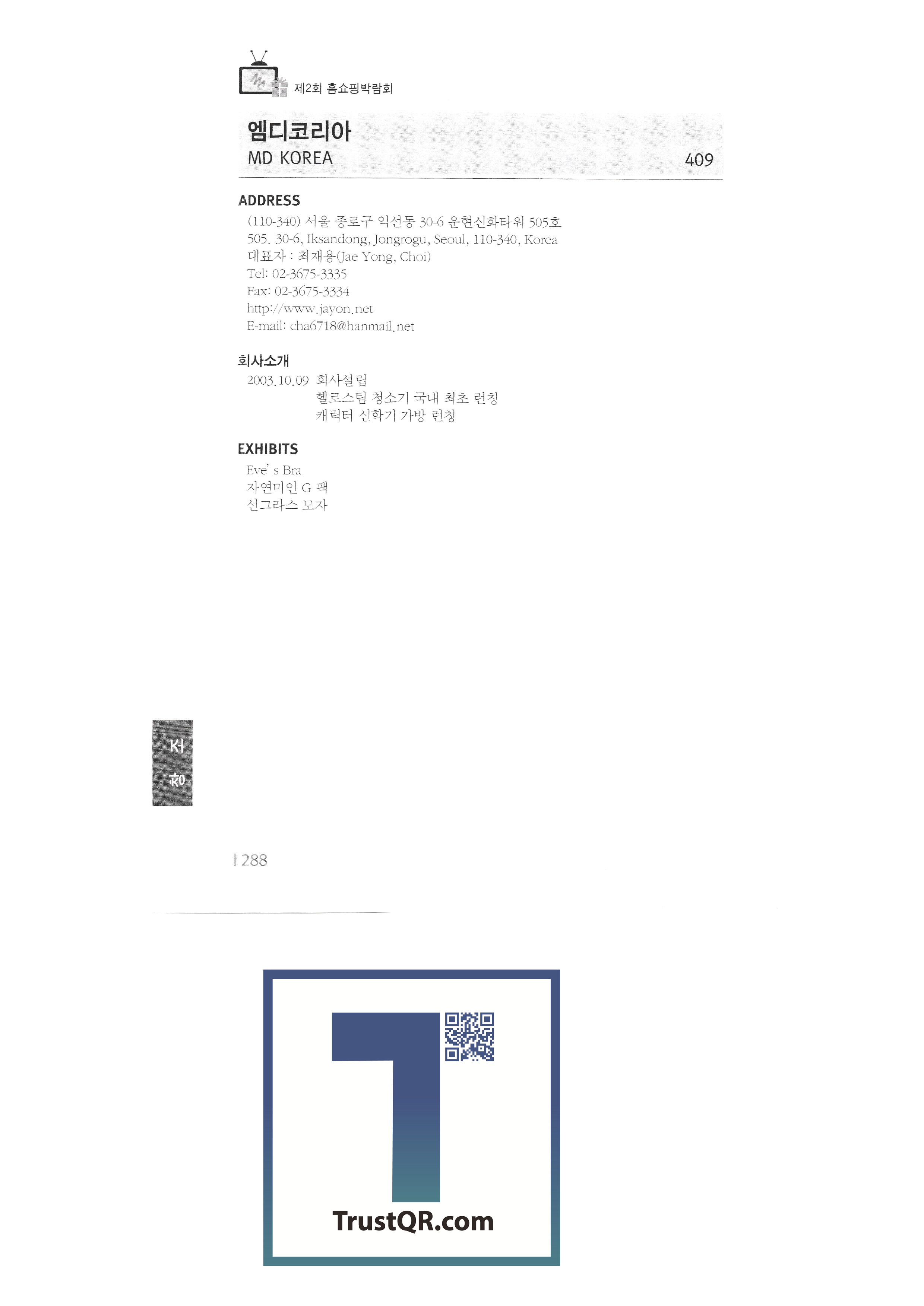 2005, International Consumer Goods Fair, MD Korea Dazzle Co., Ltd. Woori Foods Meerworld J&C Hyunjin Gardening Dong-A Trading Manu Crystal Neo & Neo Seokyung Tech Jungwoo C&C Myeongmoon LC Vision Art Co., Ltd. Perfect Neck Need MDPro Doa Dream Janus Airfall Corporation O'Queen Sungbu Trading Co., Ltd. Aintech information K.I.C.A Booheung Medical Co., Ltd. Coas Zenic Hanil World Co., Ltd. Bunix Inc. Day System Co., Ltd. Jeju High-Tech Industry Promotion Agency Aran Jeju Love Jeju Dawon Farming Association Corporation |