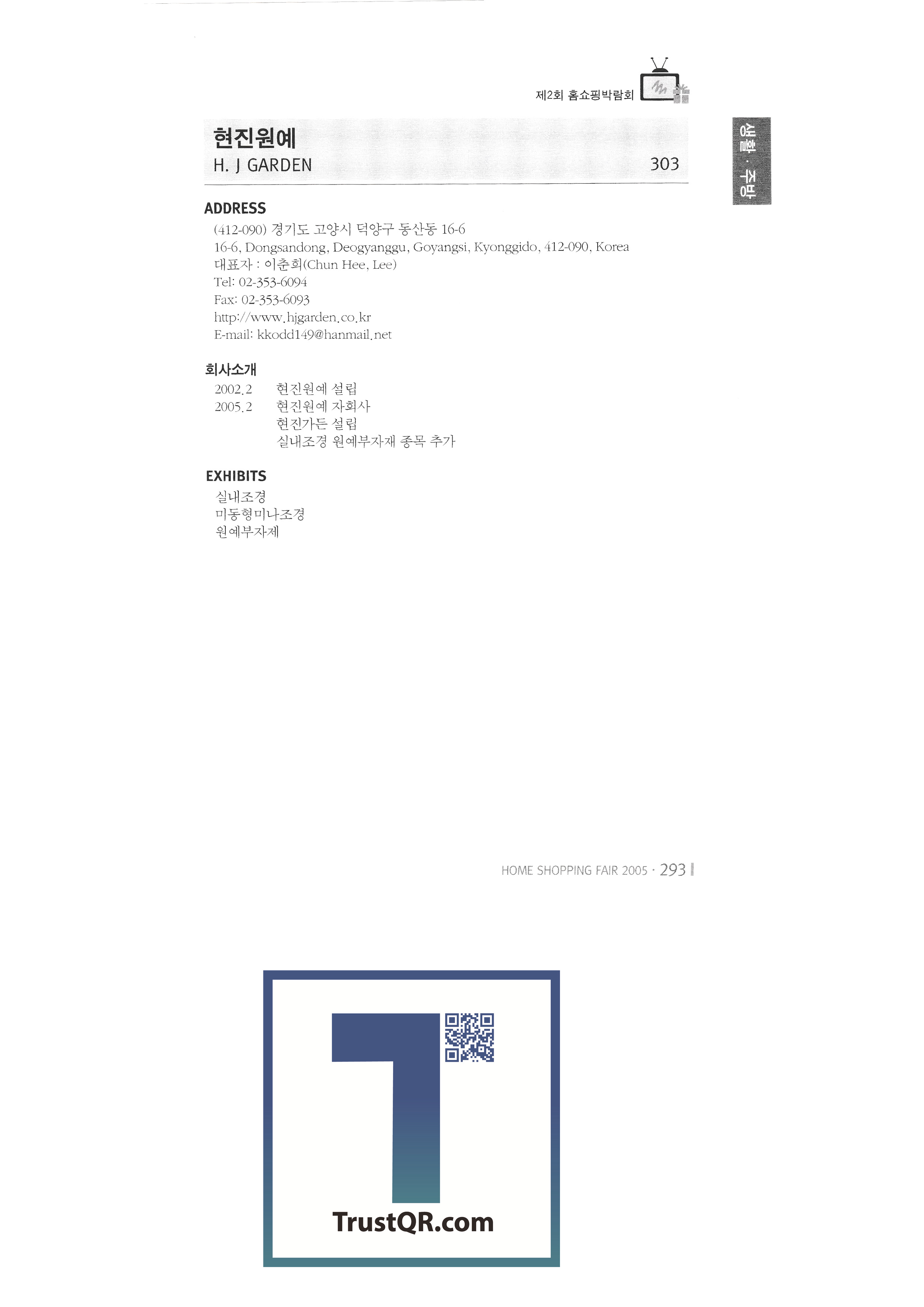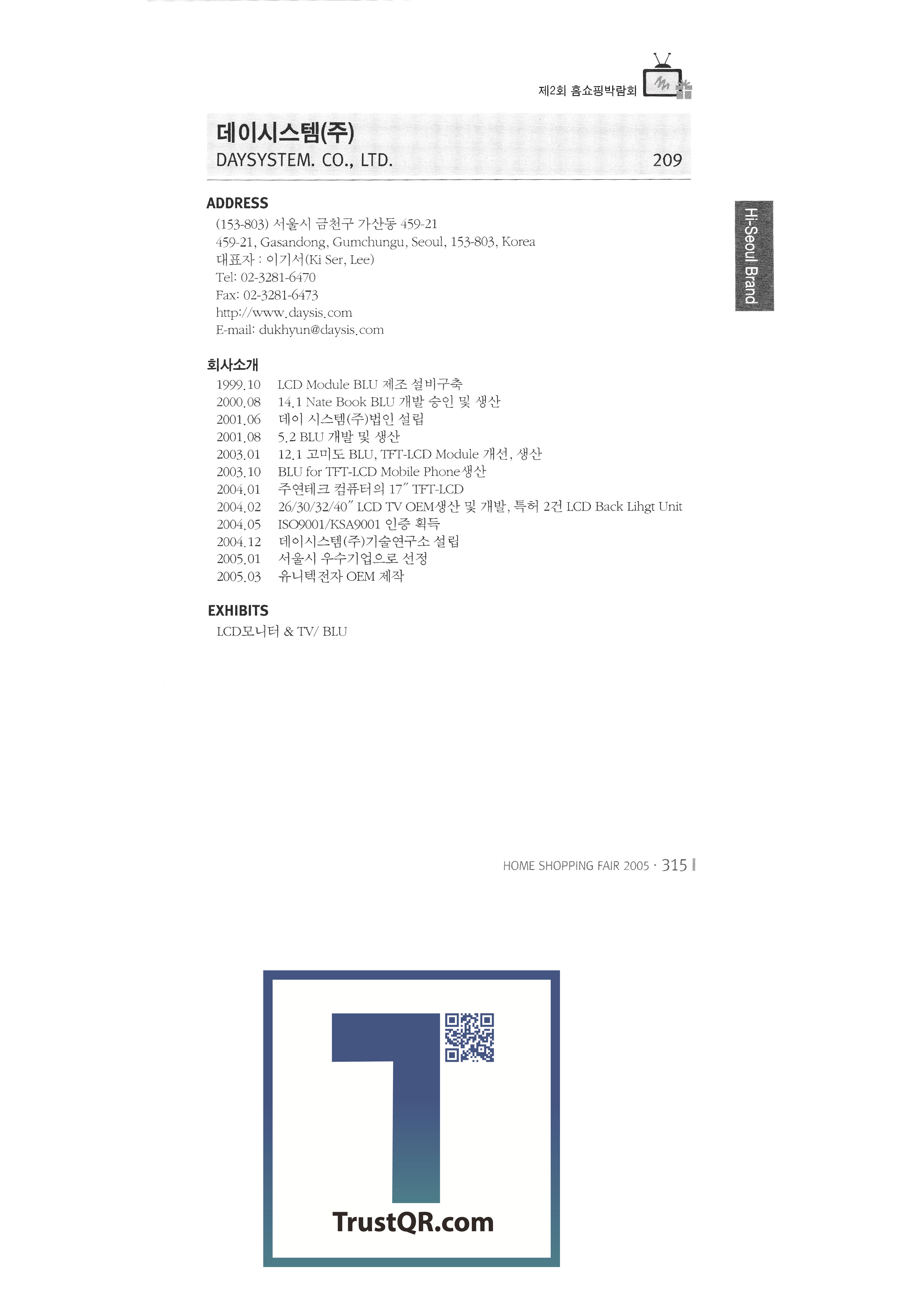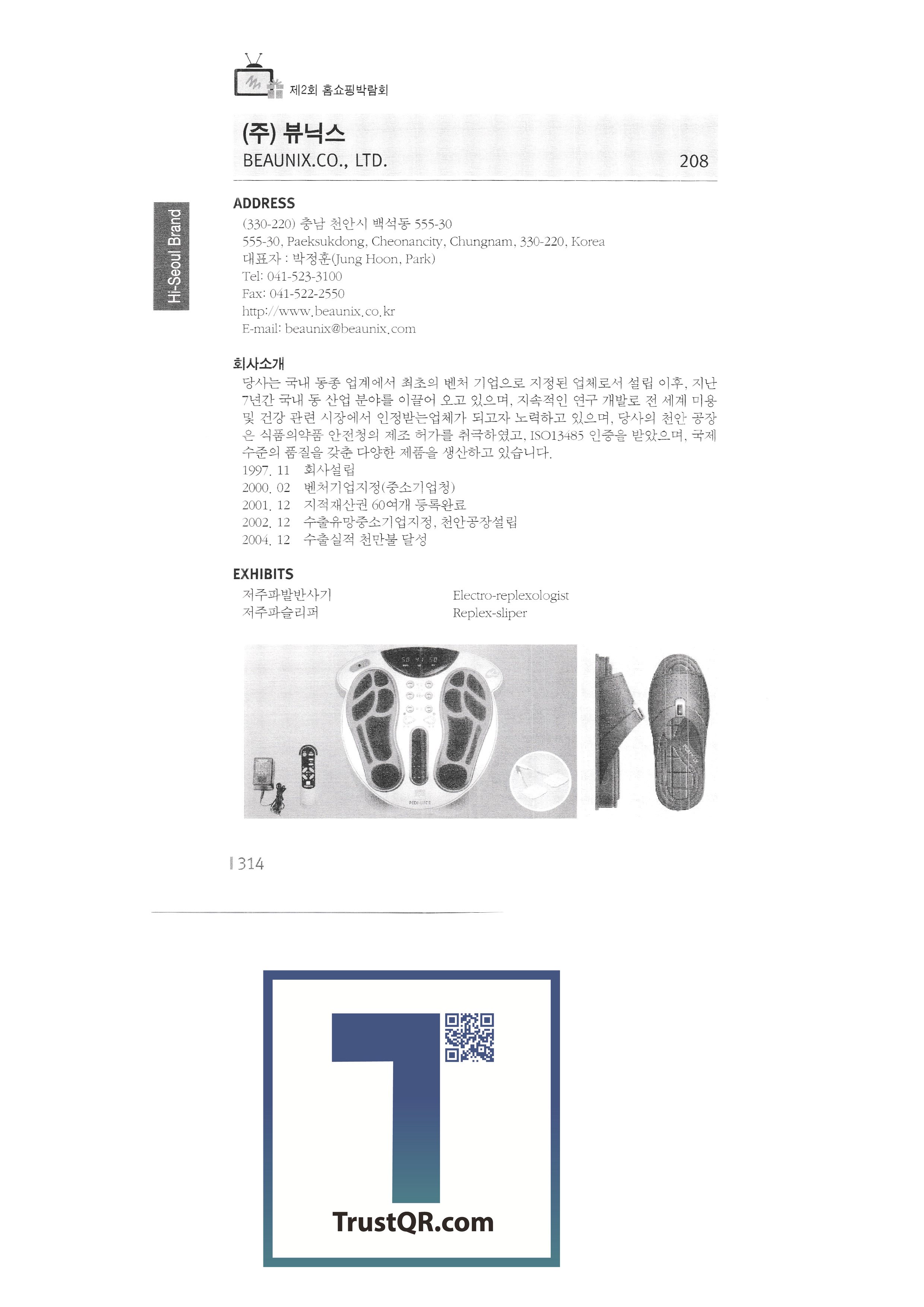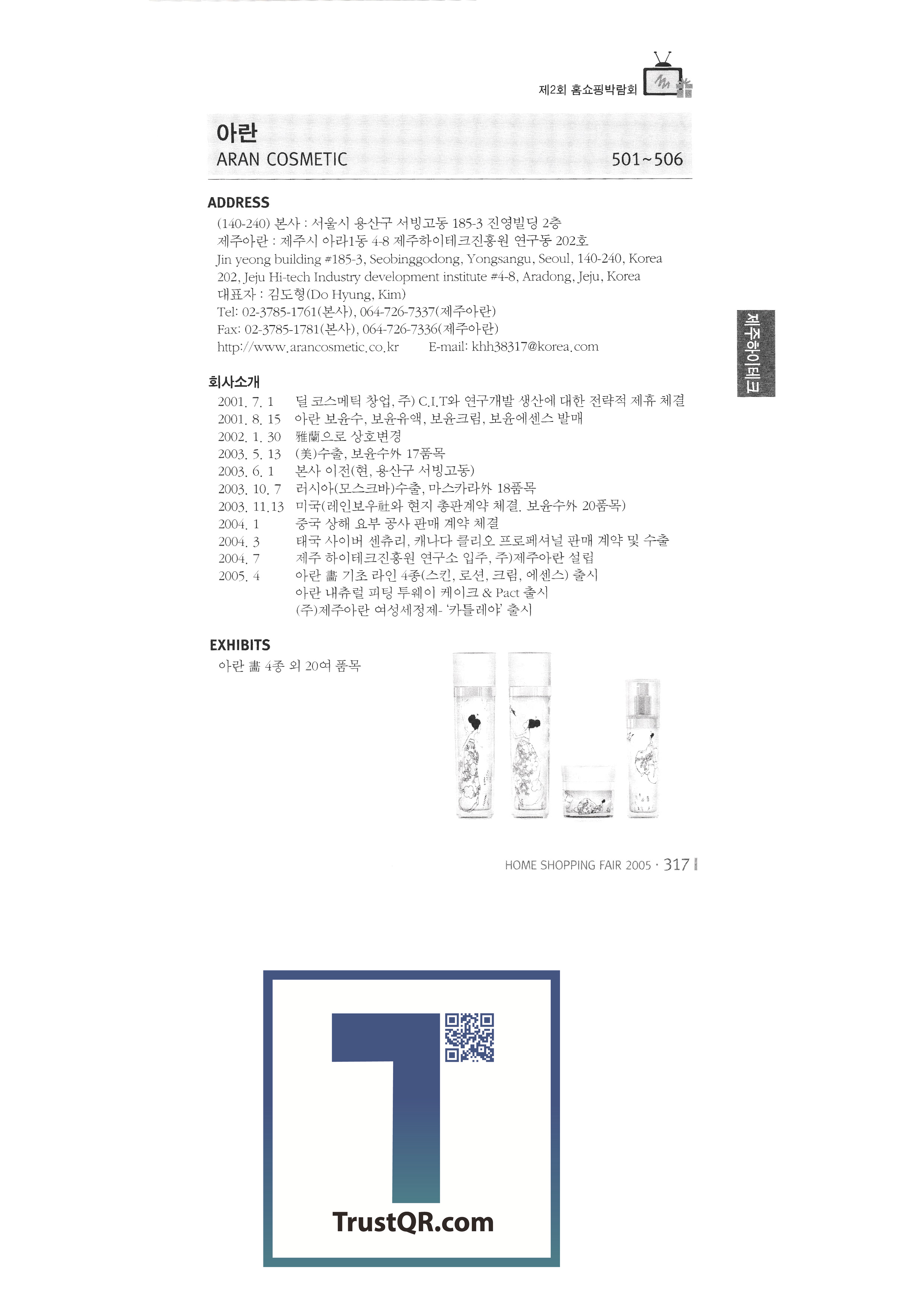 2005, International Consumer Goods Fair, MD Korea Dazzle Co., Ltd. Woori Foods Meerworld J&C Hyunjin Gardening Dong-A Trading Manu Crystal Neo & Neo Seokyung Tech Jungwoo C&C Myeongmoon LC Vision Art Co., Ltd. Perfect Neck Need MDPro Doa Dream Janus Airfall Corporation O'Queen Sungbu Trading Co., Ltd. Aintech information K.I.C.A Booheung Medical Co., Ltd. Coas Zenic Hanil World Co., Ltd. Bunix Inc. Day System Co., Ltd. Jeju High-Tech Industry Promotion Agency Aran Jeju Love Jeju Dawon Farming Association Corporation |