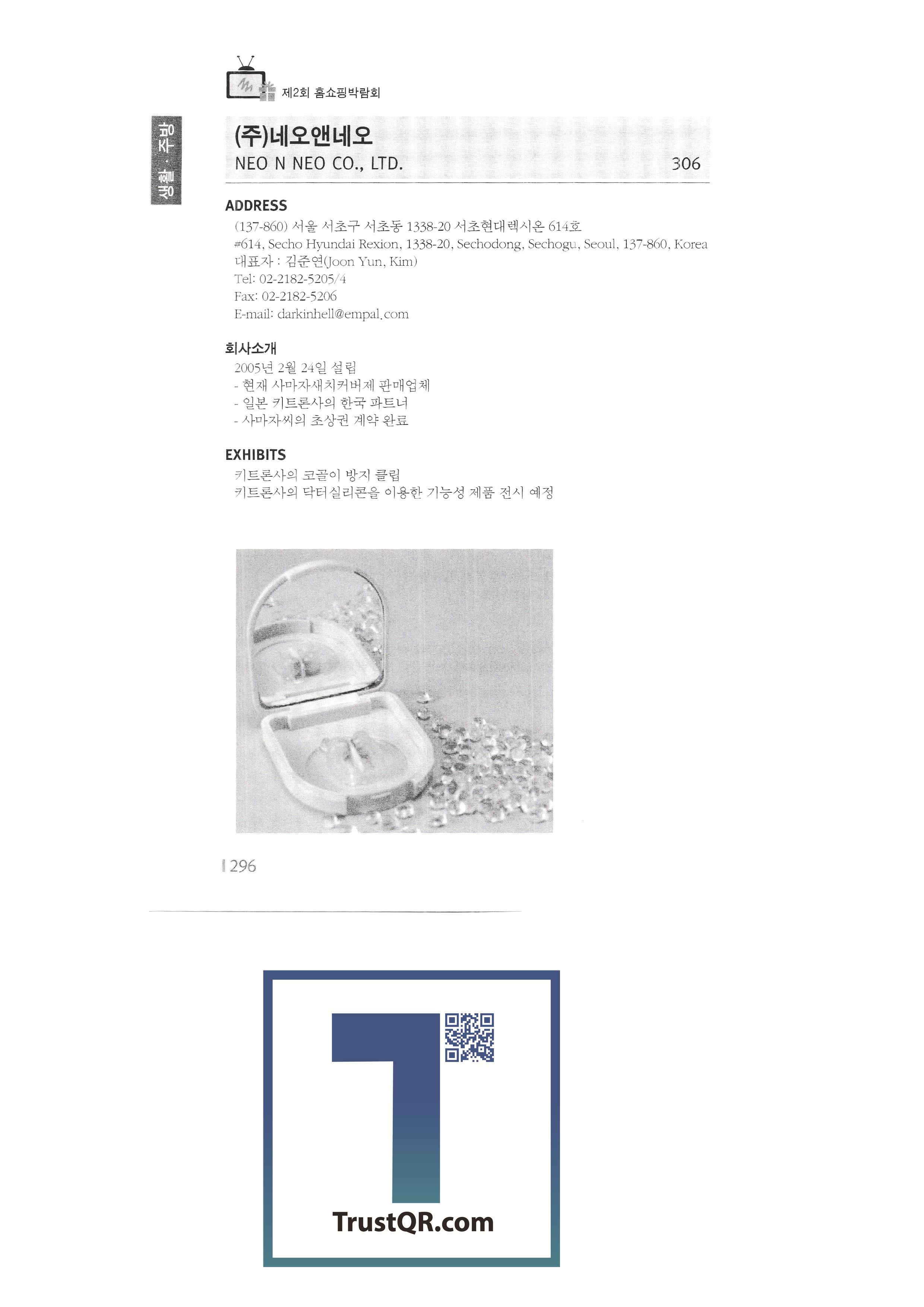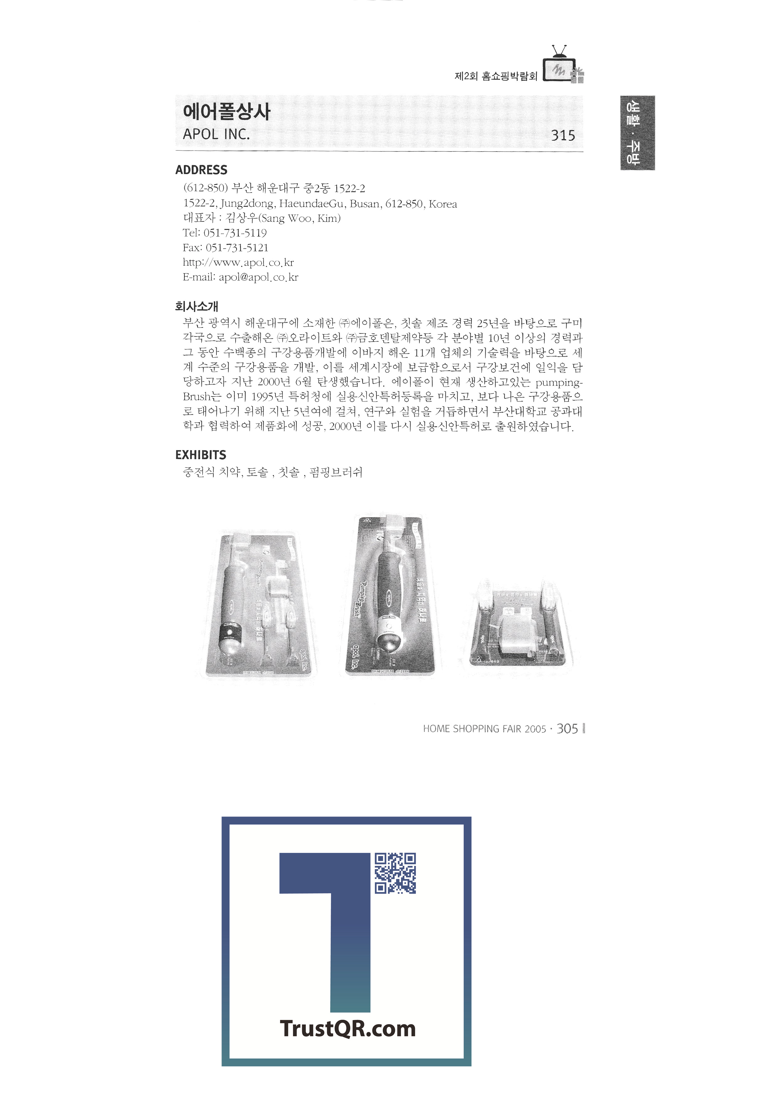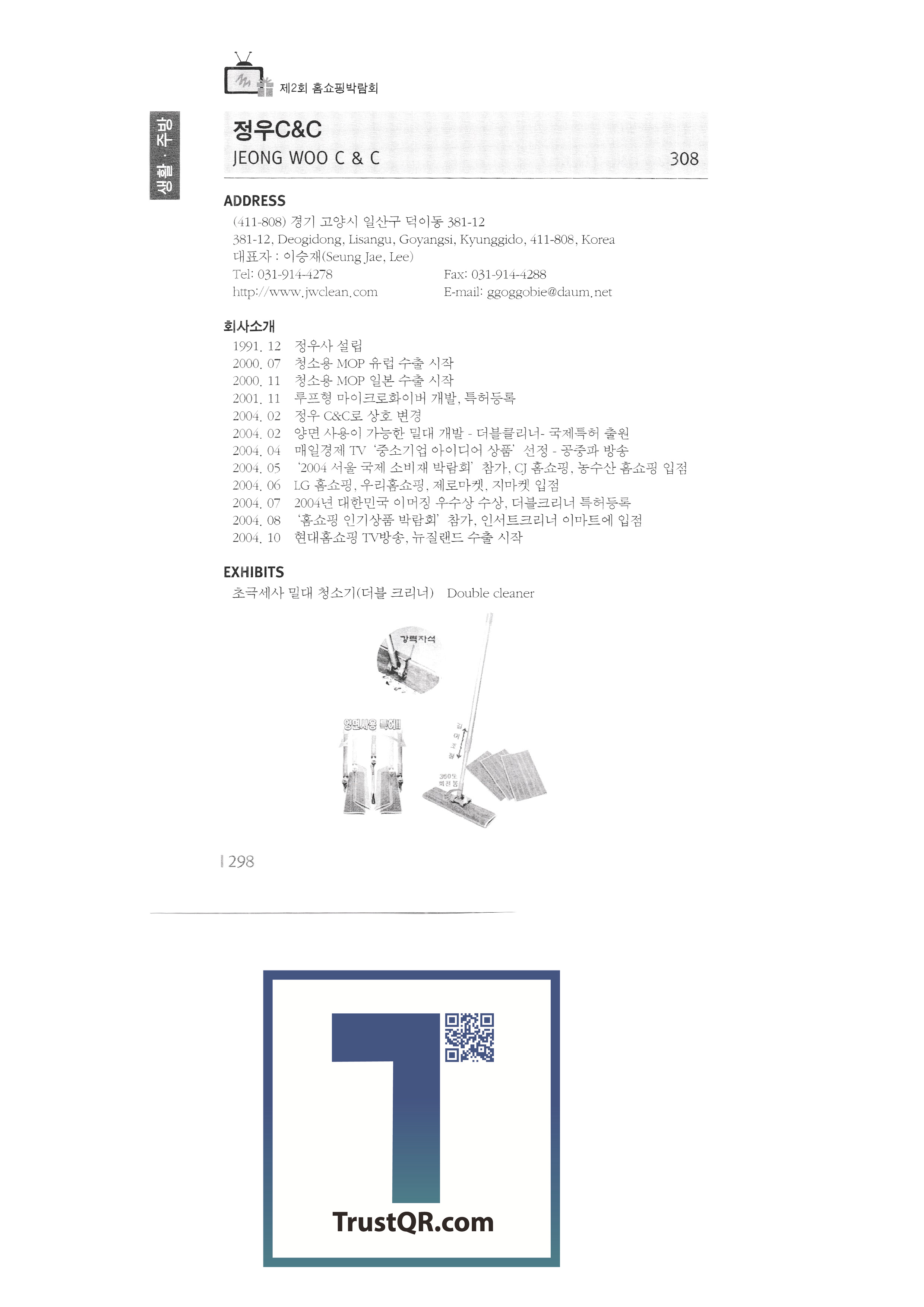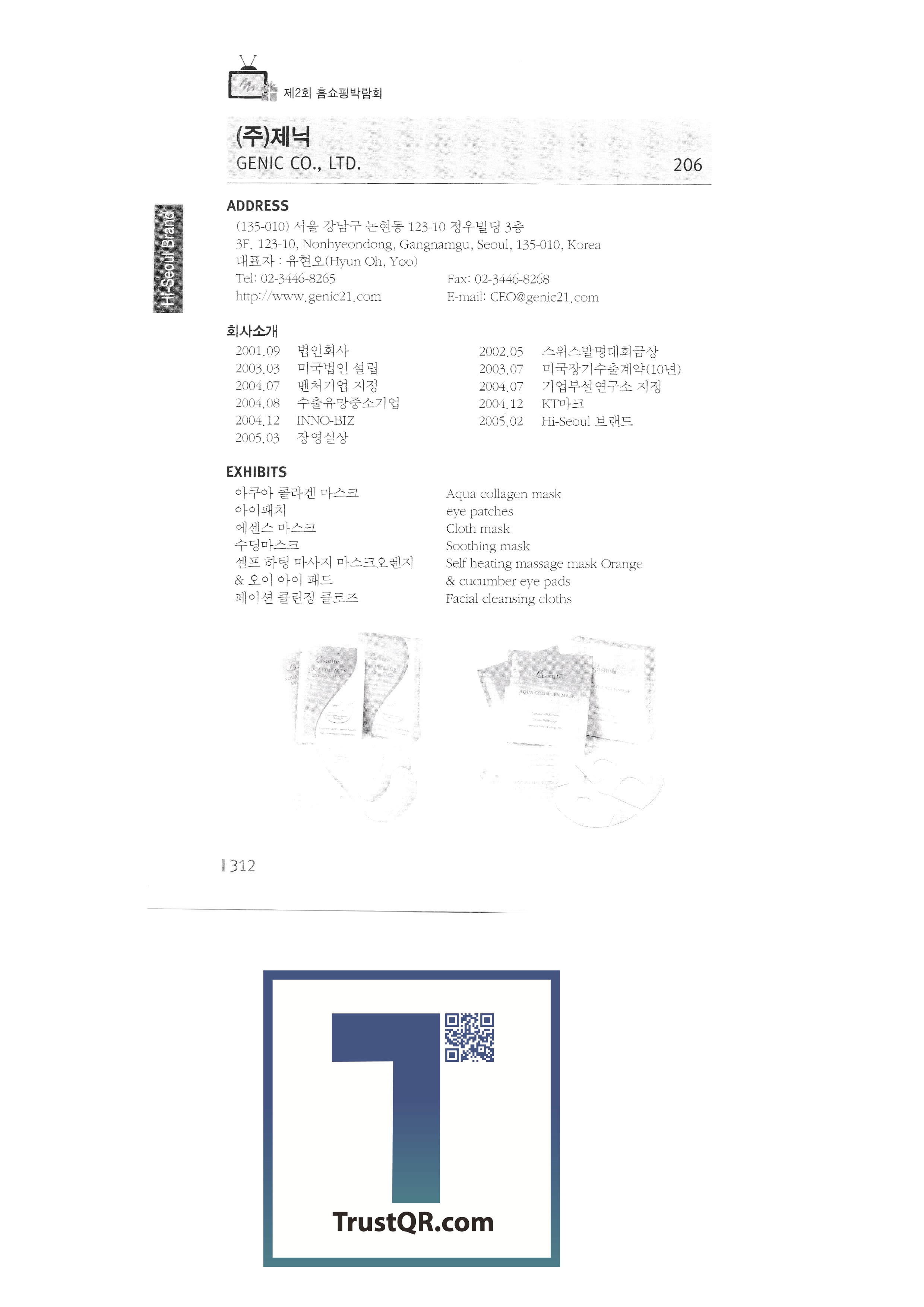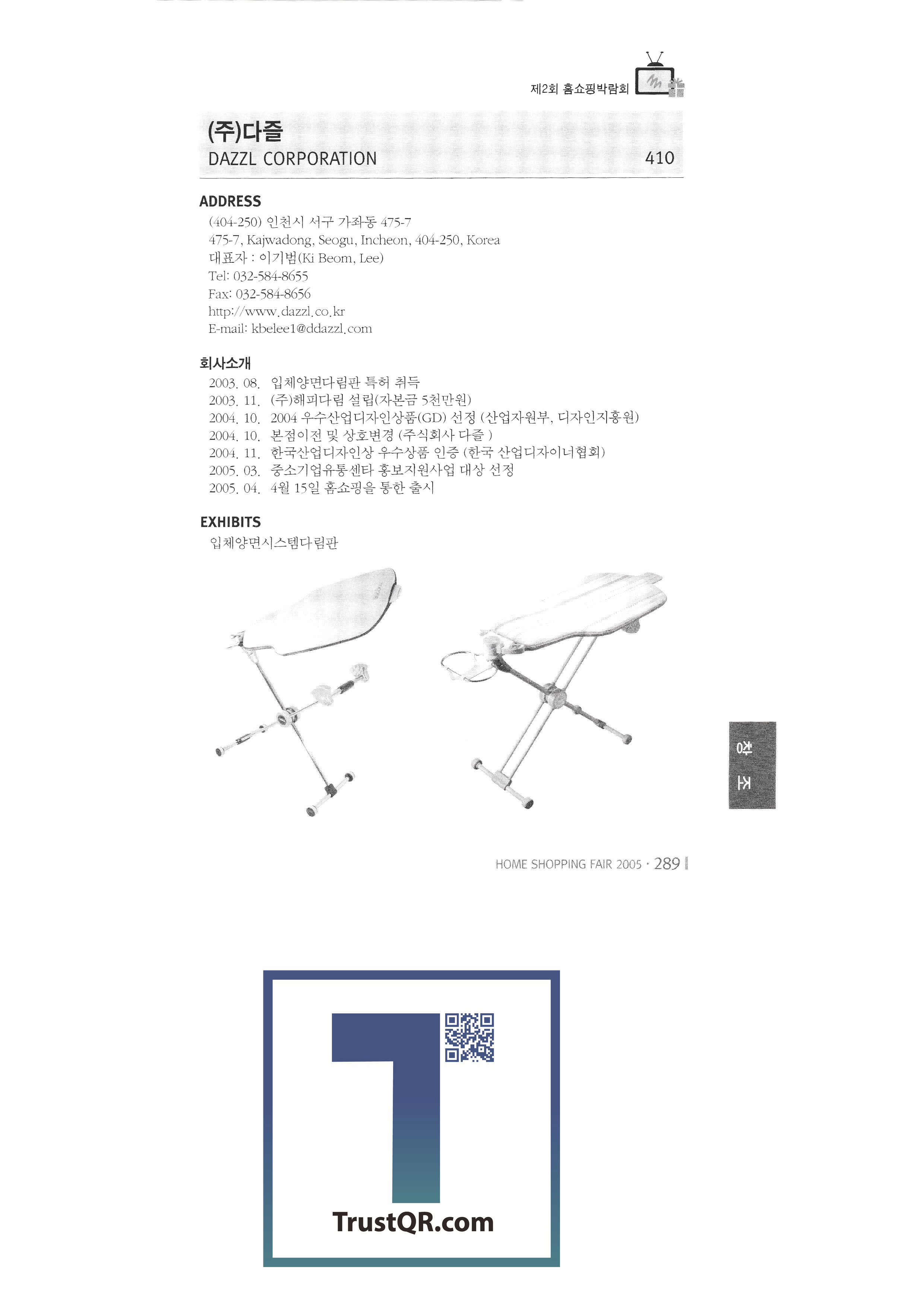 2005, International Consumer Goods Fair, MD Korea Dazzle Co., Ltd. Woori Foods Meerworld J&C Hyunjin Gardening Dong-A Trading Manu Crystal Neo & Neo Seokyung Tech Jungwoo C&C Myeongmoon LC Vision Art Co., Ltd. Perfect Neck Need MDPro Doa Dream Janus Airfall Corporation O'Queen Sungbu Trading Co., Ltd. Aintech information K.I.C.A Booheung Medical Co., Ltd. Coas Zenic Hanil World Co., Ltd. Bunix Inc. Day System Co., Ltd. Jeju High-Tech Industry Promotion Agency Aran Jeju Love Jeju Dawon Farming Association Corporation |