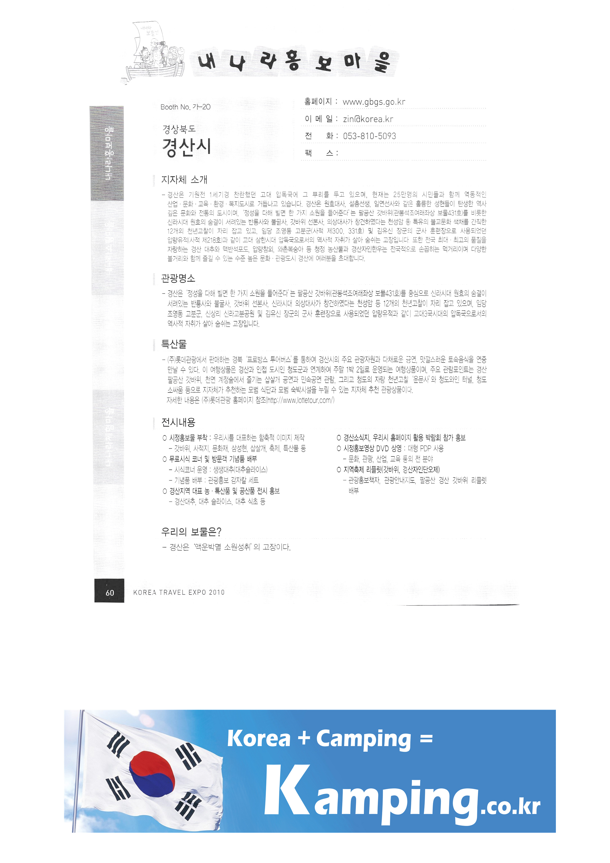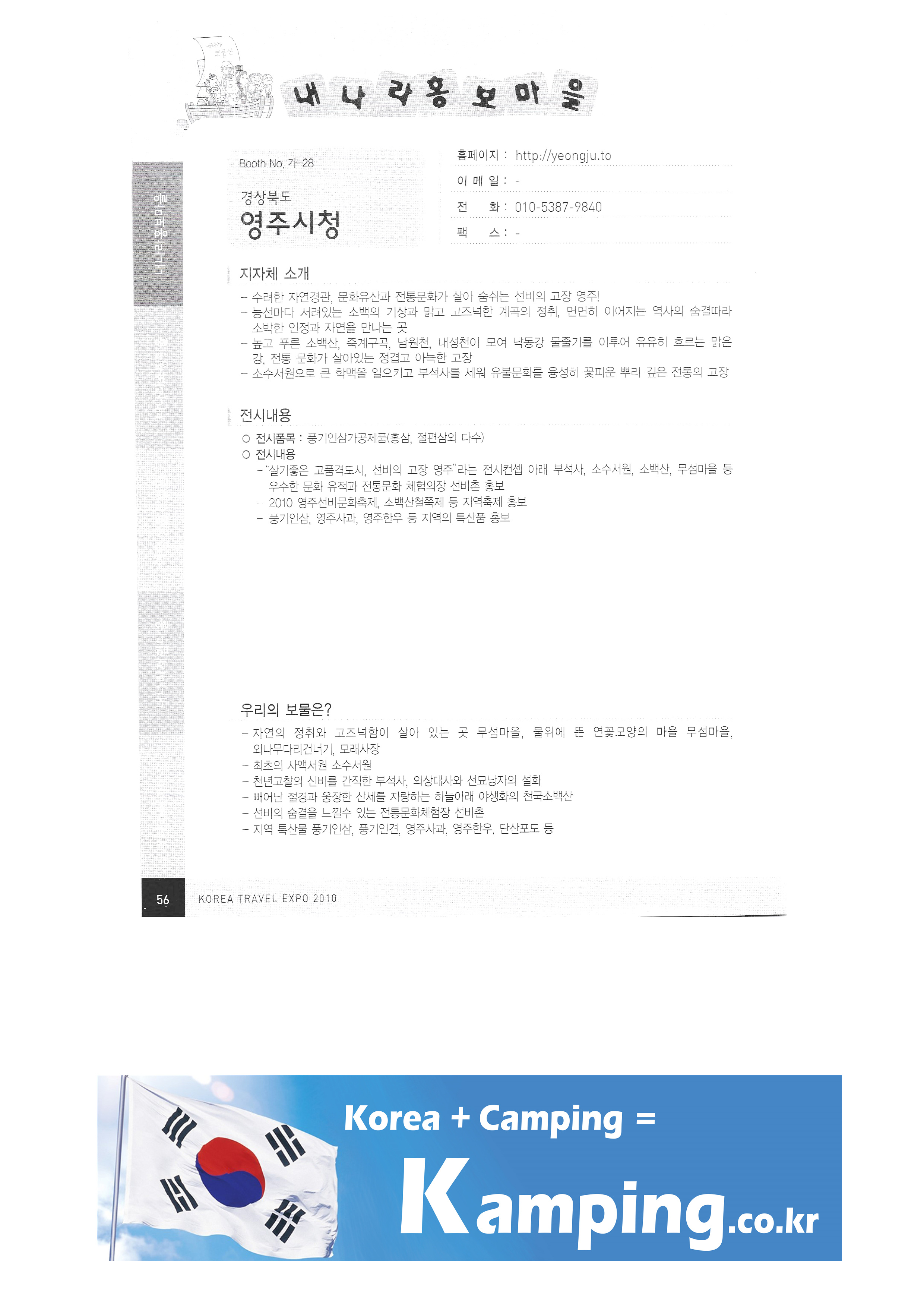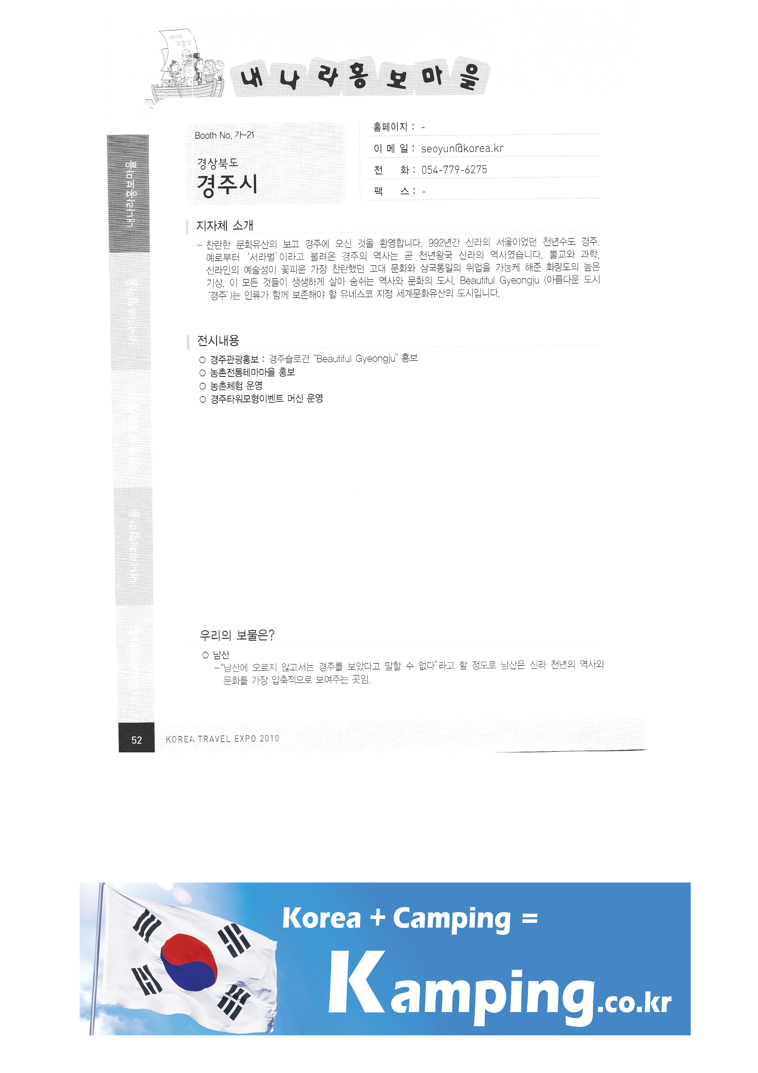 2010 Naenara Travel Fair-2 Incheon Metropolitan City Ganghwa-gun (Ganghwa-gun Tourism Development Office) Ongjin-gun, Incheon Metropolitan City Jangseong-gun Jeollanam-do Jeollabuk do Jeonju Jeju Special Self-Governing Province Jindo-gun Chungcheong-do Hampyeong-gun 2010 Gwangju World Optical Expo Gyeongsangbuk-do Pohang City Hall, Gyeongsangbuk-do Gyeongju, Gyeongsangbuk-do Gimcheon City Hall, Gyeongsangbuk-do Andong City Hall, Gyeongsangbuk-do Gumi City Hall, Gyeongsangbuk-do Yeongju City Hall, Gyeongsangbuk-do Yeongcheon City Hall, Gyeongsangbuk-do Sangju, Gyeongsangbuk-do Mungyeong City Hall, Gyeongsangbuk-do Gyeongsan City, Gyeongsangbuk-do Gyeongsangbuk-do Gunwi-gun Office Uiseong-gun, Gyeongsangbuk-do Cheongsong-gun Office, Gyeongsangbuk-do Yeongyang-gun, Gyeongsangbuk-do Yeongdeok-gun Office, Gyeongsangbuk-do Cheongdo-gun, Gyeongsangbuk-do Goryeong-gun Office, Gyeongsangbuk-do Seongju-gun Office, Gyeongsangbuk-do Chilgok-gun, Gyeongsangbuk-do Yecheon-gun, Gyeongsangbuk-do Bonghwa-gun Office, Gyeongsangbuk-do Uljin-gun Office, Gyeongsangbuk-do Ulleung-gun, Gyeongsangbuk-do Ulsan Metropolitan City Kyobo Bookstore E-mate Korea Tourism Luxury Store |