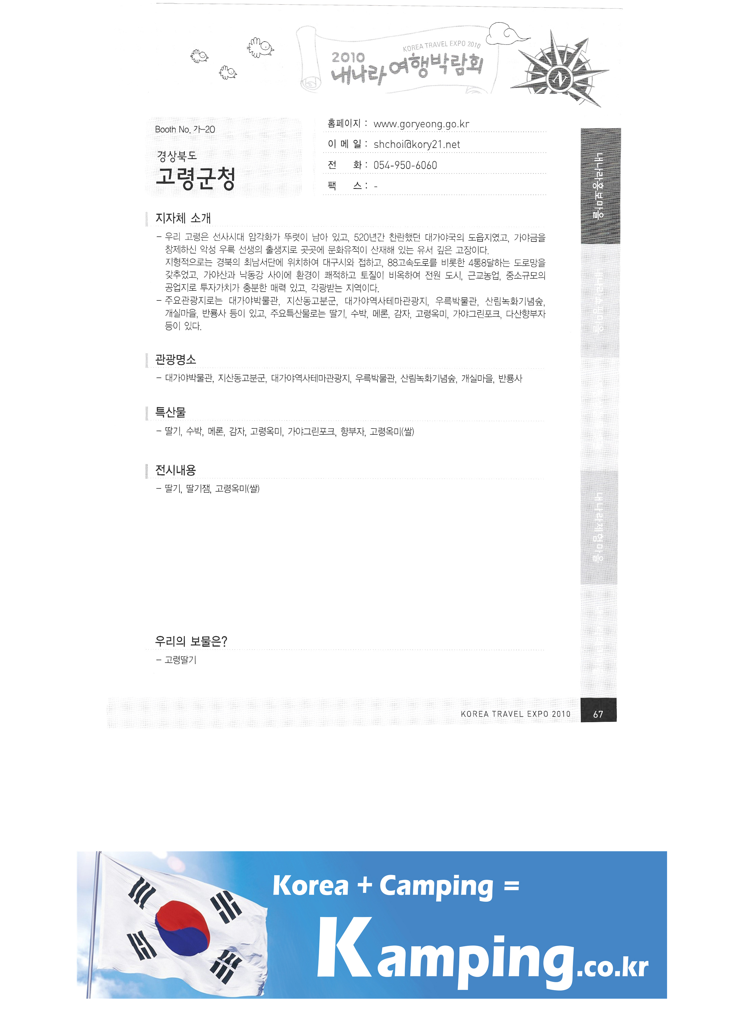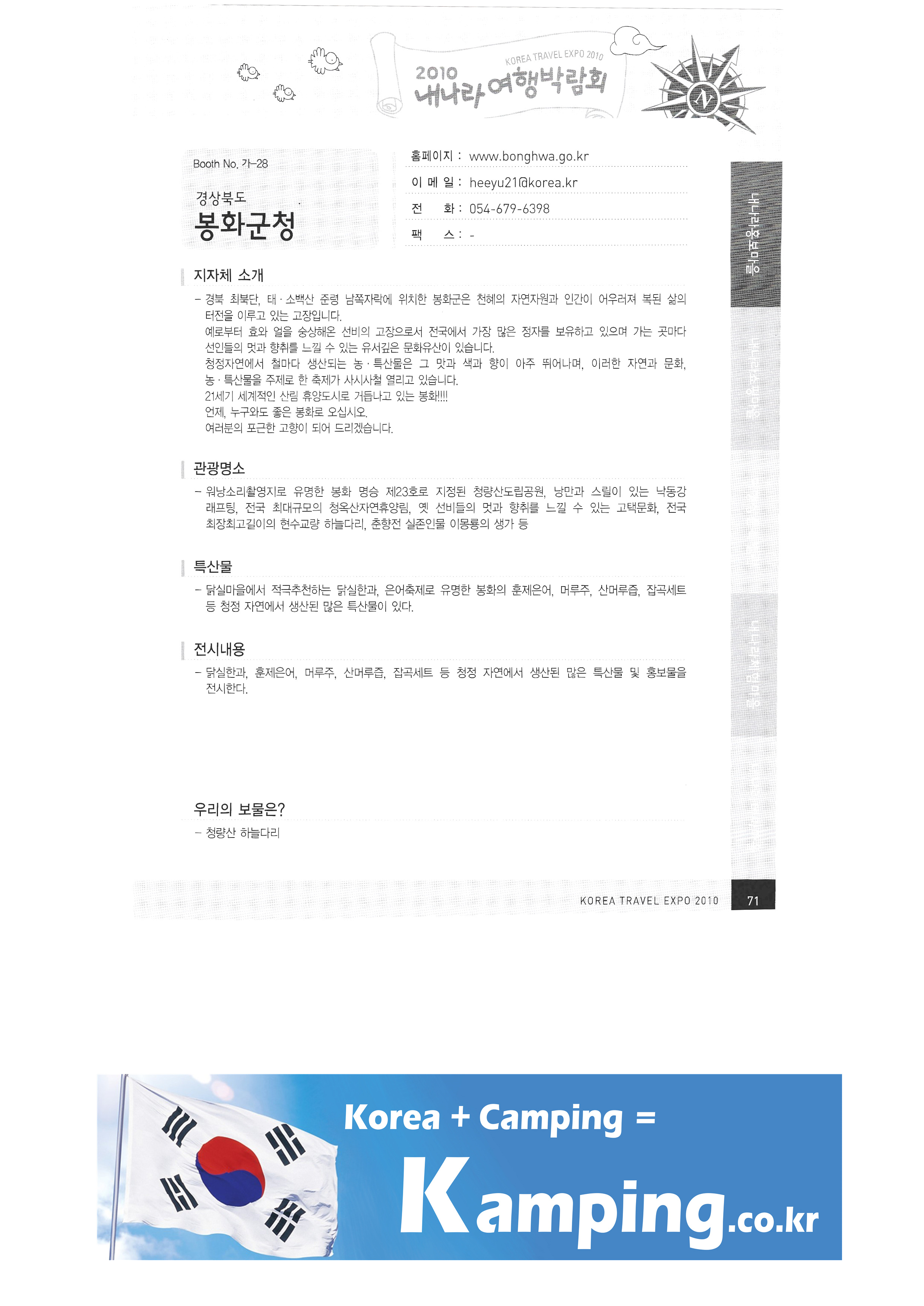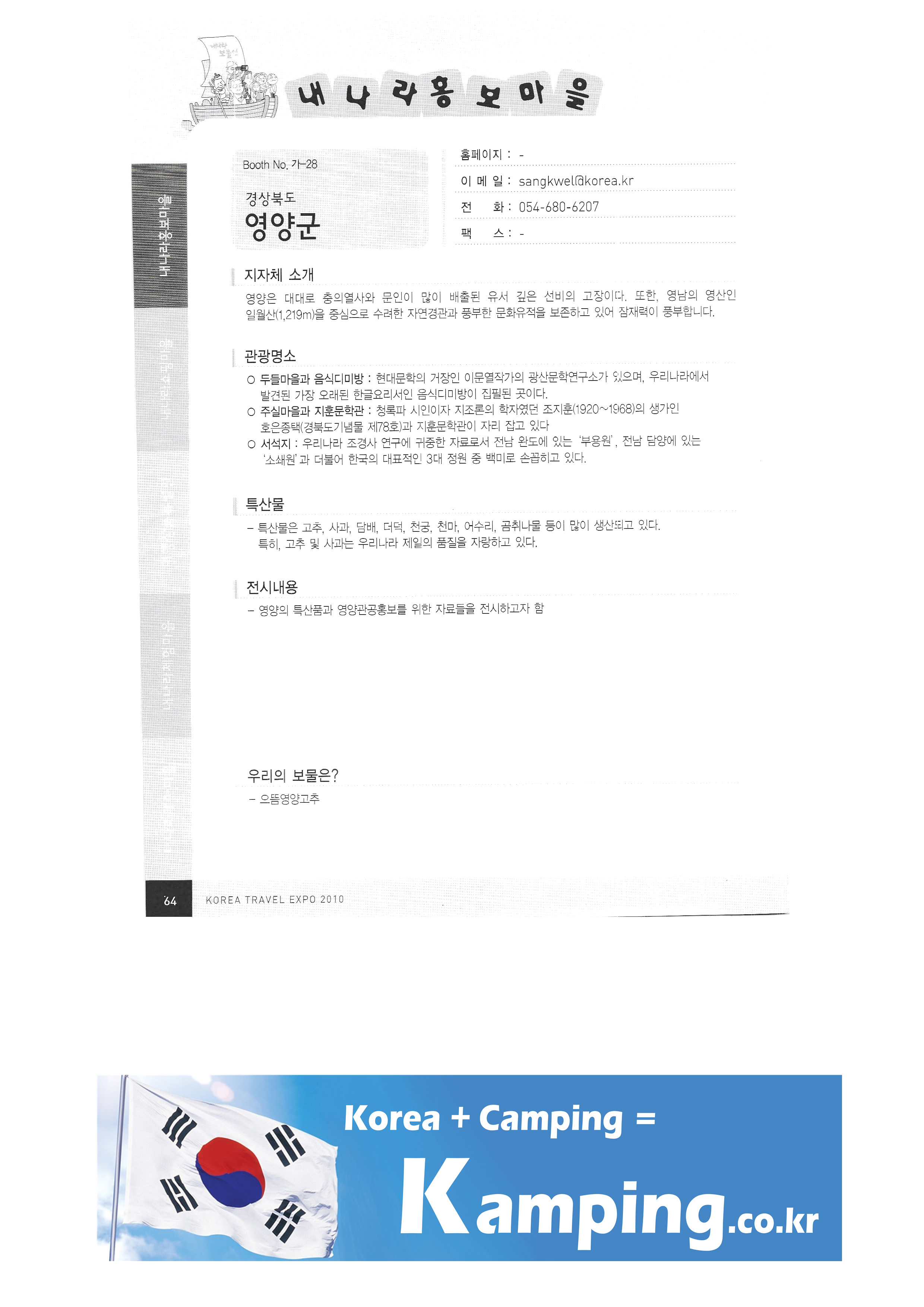 2010 Naenara Travel Fair-2 Incheon Metropolitan City Ganghwa-gun (Ganghwa-gun Tourism Development Office) Ongjin-gun, Incheon Metropolitan City Jangseong-gun Jeollanam-do Jeollabuk do Jeonju Jeju Special Self-Governing Province Jindo-gun Chungcheong-do Hampyeong-gun 2010 Gwangju World Optical Expo Gyeongsangbuk-do Pohang City Hall, Gyeongsangbuk-do Gyeongju, Gyeongsangbuk-do Gimcheon City Hall, Gyeongsangbuk-do Andong City Hall, Gyeongsangbuk-do Gumi City Hall, Gyeongsangbuk-do Yeongju City Hall, Gyeongsangbuk-do Yeongcheon City Hall, Gyeongsangbuk-do Sangju, Gyeongsangbuk-do Mungyeong City Hall, Gyeongsangbuk-do Gyeongsan City, Gyeongsangbuk-do Gyeongsangbuk-do Gunwi-gun Office Uiseong-gun, Gyeongsangbuk-do Cheongsong-gun Office, Gyeongsangbuk-do Yeongyang-gun, Gyeongsangbuk-do Yeongdeok-gun Office, Gyeongsangbuk-do Cheongdo-gun, Gyeongsangbuk-do Goryeong-gun Office, Gyeongsangbuk-do Seongju-gun Office, Gyeongsangbuk-do Chilgok-gun, Gyeongsangbuk-do Yecheon-gun, Gyeongsangbuk-do Bonghwa-gun Office, Gyeongsangbuk-do Uljin-gun Office, Gyeongsangbuk-do Ulleung-gun, Gyeongsangbuk-do Ulsan Metropolitan City Kyobo Bookstore E-mate Korea Tourism Luxury Store |