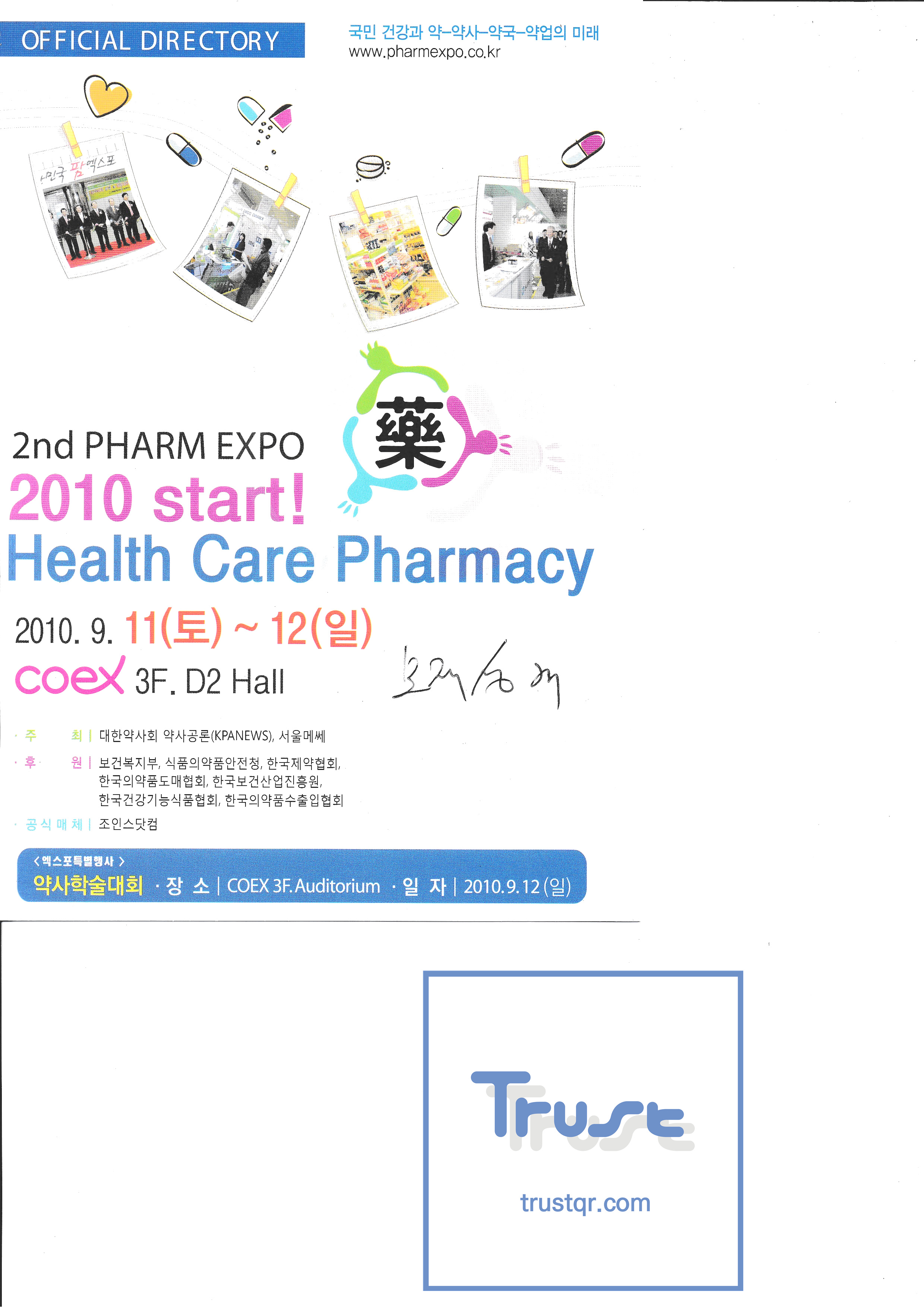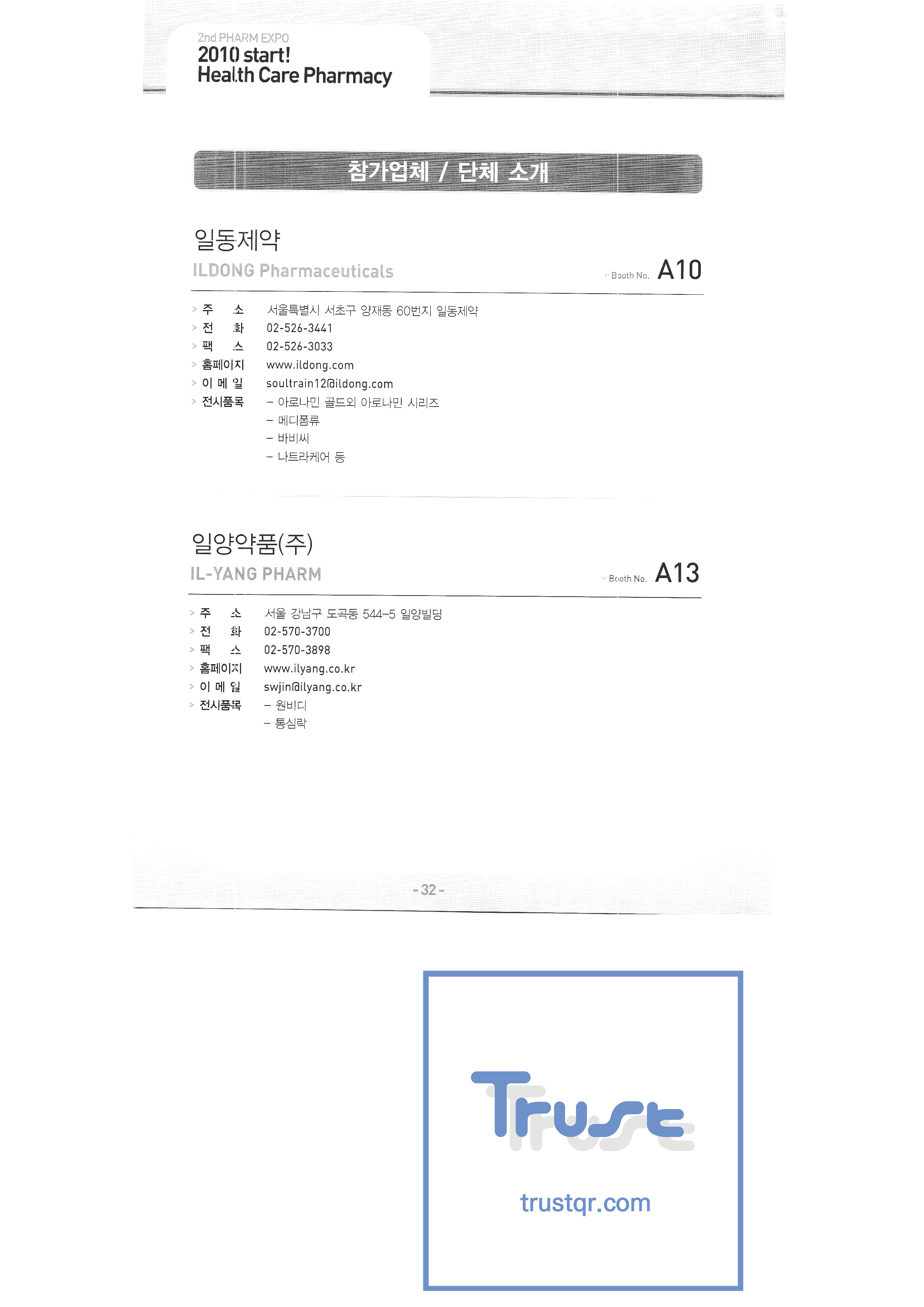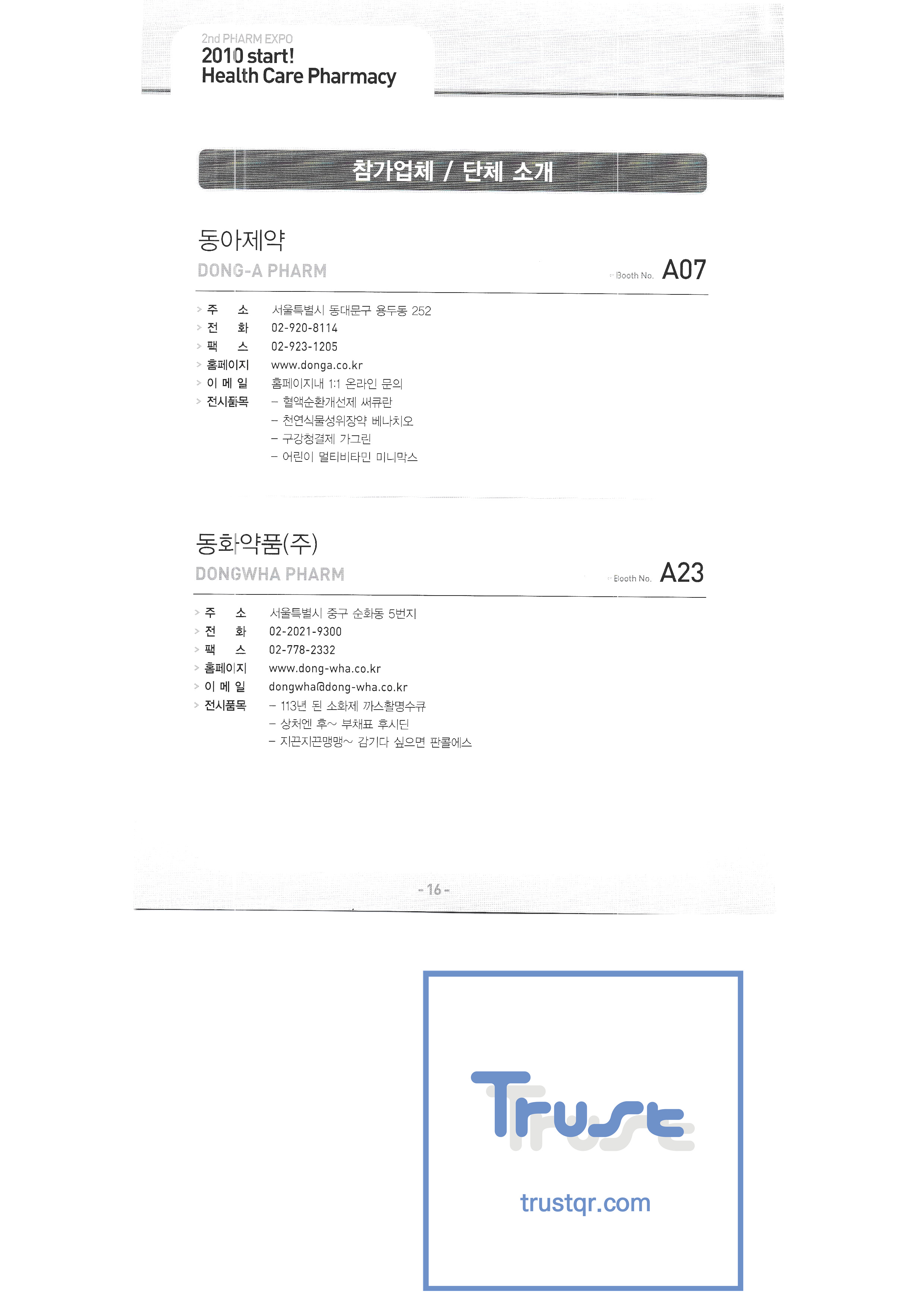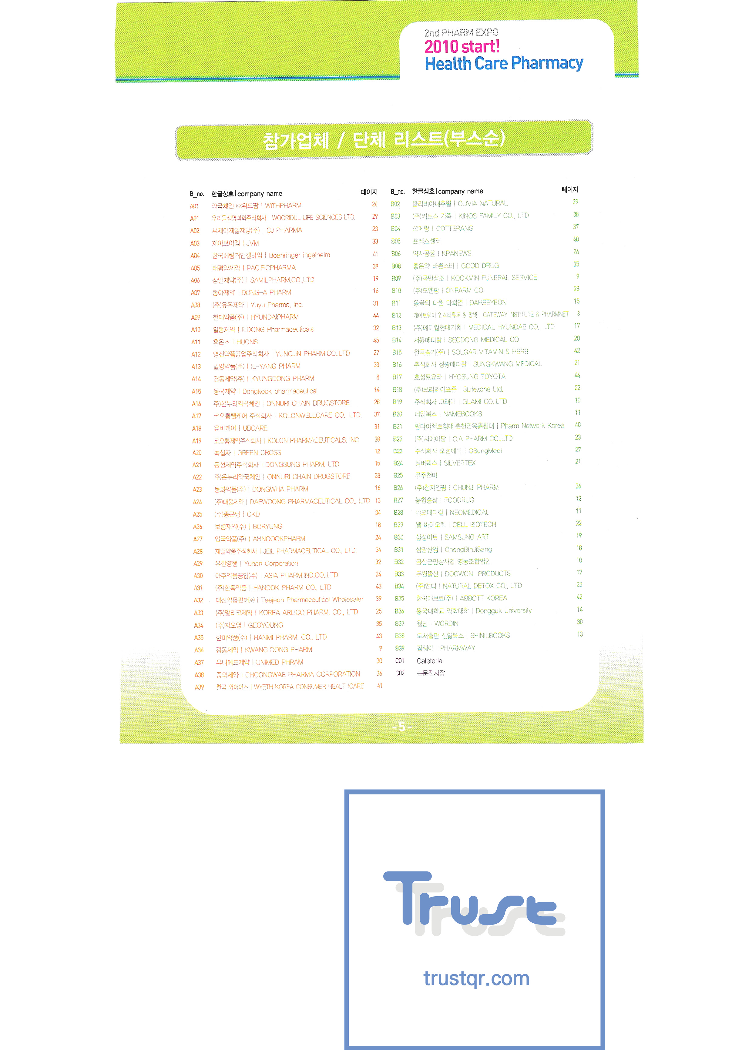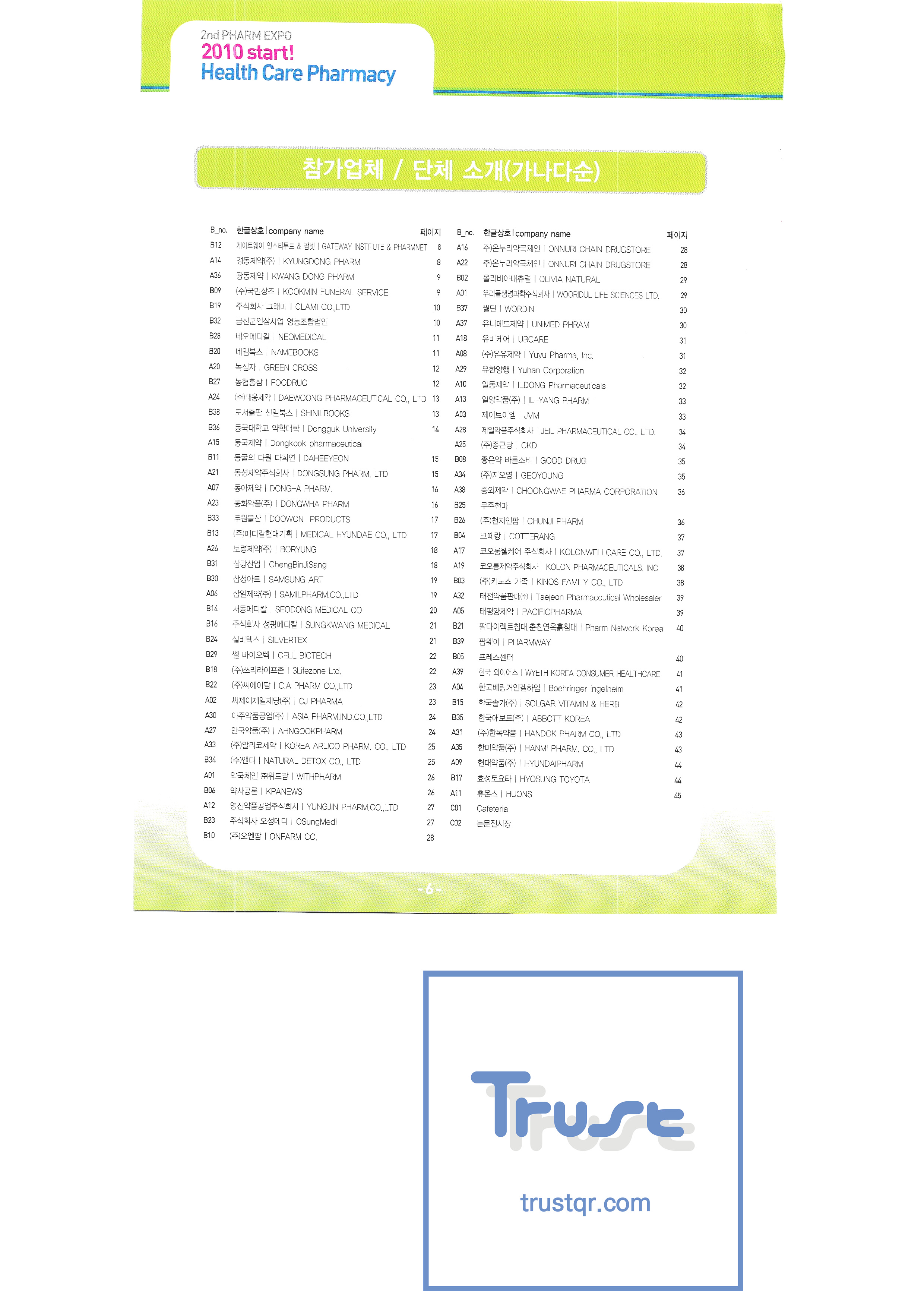 | Health Care Pharmacy 2010 게이트웨이 인스티튜트 & 팜넷 경동제약㈜ 광동제약 ㈜국민상조 주식회사 그래미 금산군인삼사업 영농조합법인 네오메디칼 네임북스 녹십자 농협홍삼 ㈜대웅제약 도서출판 신일북스 동국대학교 약학대학 동국제약 동굴의 다원 다희연 동성제약주식회사 동아제약 동화약품㈜ 두원물산 ㈜메디칼현대기획 보령제약㈜ 삼광산업 삼성아트 삼일제약㈜ 서동메디칼 주식회사 성광메디칼 실버텍스 쎌 바이오텍 ㈜쓰리라이프존 ㈜씨에이팜 씨제이제일제당㈜ 아주약품공업㈜ 안국약품㈜ ㈜알리코제약 ㈜앤디 약국체인 ㈜위드팜 약사공론 영진약품공업주식회사 주식회사 오성메디 ㈜오엔팜 ㈜온누리약국체인 올리비아내츄럴 우리들생명과학주식회사 월딘 유니메드제약 유비케어 ㈜유유제약 유한양행 일동제약 일양약품㈜ 제이브이엠 제일약품주식회사 ㈜종근당 좋은약 바른소비 ㈜지오영 중외제약 무주천마 ㈜천지인팜 코떼랑 코오롱웰케어 주식회사 코오롱제약주식회사 ㈜키노스 가족 태전약품판매㈜ 태평양제약 팜다이렉트침대.춘천연옥흙침대 팜웨이 프레스센터 한국 와이어스 한국베링거인겔하임 한국솔가㈜ 한국애보트㈜ ㈜한독약품 한미약품㈜ 현대약품㈜ 효성토요타 휴온스 |
