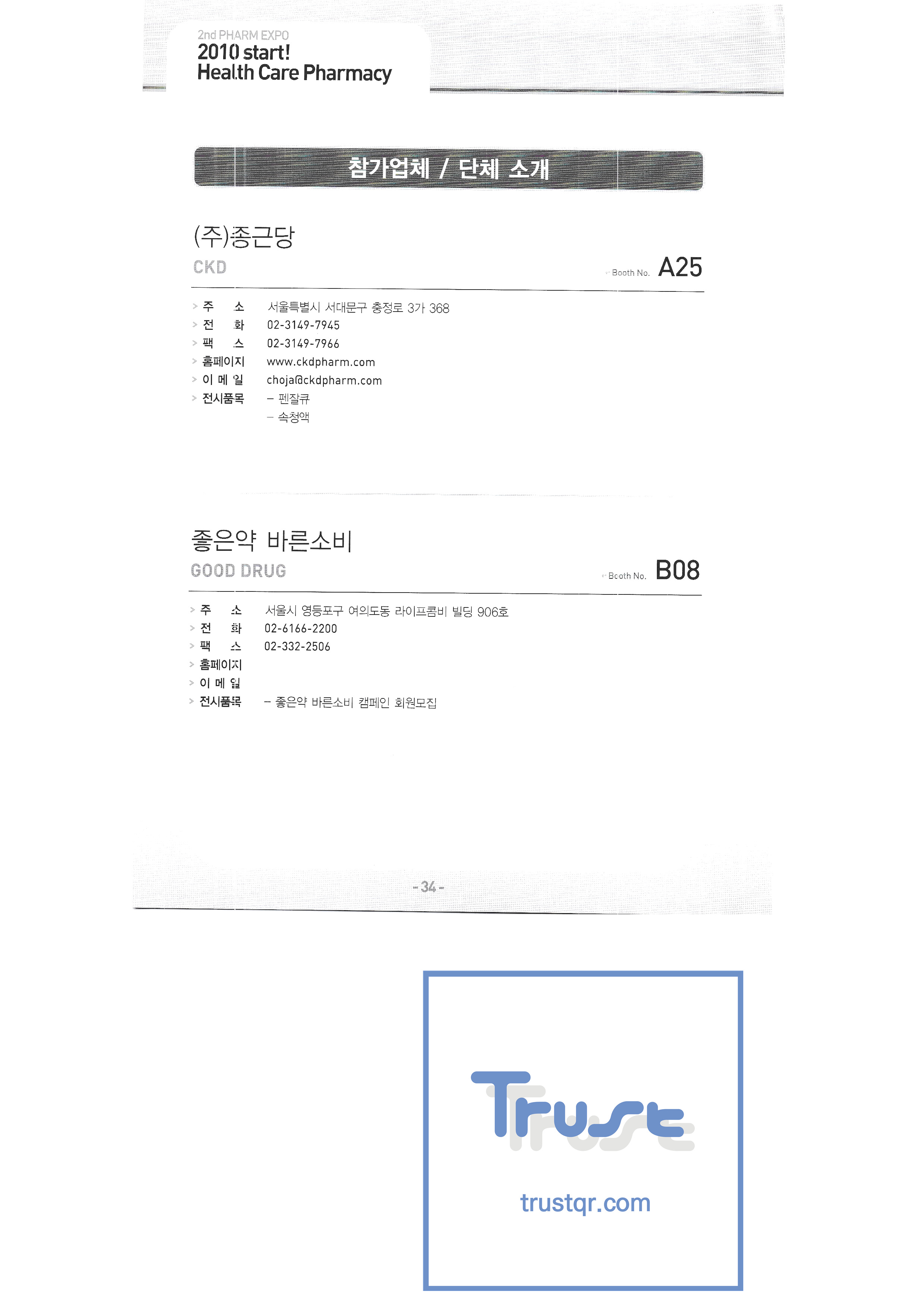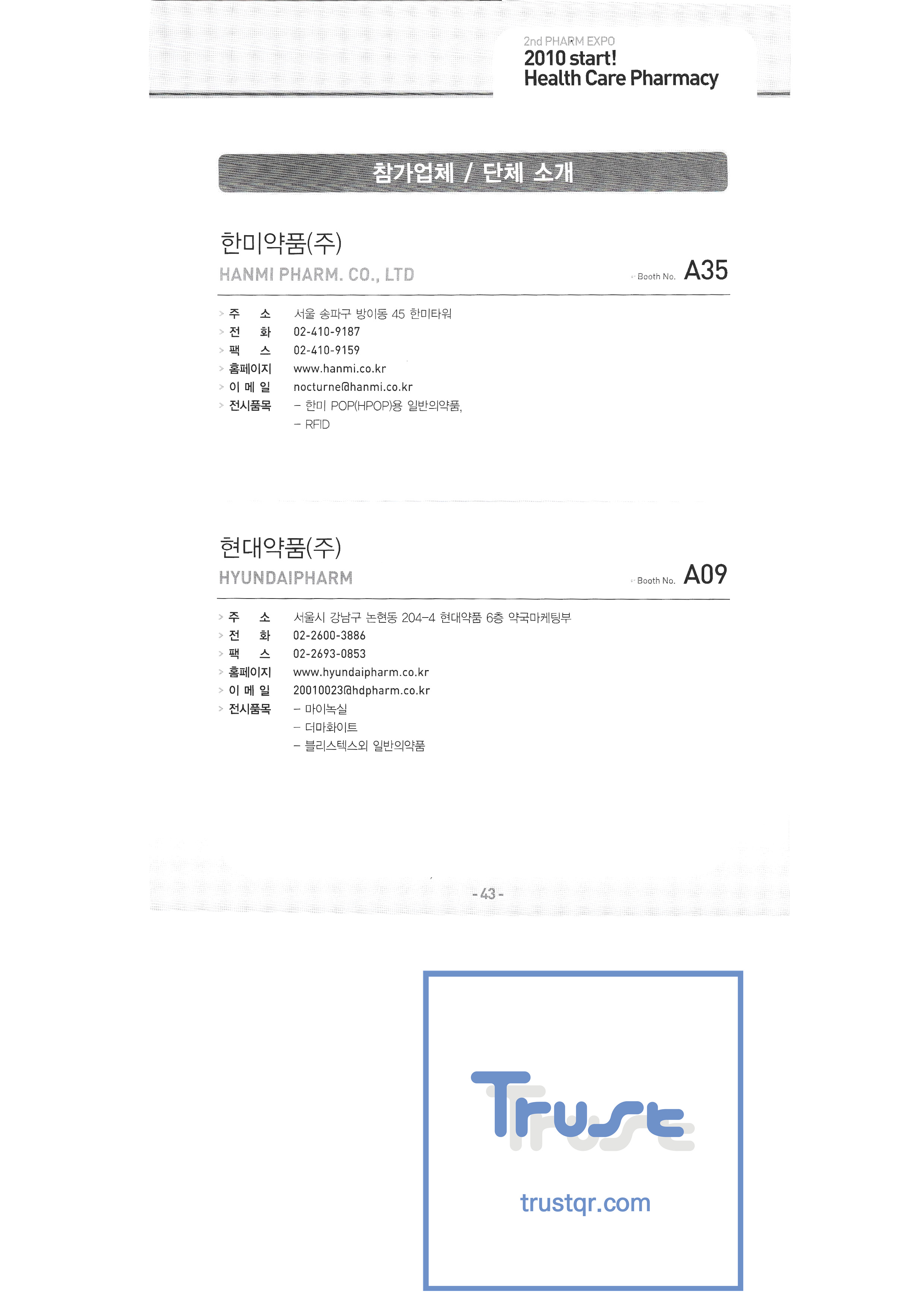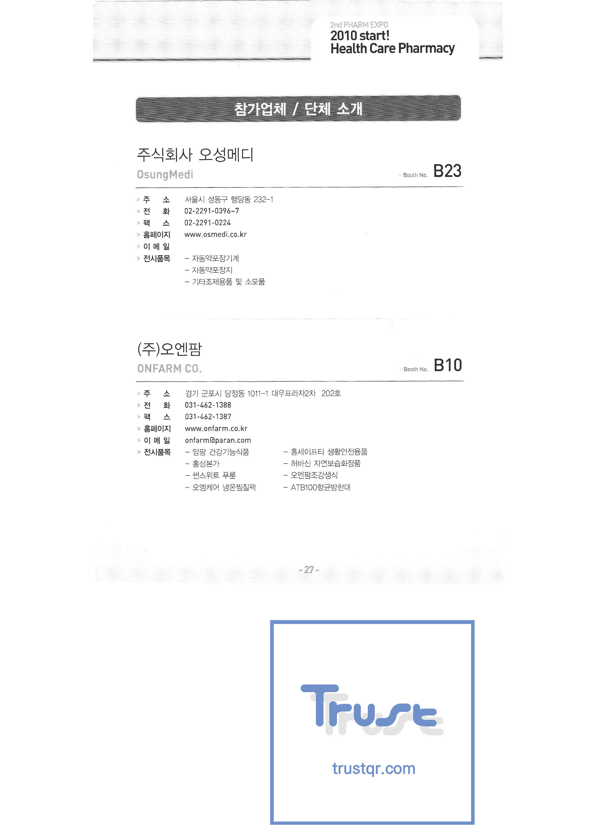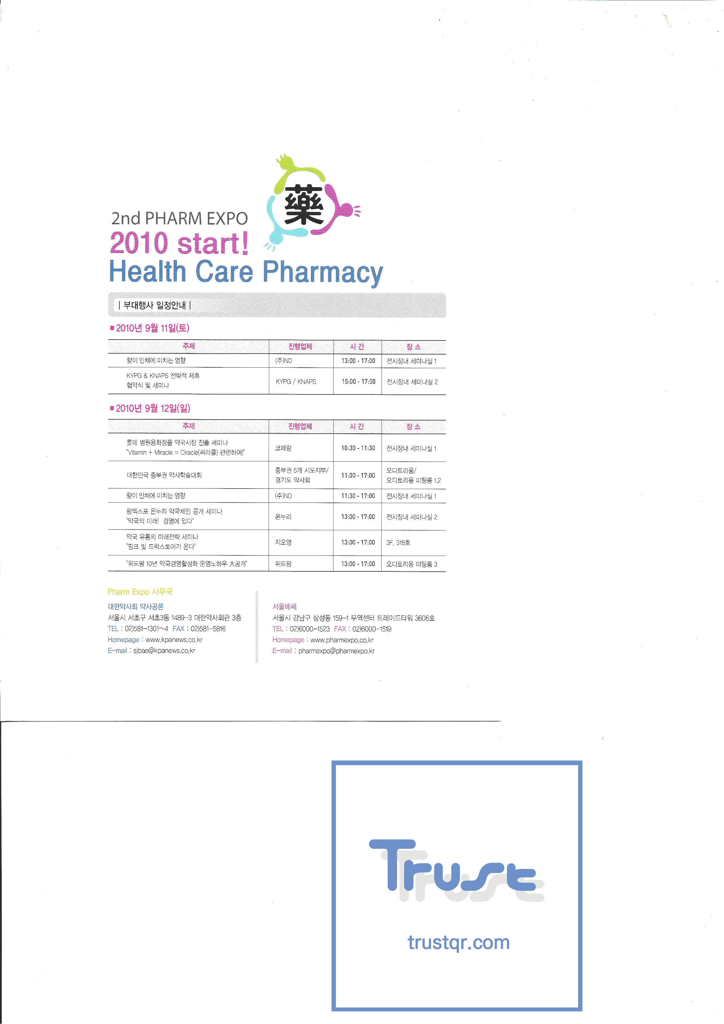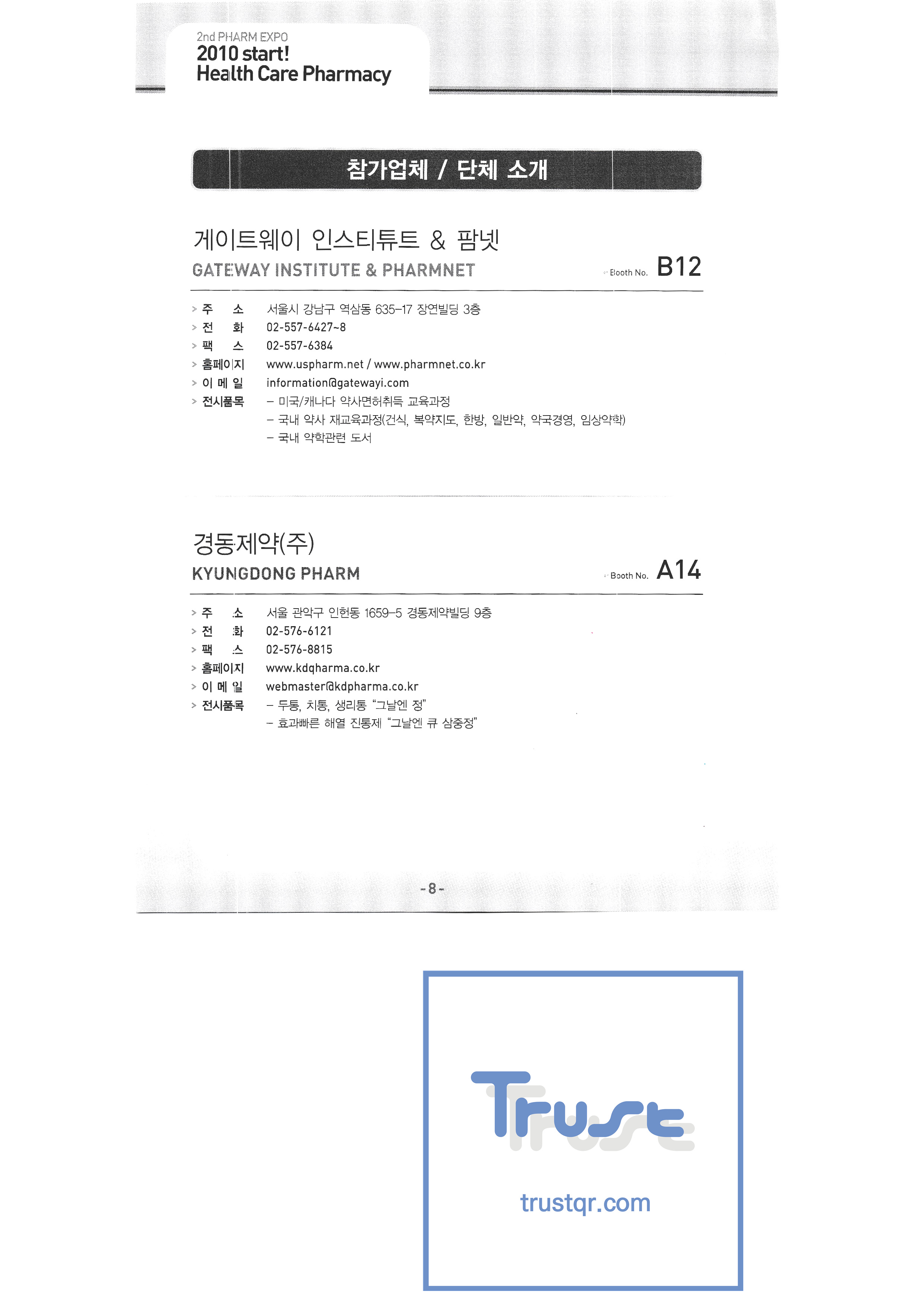 | Health Care Pharmacy 2010 게이트웨이 인스티튜트 & 팜넷 경동제약㈜ 광동제약 ㈜국민상조 주식회사 그래미 금산군인삼사업 영농조합법인 네오메디칼 네임북스 녹십자 농협홍삼 ㈜대웅제약 도서출판 신일북스 동국대학교 약학대학 동국제약 동굴의 다원 다희연 동성제약주식회사 동아제약 동화약품㈜ 두원물산 ㈜메디칼현대기획 보령제약㈜ 삼광산업 삼성아트 삼일제약㈜ 서동메디칼 주식회사 성광메디칼 실버텍스 쎌 바이오텍 ㈜쓰리라이프존 ㈜씨에이팜 씨제이제일제당㈜ 아주약품공업㈜ 안국약품㈜ ㈜알리코제약 ㈜앤디 약국체인 ㈜위드팜 약사공론 영진약품공업주식회사 주식회사 오성메디 ㈜오엔팜 ㈜온누리약국체인 올리비아내츄럴 우리들생명과학주식회사 월딘 유니메드제약 유비케어 ㈜유유제약 유한양행 일동제약 일양약품㈜ 제이브이엠 제일약품주식회사 ㈜종근당 좋은약 바른소비 ㈜지오영 중외제약 무주천마 ㈜천지인팜 코떼랑 코오롱웰케어 주식회사 코오롱제약주식회사 ㈜키노스 가족 태전약품판매㈜ 태평양제약 팜다이렉트침대.춘천연옥흙침대 팜웨이 프레스센터 한국 와이어스 한국베링거인겔하임 한국솔가㈜ 한국애보트㈜ ㈜한독약품 한미약품㈜ 현대약품㈜ 효성토요타 휴온스 |