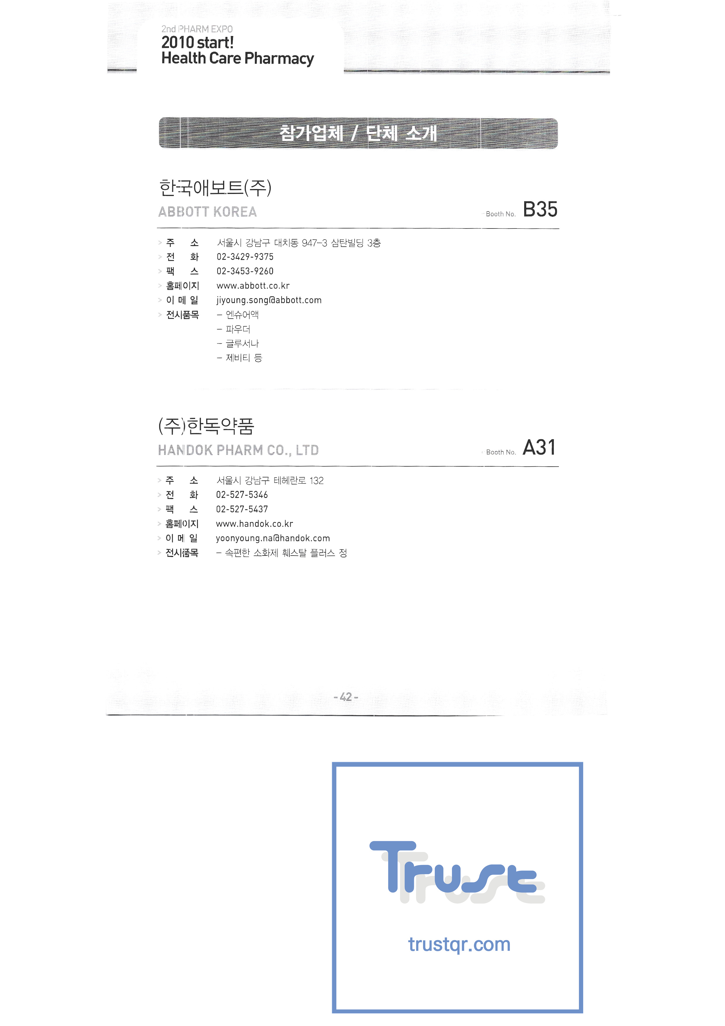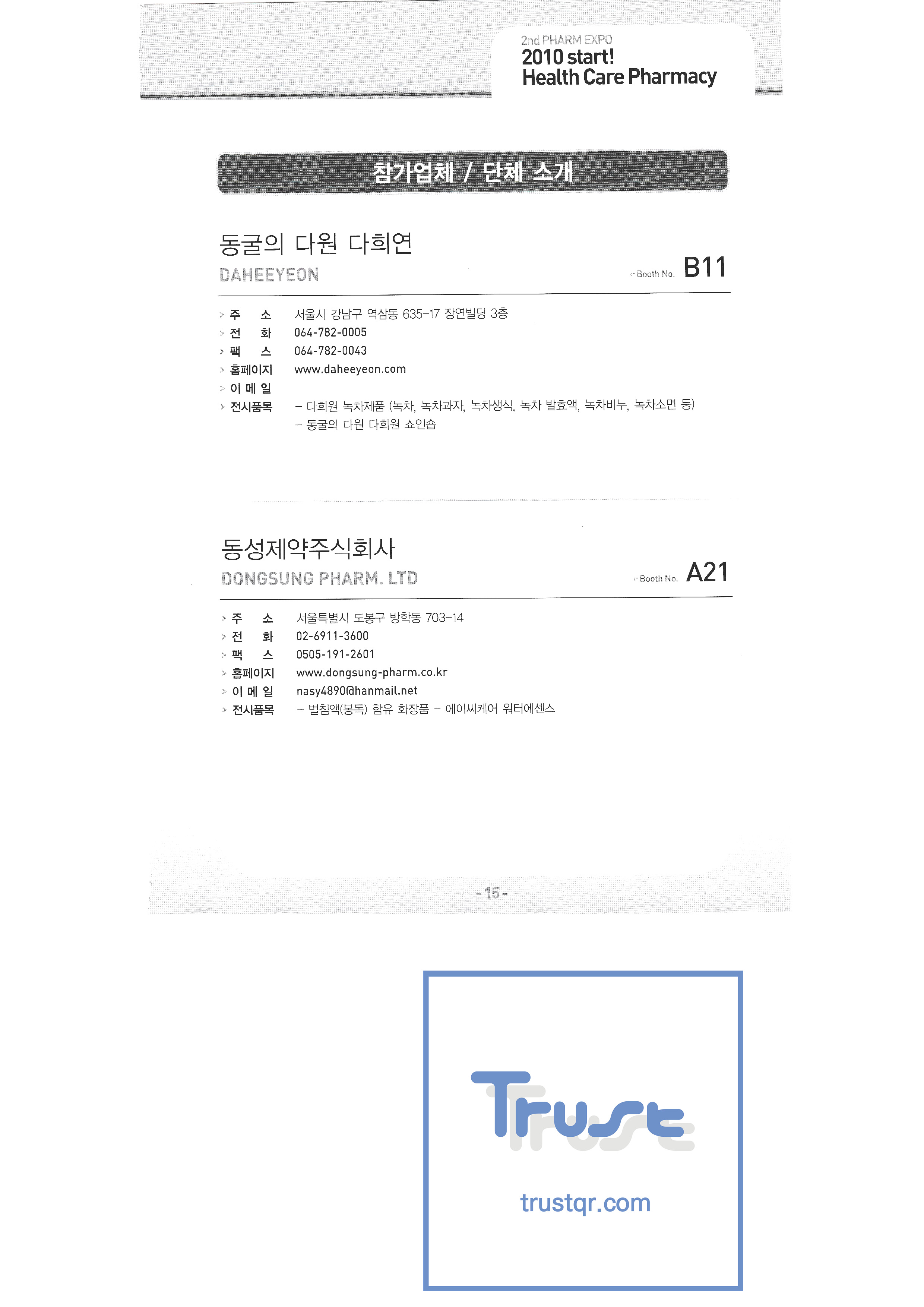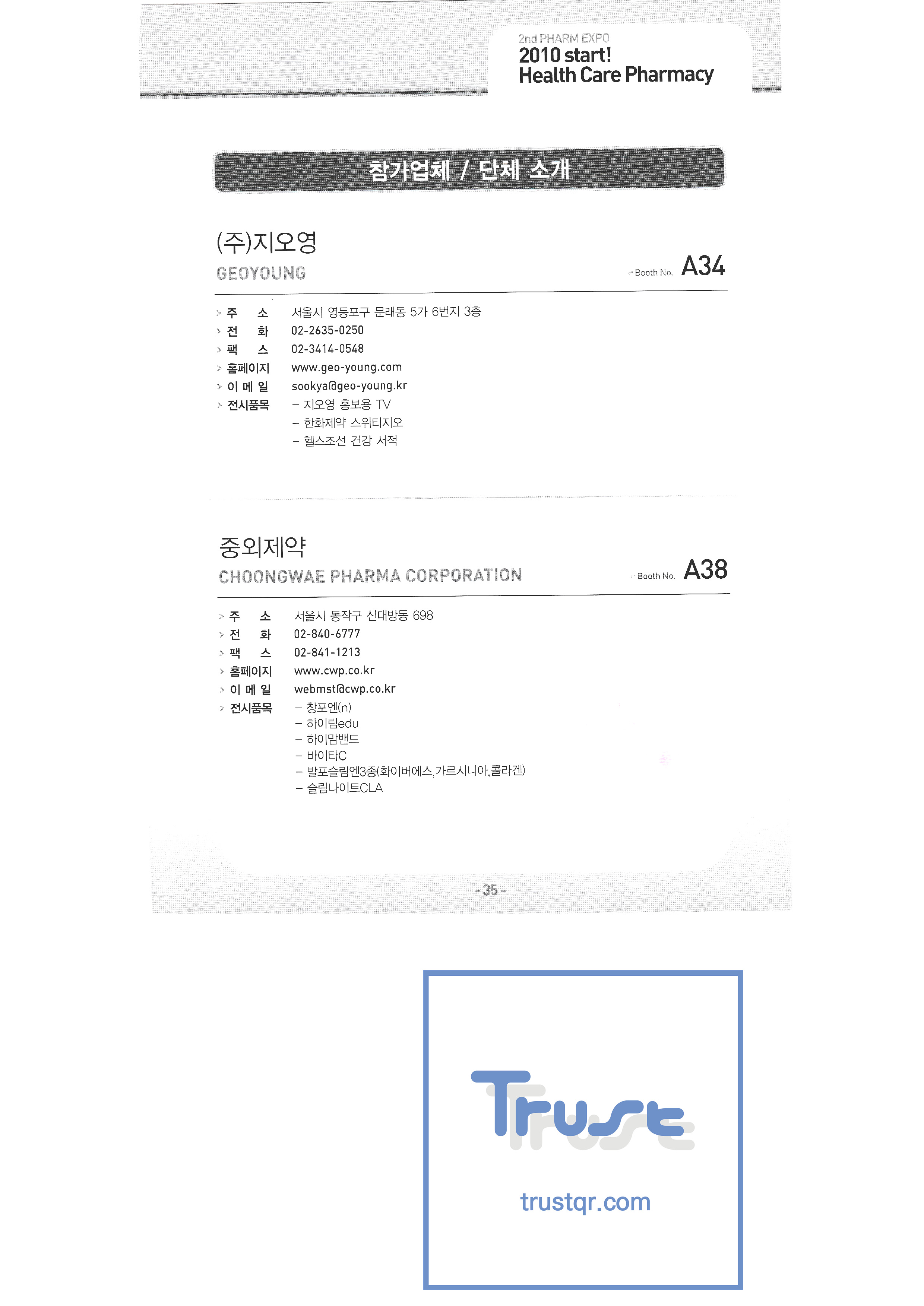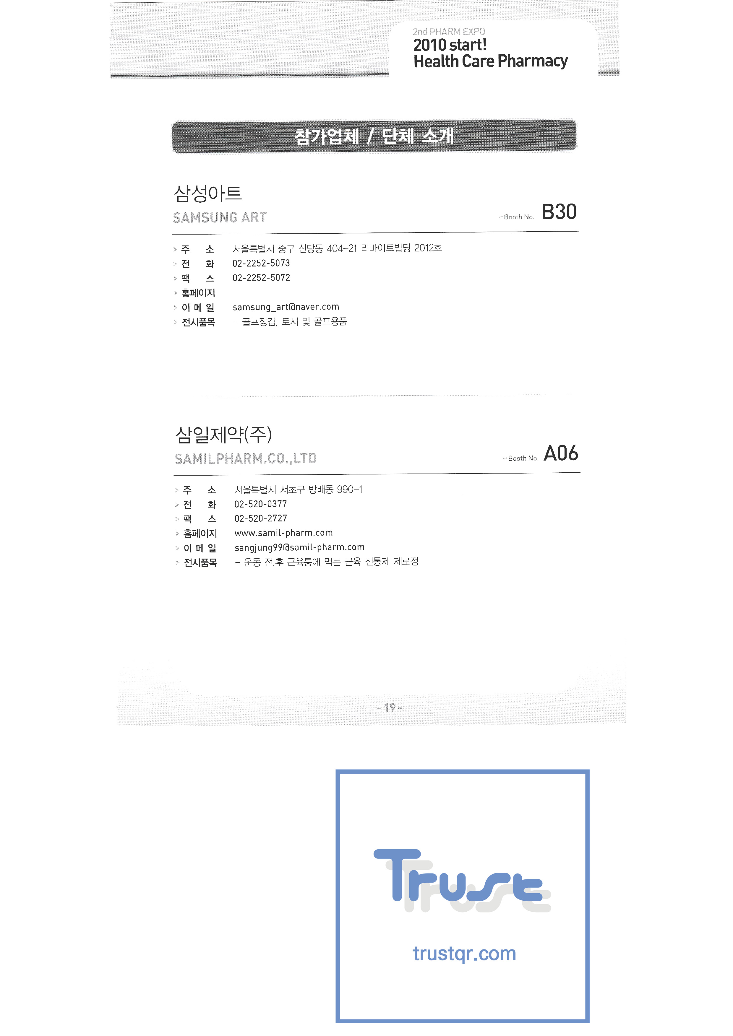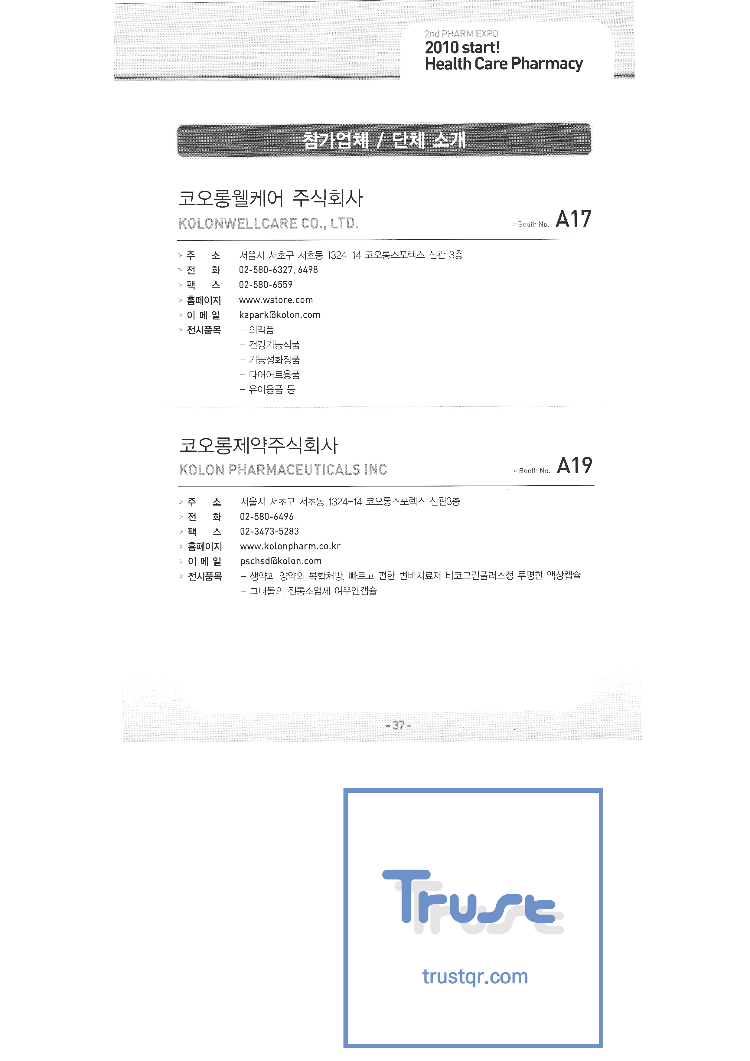 | Health Care Pharmacy 2010 게이트웨이 인스티튜트 & 팜넷 경동제약㈜ 광동제약 ㈜국민상조 주식회사 그래미 금산군인삼사업 영농조합법인 네오메디칼 네임북스 녹십자 농협홍삼 ㈜대웅제약 도서출판 신일북스 동국대학교 약학대학 동국제약 동굴의 다원 다희연 동성제약주식회사 동아제약 동화약품㈜ 두원물산 ㈜메디칼현대기획 보령제약㈜ 삼광산업 삼성아트 삼일제약㈜ 서동메디칼 주식회사 성광메디칼 실버텍스 쎌 바이오텍 ㈜쓰리라이프존 ㈜씨에이팜 씨제이제일제당㈜ 아주약품공업㈜ 안국약품㈜ ㈜알리코제약 ㈜앤디 약국체인 ㈜위드팜 약사공론 영진약품공업주식회사 주식회사 오성메디 ㈜오엔팜 ㈜온누리약국체인 올리비아내츄럴 우리들생명과학주식회사 월딘 유니메드제약 유비케어 ㈜유유제약 유한양행 일동제약 일양약품㈜ 제이브이엠 제일약품주식회사 ㈜종근당 좋은약 바른소비 ㈜지오영 중외제약 무주천마 ㈜천지인팜 코떼랑 코오롱웰케어 주식회사 코오롱제약주식회사 ㈜키노스 가족 태전약품판매㈜ 태평양제약 팜다이렉트침대.춘천연옥흙침대 팜웨이 프레스센터 한국 와이어스 한국베링거인겔하임 한국솔가㈜ 한국애보트㈜ ㈜한독약품 한미약품㈜ 현대약품㈜ 효성토요타 휴온스 |