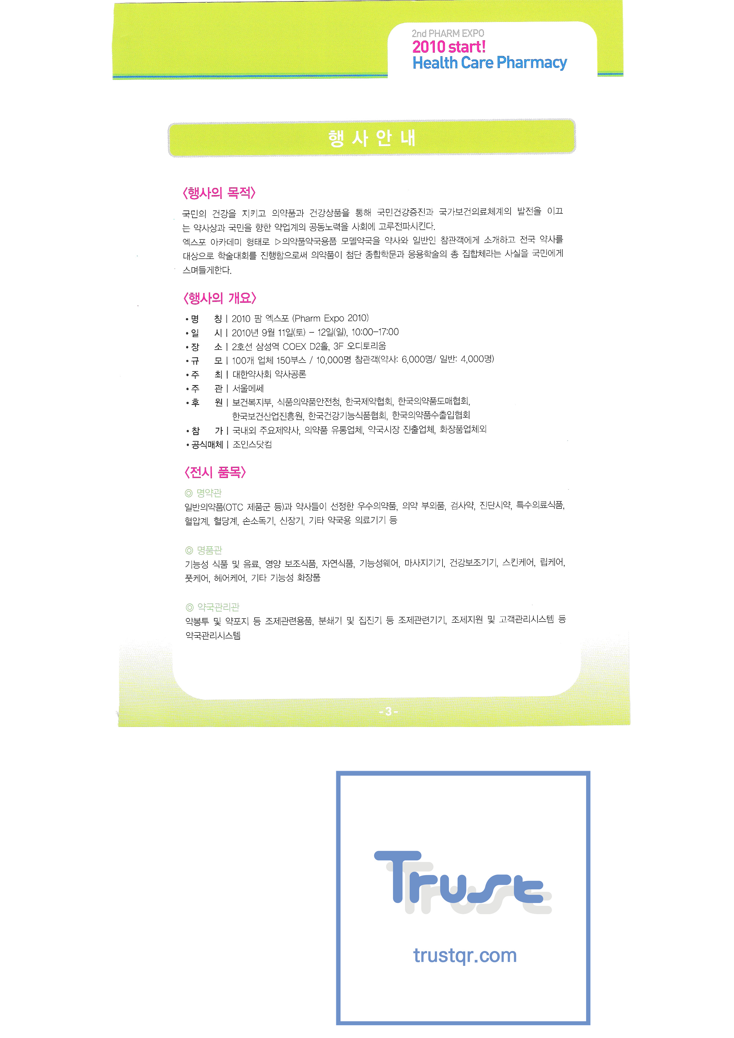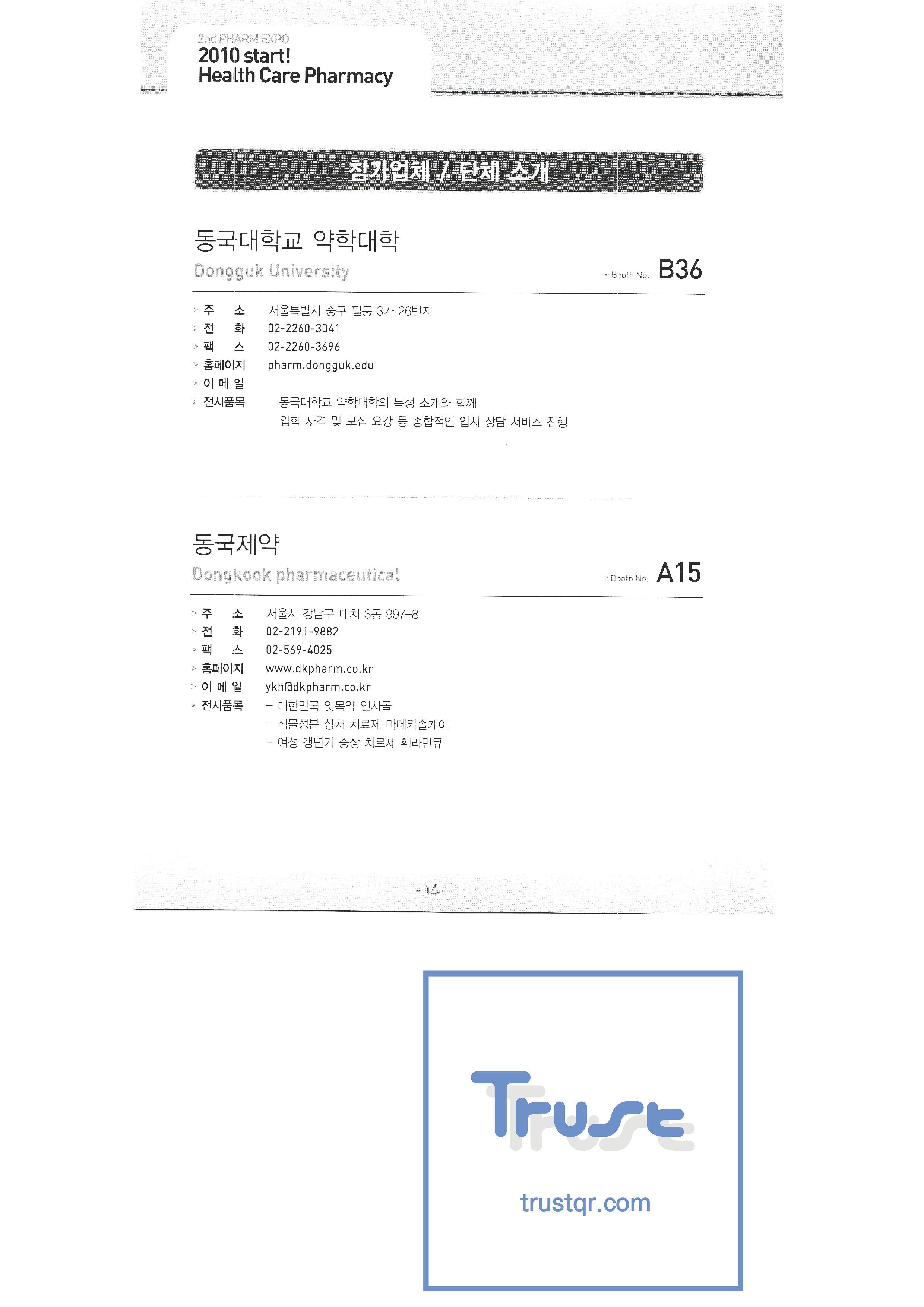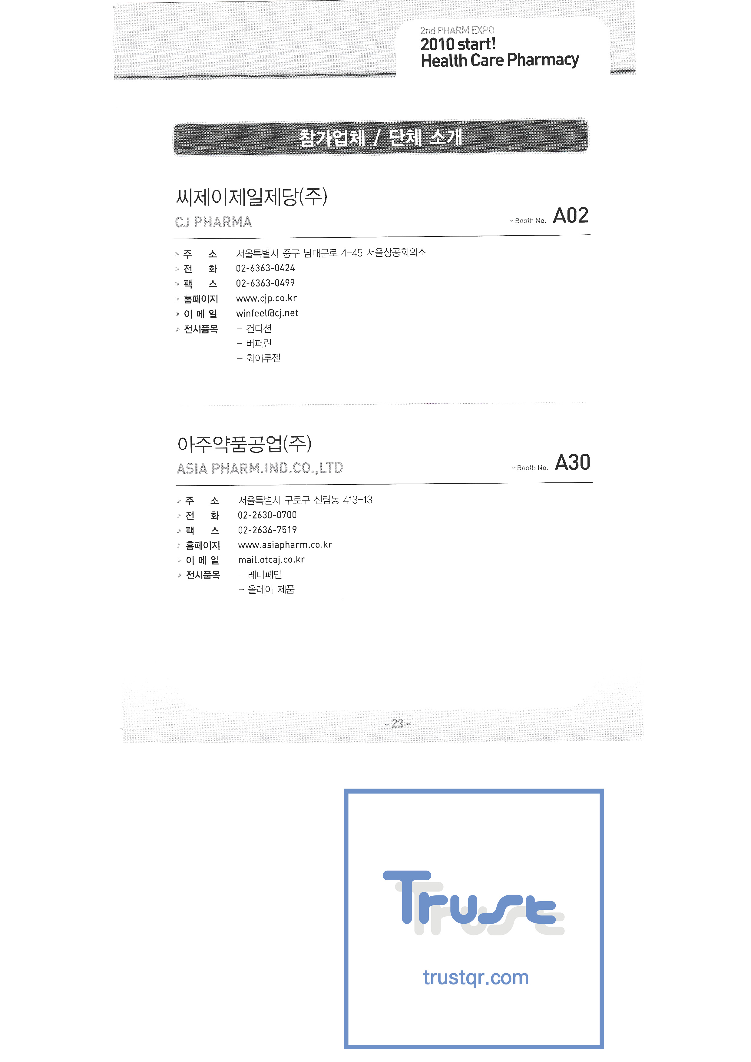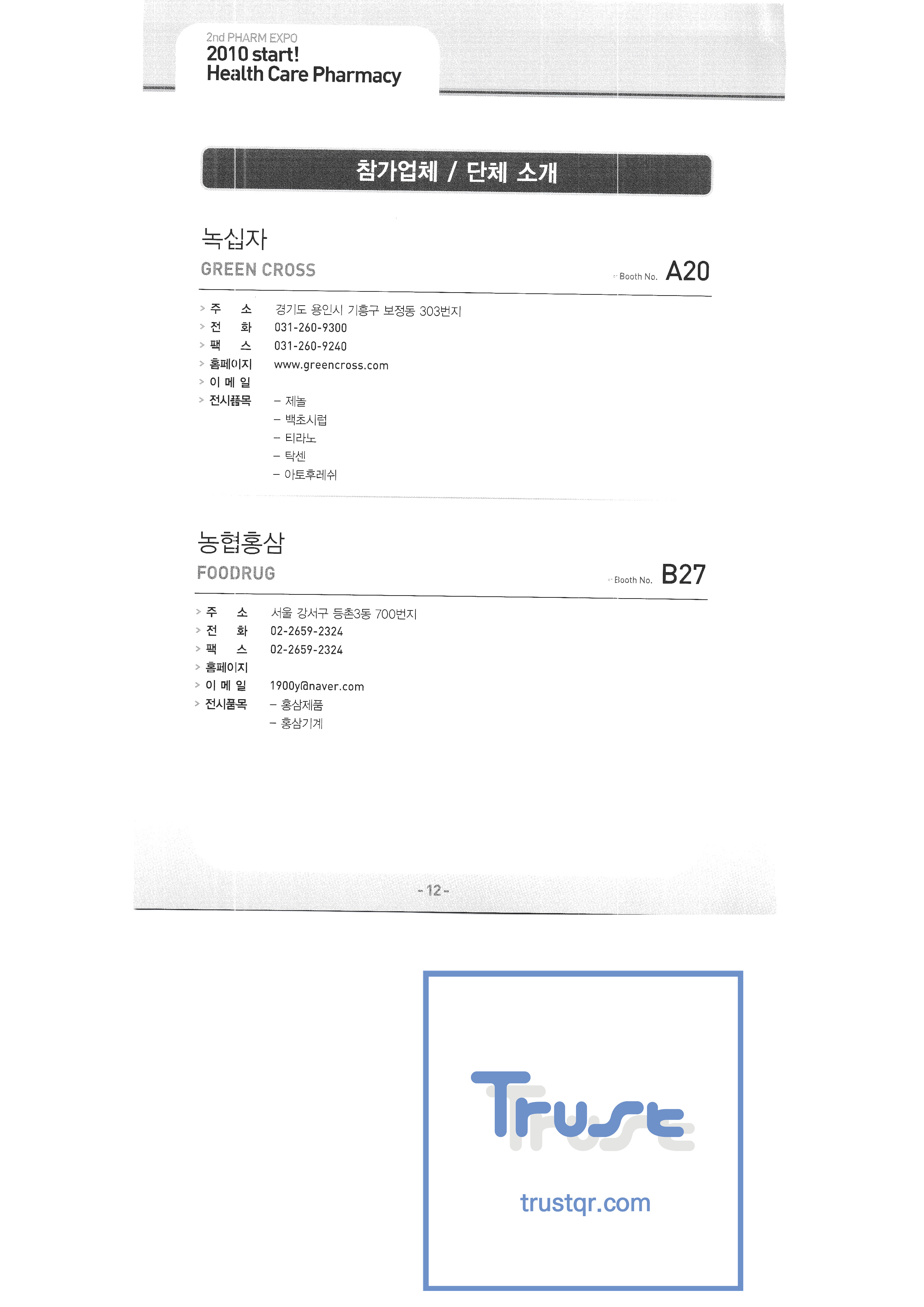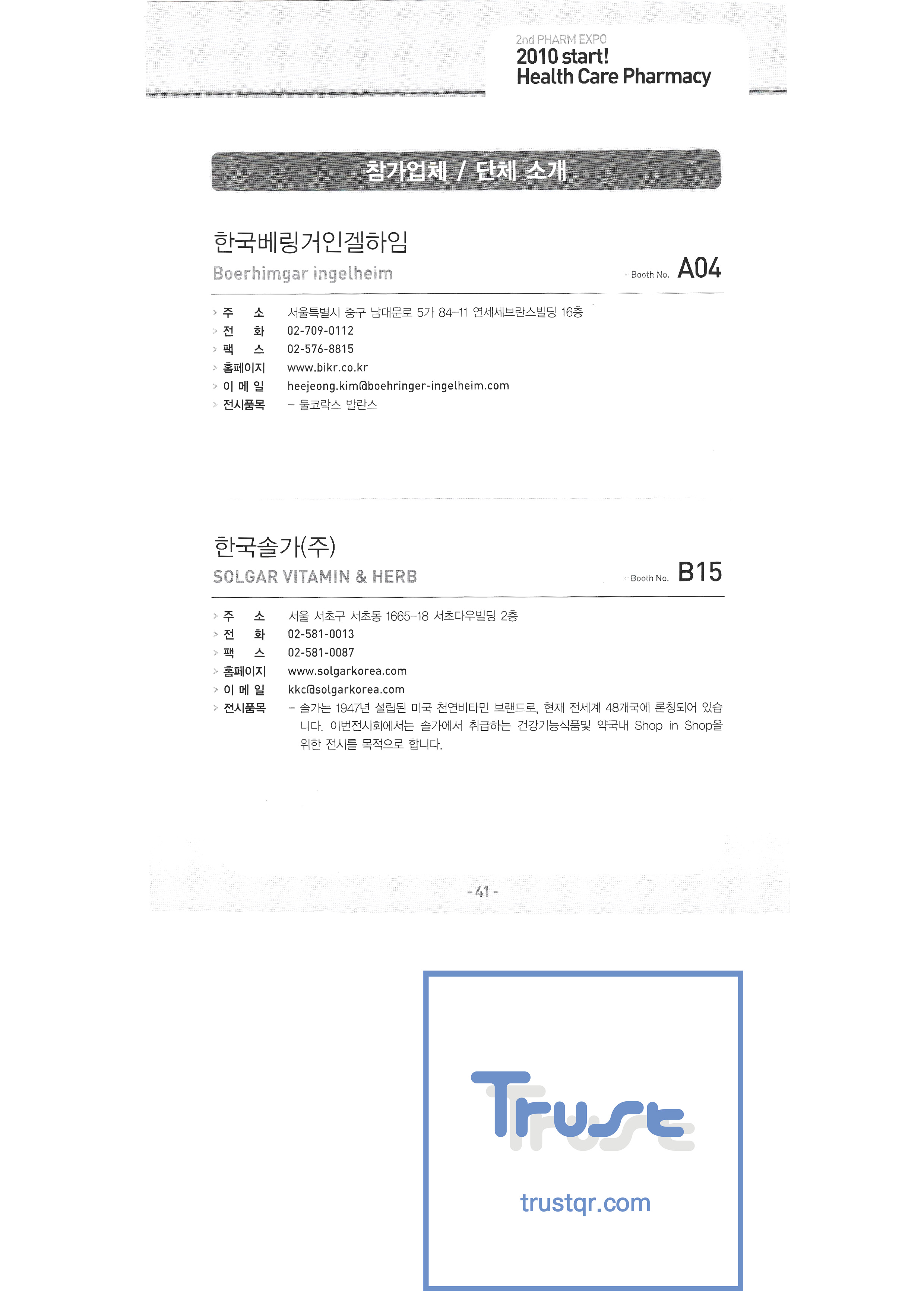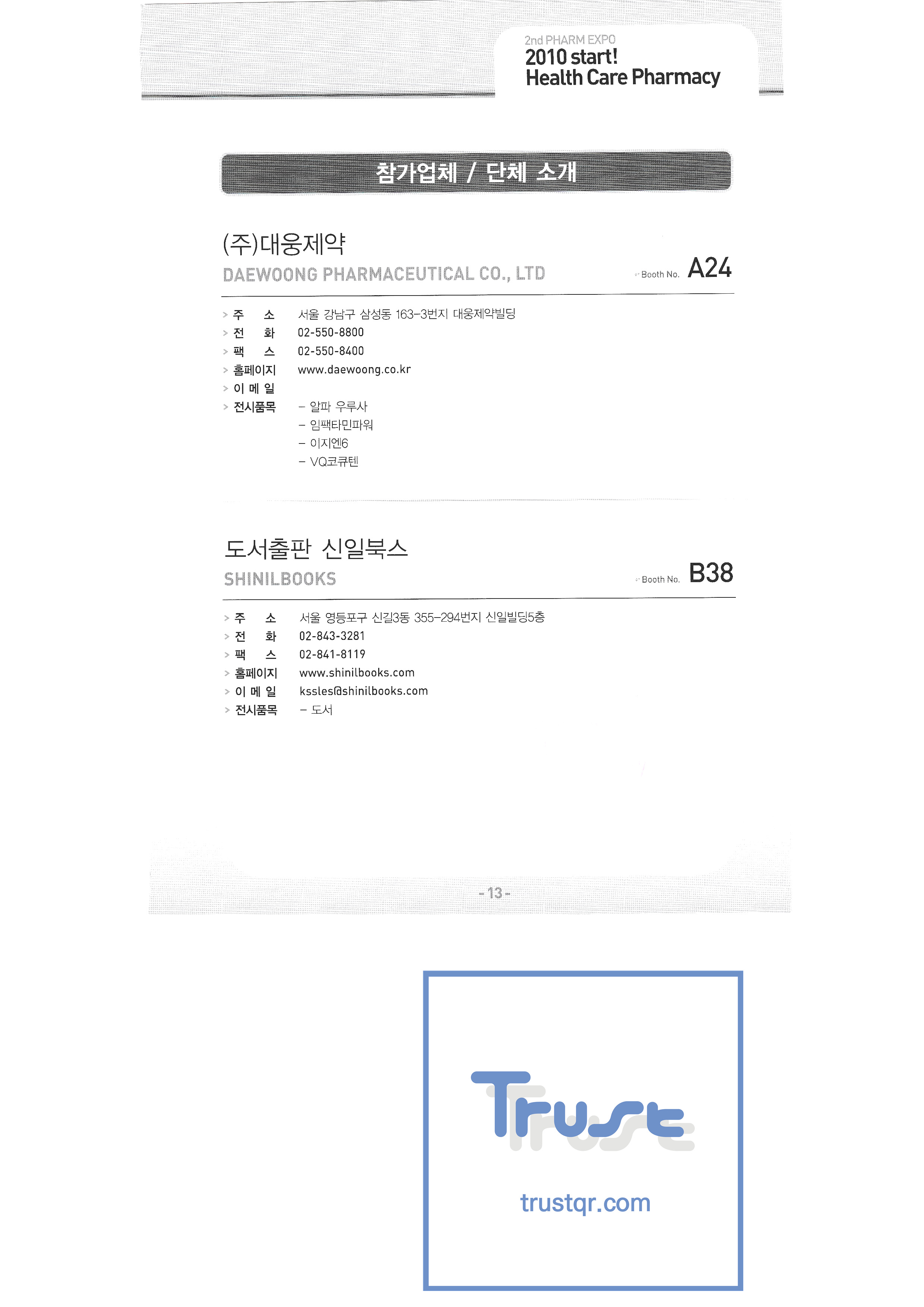 | Health Care Pharmacy 2010 게이트웨이 인스티튜트 & 팜넷 경동제약㈜ 광동제약 ㈜국민상조 주식회사 그래미 금산군인삼사업 영농조합법인 네오메디칼 네임북스 녹십자 농협홍삼 ㈜대웅제약 도서출판 신일북스 동국대학교 약학대학 동국제약 동굴의 다원 다희연 동성제약주식회사 동아제약 동화약품㈜ 두원물산 ㈜메디칼현대기획 보령제약㈜ 삼광산업 삼성아트 삼일제약㈜ 서동메디칼 주식회사 성광메디칼 실버텍스 쎌 바이오텍 ㈜쓰리라이프존 ㈜씨에이팜 씨제이제일제당㈜ 아주약품공업㈜ 안국약품㈜ ㈜알리코제약 ㈜앤디 약국체인 ㈜위드팜 약사공론 영진약품공업주식회사 주식회사 오성메디 ㈜오엔팜 ㈜온누리약국체인 올리비아내츄럴 우리들생명과학주식회사 월딘 유니메드제약 유비케어 ㈜유유제약 유한양행 일동제약 일양약품㈜ 제이브이엠 제일약품주식회사 ㈜종근당 좋은약 바른소비 ㈜지오영 중외제약 무주천마 ㈜천지인팜 코떼랑 코오롱웰케어 주식회사 코오롱제약주식회사 ㈜키노스 가족 태전약품판매㈜ 태평양제약 팜다이렉트침대.춘천연옥흙침대 팜웨이 프레스센터 한국 와이어스 한국베링거인겔하임 한국솔가㈜ 한국애보트㈜ ㈜한독약품 한미약품㈜ 현대약품㈜ 효성토요타 휴온스 |
