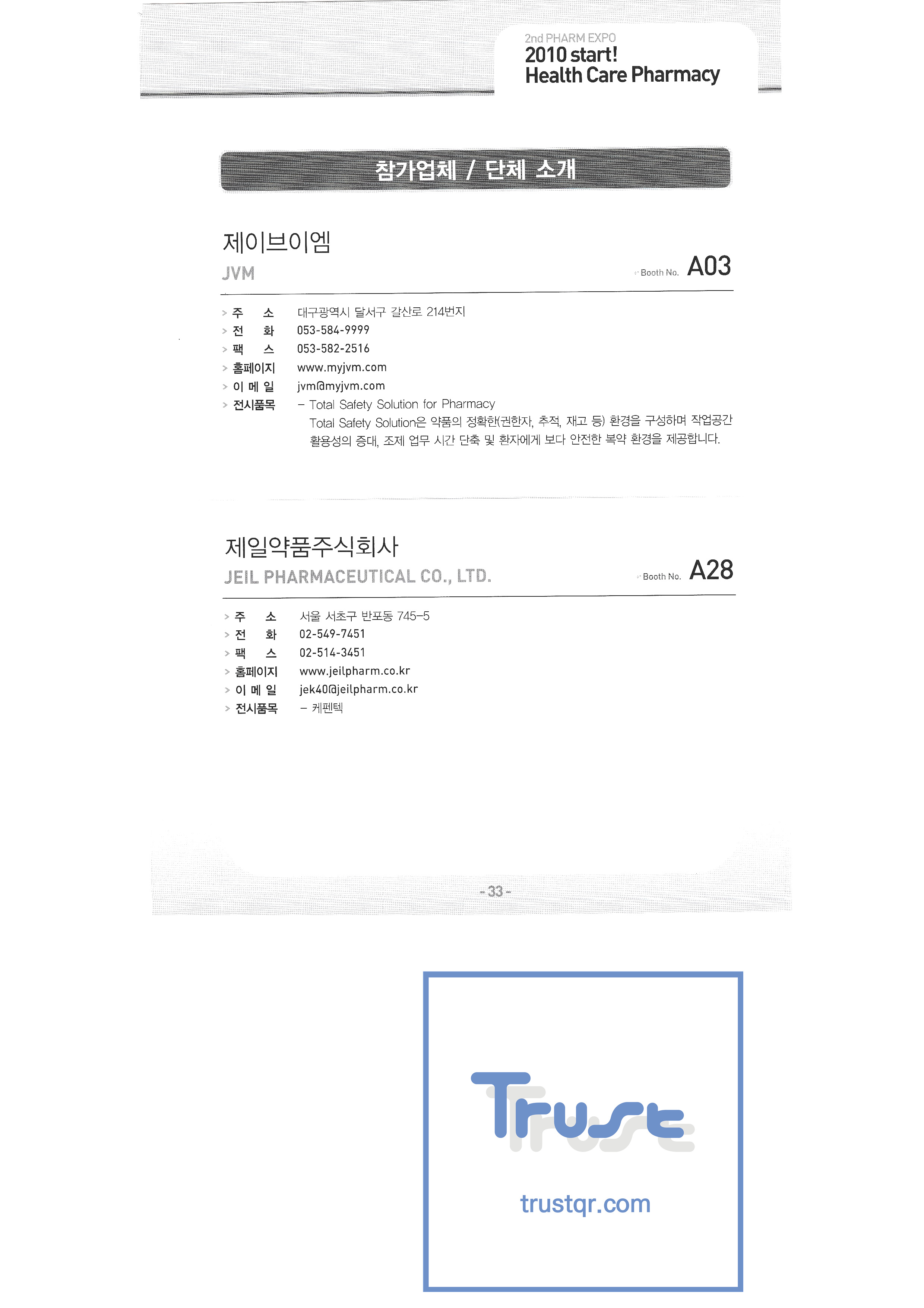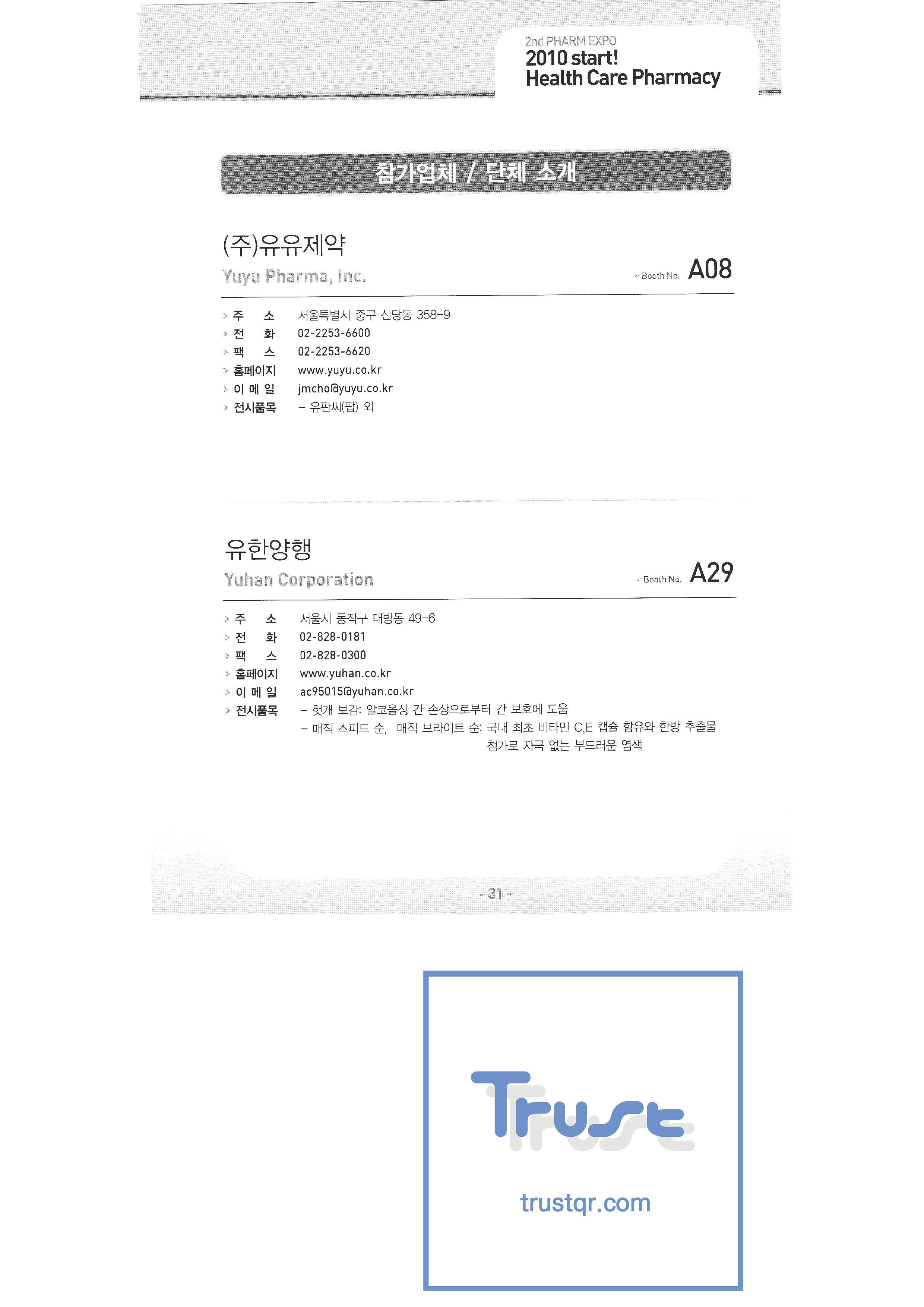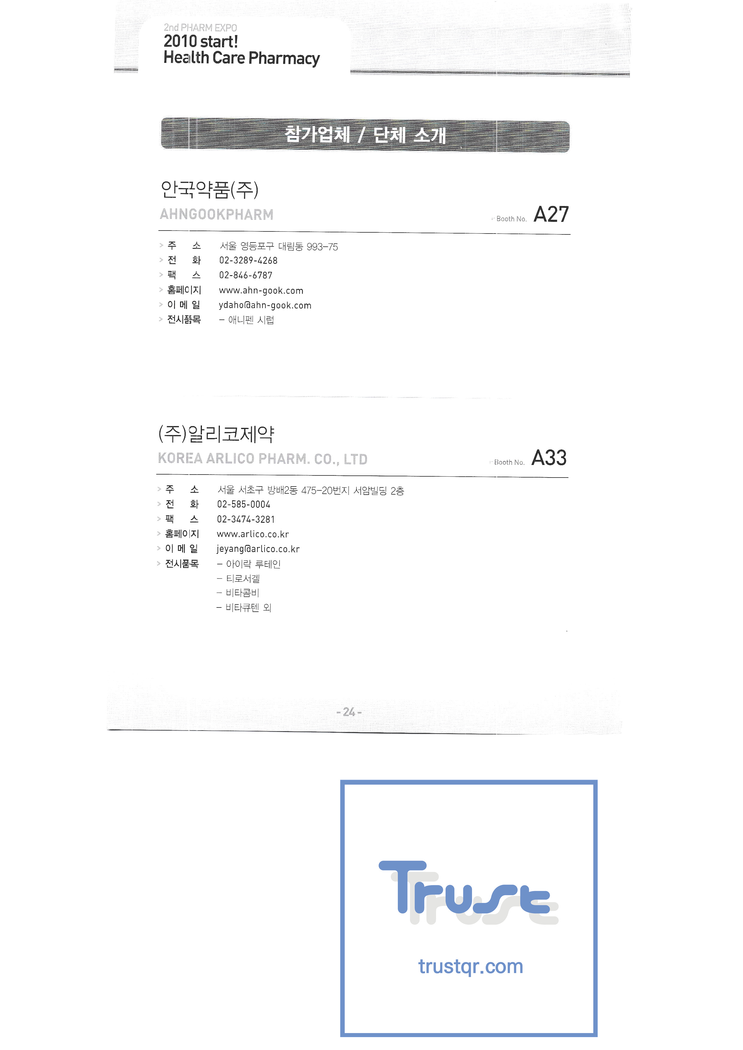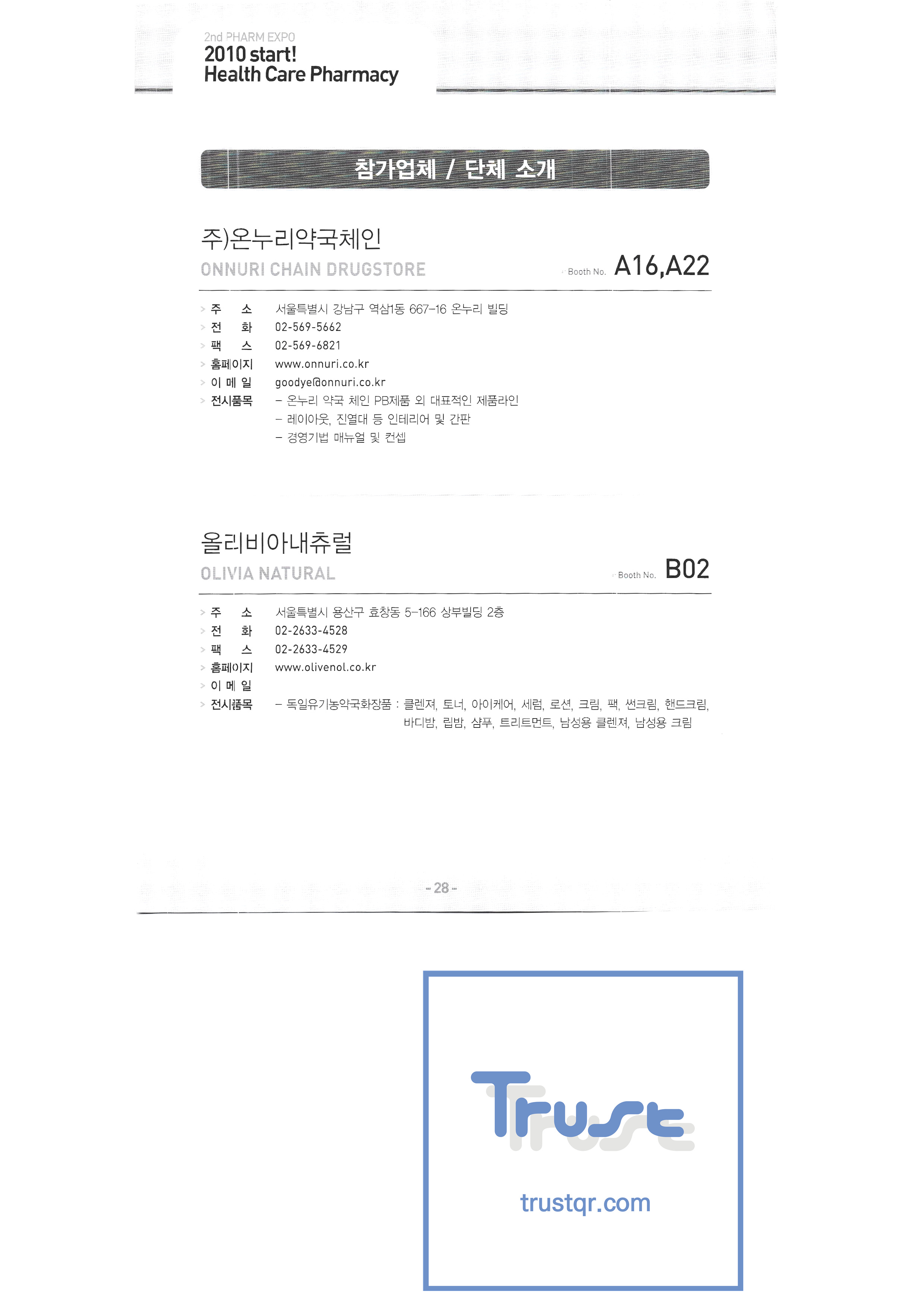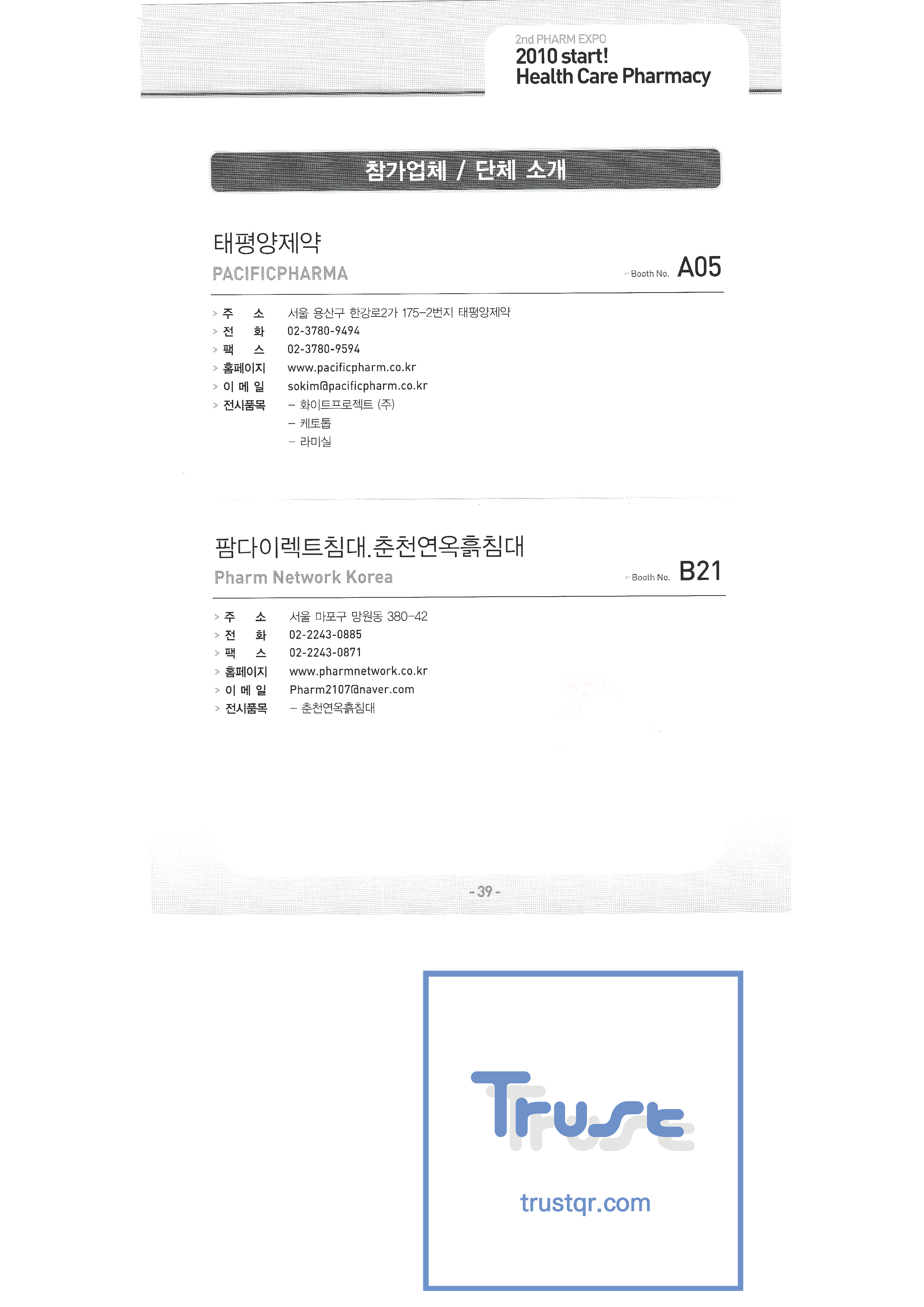 | Health Care Pharmacy 2010 게이트웨이 인스티튜트 & 팜넷 경동제약㈜ 광동제약 ㈜국민상조 주식회사 그래미 금산군인삼사업 영농조합법인 네오메디칼 네임북스 녹십자 농협홍삼 ㈜대웅제약 도서출판 신일북스 동국대학교 약학대학 동국제약 동굴의 다원 다희연 동성제약주식회사 동아제약 동화약품㈜ 두원물산 ㈜메디칼현대기획 보령제약㈜ 삼광산업 삼성아트 삼일제약㈜ 서동메디칼 주식회사 성광메디칼 실버텍스 쎌 바이오텍 ㈜쓰리라이프존 ㈜씨에이팜 씨제이제일제당㈜ 아주약품공업㈜ 안국약품㈜ ㈜알리코제약 ㈜앤디 약국체인 ㈜위드팜 약사공론 영진약품공업주식회사 주식회사 오성메디 ㈜오엔팜 ㈜온누리약국체인 올리비아내츄럴 우리들생명과학주식회사 월딘 유니메드제약 유비케어 ㈜유유제약 유한양행 일동제약 일양약품㈜ 제이브이엠 제일약품주식회사 ㈜종근당 좋은약 바른소비 ㈜지오영 중외제약 무주천마 ㈜천지인팜 코떼랑 코오롱웰케어 주식회사 코오롱제약주식회사 ㈜키노스 가족 태전약품판매㈜ 태평양제약 팜다이렉트침대.춘천연옥흙침대 팜웨이 프레스센터 한국 와이어스 한국베링거인겔하임 한국솔가㈜ 한국애보트㈜ ㈜한독약품 한미약품㈜ 현대약품㈜ 효성토요타 휴온스 |