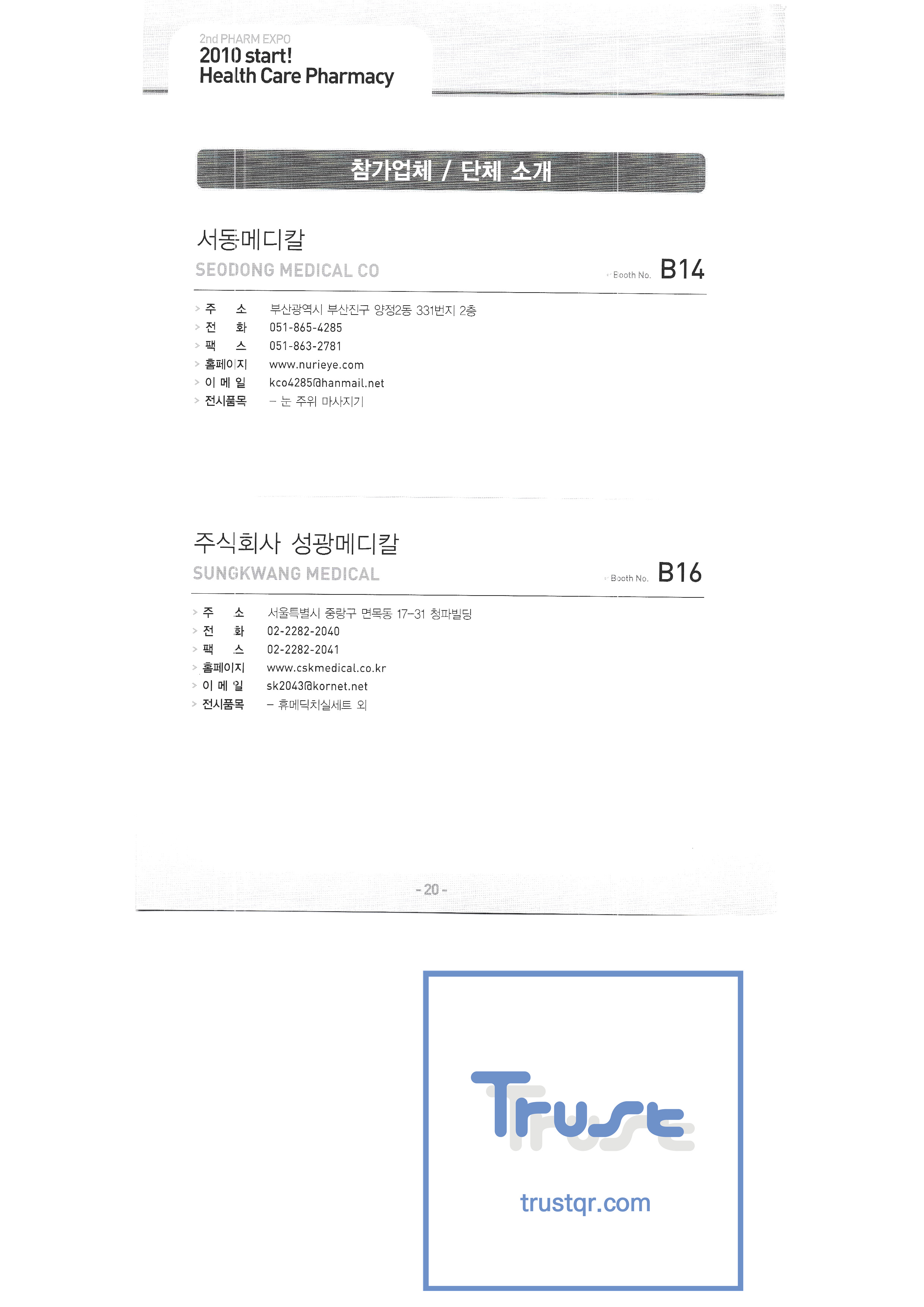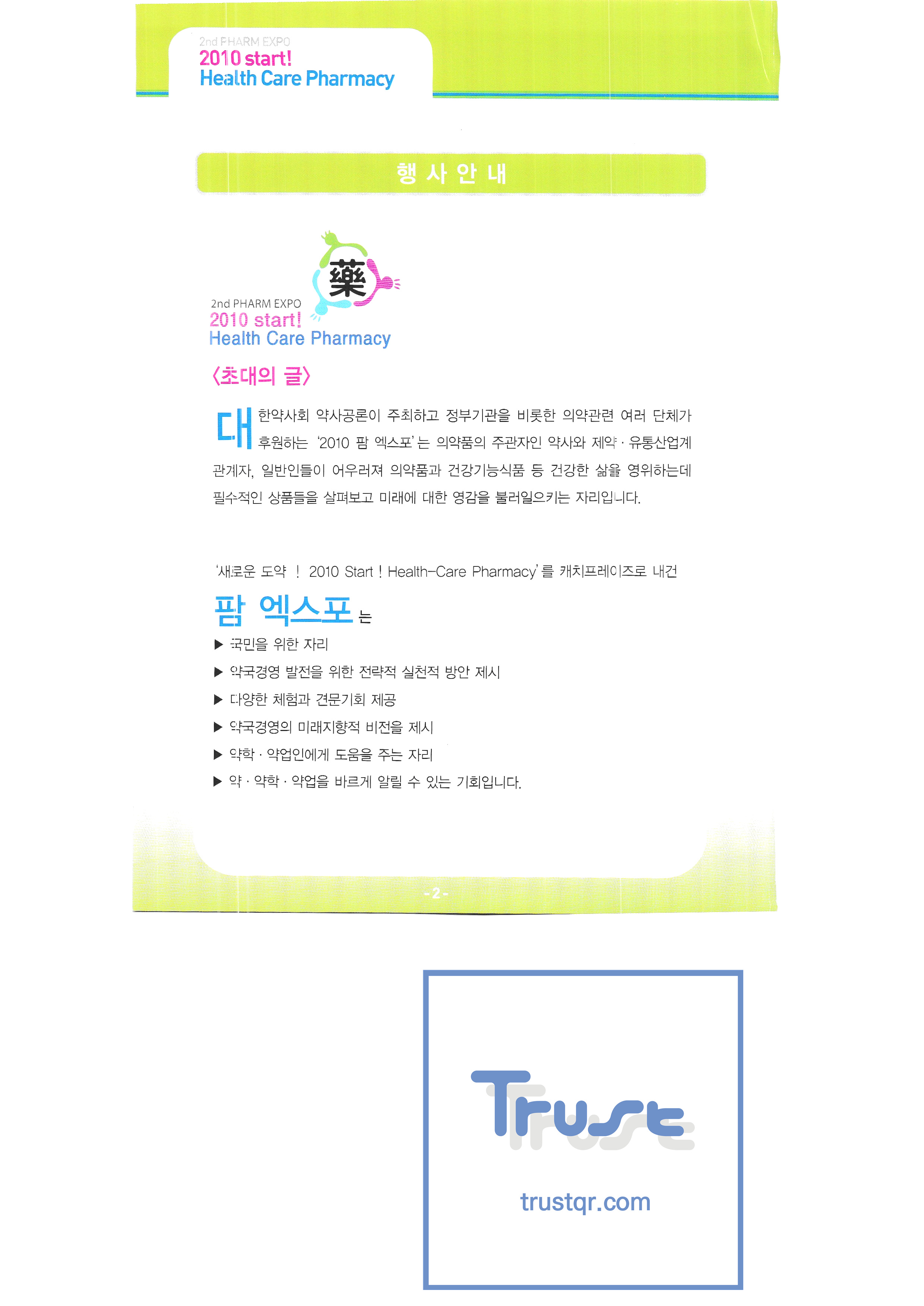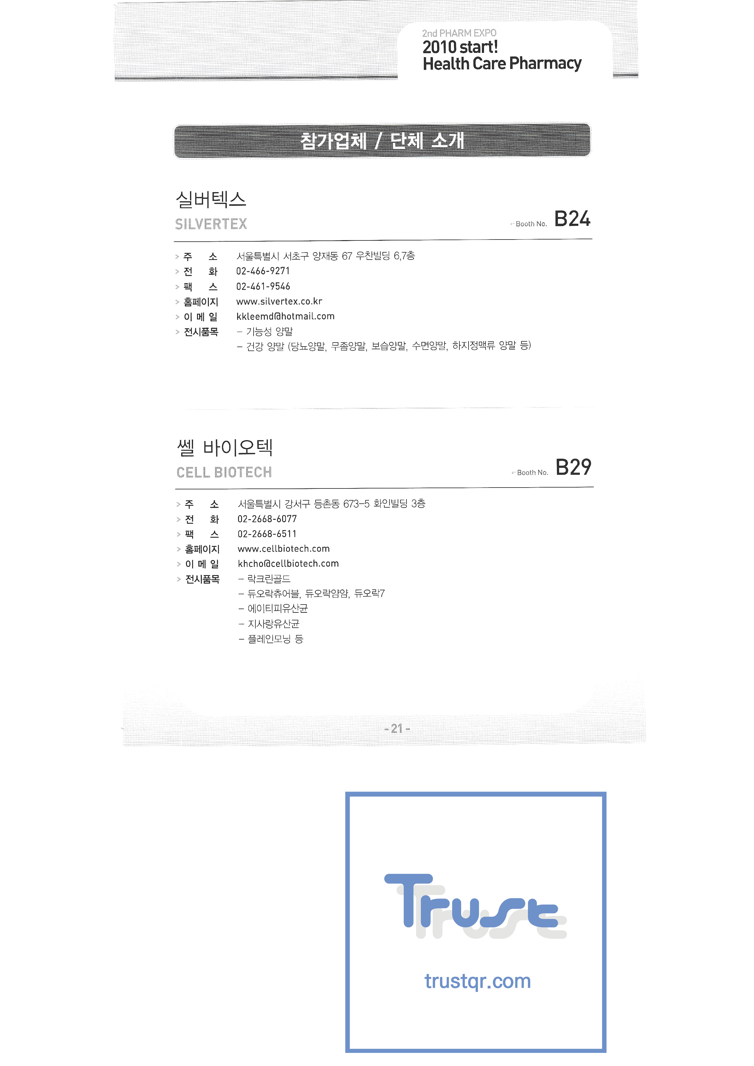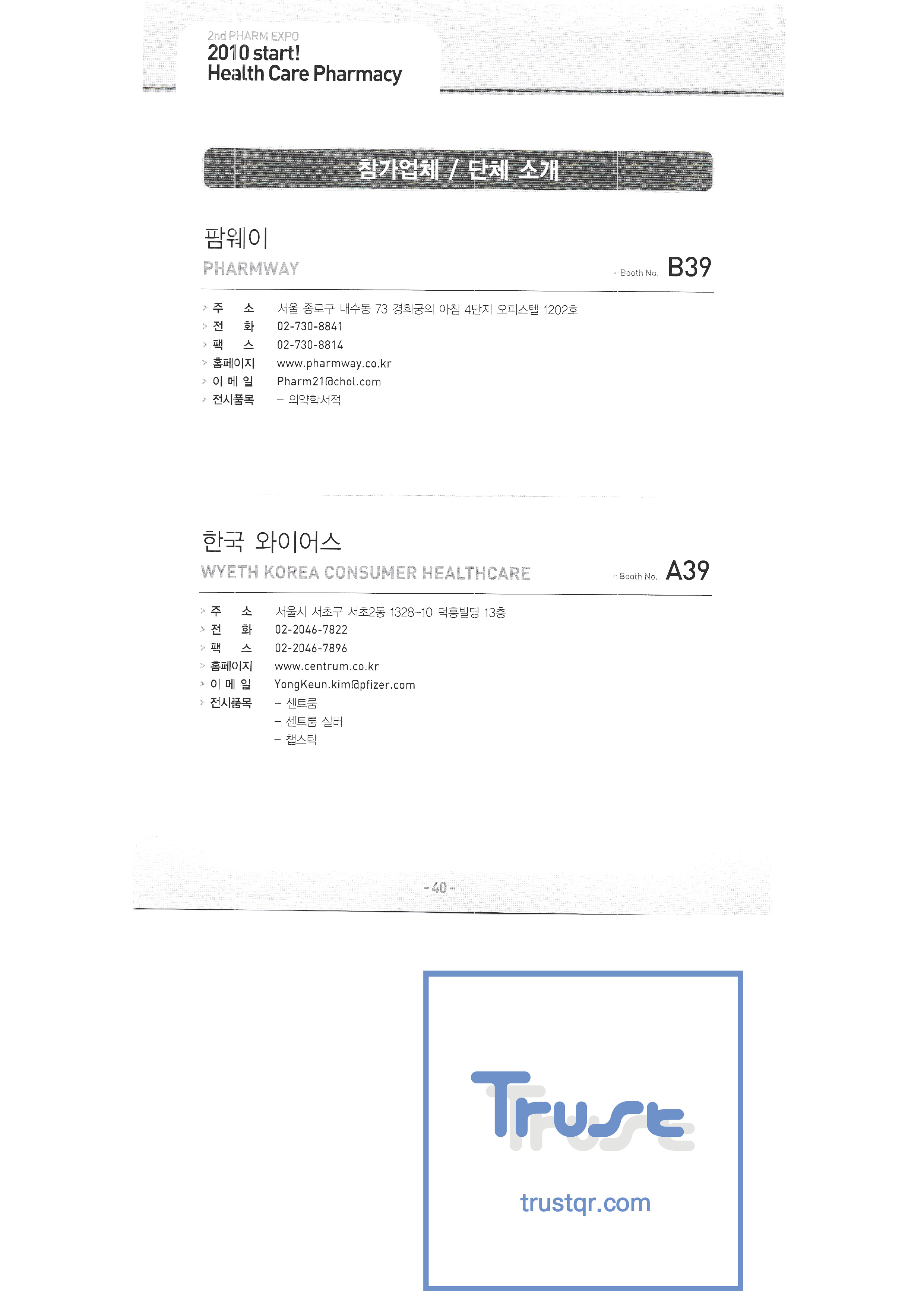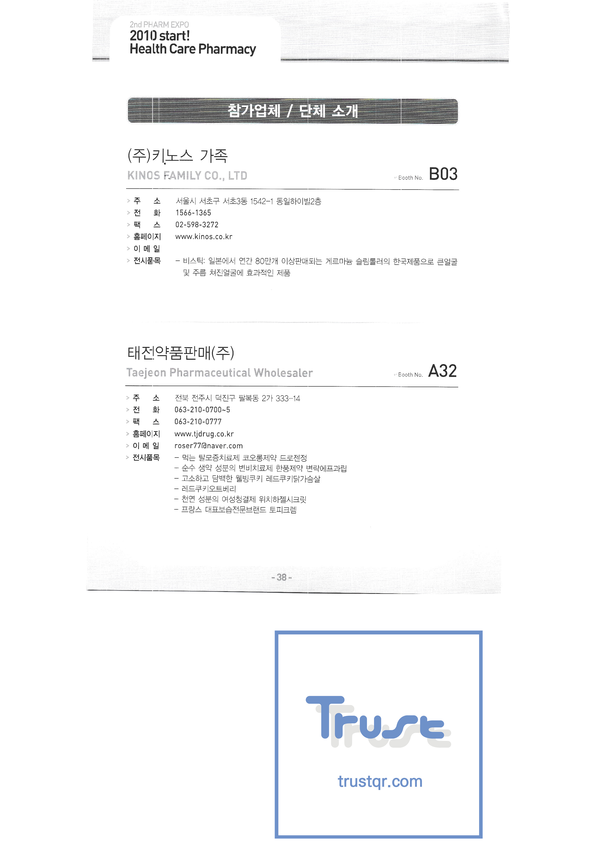 | Health Care Pharmacy 2010 게이트웨이 인스티튜트 & 팜넷 경동제약㈜ 광동제약 ㈜국민상조 주식회사 그래미 금산군인삼사업 영농조합법인 네오메디칼 네임북스 녹십자 농협홍삼 ㈜대웅제약 도서출판 신일북스 동국대학교 약학대학 동국제약 동굴의 다원 다희연 동성제약주식회사 동아제약 동화약품㈜ 두원물산 ㈜메디칼현대기획 보령제약㈜ 삼광산업 삼성아트 삼일제약㈜ 서동메디칼 주식회사 성광메디칼 실버텍스 쎌 바이오텍 ㈜쓰리라이프존 ㈜씨에이팜 씨제이제일제당㈜ 아주약품공업㈜ 안국약품㈜ ㈜알리코제약 ㈜앤디 약국체인 ㈜위드팜 약사공론 영진약품공업주식회사 주식회사 오성메디 ㈜오엔팜 ㈜온누리약국체인 올리비아내츄럴 우리들생명과학주식회사 월딘 유니메드제약 유비케어 ㈜유유제약 유한양행 일동제약 일양약품㈜ 제이브이엠 제일약품주식회사 ㈜종근당 좋은약 바른소비 ㈜지오영 중외제약 무주천마 ㈜천지인팜 코떼랑 코오롱웰케어 주식회사 코오롱제약주식회사 ㈜키노스 가족 태전약품판매㈜ 태평양제약 팜다이렉트침대.춘천연옥흙침대 팜웨이 프레스센터 한국 와이어스 한국베링거인겔하임 한국솔가㈜ 한국애보트㈜ ㈜한독약품 한미약품㈜ 현대약품㈜ 효성토요타 휴온스 |