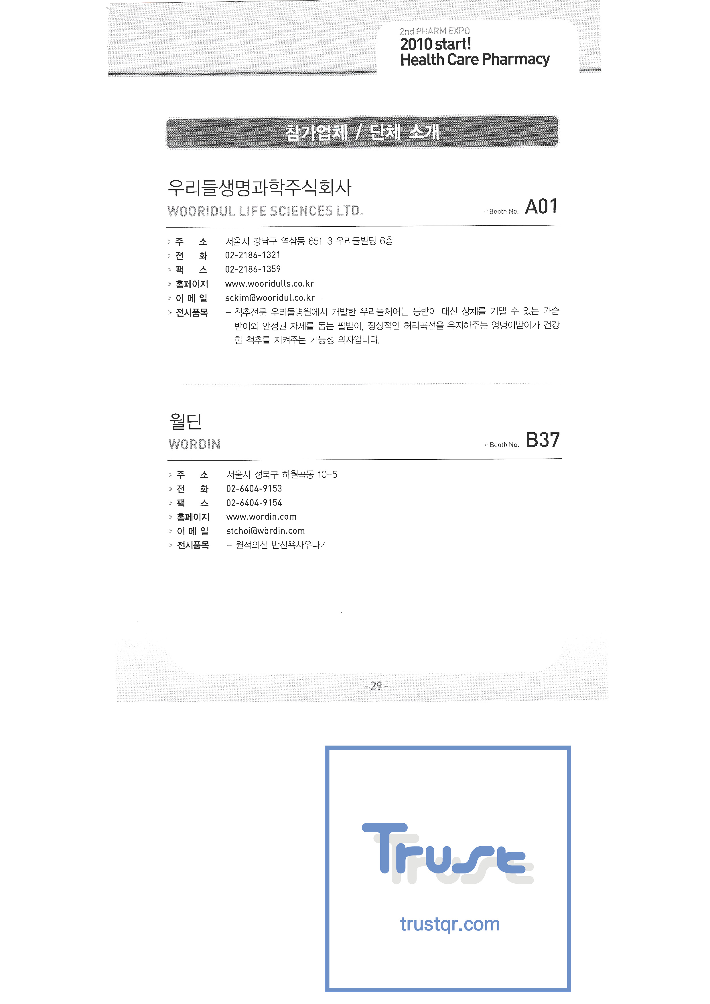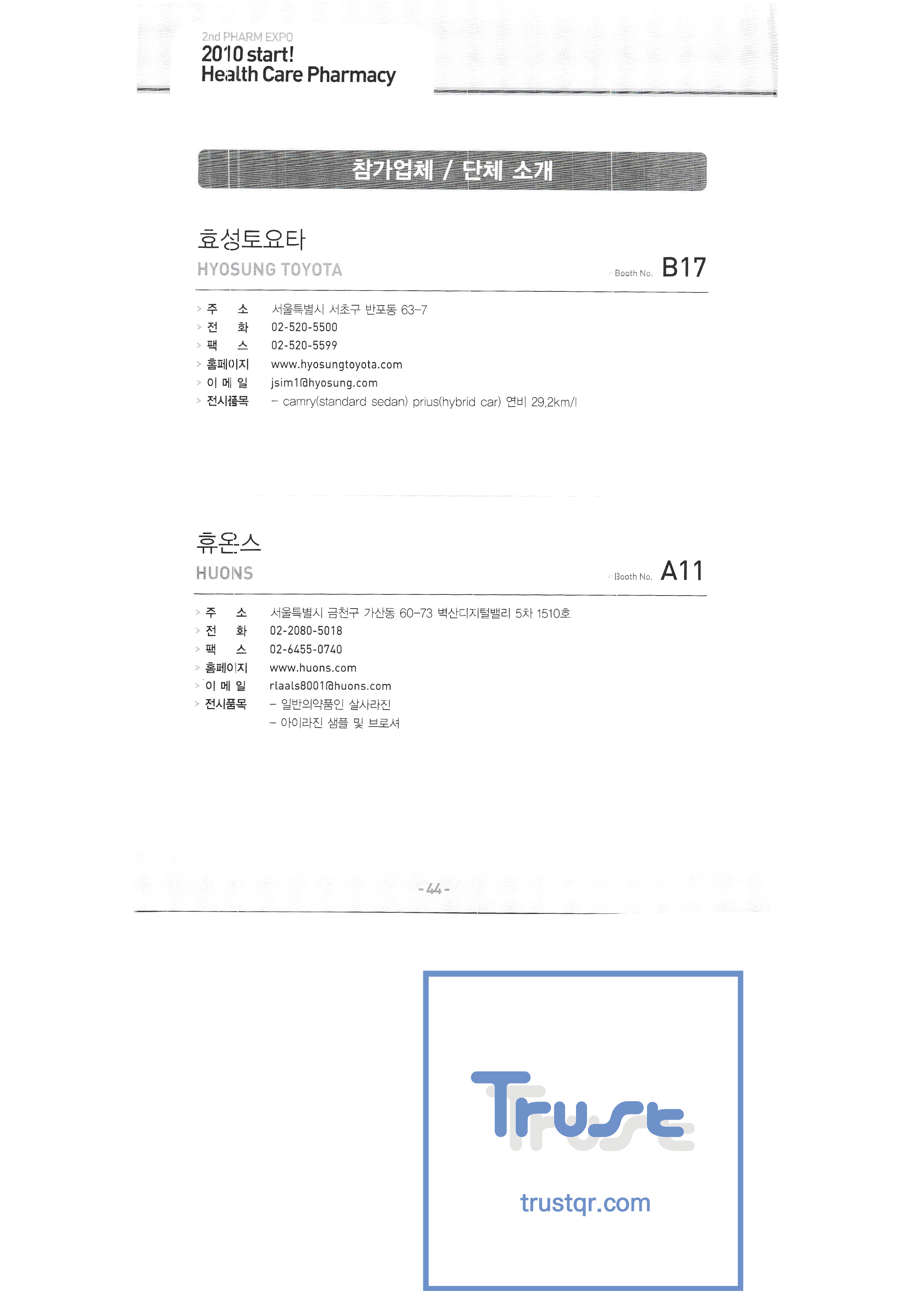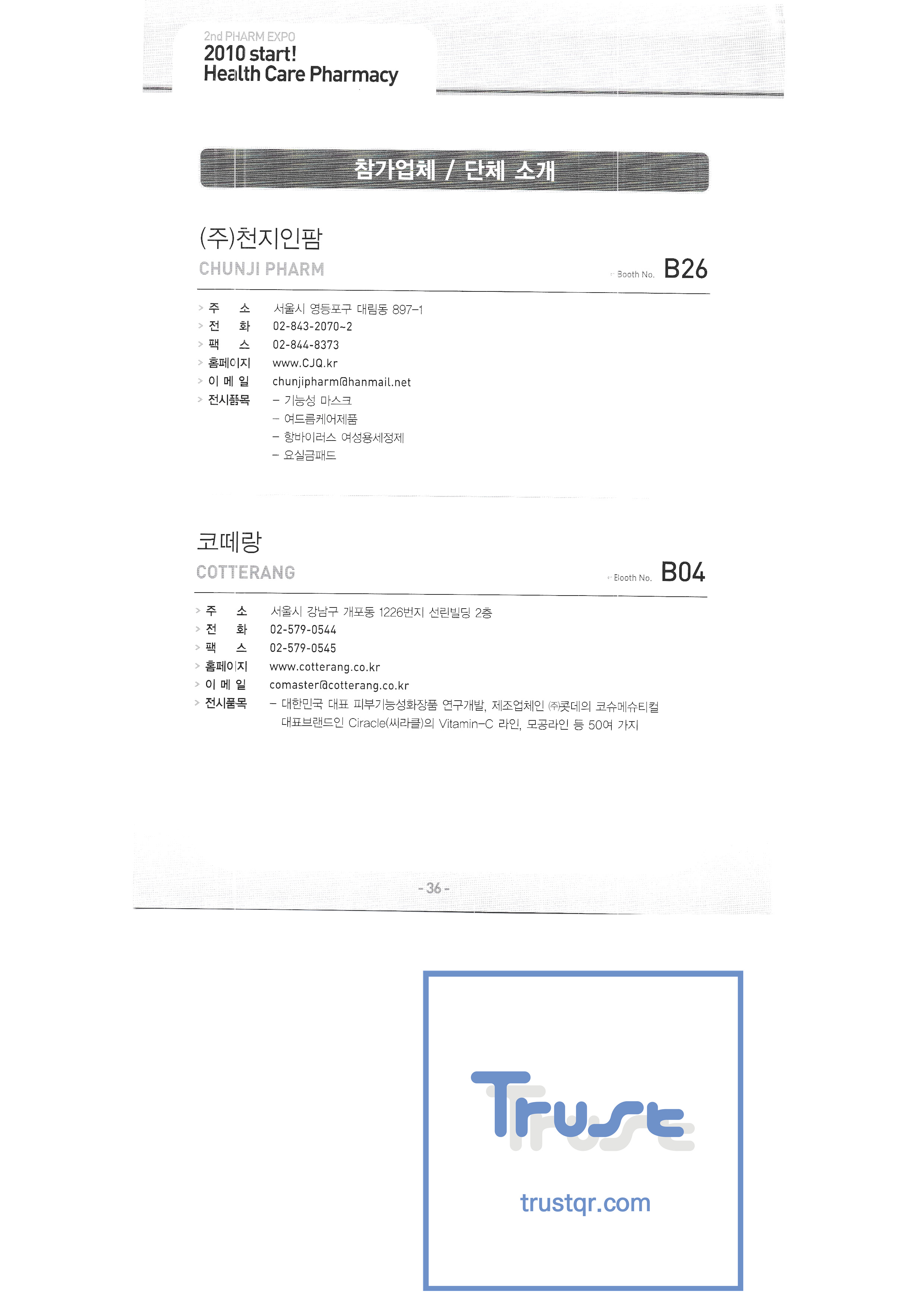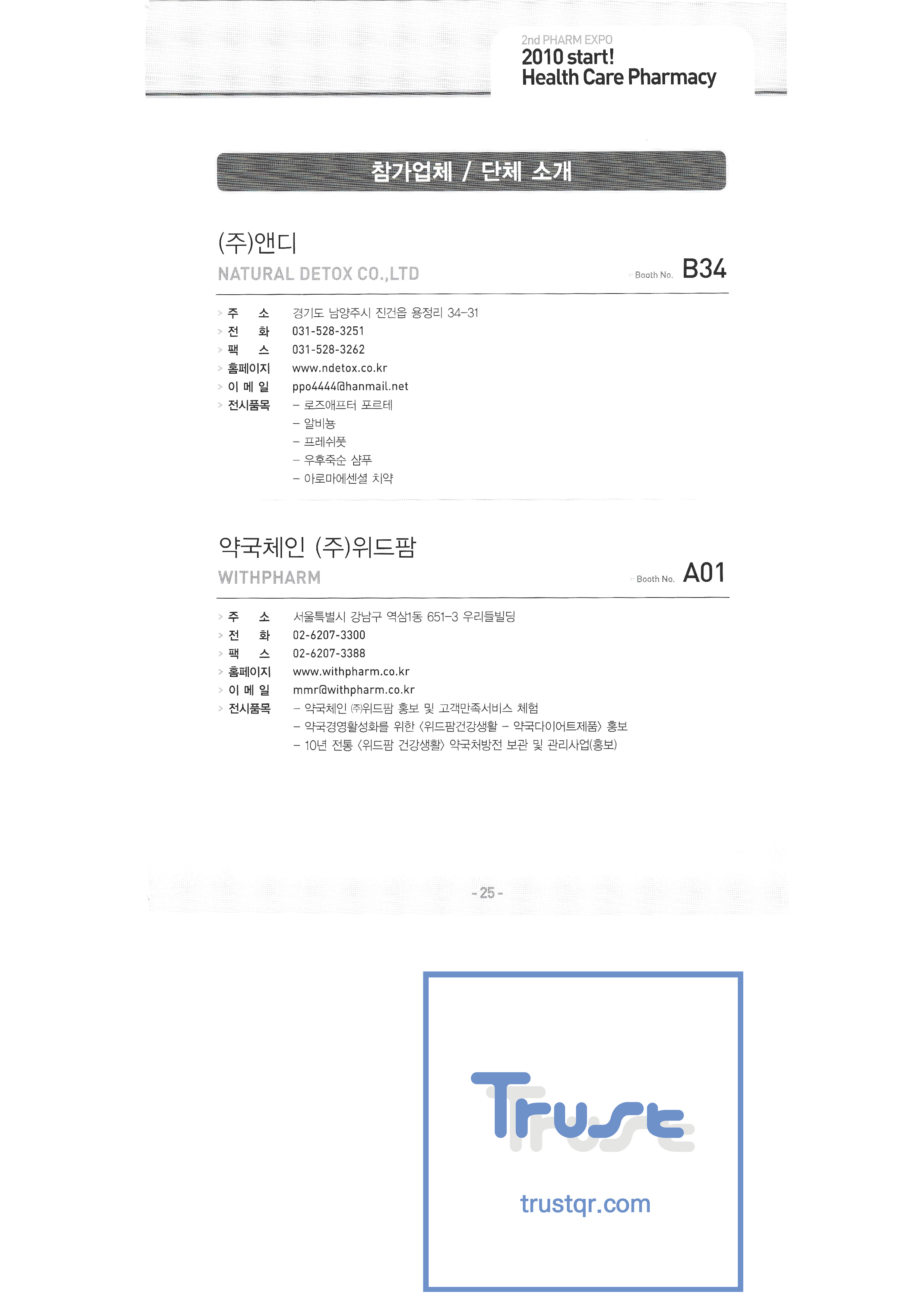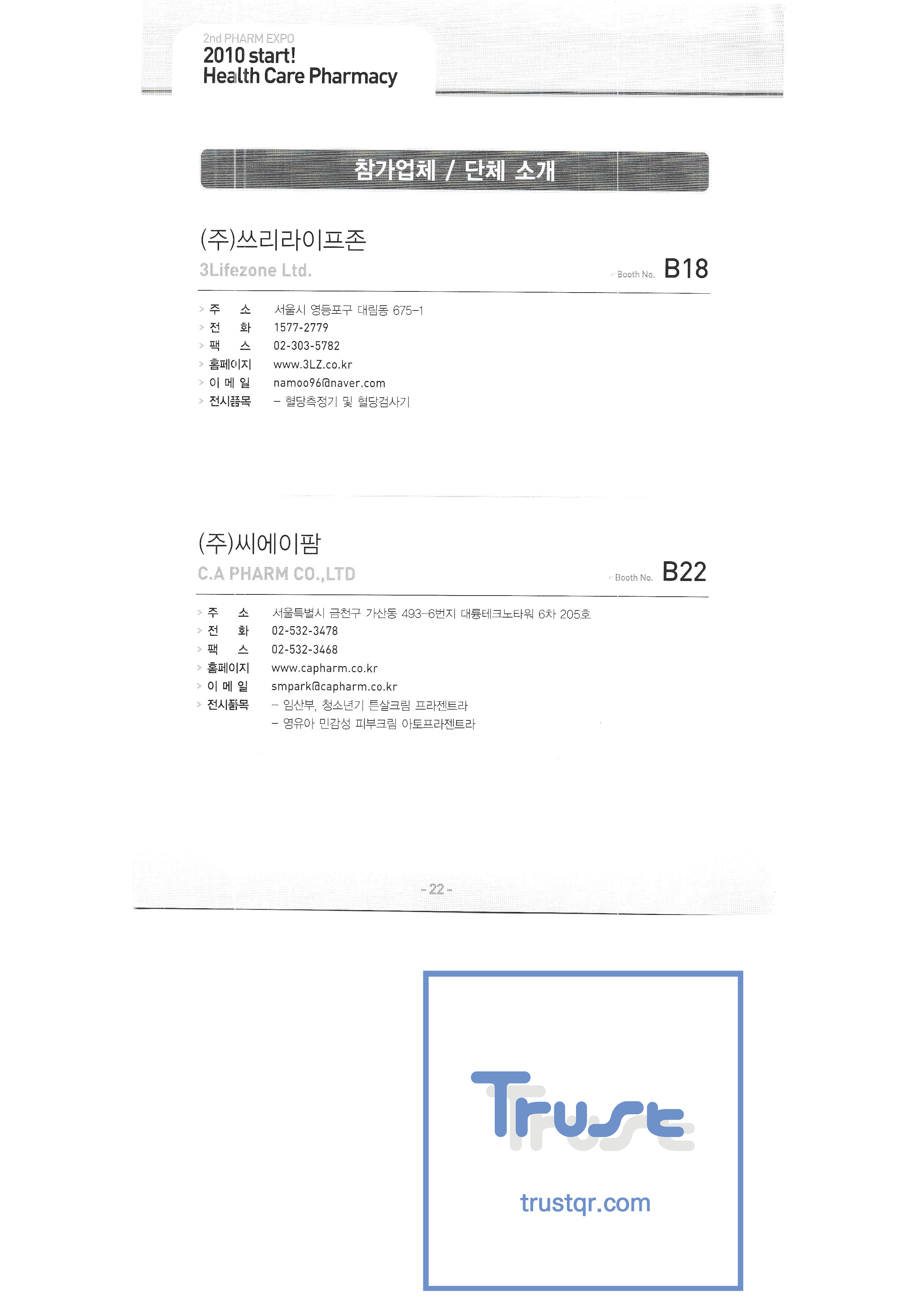 | Health Care Pharmacy 2010 게이트웨이 인스티튜트 & 팜넷 경동제약㈜ 광동제약 ㈜국민상조 주식회사 그래미 금산군인삼사업 영농조합법인 네오메디칼 네임북스 녹십자 농협홍삼 ㈜대웅제약 도서출판 신일북스 동국대학교 약학대학 동국제약 동굴의 다원 다희연 동성제약주식회사 동아제약 동화약품㈜ 두원물산 ㈜메디칼현대기획 보령제약㈜ 삼광산업 삼성아트 삼일제약㈜ 서동메디칼 주식회사 성광메디칼 실버텍스 쎌 바이오텍 ㈜쓰리라이프존 ㈜씨에이팜 씨제이제일제당㈜ 아주약품공업㈜ 안국약품㈜ ㈜알리코제약 ㈜앤디 약국체인 ㈜위드팜 약사공론 영진약품공업주식회사 주식회사 오성메디 ㈜오엔팜 ㈜온누리약국체인 올리비아내츄럴 우리들생명과학주식회사 월딘 유니메드제약 유비케어 ㈜유유제약 유한양행 일동제약 일양약품㈜ 제이브이엠 제일약품주식회사 ㈜종근당 좋은약 바른소비 ㈜지오영 중외제약 무주천마 ㈜천지인팜 코떼랑 코오롱웰케어 주식회사 코오롱제약주식회사 ㈜키노스 가족 태전약품판매㈜ 태평양제약 팜다이렉트침대.춘천연옥흙침대 팜웨이 프레스센터 한국 와이어스 한국베링거인겔하임 한국솔가㈜ 한국애보트㈜ ㈜한독약품 한미약품㈜ 현대약품㈜ 효성토요타 휴온스 |