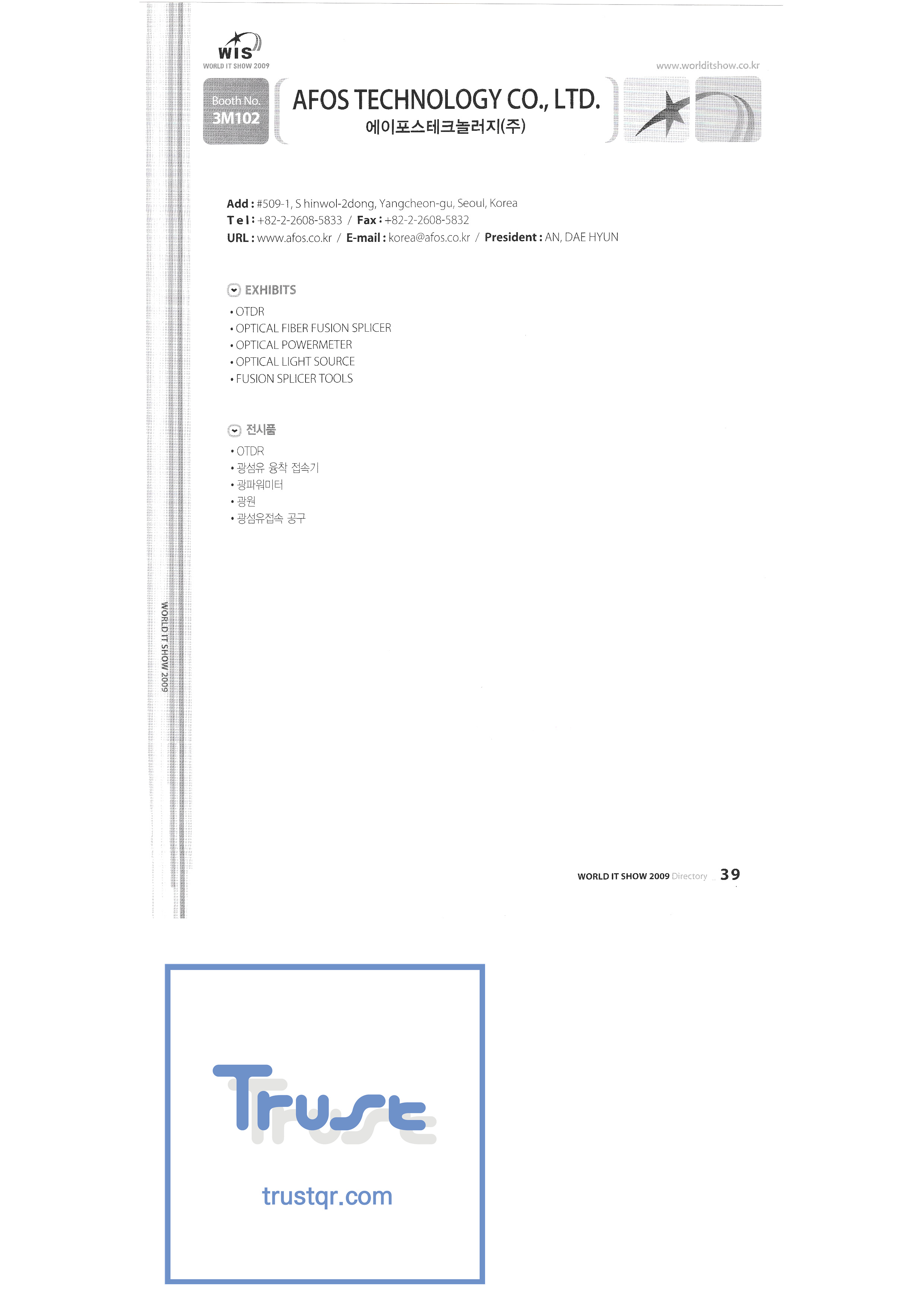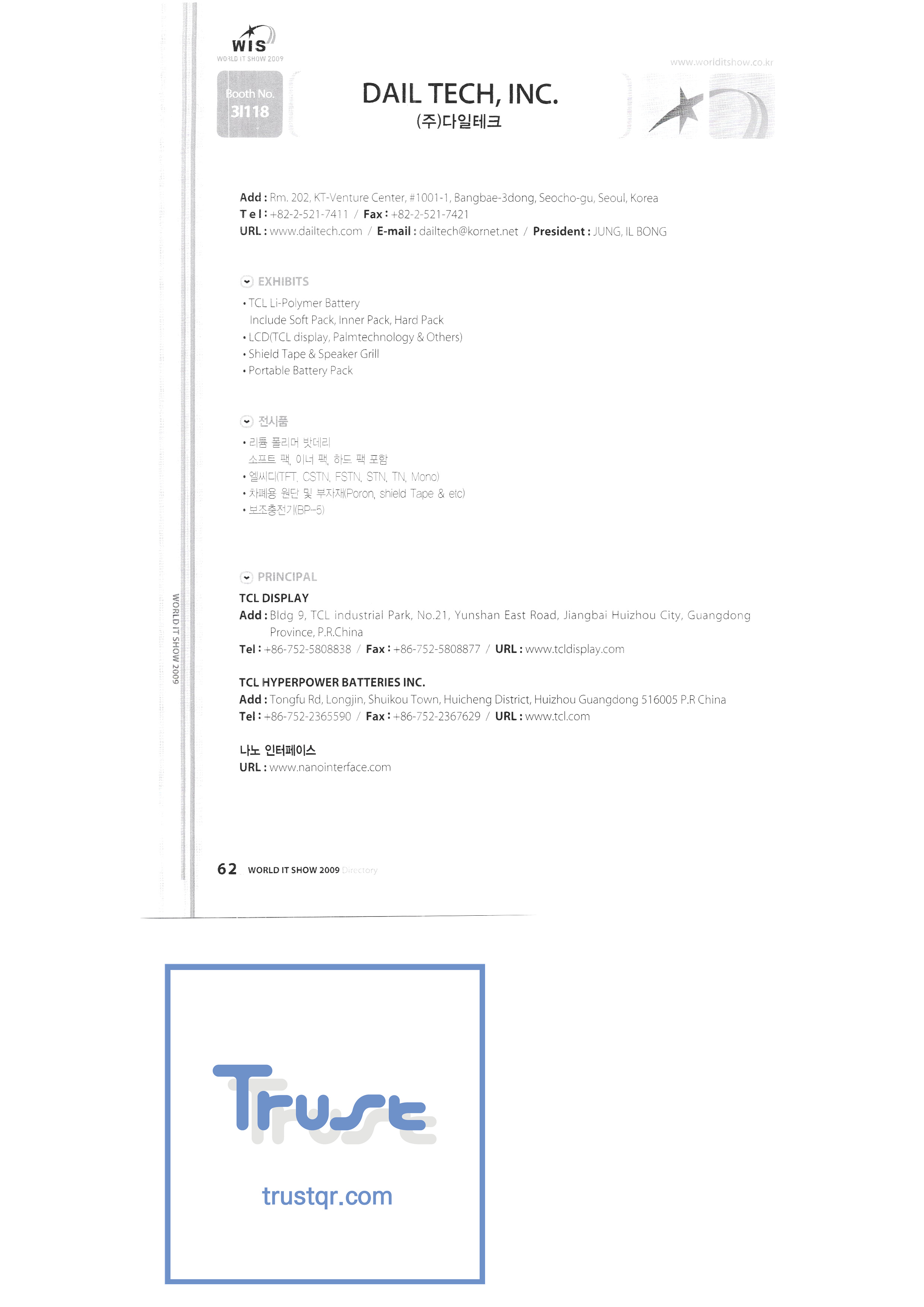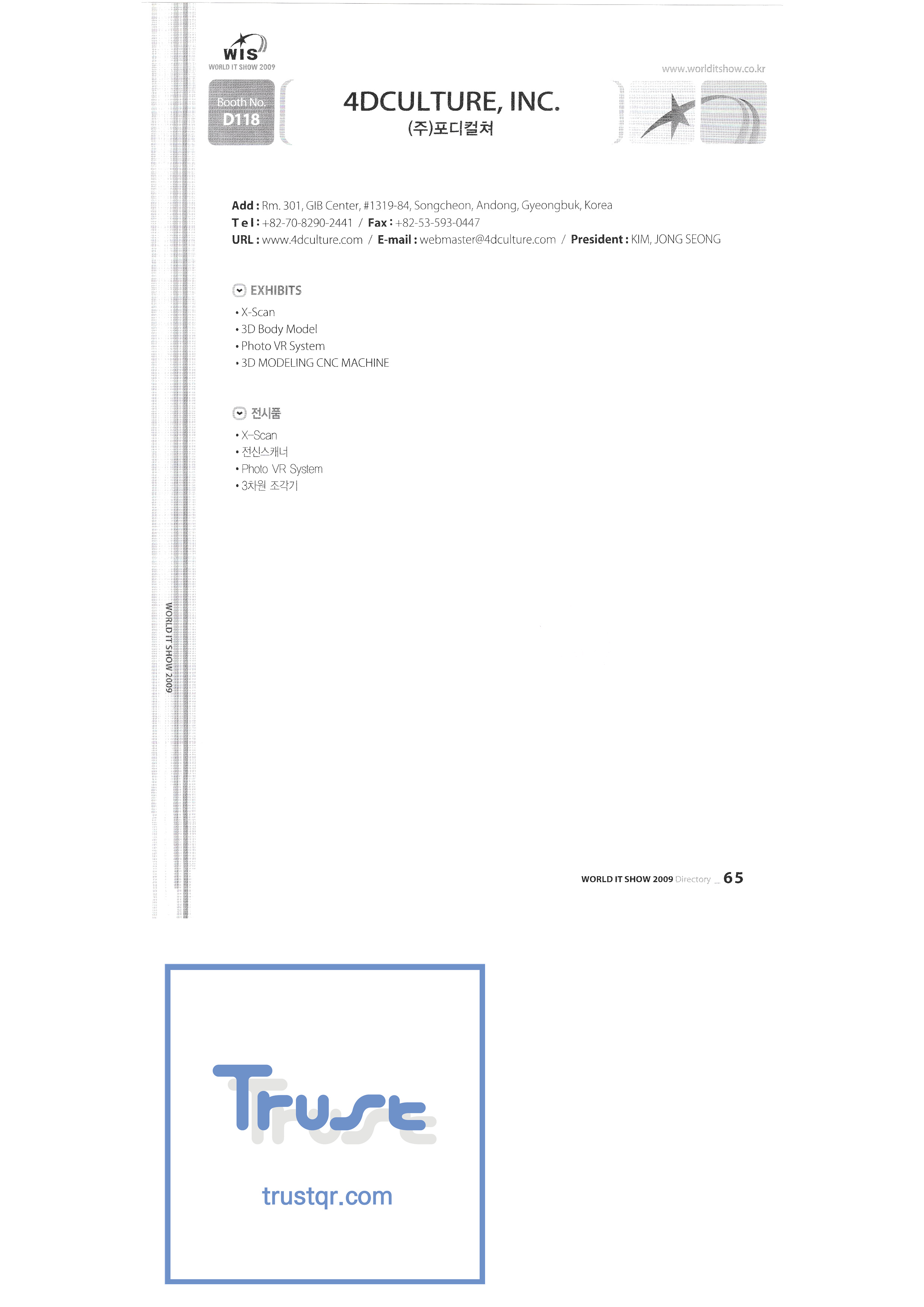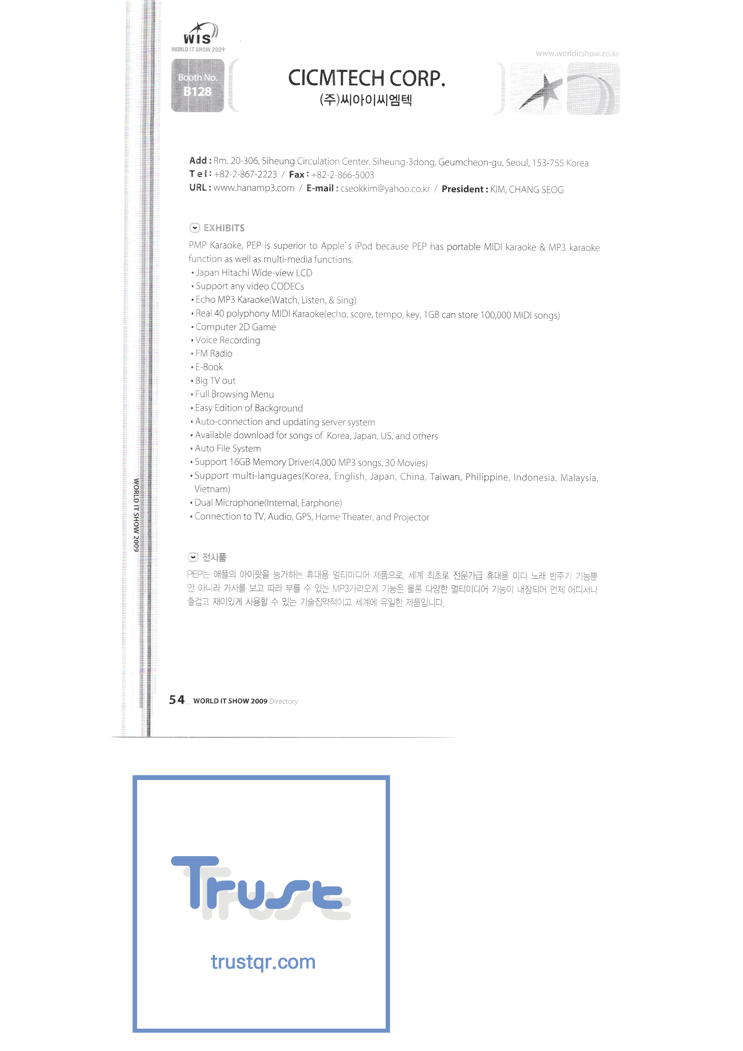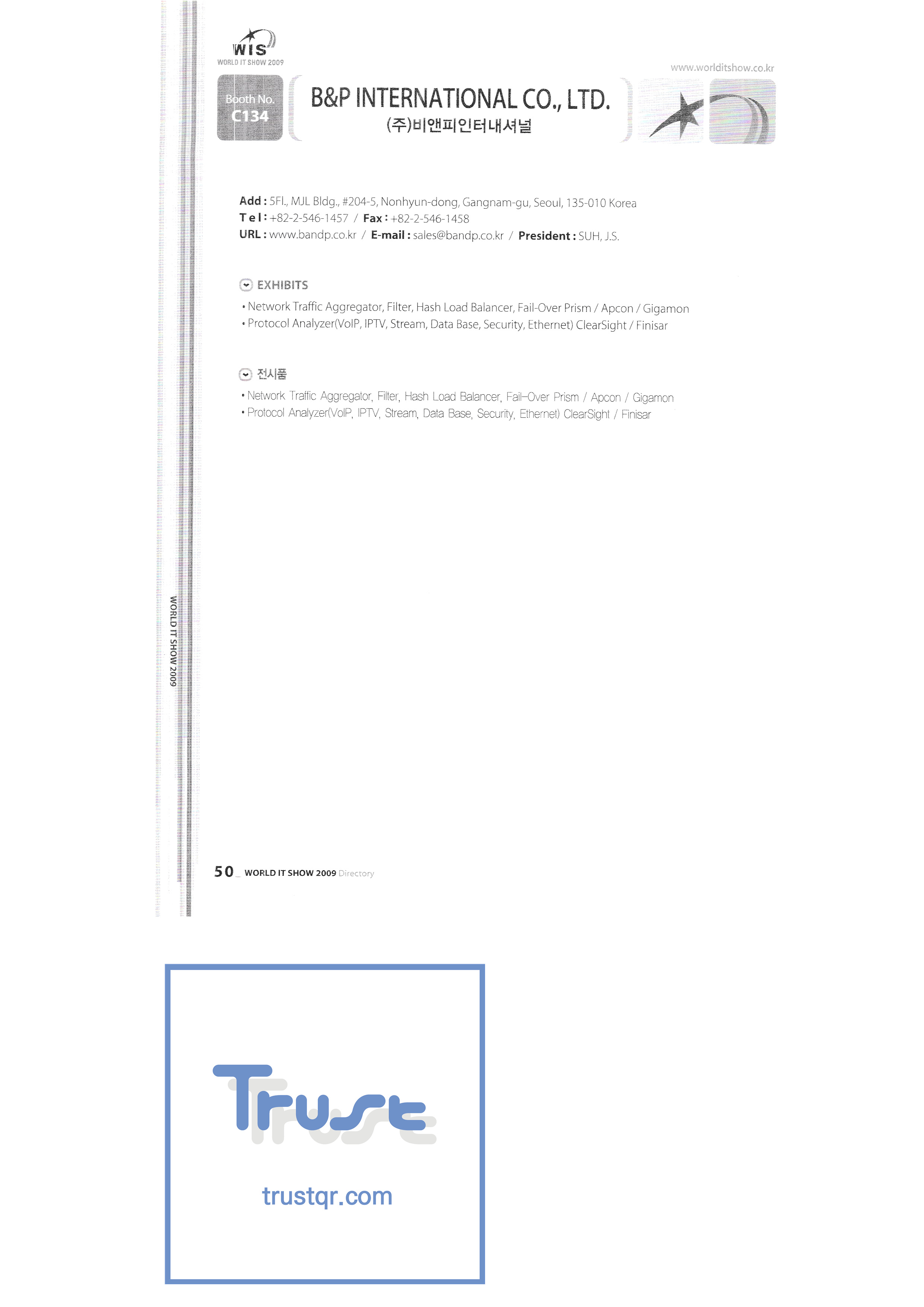 | WORLD IT SHOW 2009-2 เอเบิลสโตร์บจก. เอซีแอนด์พี แอคคูโซน บจก. เอ็ดเทค บริษัท เอพอสเทคโนโลยี จำกัด สถาบันวิจัย Ahn Cheolsu Aim2G บจก. อาร์ทีไอเบส บริษัท อัลท์ซอฟท์ จำกัด ศาลากลางจังหวัดอันยาง Anyjet APC Korea Co. , Ltd. Seoul Graduate School of Science บจก. แอทคอร์ Avitech เบนพีอินเตอร์เนชั่นแนลบจก. Biz Win S. Broadcade Korea Co. , Ltd. ซีแอนด์ซีอินสตรูเมนท์บจก. บริษัท ซีไอซีเอ็มเทค จำกัด คลิกระบบข้อมูลอิเล็กทรอนิกส์ คลิกมือ Core Biz คอร์วอยซ์บจก. Crown Publisher บริษัท แดจินมีเดียเทค จำกัด Daejin Technology Information Co. , Ltd. DAIL TECH ข้อมูลและการสื่อสาร Daishin Dasan Electronics Co. , Ltd. ฟอร์ดคัลเจอร์บจก. ไดก้าแพ็ค D-Q ความรู้สึกดิจิทัล Donghan Electronics Dongshin Information Technology Co. , Ltd. ระบบ DSNG DS Inet บริษัท ดูท จำกัด บจก. ดูวน |