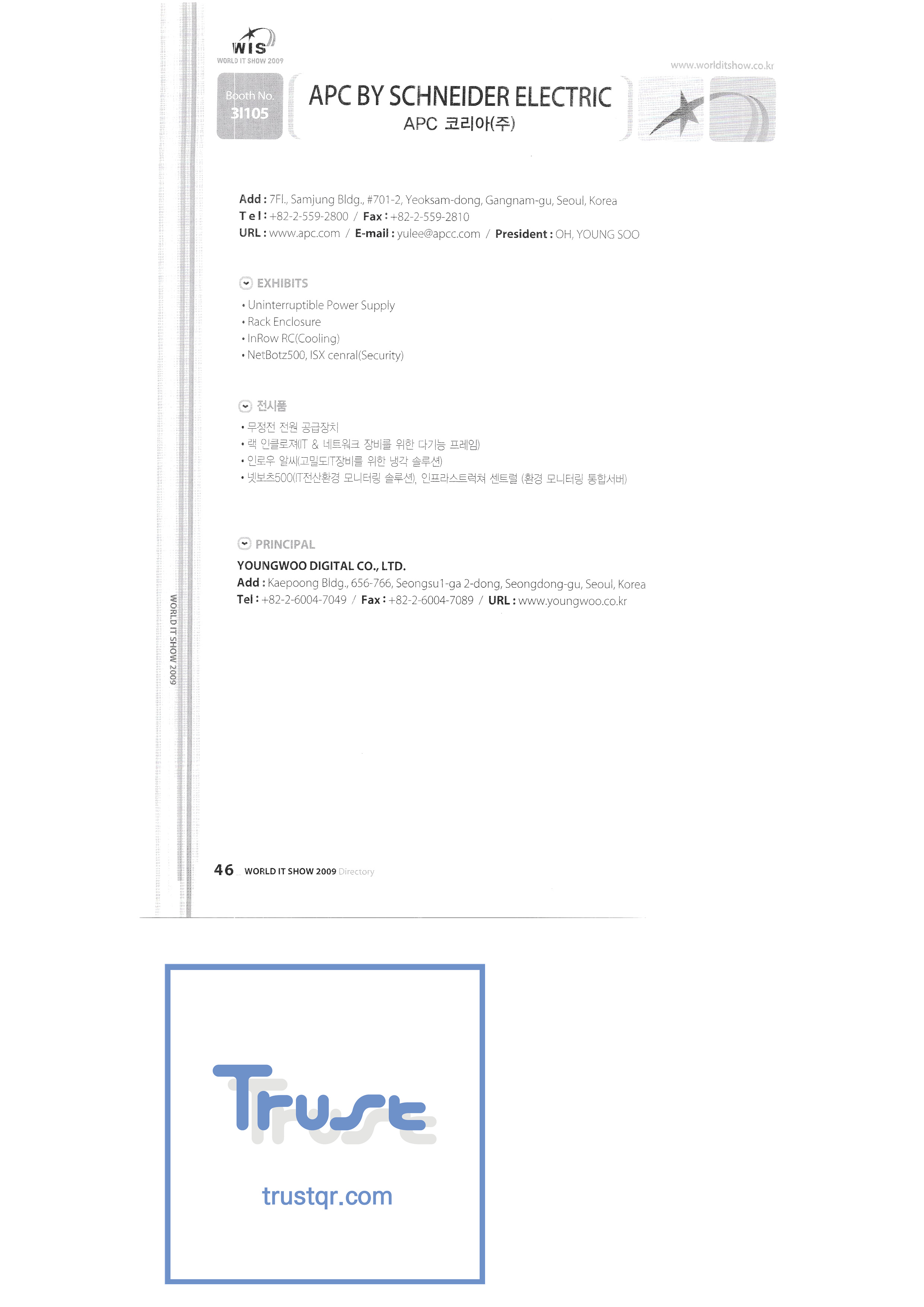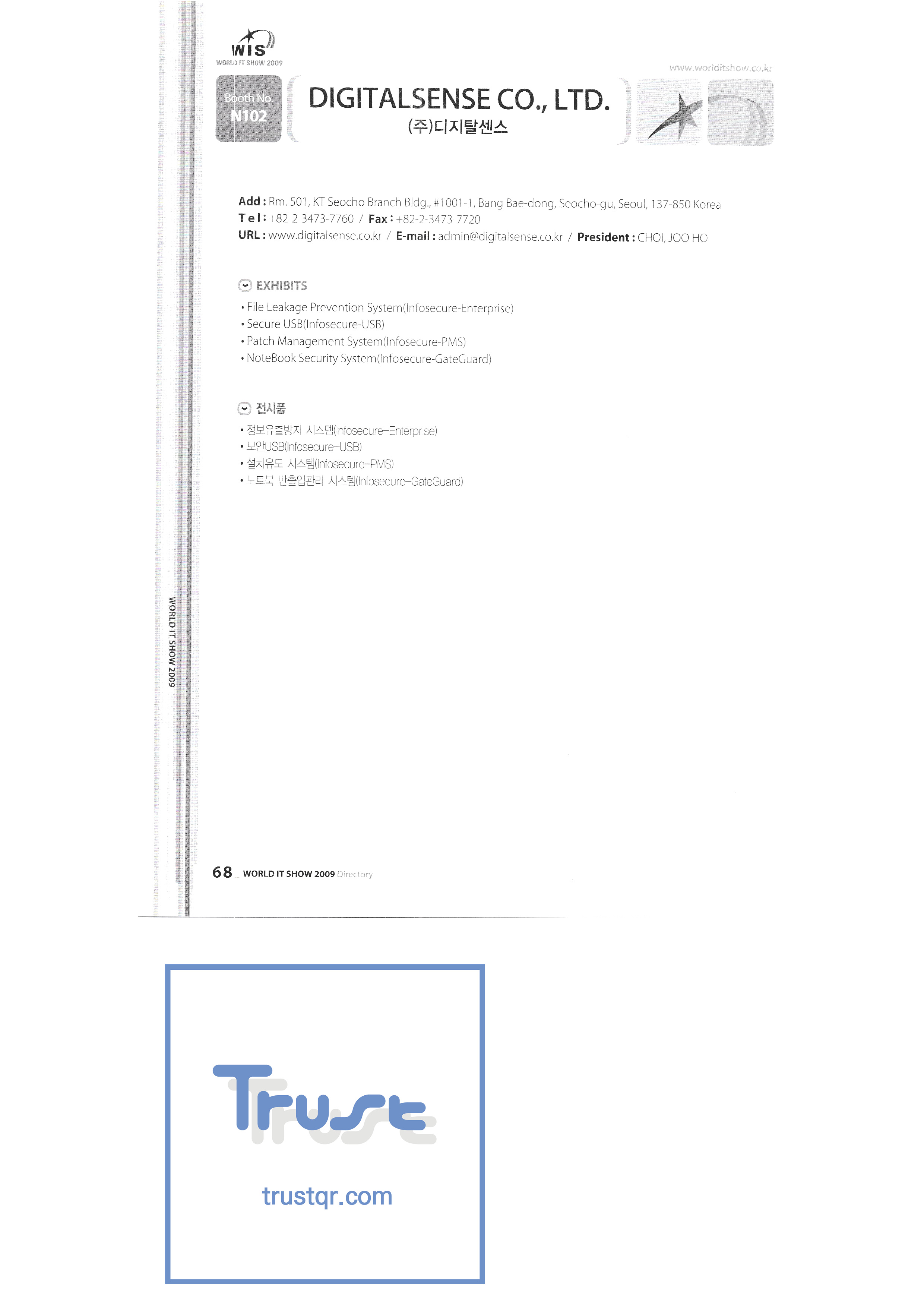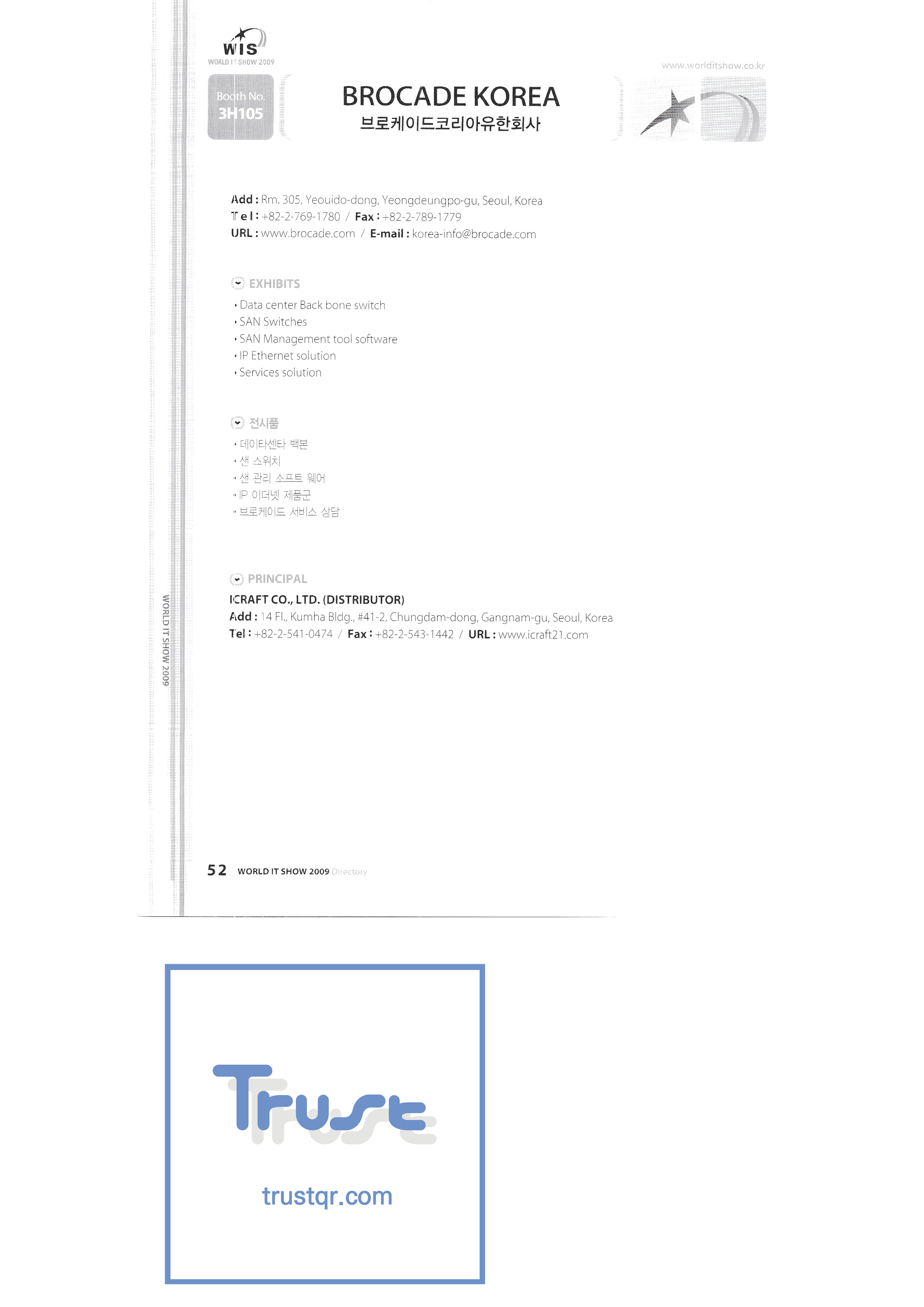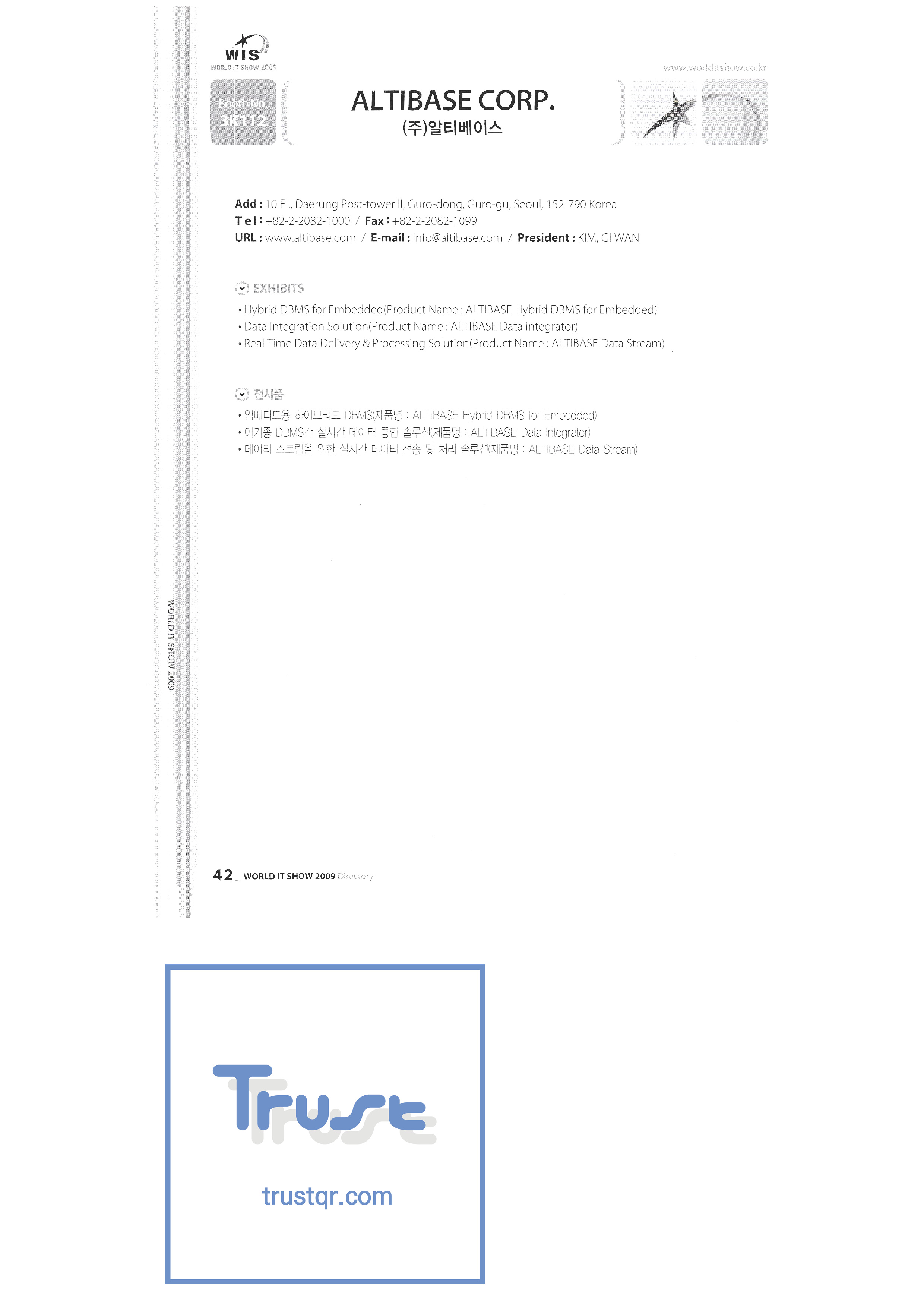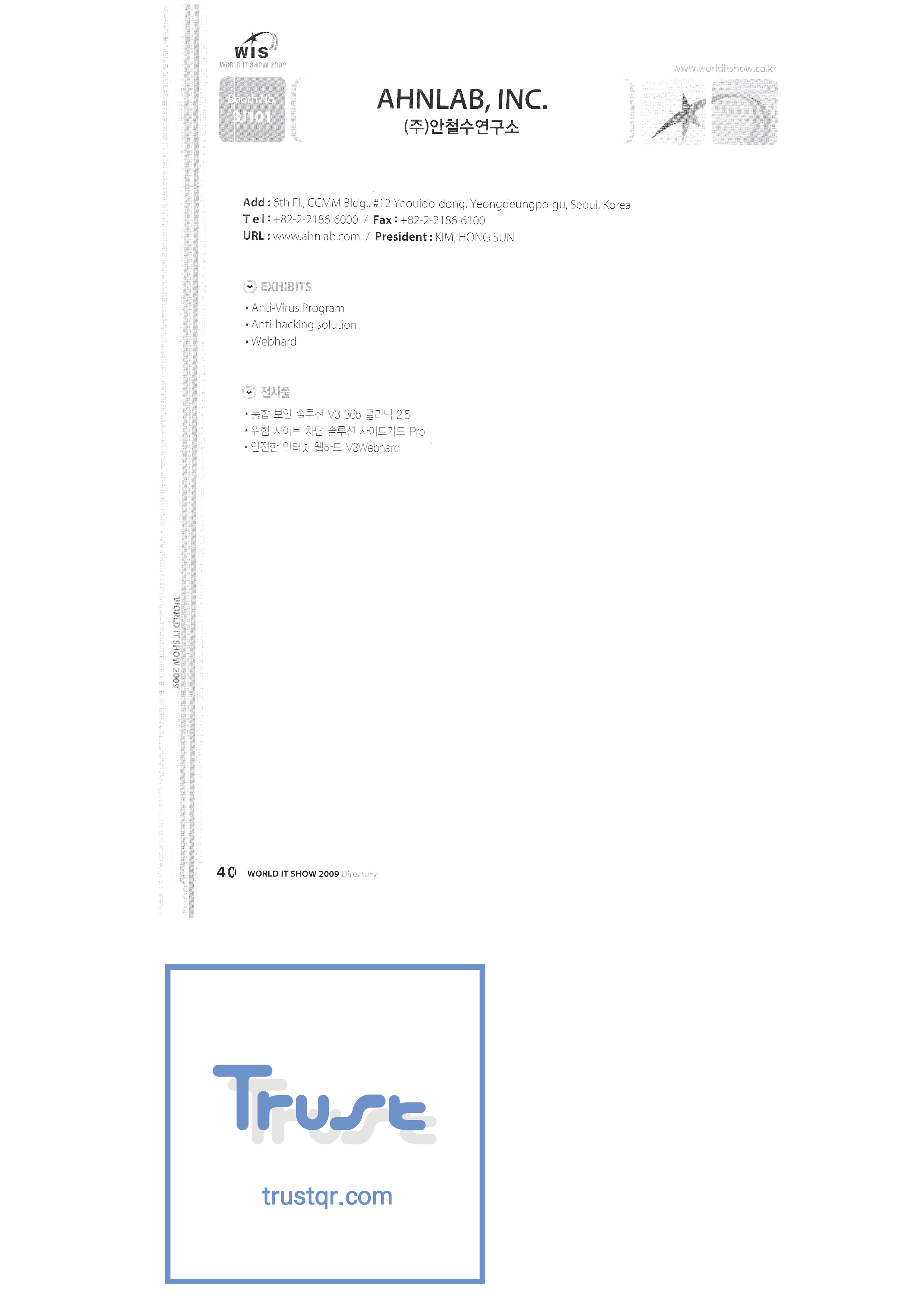 | WORLD IT SHOW 2009 - 2 ㈜에이블스토어 ㈜에이씨앤피 ㈜아큐죤 ㈜에디텍 에이포스테크놀로지㈜ ㈜안철수연구소 ㈜에임투지 ㈜알티베이스 ㈜알트소프트 안양시청 애니젯 APC 코리아㈜ 서울과학종합대학원 ㈜에이티케이오알 아비스텍 ㈜배인피인터내셔널 비즈윈에스 브로드케이드코리아유한회사 시앤시인스트루먼트㈜ ㈜씨아이씨엠텍 ㈜클릭전자정보시스템 클릭손 ㈜코아비즈 ㈜코아보이스 크라운출판사 ㈜대진미디어텍 대진기술정보㈜ ㈜다일테크 대신정보통신 다산전자㈜ ㈜포디컬쳐 ㈜디카팩 ㈜디큐 ㈜디지탈센스 ㈜동한전자 ㈜동신정보기술 디에스앤지시스템 디에스아이넷㈜ 디유아이티컴퍼니㈜ ㈜두루안 |