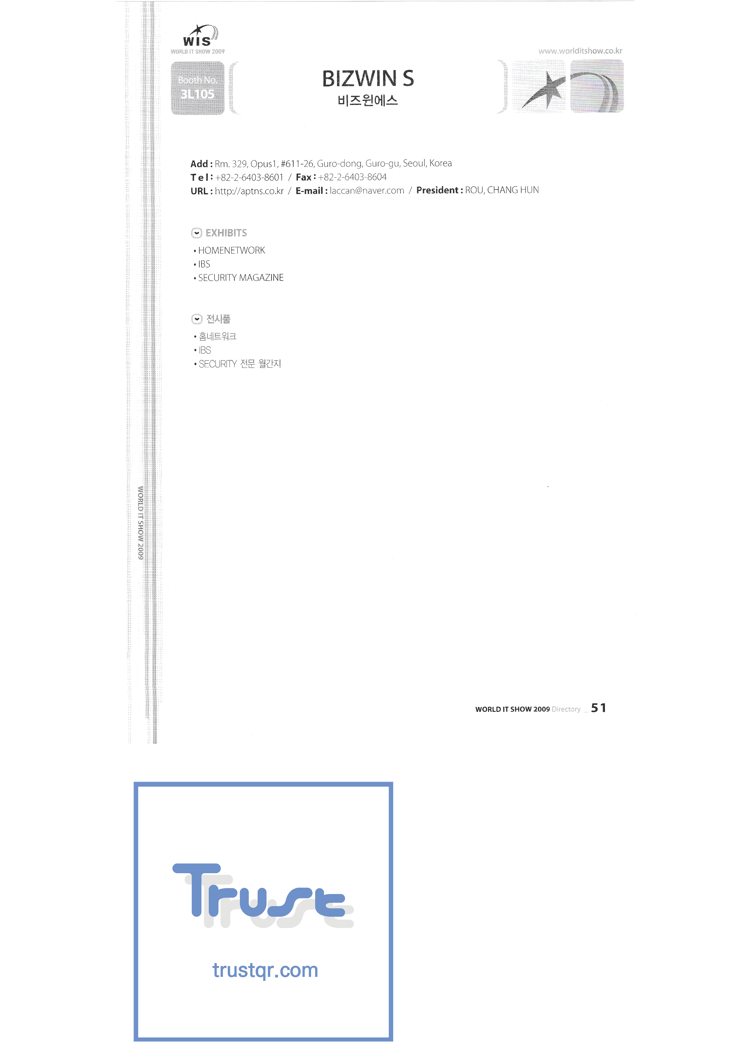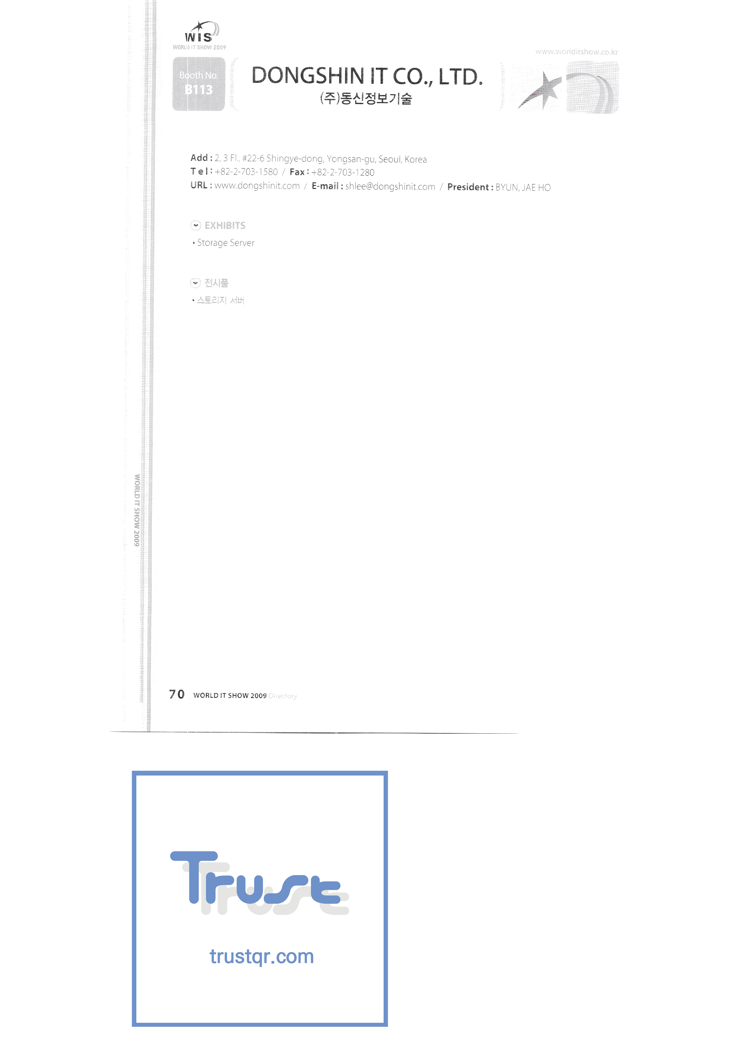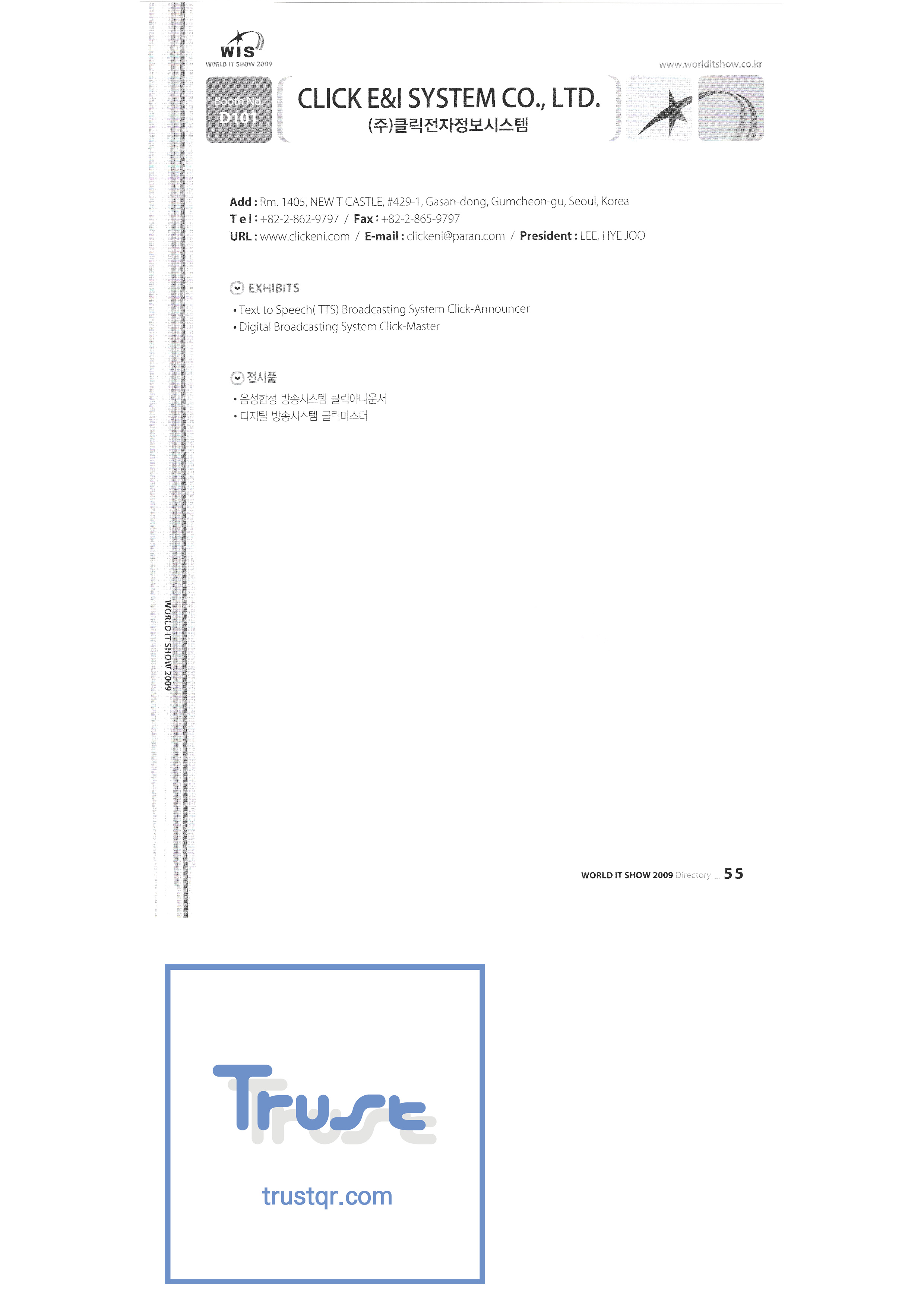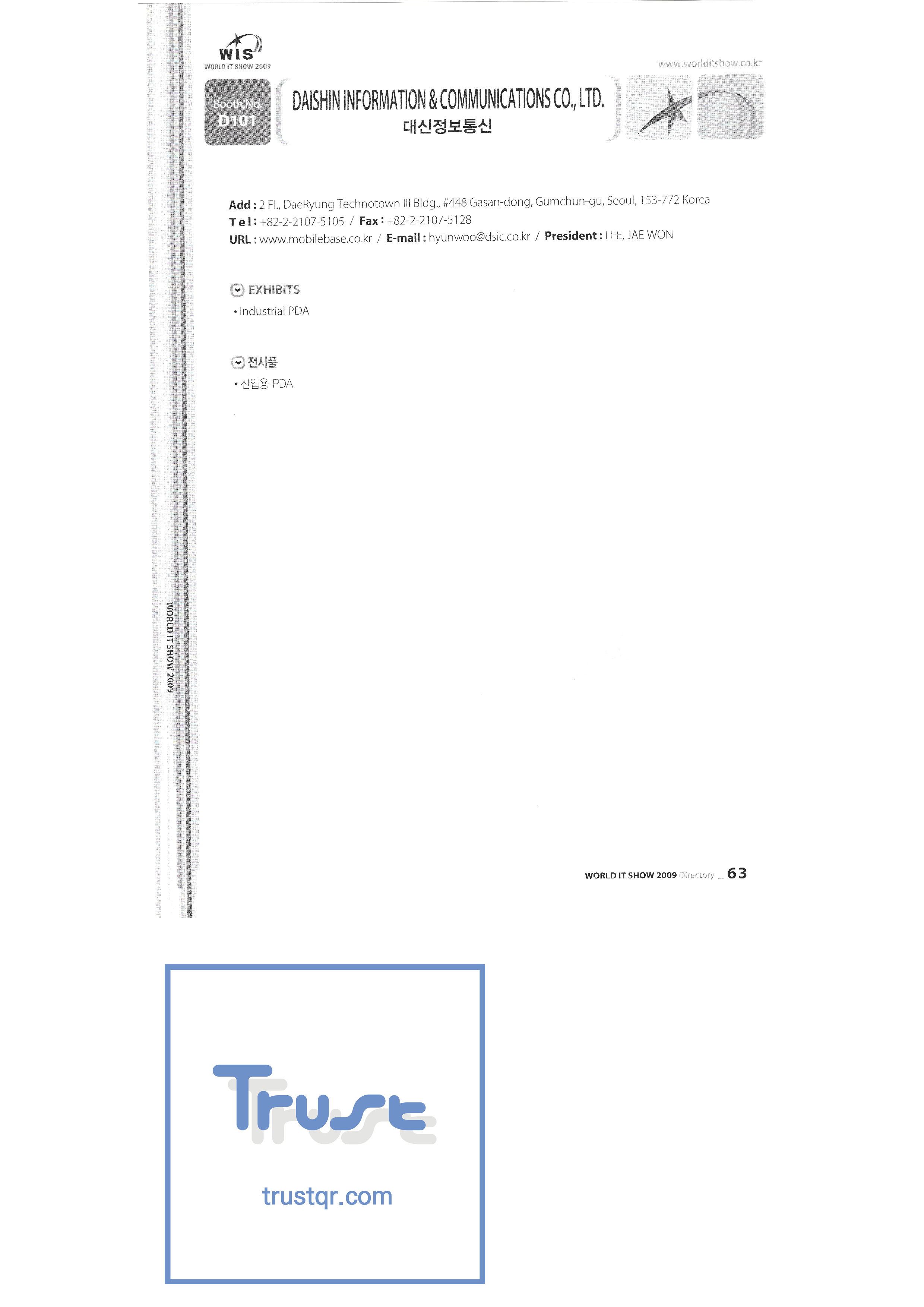 WORLD IT SHOW 2009-2 Able Store Co., Ltd. AC&P Accuzone Edtech Co., Ltd. Apos Technology Co., Ltd. Ahn Cheolsu Research Institute Aim2G RTI Base Co., Ltd. Altsoft Co., Ltd. Anyang City Hall Anyjet APC Korea Co., Ltd. Seoul Graduate School of Science ATKOR Co., Ltd. Avitech Bain P International Co., Ltd. Biz Win S Broadcade Korea Co., Ltd. C&C Instruments Co., Ltd. CICM Tech Co., Ltd. Click Electronic Information System Click hand Core Biz Core Voice Co., Ltd. Crown Publisher Daejin Mediatech Co., Ltd. Daejin Technology Information Co., Ltd. DAIL TECH Daishin Information and Communication Dasan Electronics Co., Ltd. Ford Culture Co., Ltd. Dica Pack D-Q Digital Sense Donghan Electronics Dongshin Information Technology Co., Ltd. DSNG System DS Inet DUT Company Co., Ltd. Duruan Co., Ltd. |