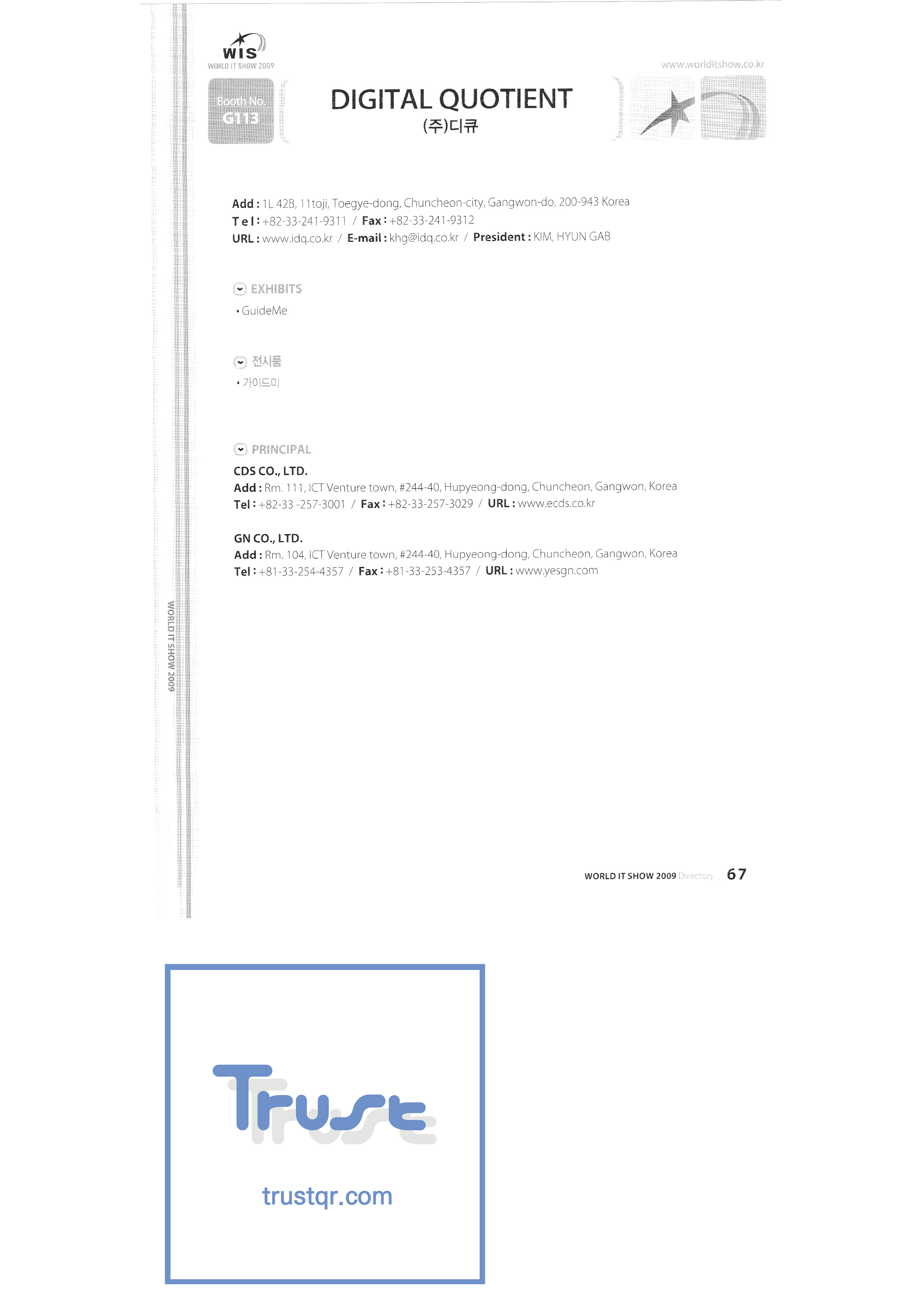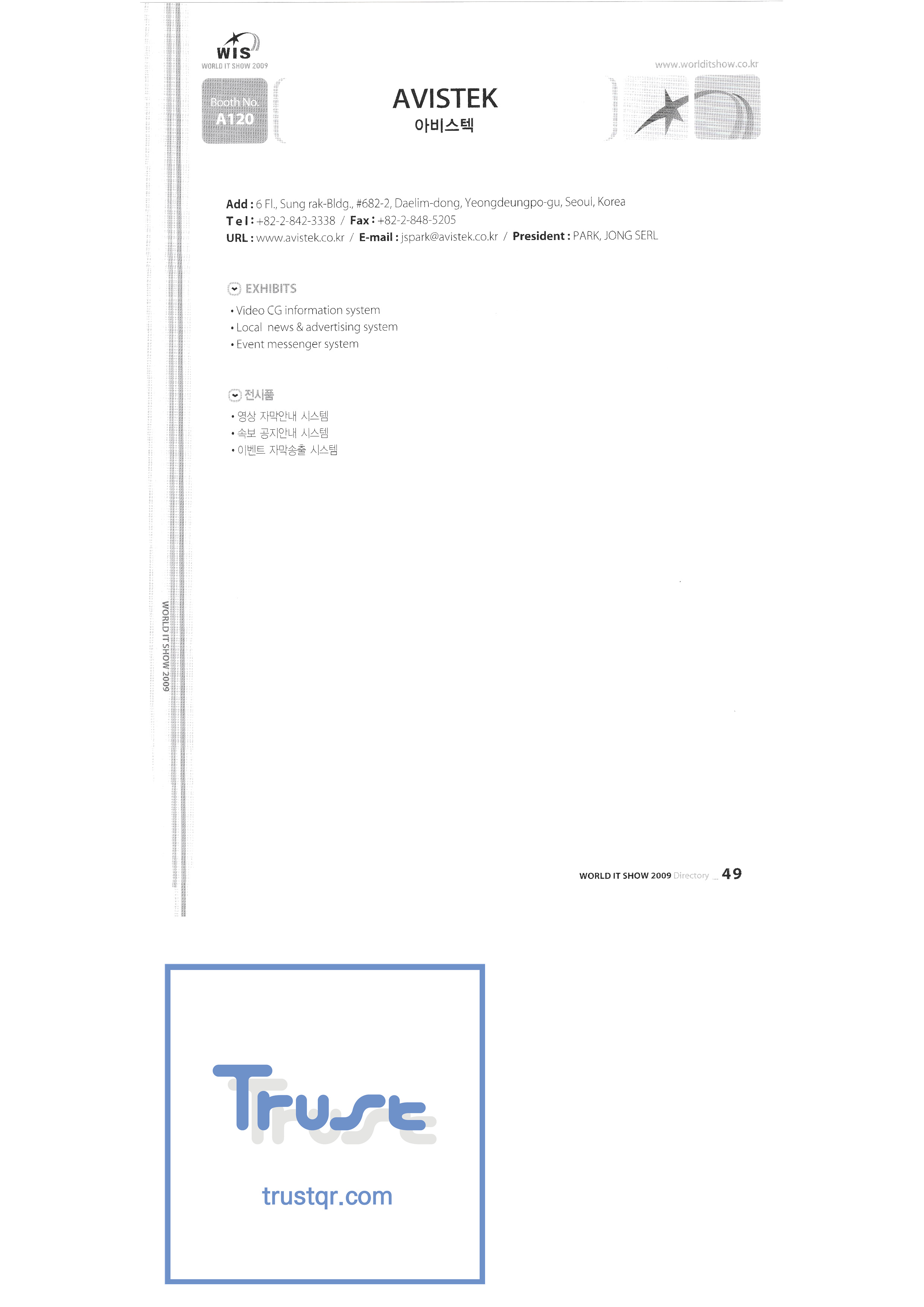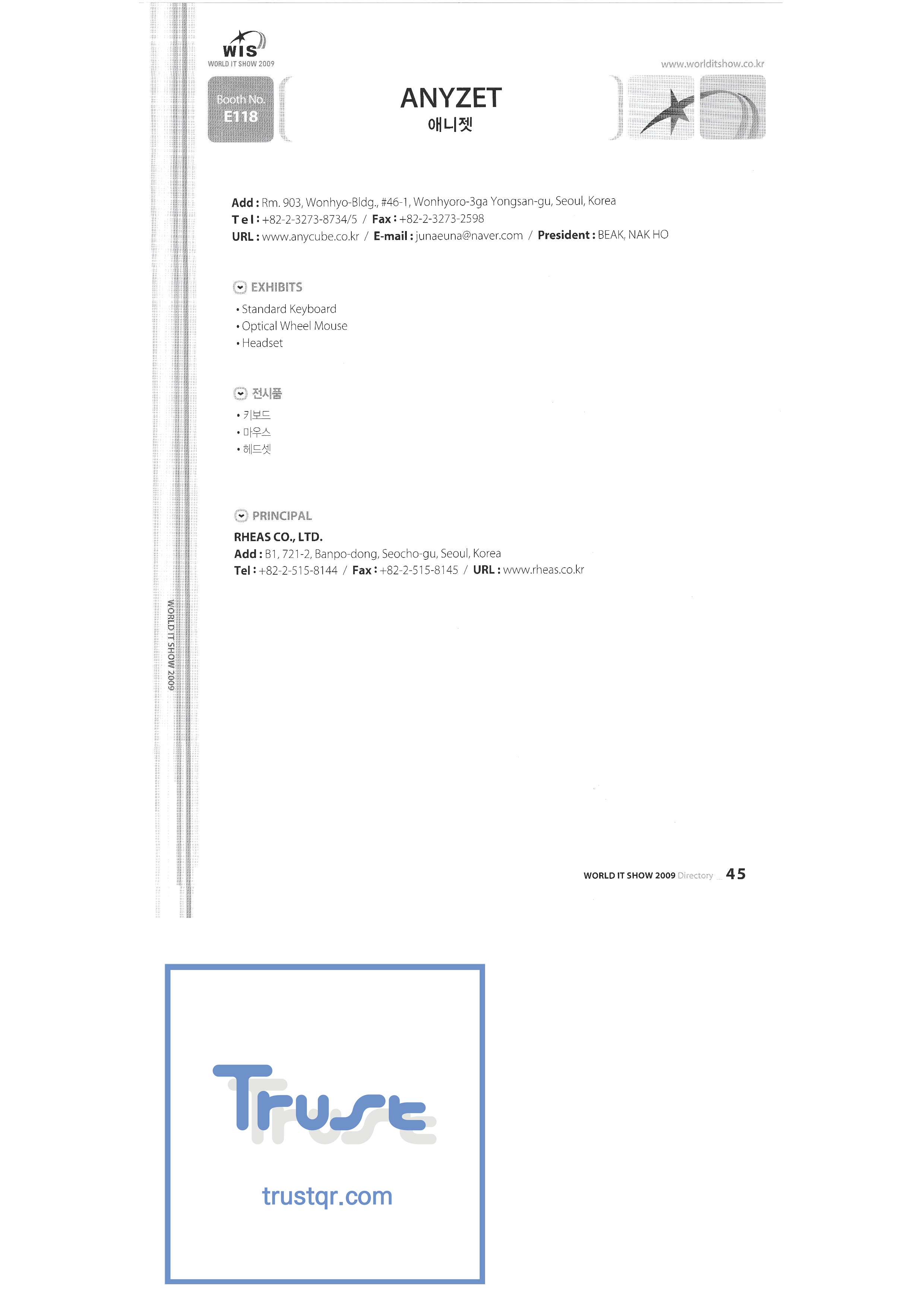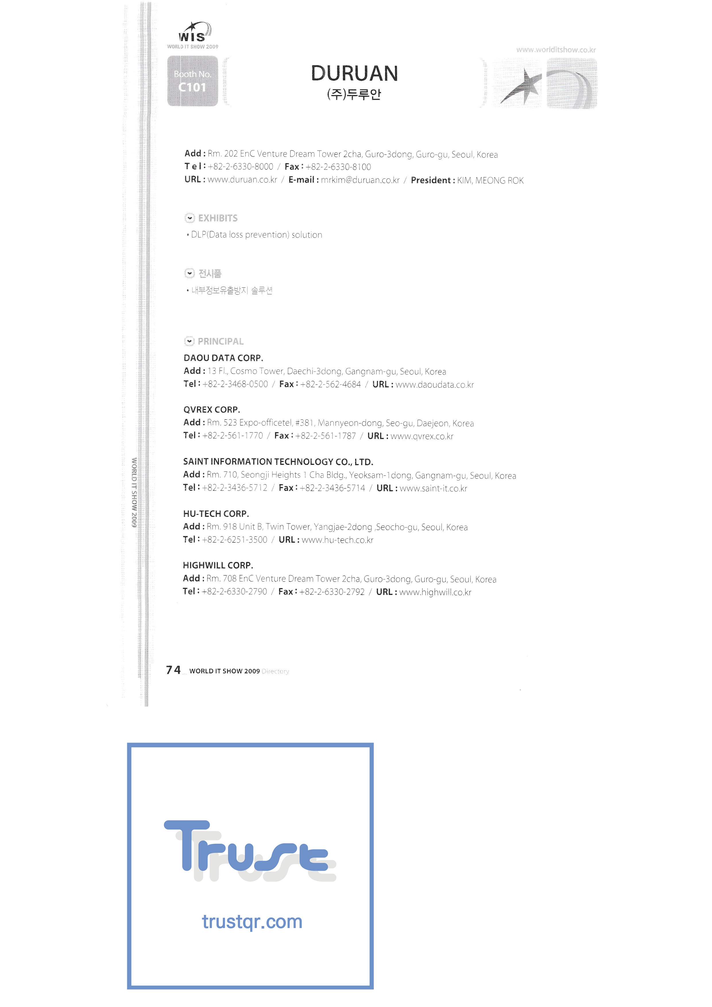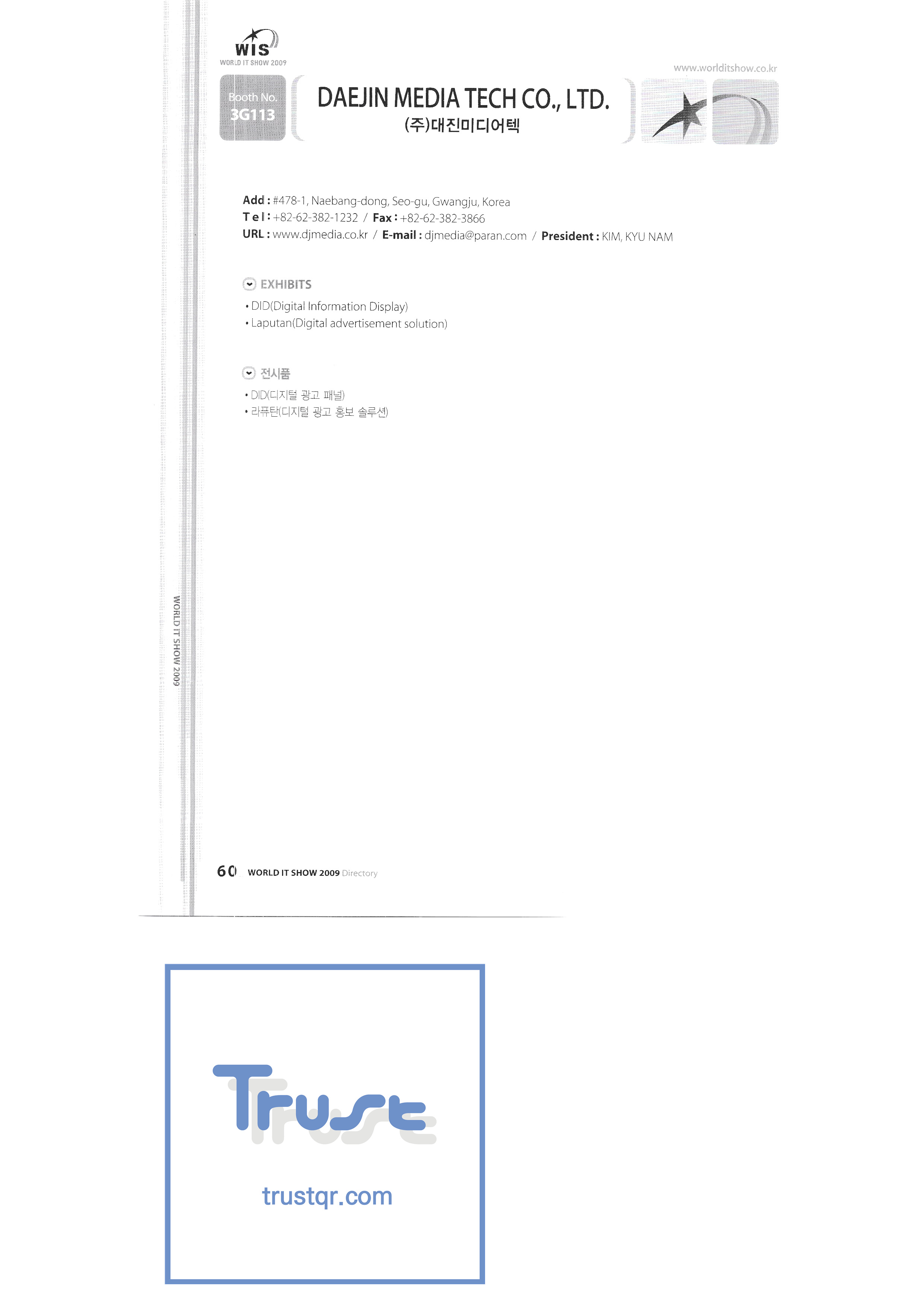 WORLD IT SHOW 2009-2 Able Store Co., Ltd. AC&P Accuzone Edtech Co., Ltd. Apos Technology Co., Ltd. Ahn Cheolsu Research Institute Aim2G RTI Base Co., Ltd. Altsoft Co., Ltd. Anyang City Hall Anyjet APC Korea Co., Ltd. Seoul Graduate School of Science ATKOR Co., Ltd. Avitech Bain P International Co., Ltd. Biz Win S Broadcade Korea Co., Ltd. C&C Instruments Co., Ltd. CICM Tech Co., Ltd. Click Electronic Information System Click hand Core Biz Core Voice Co., Ltd. Crown Publisher Daejin Mediatech Co., Ltd. Daejin Technology Information Co., Ltd. DAIL TECH Daishin Information and Communication Dasan Electronics Co., Ltd. Ford Culture Co., Ltd. Dica Pack D-Q Digital Sense Donghan Electronics Dongshin Information Technology Co., Ltd. DSNG System DS Inet DUT Company Co., Ltd. Duruan Co., Ltd. |
