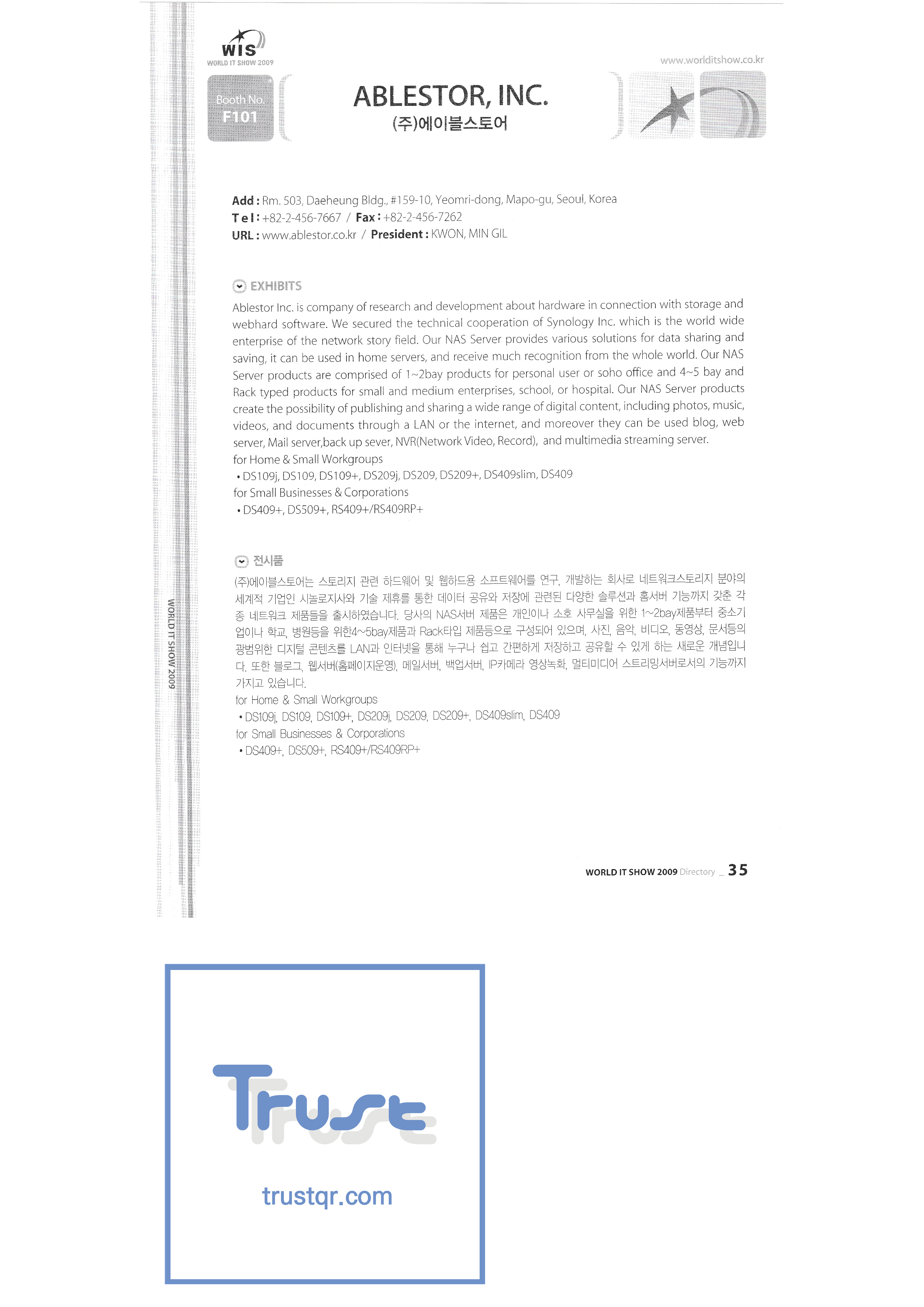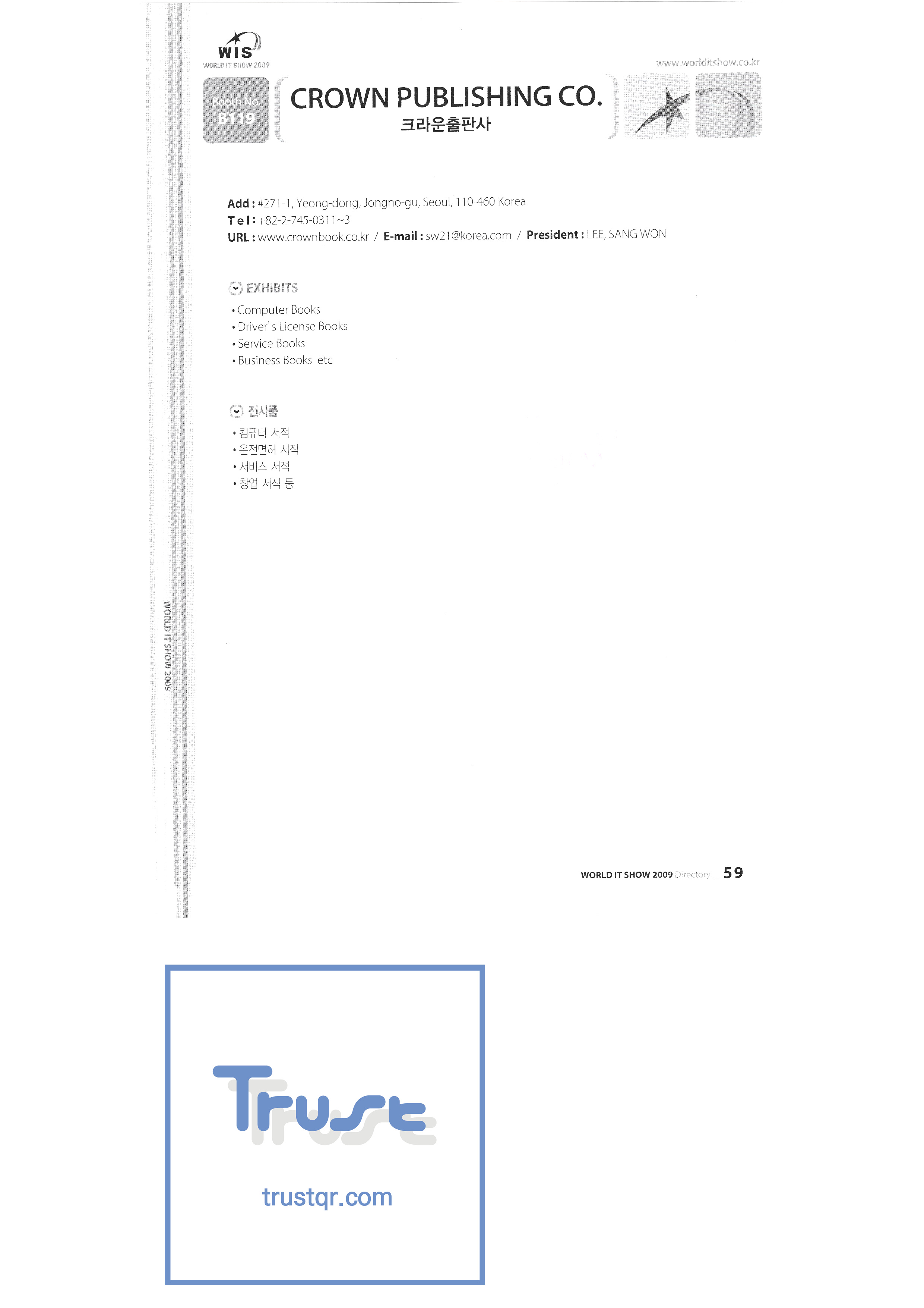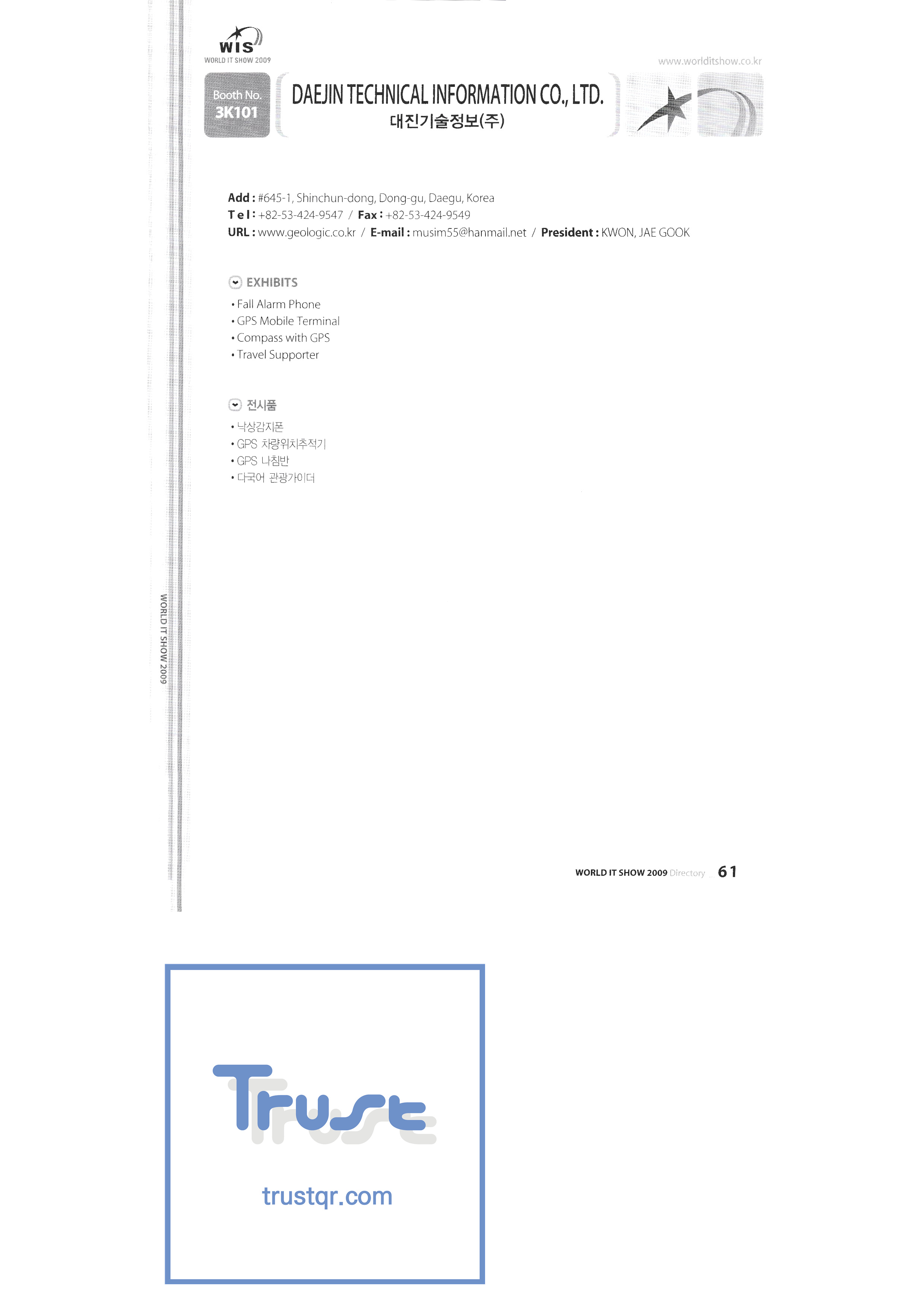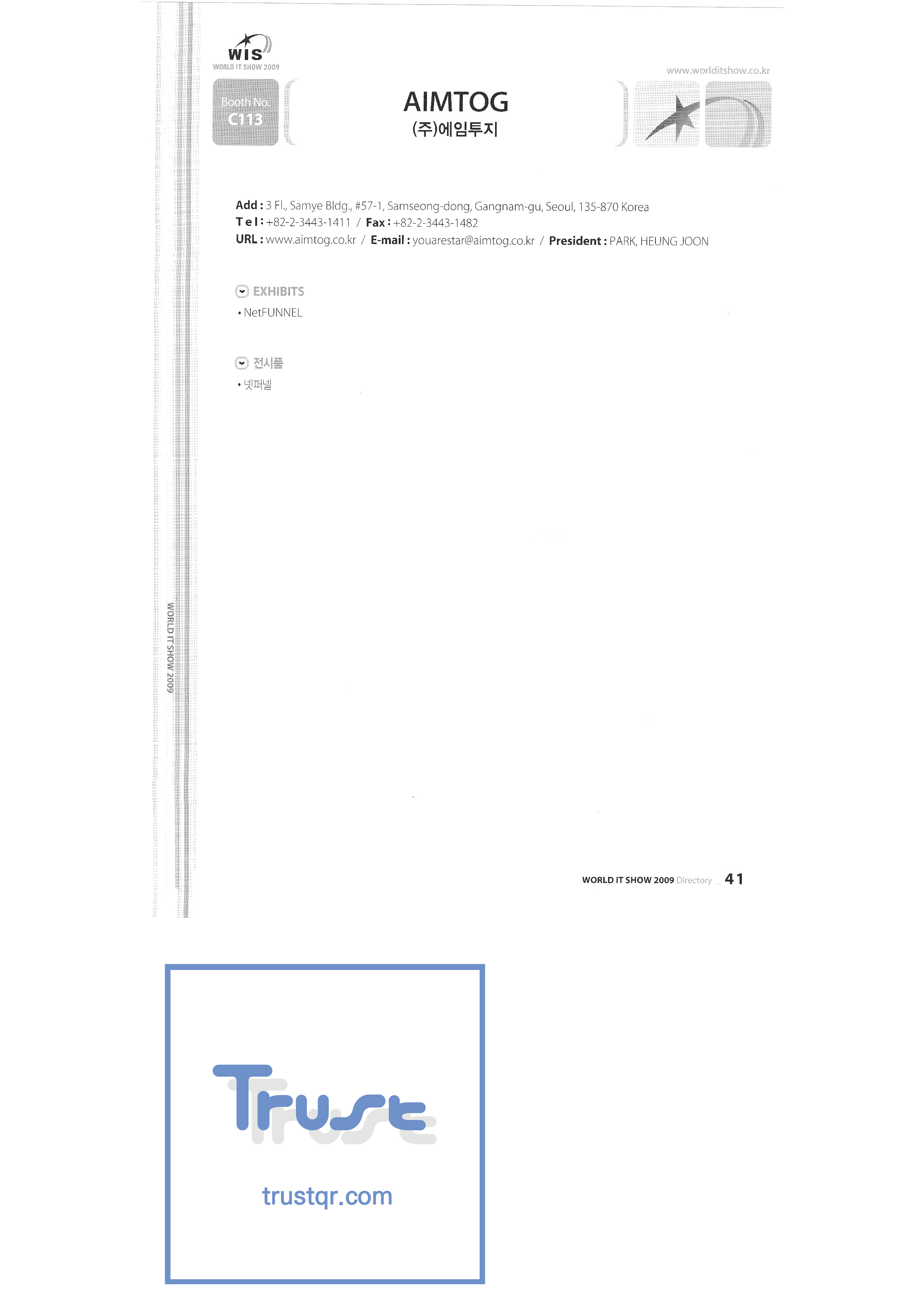 WORLD IT SHOW 2009-2 Able Store Co., Ltd. AC&P Accuzone Edtech Co., Ltd. Apos Technology Co., Ltd. Ahn Cheolsu Research Institute Aim2G RTI Base Co., Ltd. Altsoft Co., Ltd. Anyang City Hall Anyjet APC Korea Co., Ltd. Seoul Graduate School of Science ATKOR Co., Ltd. Avitech Bain P International Co., Ltd. Biz Win S Broadcade Korea Co., Ltd. C&C Instruments Co., Ltd. CICM Tech Co., Ltd. Click Electronic Information System Click hand Core Biz Core Voice Co., Ltd. Crown Publisher Daejin Mediatech Co., Ltd. Daejin Technology Information Co., Ltd. DAIL TECH Daishin Information and Communication Dasan Electronics Co., Ltd. Ford Culture Co., Ltd. Dica Pack D-Q Digital Sense Donghan Electronics Dongshin Information Technology Co., Ltd. DSNG System DS Inet DUT Company Co., Ltd. Duruan Co., Ltd. |