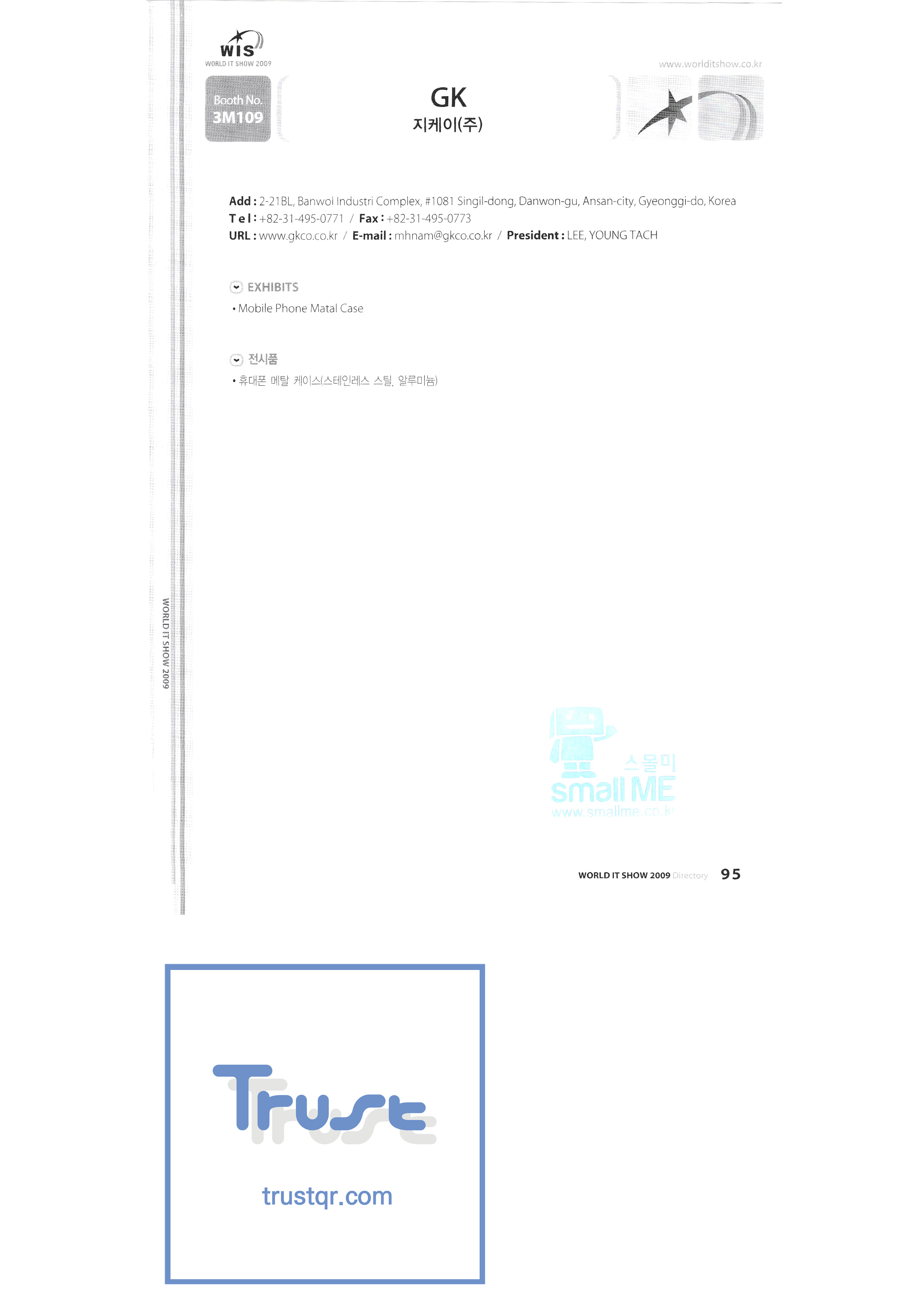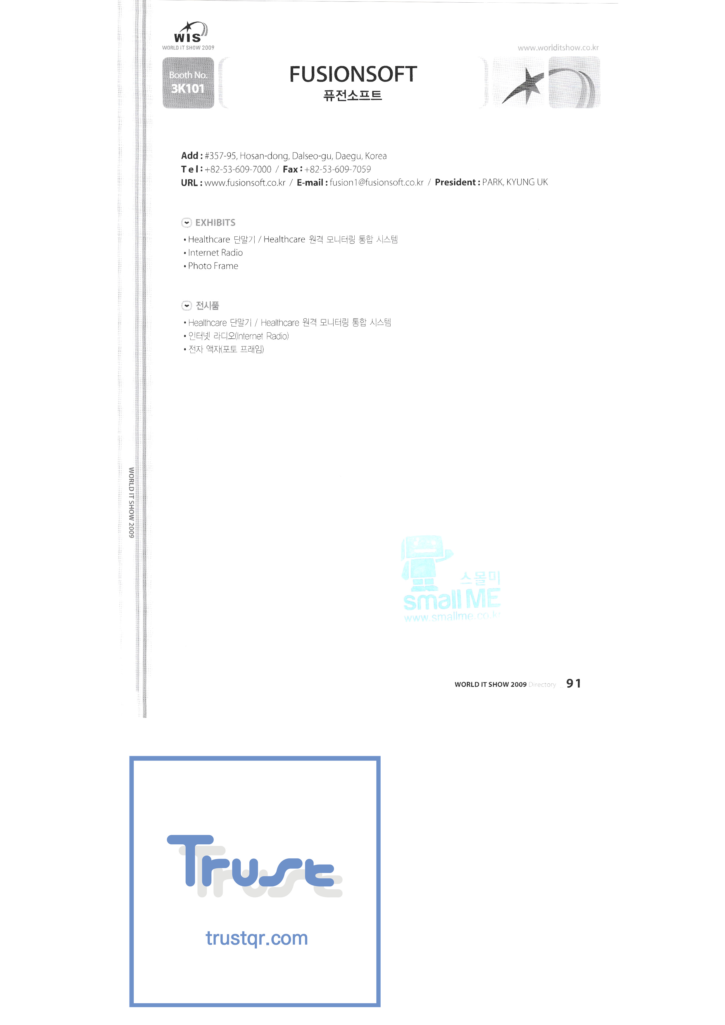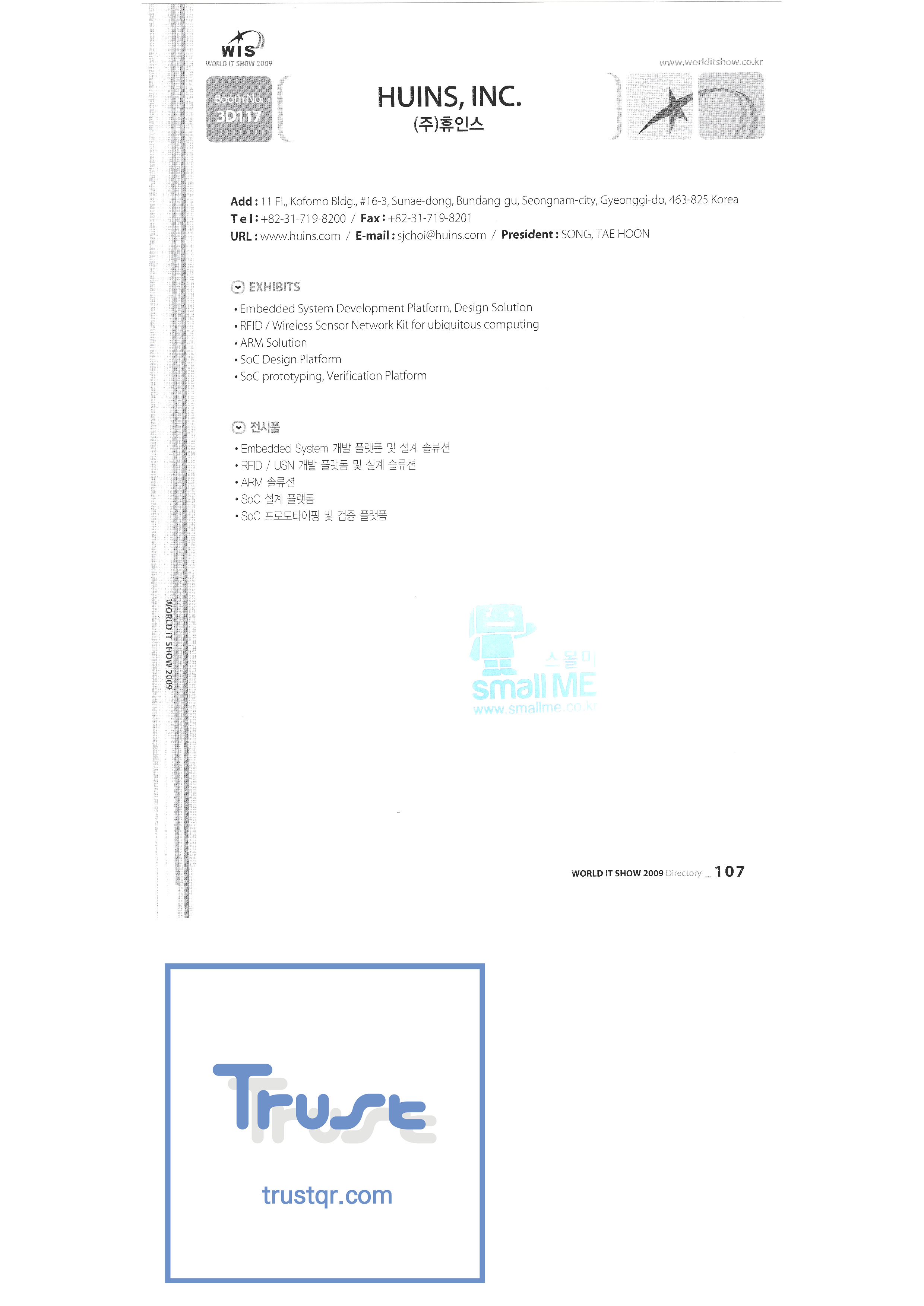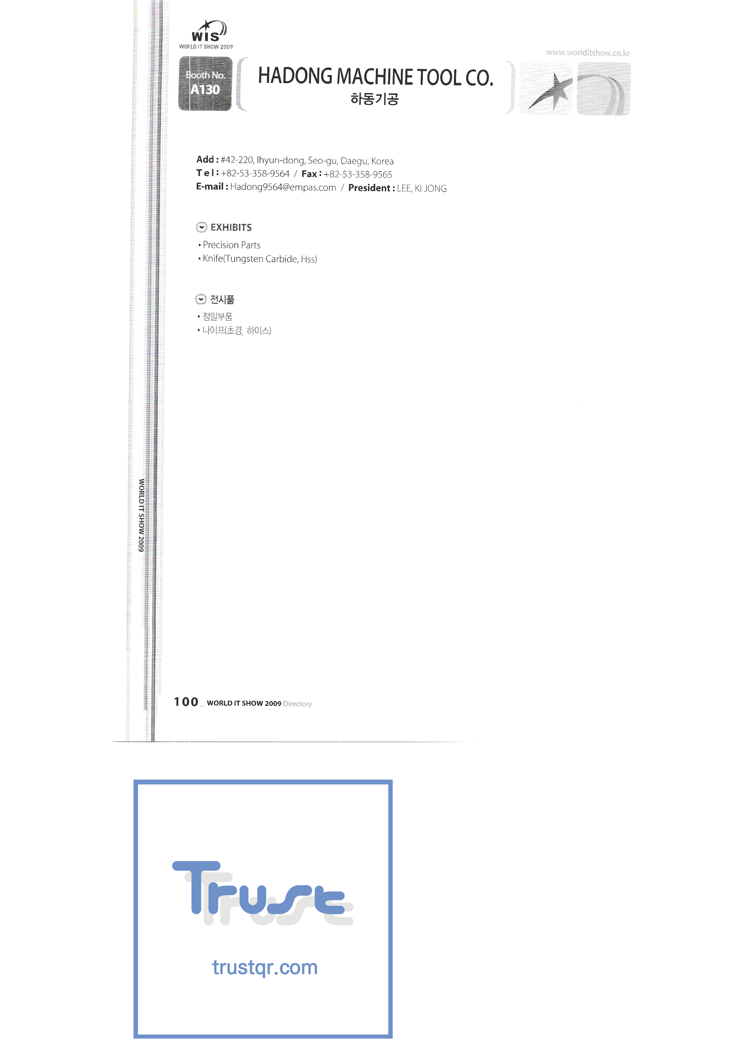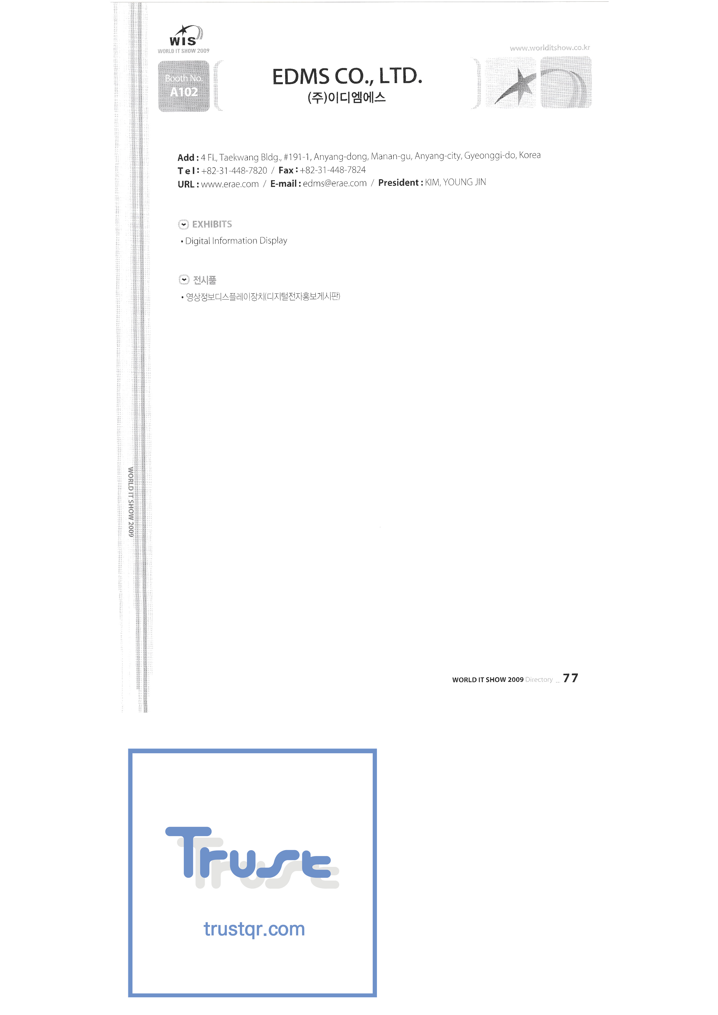 | WORLD IT SHOW 2009-3 บจก. เอียร์โซน โฟโตนิกส์ตะวันออก EDMS บจก. บริษัท อีเล็คคอม จำกัด สถาบันวิจัยอิเล็กทรอนิกส์และโทรคมนาคม บจก. อิออน บจก. อีโรนิกซ์ ESOL Information Communication Co. , Ltd. บจก. อีสซอฟท์ ยูโรเทรด Evenstar เอ็กซ์ซอฟต์บจก. IMAX บริษัท อีซี่พีทีเทค จำกัด Pasu.com บจก. เอฟ. เทค ฟิวชั่นซอฟท์ Game Park Holdings Kangwon Embedded Software Research Center สำนักงาน Seoul Geumcheon-gu บจก. จีเค โซลูชัน IP ทั่วโลก เครื่องมือ GNS กูโร - กู บจก. เอชทูโอซิสเต็มเทคโนโลยี แฮดงแมชชีนทูล บริษัท ฮันซอลอินทิคิวบ์ จำกัด Hanbit Touch Histo Valley บจก. ชิ้นส่วนขดลวด Hoeseong สำนักพัฒนาการค้าฮ่องกง HP Telecom Huins บจก. บจก. ฮยูวอน IBIT บริษัท ไอโบสันซิสเต็มส์ จำกัด บจก. ไอจีเวิร์ค ไอแซคเอสเอ็นซีบจก. การสื่อสาร ILS สำนักงานส่งเสริมอุตสาหกรรมข้อมูลอินชอน |