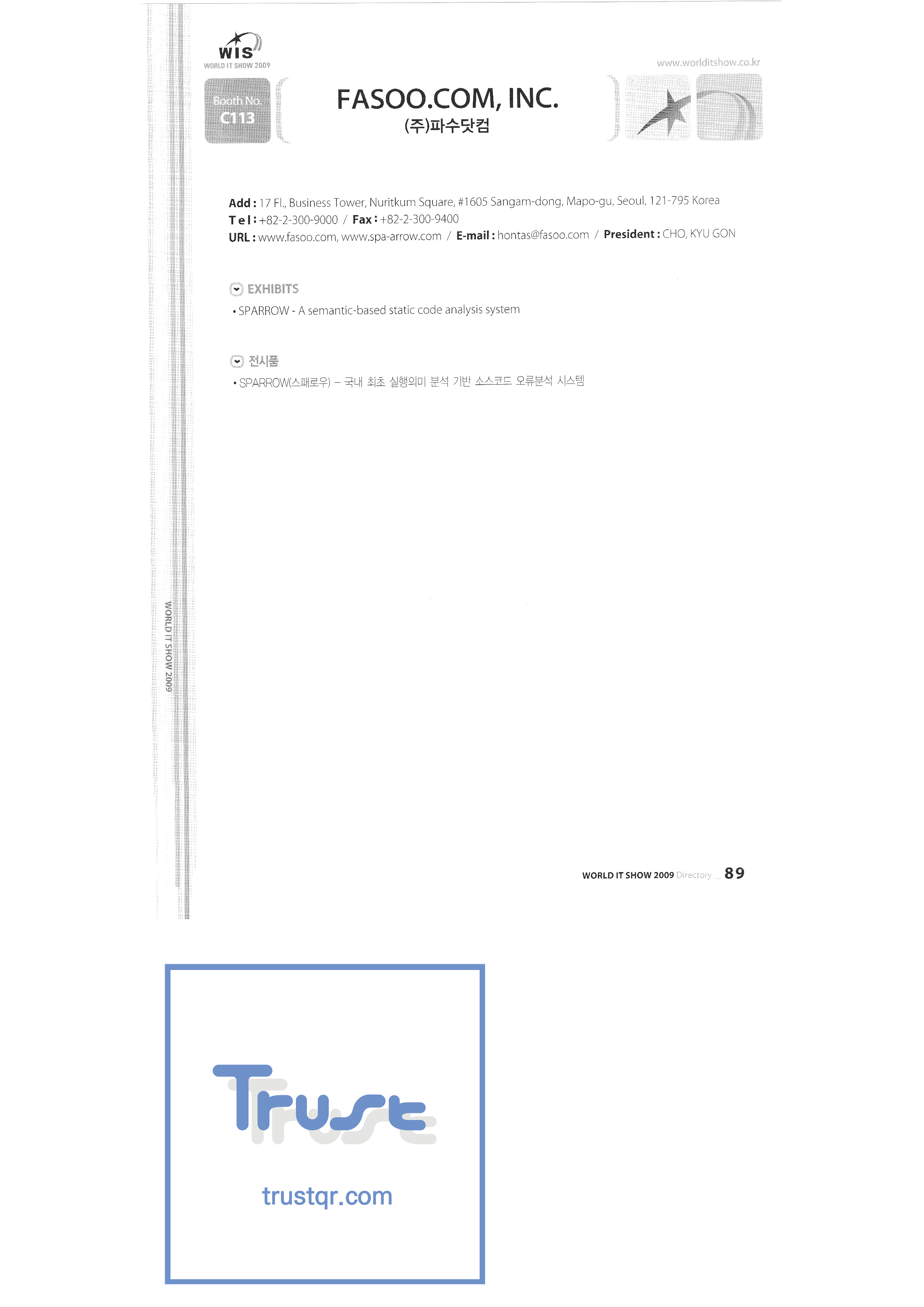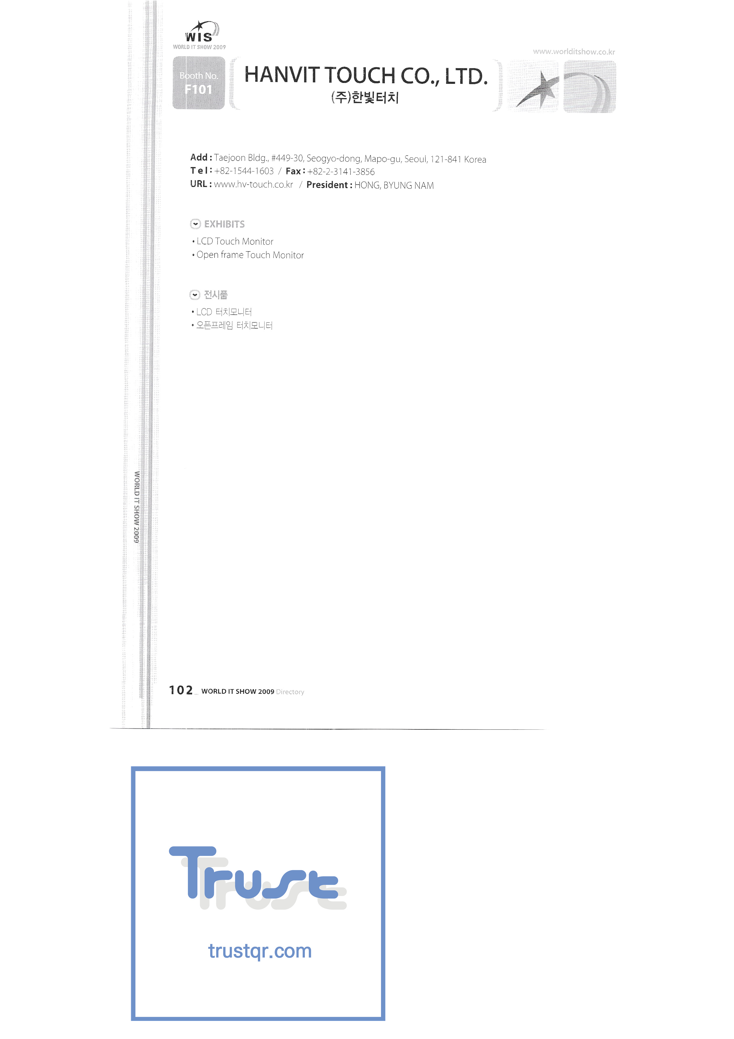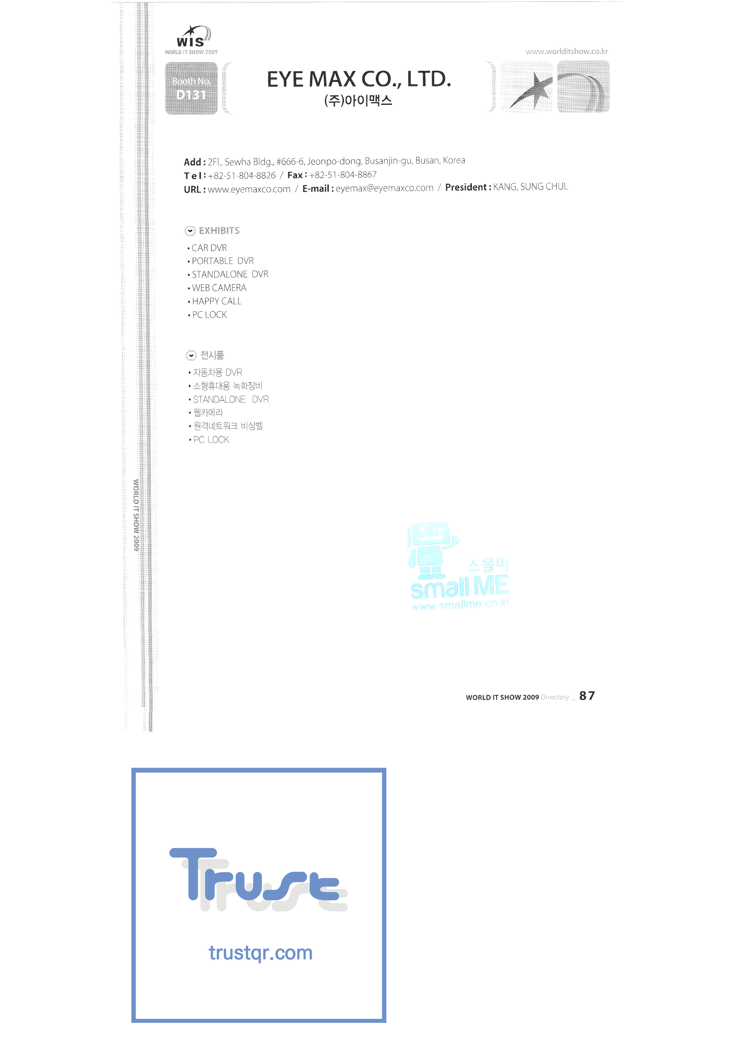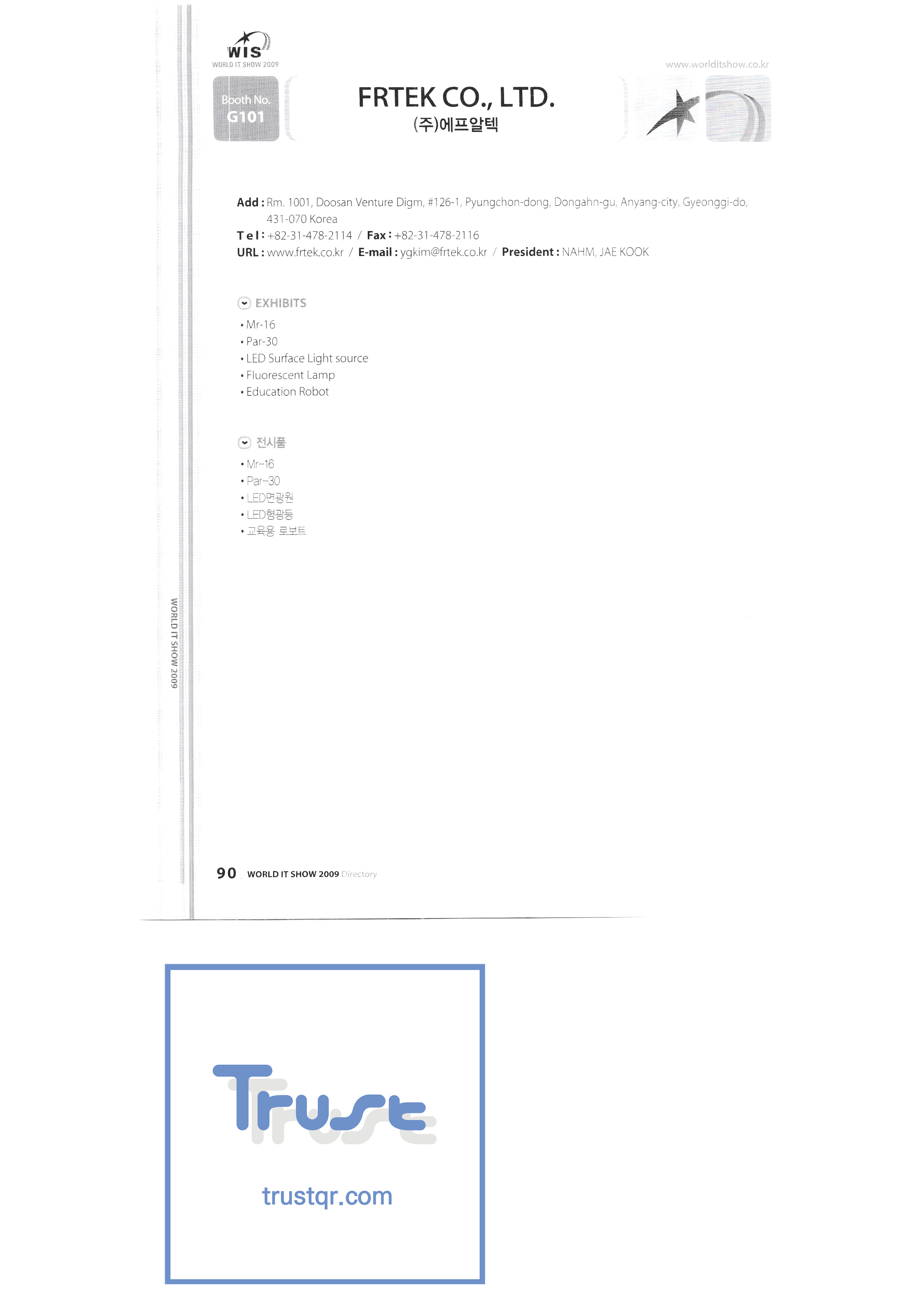 | WORLD IT SHOW 2009-3 บจก. เอียร์โซน โฟโตนิกส์ตะวันออก EDMS บจก. บริษัท อีเล็คคอม จำกัด สถาบันวิจัยอิเล็กทรอนิกส์และโทรคมนาคม บจก. อิออน บจก. อีโรนิกซ์ ESOL Information Communication Co. , Ltd. บจก. อีสซอฟท์ ยูโรเทรด Evenstar เอ็กซ์ซอฟต์บจก. IMAX บริษัท อีซี่พีทีเทค จำกัด Pasu.com บจก. เอฟ. เทค ฟิวชั่นซอฟท์ Game Park Holdings Kangwon Embedded Software Research Center สำนักงาน Seoul Geumcheon-gu บจก. จีเค โซลูชัน IP ทั่วโลก เครื่องมือ GNS กูโร - กู บจก. เอชทูโอซิสเต็มเทคโนโลยี แฮดงแมชชีนทูล บริษัท ฮันซอลอินทิคิวบ์ จำกัด Hanbit Touch Histo Valley บจก. ชิ้นส่วนขดลวด Hoeseong สำนักพัฒนาการค้าฮ่องกง HP Telecom Huins บจก. บจก. ฮยูวอน IBIT บริษัท ไอโบสันซิสเต็มส์ จำกัด บจก. ไอจีเวิร์ค ไอแซคเอสเอ็นซีบจก. การสื่อสาร ILS สำนักงานส่งเสริมอุตสาหกรรมข้อมูลอินชอน |
