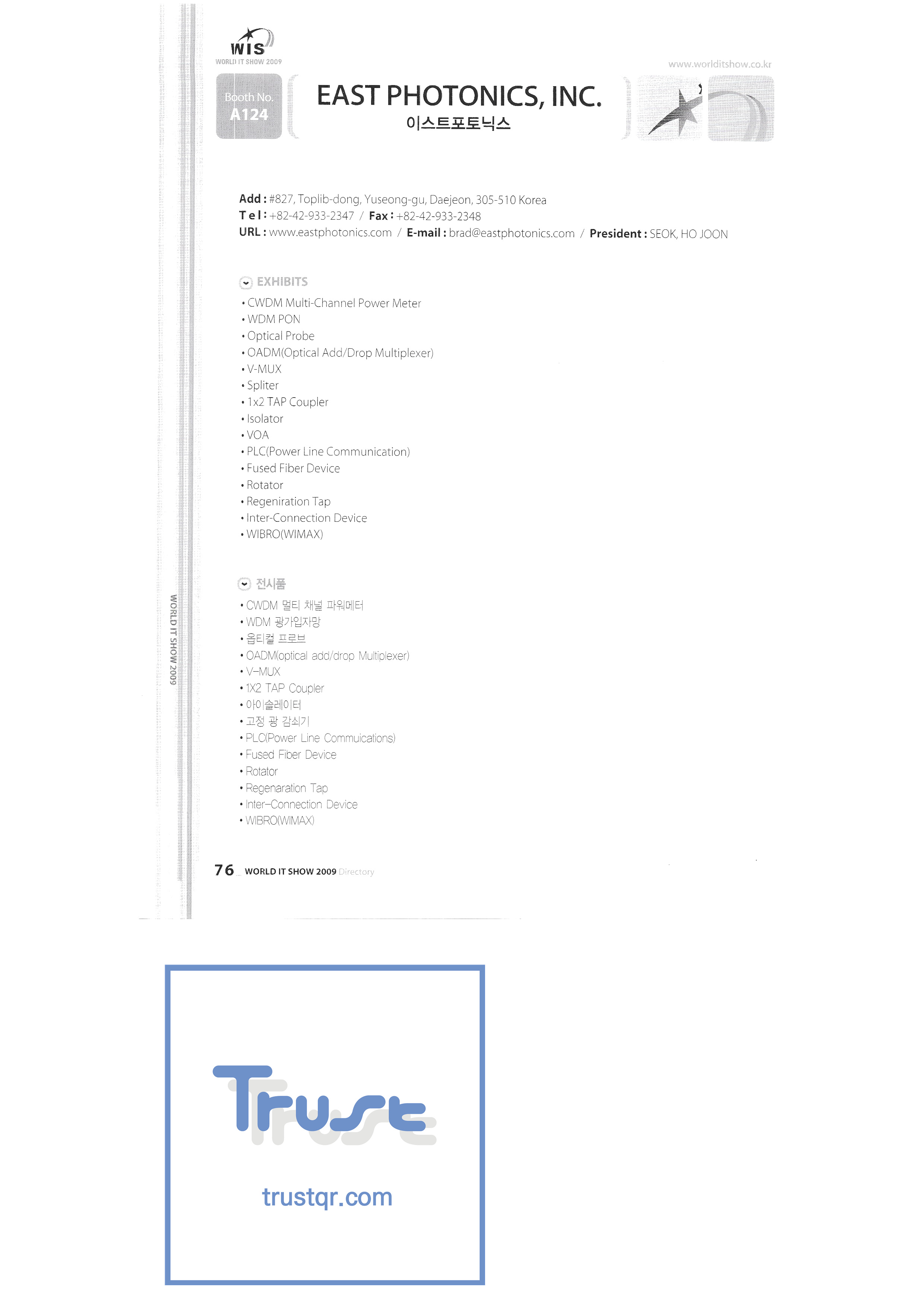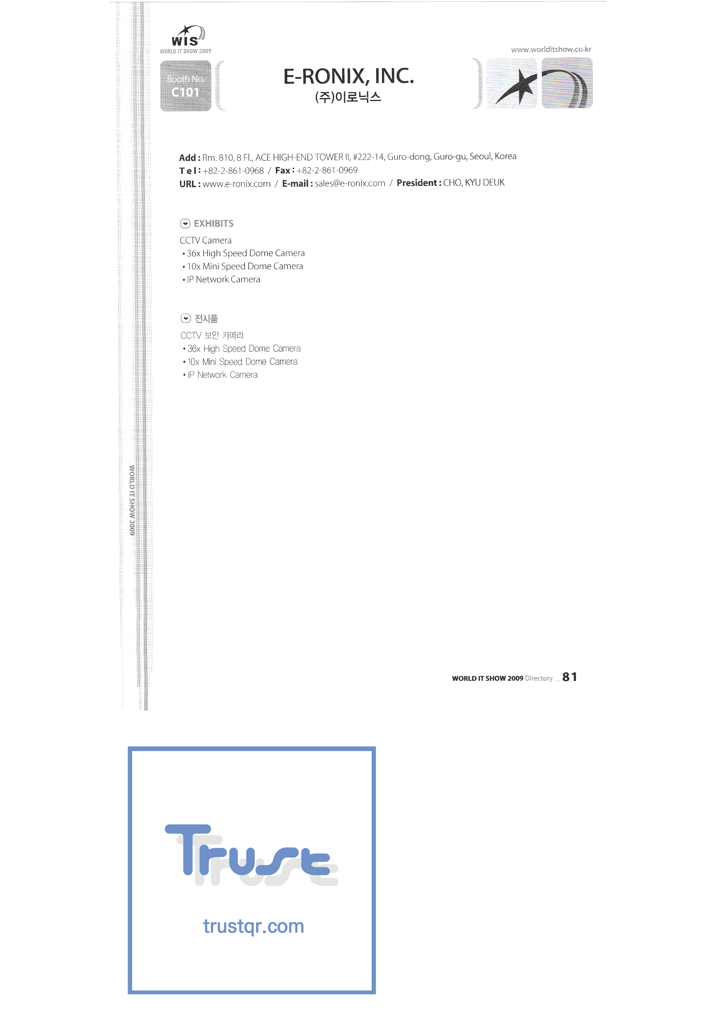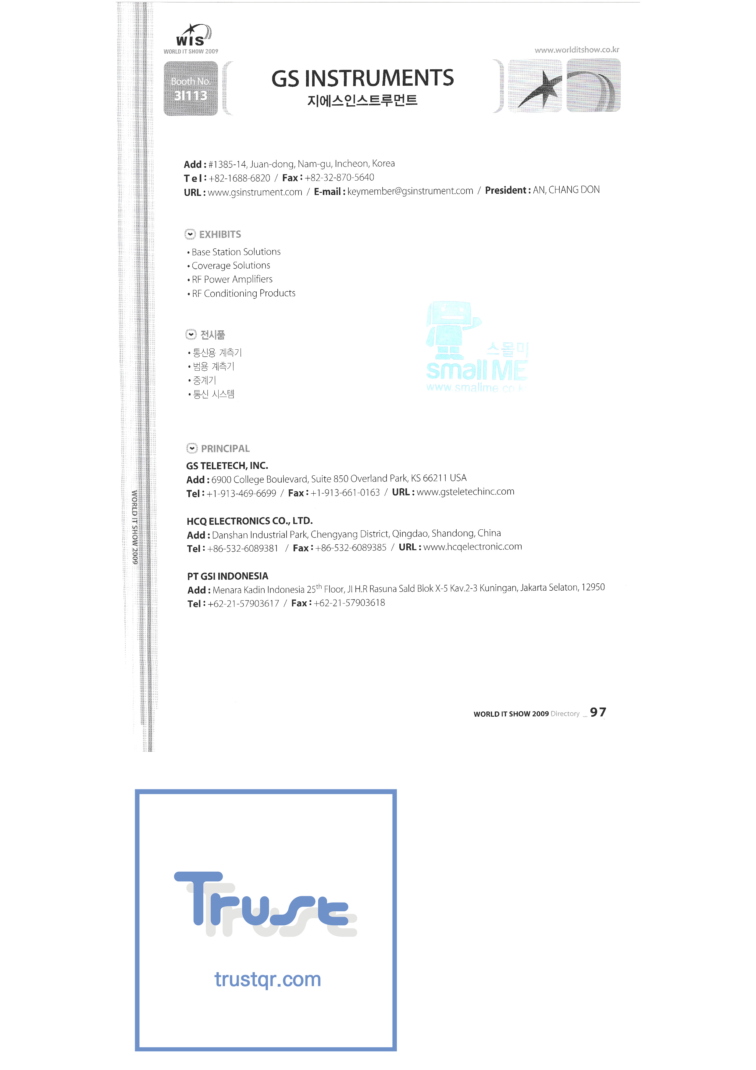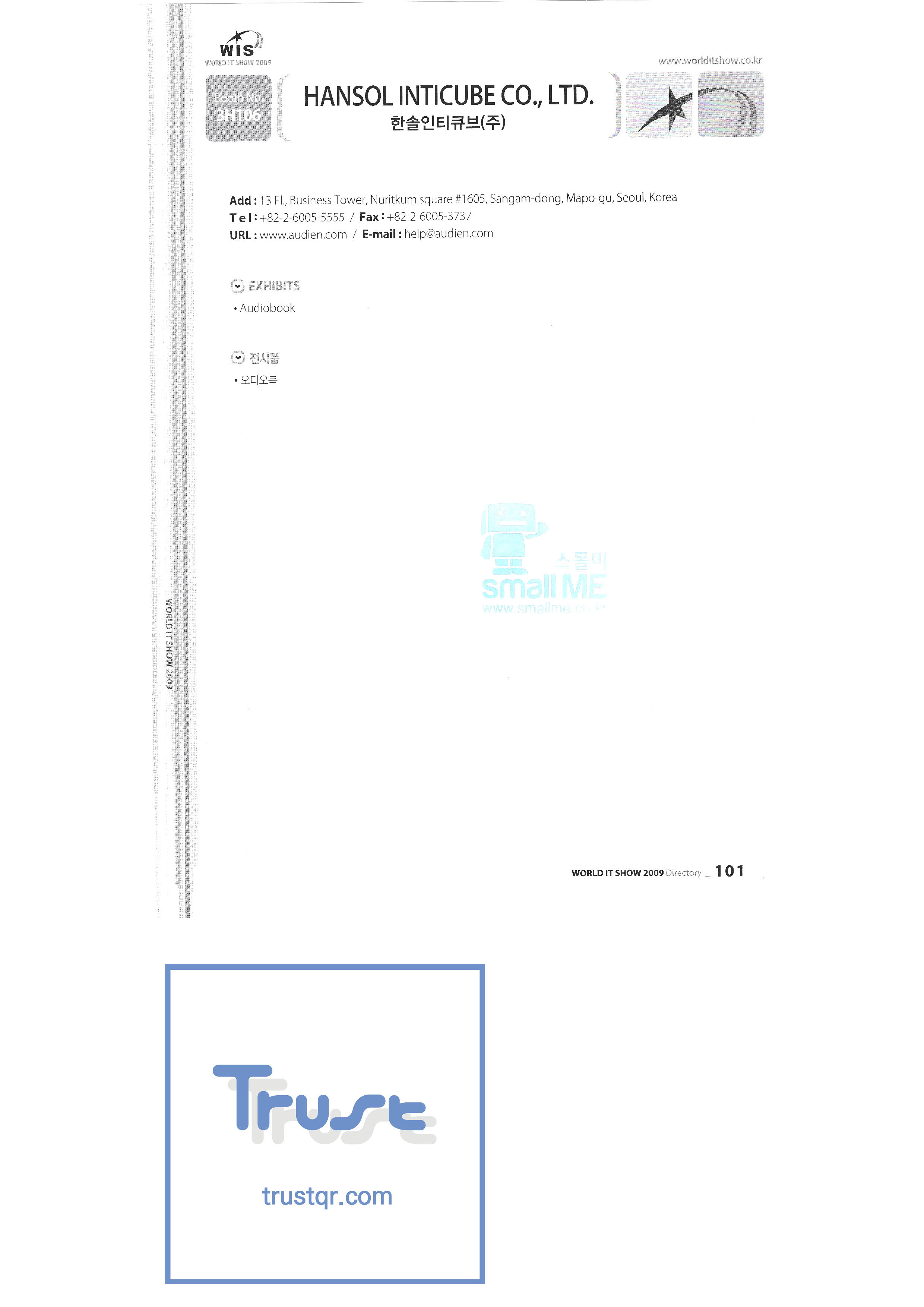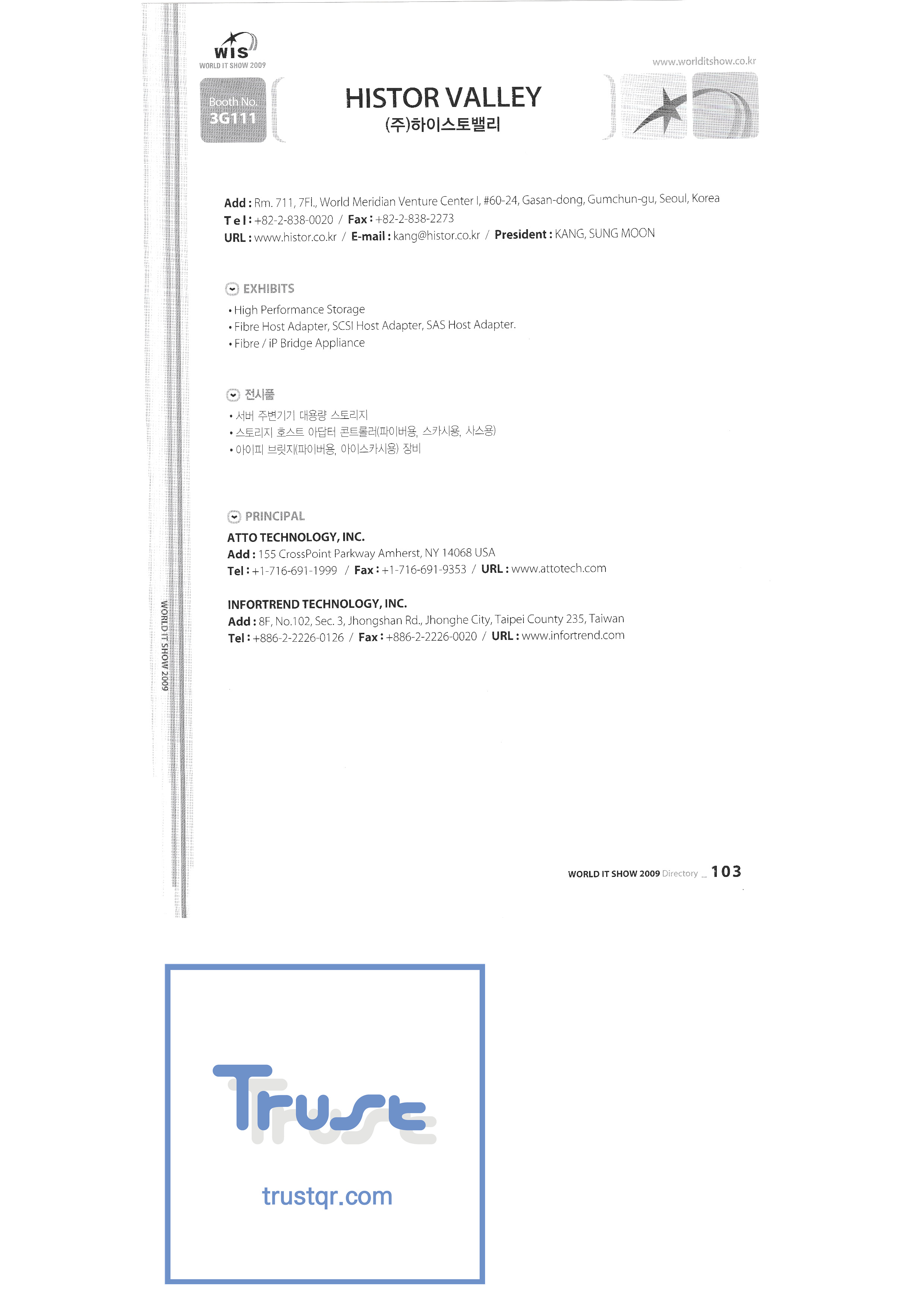 | WORLD IT SHOW 2009-3 บจก. เอียร์โซน โฟโตนิกส์ตะวันออก EDMS บจก. บริษัท อีเล็คคอม จำกัด สถาบันวิจัยอิเล็กทรอนิกส์และโทรคมนาคม บจก. อิออน บจก. อีโรนิกซ์ ESOL Information Communication Co. , Ltd. บจก. อีสซอฟท์ ยูโรเทรด Evenstar เอ็กซ์ซอฟต์บจก. IMAX บริษัท อีซี่พีทีเทค จำกัด Pasu.com บจก. เอฟ. เทค ฟิวชั่นซอฟท์ Game Park Holdings Kangwon Embedded Software Research Center สำนักงาน Seoul Geumcheon-gu บจก. จีเค โซลูชัน IP ทั่วโลก เครื่องมือ GNS กูโร - กู บจก. เอชทูโอซิสเต็มเทคโนโลยี แฮดงแมชชีนทูล บริษัท ฮันซอลอินทิคิวบ์ จำกัด Hanbit Touch Histo Valley บจก. ชิ้นส่วนขดลวด Hoeseong สำนักพัฒนาการค้าฮ่องกง HP Telecom Huins บจก. บจก. ฮยูวอน IBIT บริษัท ไอโบสันซิสเต็มส์ จำกัด บจก. ไอจีเวิร์ค ไอแซคเอสเอ็นซีบจก. การสื่อสาร ILS สำนักงานส่งเสริมอุตสาหกรรมข้อมูลอินชอน |