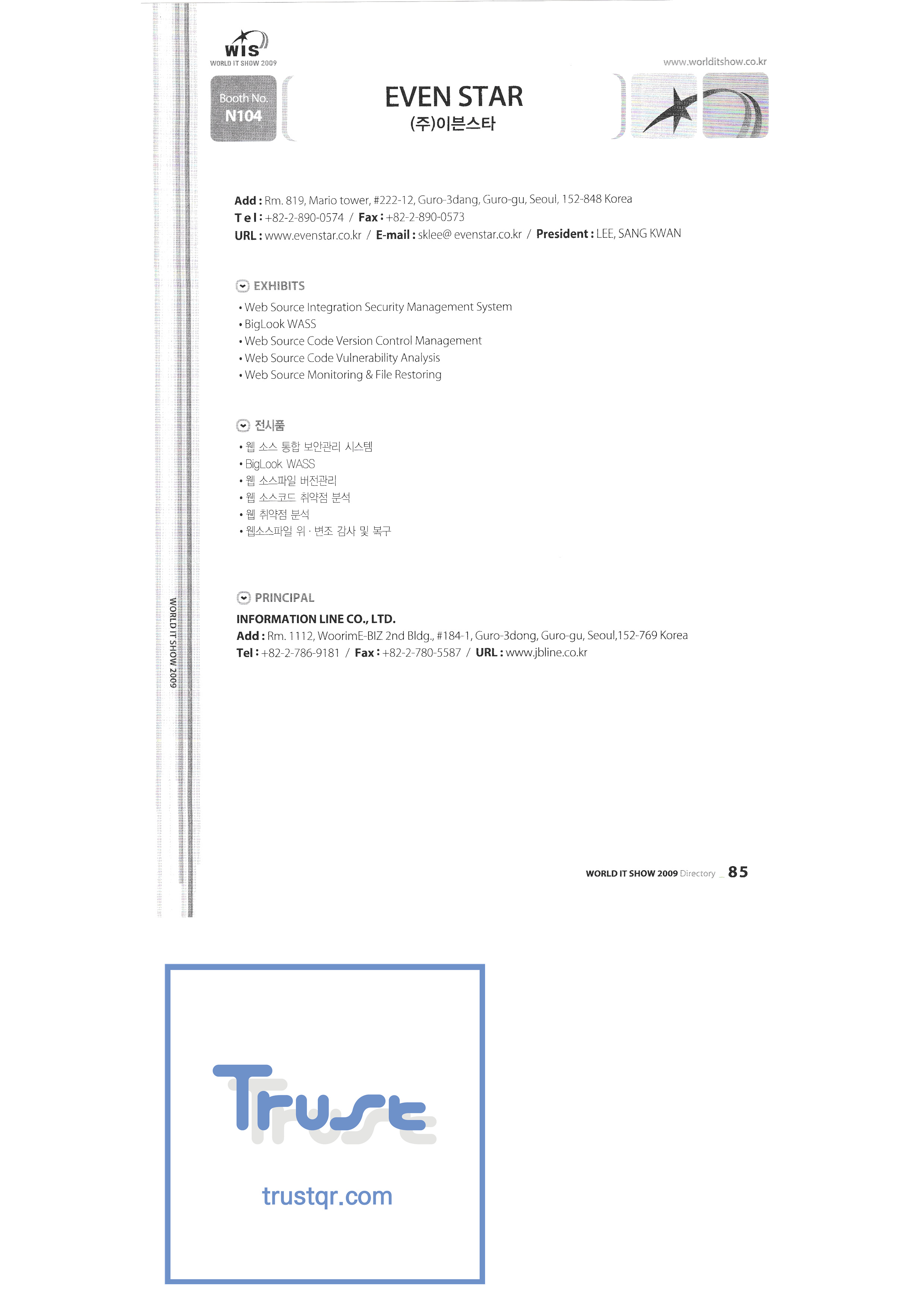 | WORLD IT SHOW 2009 - 3 ㈜이어존 이스트포토닉스 ㈜이디엠에스 ㈜일렉콤 한국전자통신연구원 ㈜이온 ㈜이로닉스 이솔정보통신㈜ ㈜이스트소프트 유로트레이드 ㈜이븐스타 ㈜엑스소프트 ㈜아이맥스 ㈜이지피티테크 ㈜파수닷컴 ㈜에프알텍 퓨전소프트 게임파크홀딩스 강원임베디드소프트웨어연구센터 서울특별시 금천구청 지케이㈜ GLOBAL IP SOLUTIONS 지엔스인스트루먼트 구로구 에이치투오시스템테크놀로지㈜ 하동기공 한솔인티큐브㈜ ㈜한빛터치 ㈜하이스토밸리 회성코일파츠 홍콩무역발전국 ㈜HP텔레콤 ㈜휴인스 ㈜휴원 ㈜아이비트 ㈜아이보슨시스템즈 ㈜아이지에이웍스 아이작에스엔씨㈜ ㈜아이엘에스커뮤니케이션 인천정보산업진흥원 |