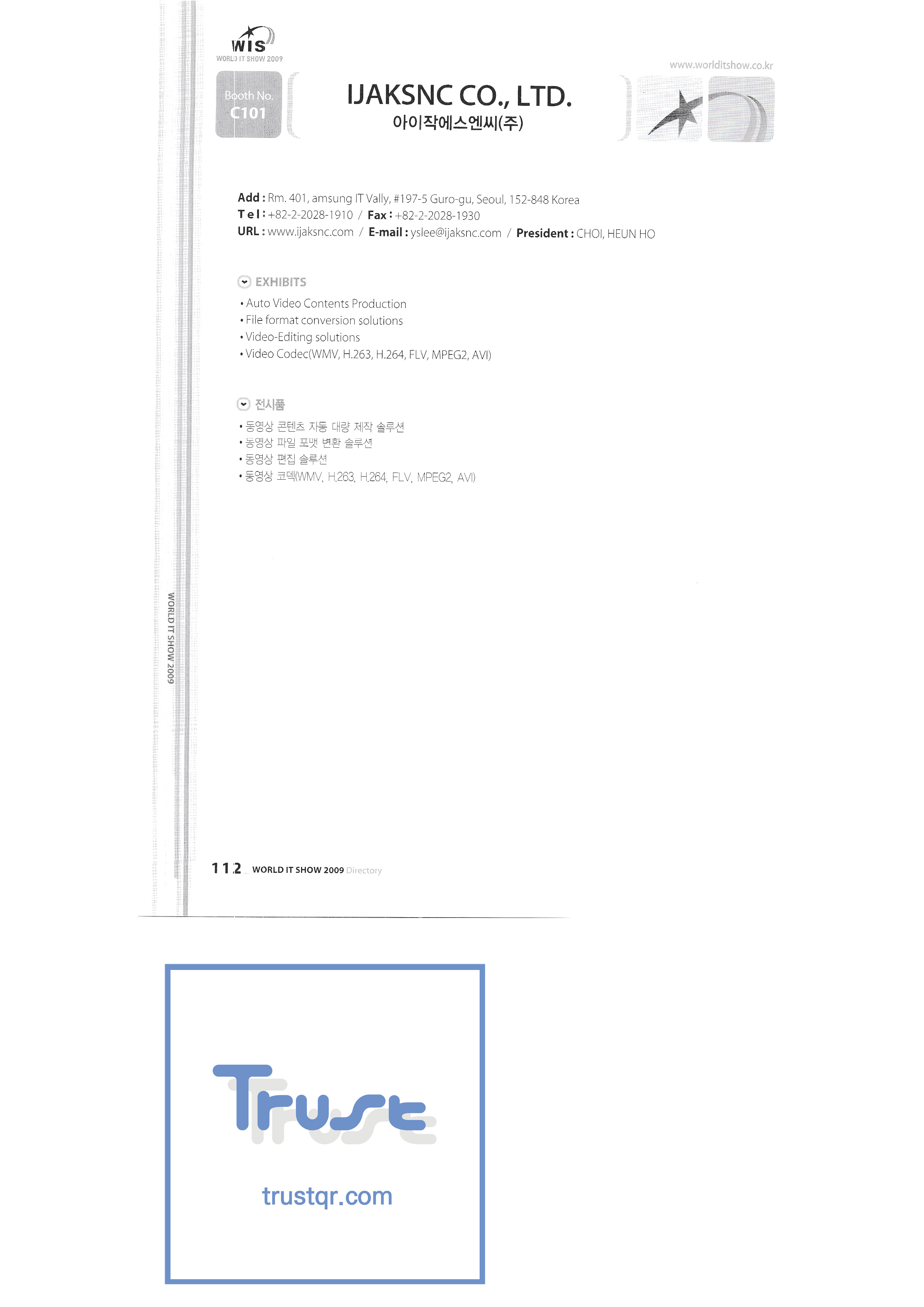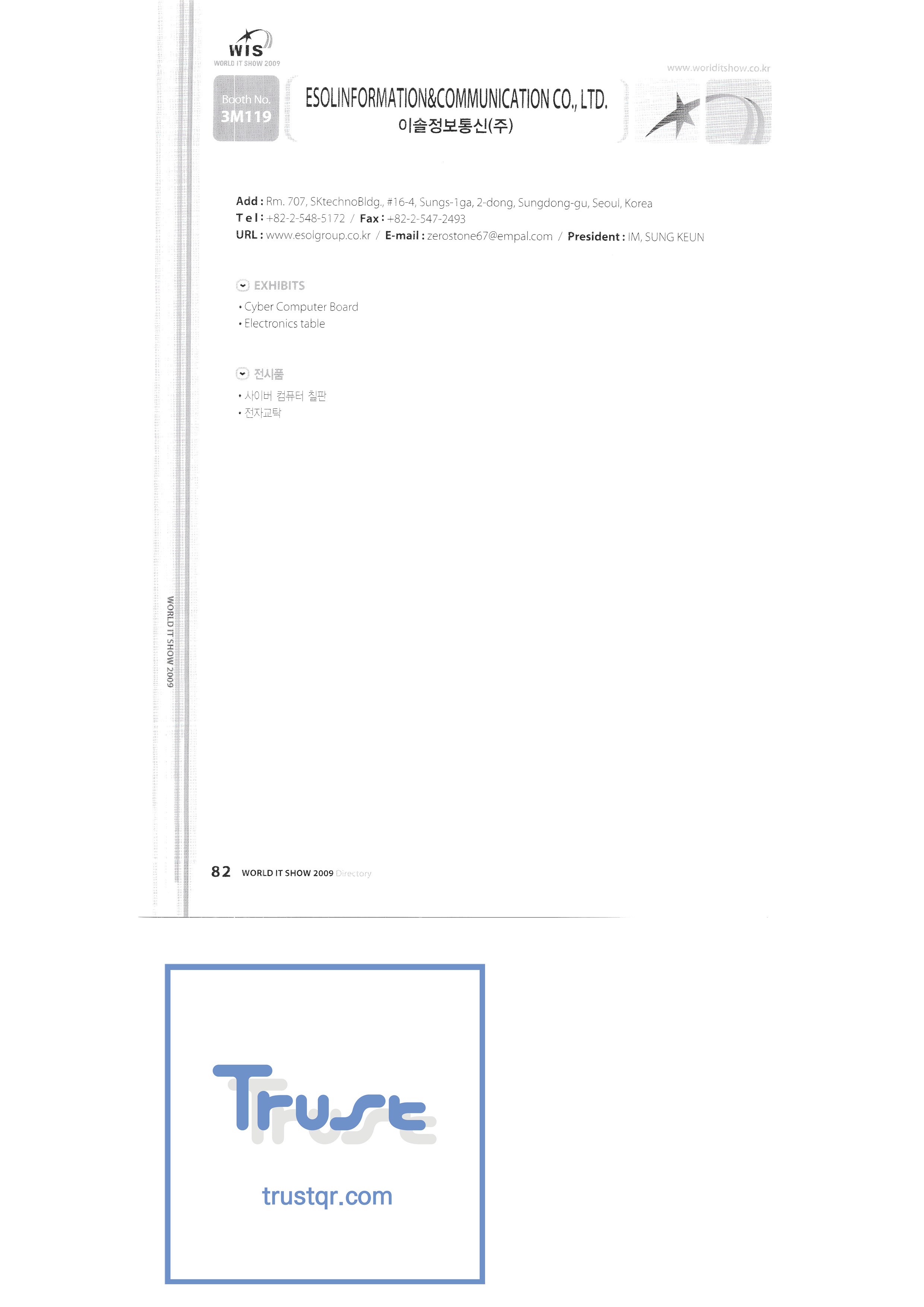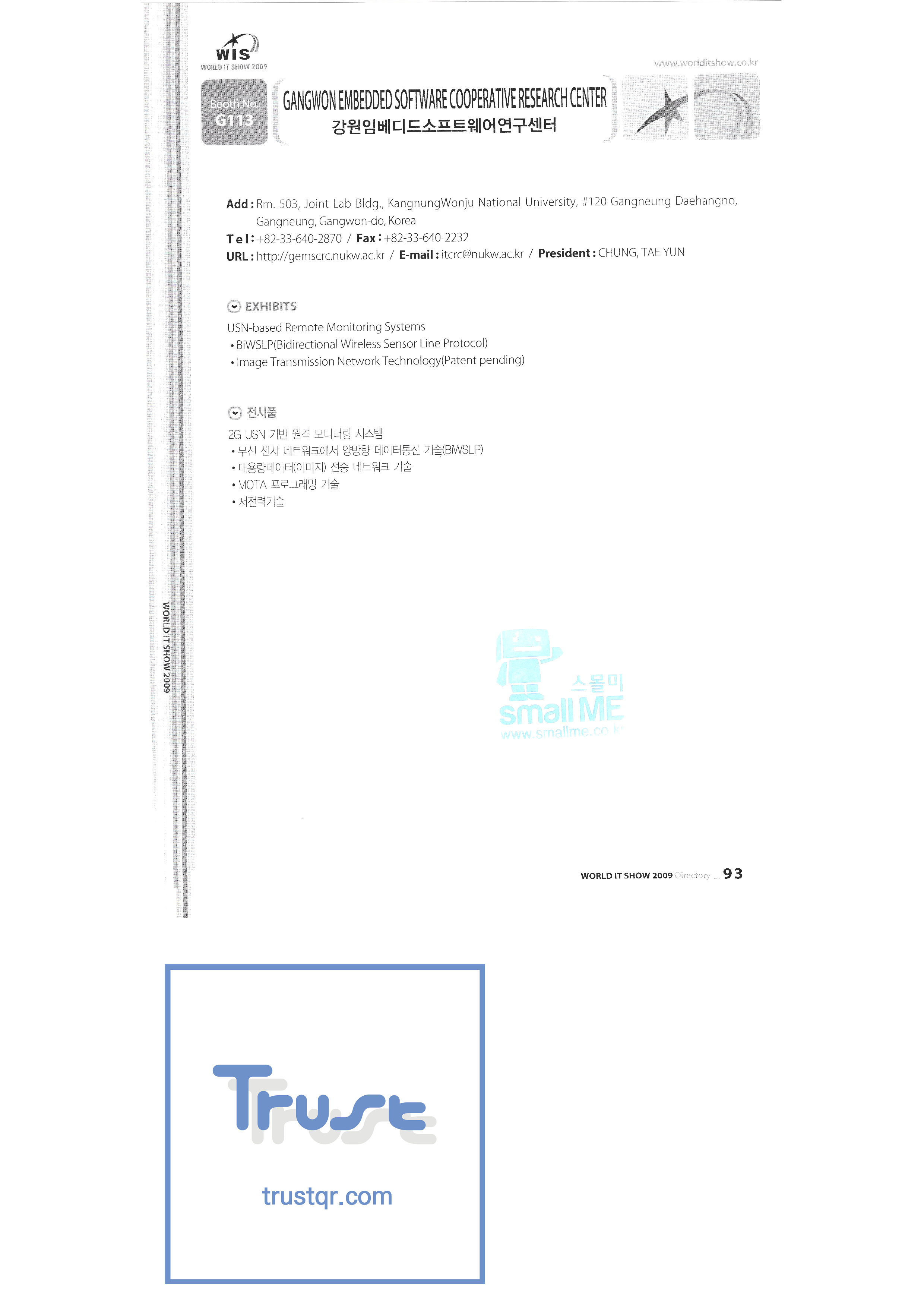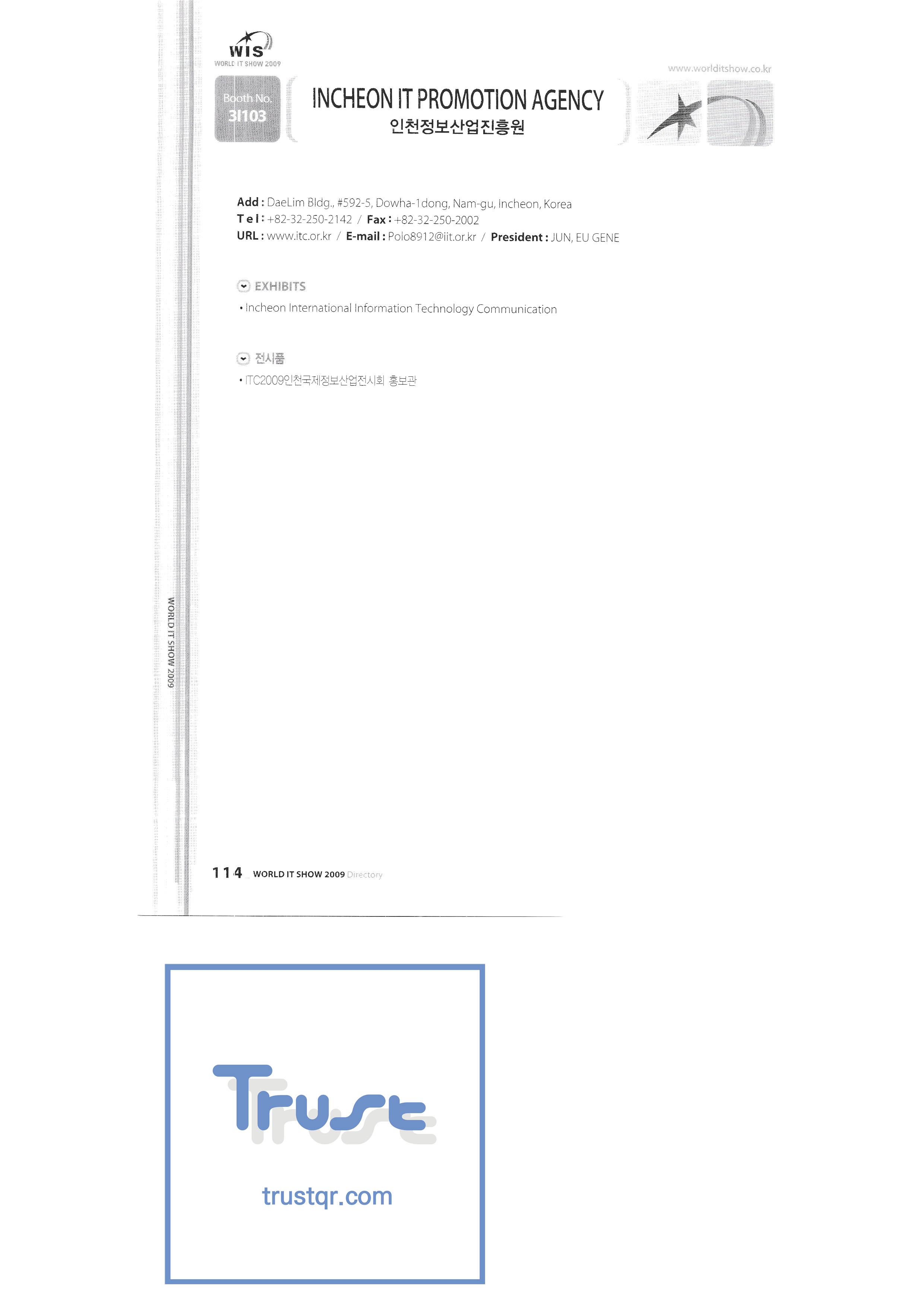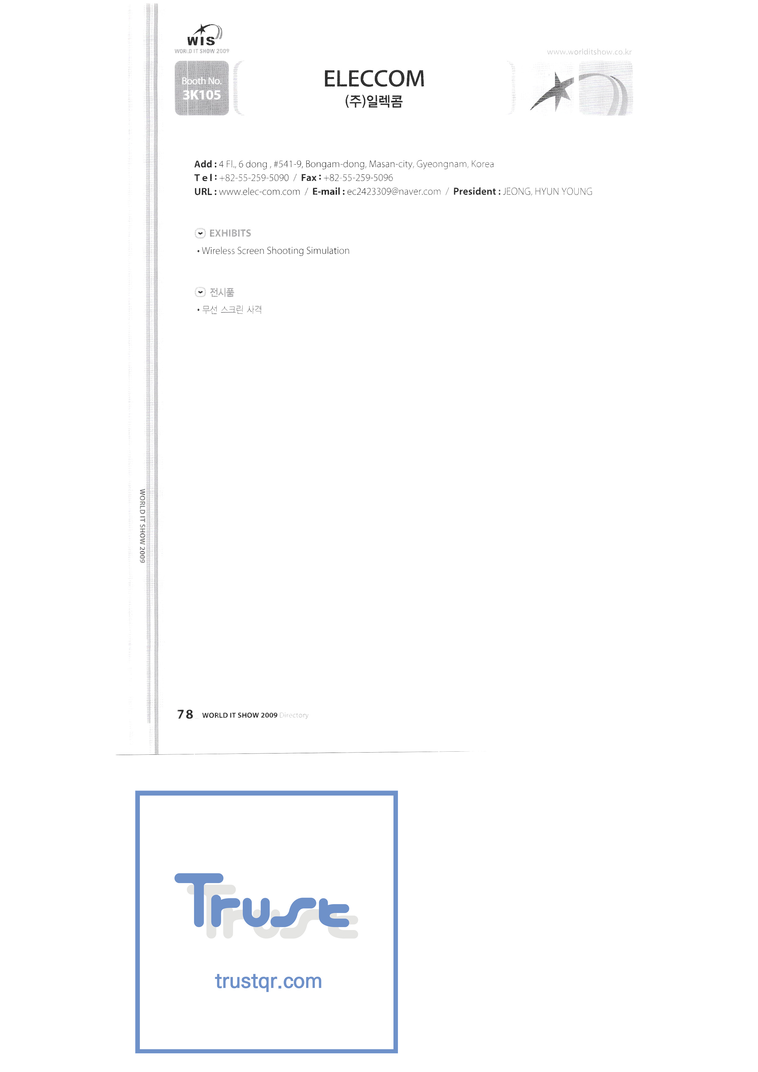 WORLD IT SHOW 2009-3 Earzone Co., Ltd. East Photonics EDMS Co., Ltd. Eleccom Co., Ltd. Electronics and Telecommunications Research Institute Aeon Co., Ltd. Eronix Co., Ltd. ESOL Information Communication Co., Ltd. East Soft Co., Ltd. Eurotrade Evenstar Xsoft Co., Ltd. IMAX Easy Pt Tech Co., Ltd. Pasu.com FR Tech Co., Ltd. Fusion Soft Game Park Holdings Kangwon Embedded Software Research Center Seoul Geumcheon-gu Office GK Co., Ltd. GLOBAL IP SOLUTIONS GNS Instruments Guro-gu H2O System Technology Co., Ltd. Hadong Machine Tools Hansol Inticube Co., Ltd. Hanbit Touch Histo Valley Co., Ltd. Hoeseong coil parts Hong Kong Trade Development Bureau HP Telecom Huins Co., Ltd. Hyuwon Co., Ltd. IBIT Iboson Systems Co., Ltd. IG Works Co., Ltd. Isaac SNC Co., Ltd. ILS Communication Incheon Information Industry Promotion Agency |