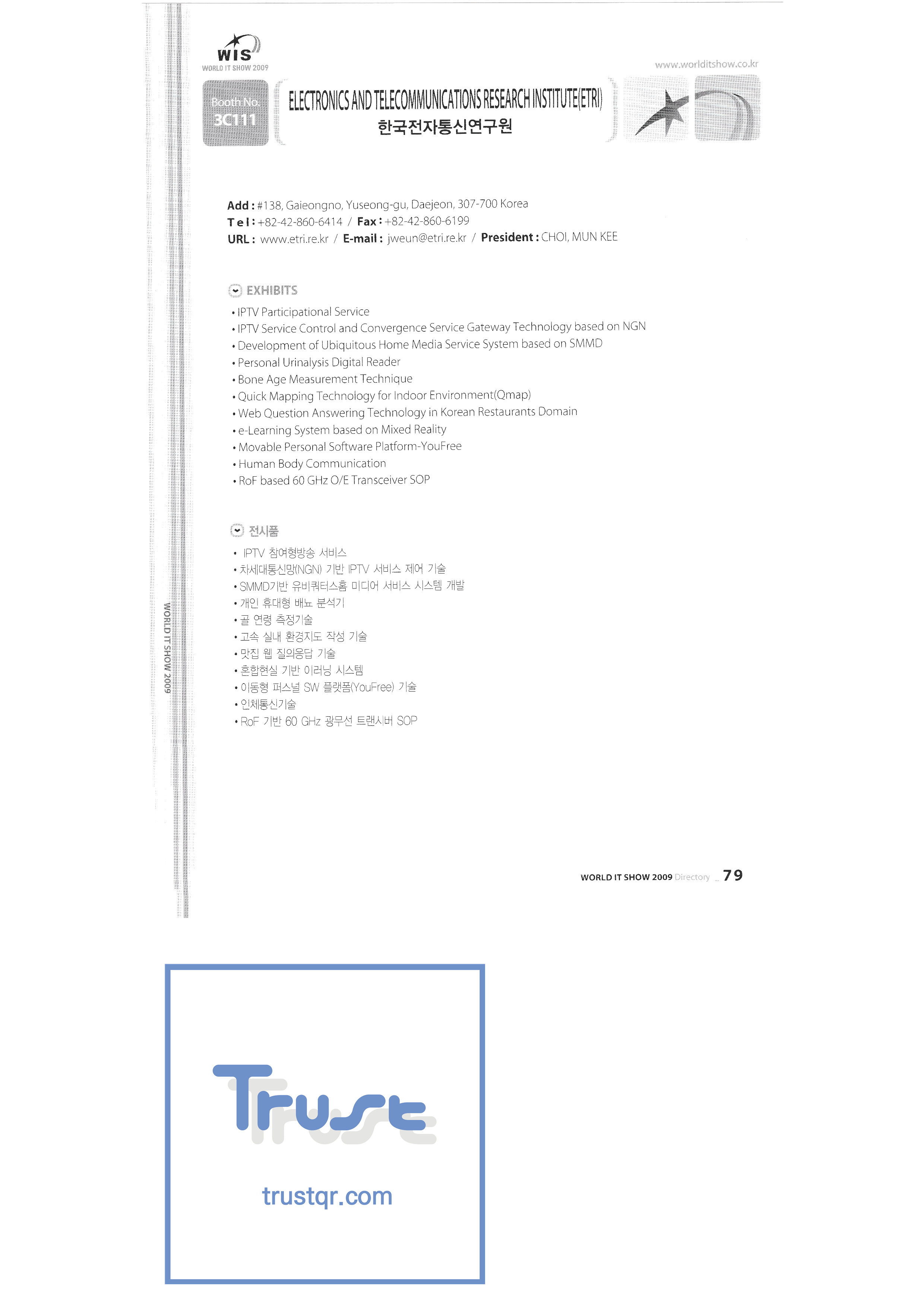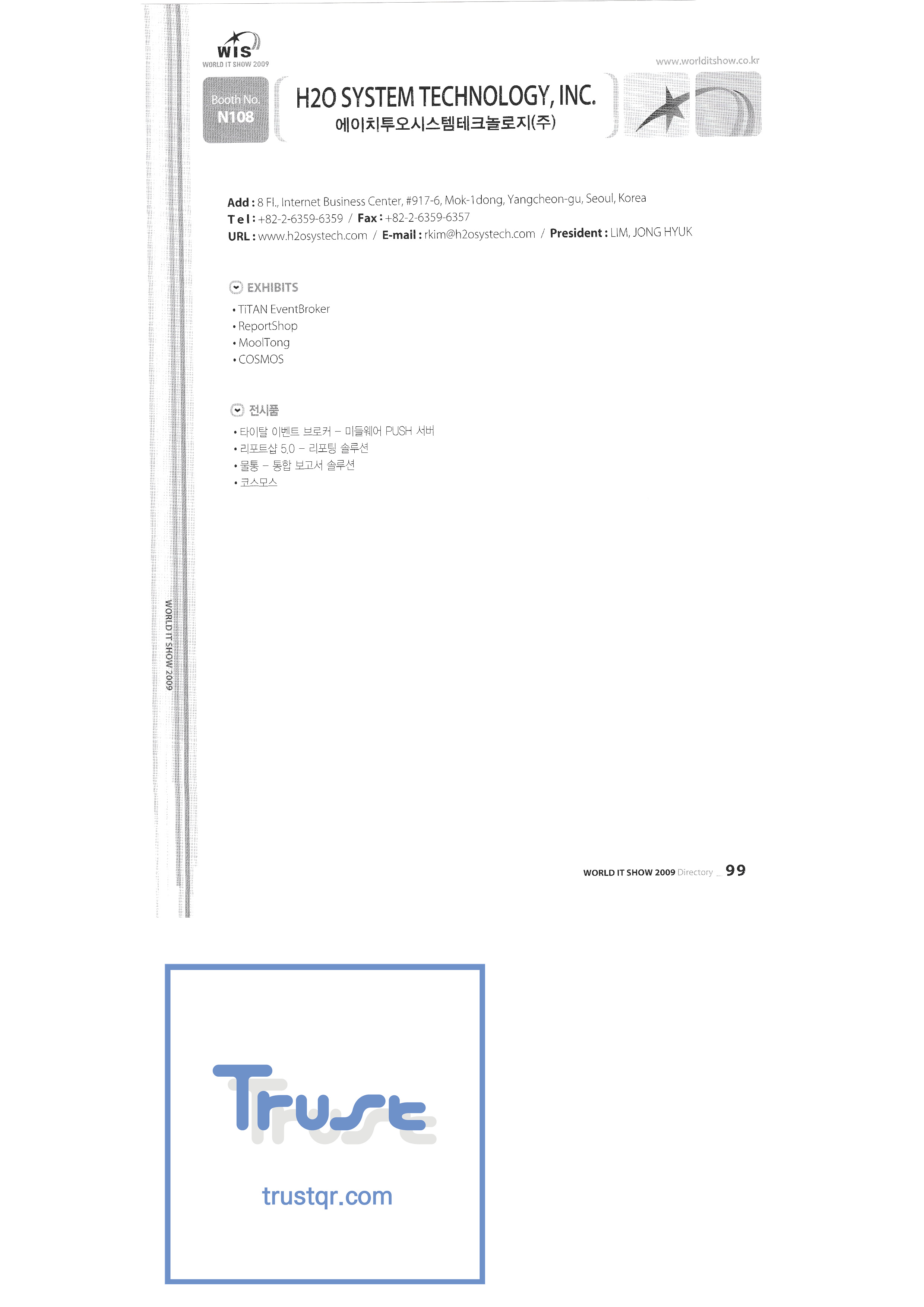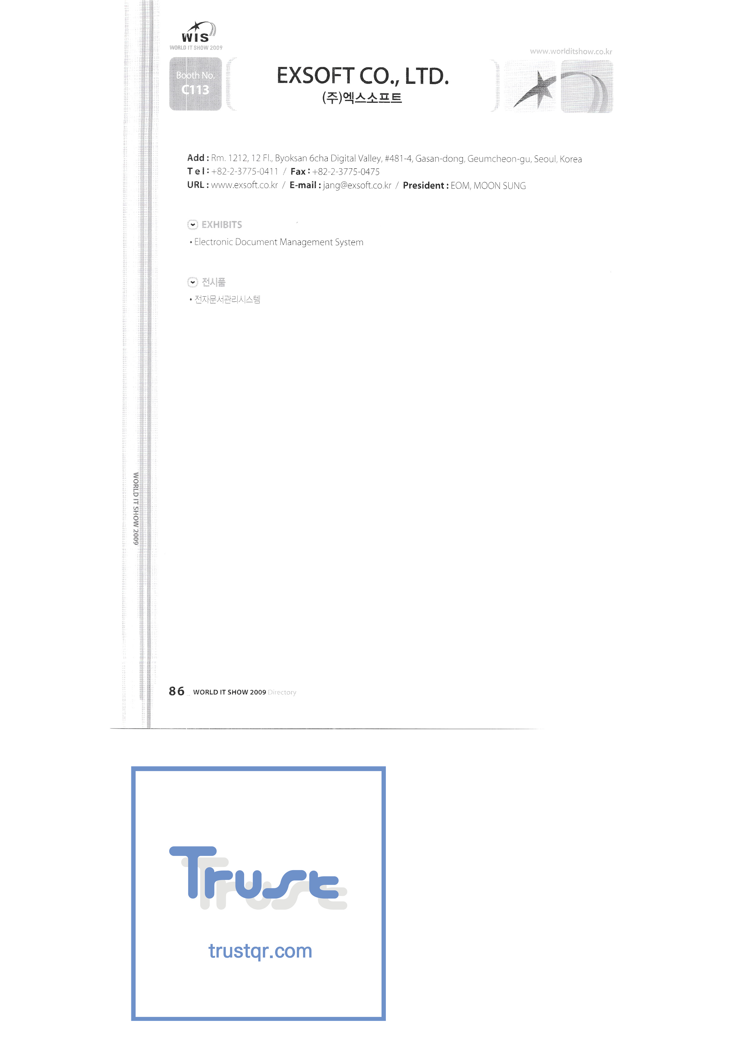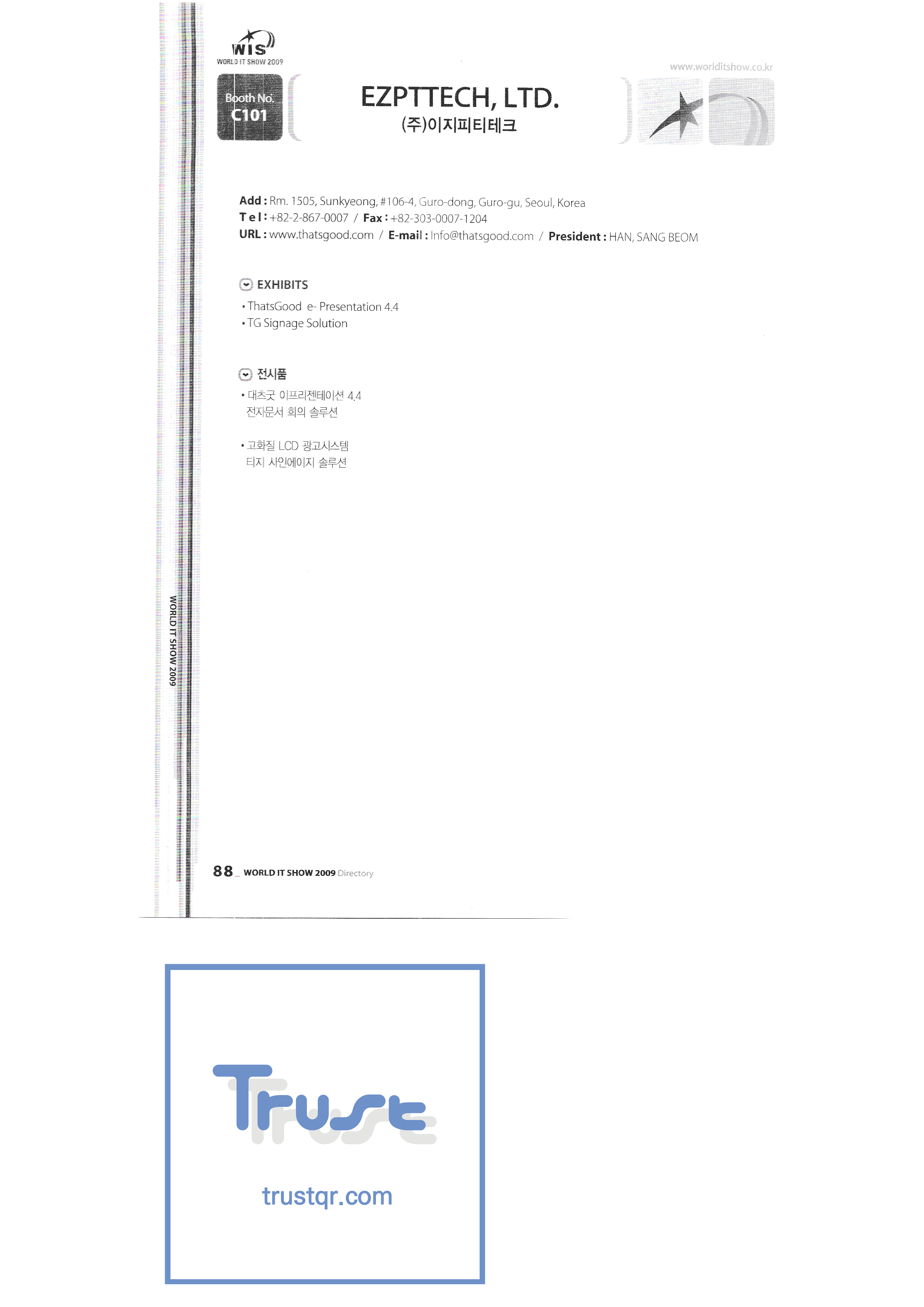 WORLD IT SHOW 2009-3 Earzone Co., Ltd. East Photonics EDMS Co., Ltd. Eleccom Co., Ltd. Electronics and Telecommunications Research Institute Aeon Co., Ltd. Eronix Co., Ltd. ESOL Information Communication Co., Ltd. East Soft Co., Ltd. Eurotrade Evenstar Xsoft Co., Ltd. IMAX Easy Pt Tech Co., Ltd. Pasu.com FR Tech Co., Ltd. Fusion Soft Game Park Holdings Kangwon Embedded Software Research Center Seoul Geumcheon-gu Office GK Co., Ltd. GLOBAL IP SOLUTIONS GNS Instruments Guro-gu H2O System Technology Co., Ltd. Hadong Machine Tools Hansol Inticube Co., Ltd. Hanbit Touch Histo Valley Co., Ltd. Hoeseong coil parts Hong Kong Trade Development Bureau HP Telecom Huins Co., Ltd. Hyuwon Co., Ltd. IBIT Iboson Systems Co., Ltd. IG Works Co., Ltd. Isaac SNC Co., Ltd. ILS Communication Incheon Information Industry Promotion Agency |