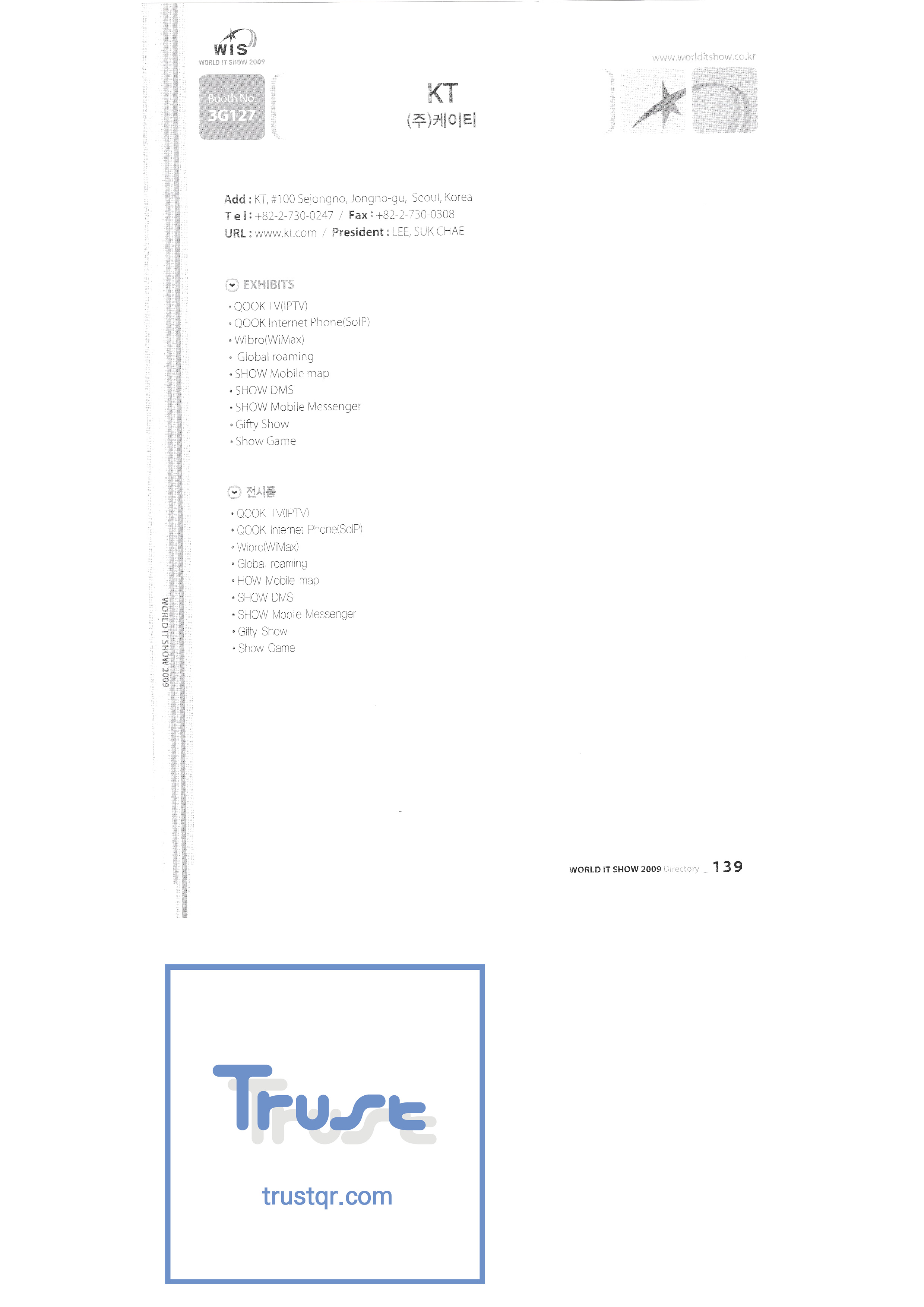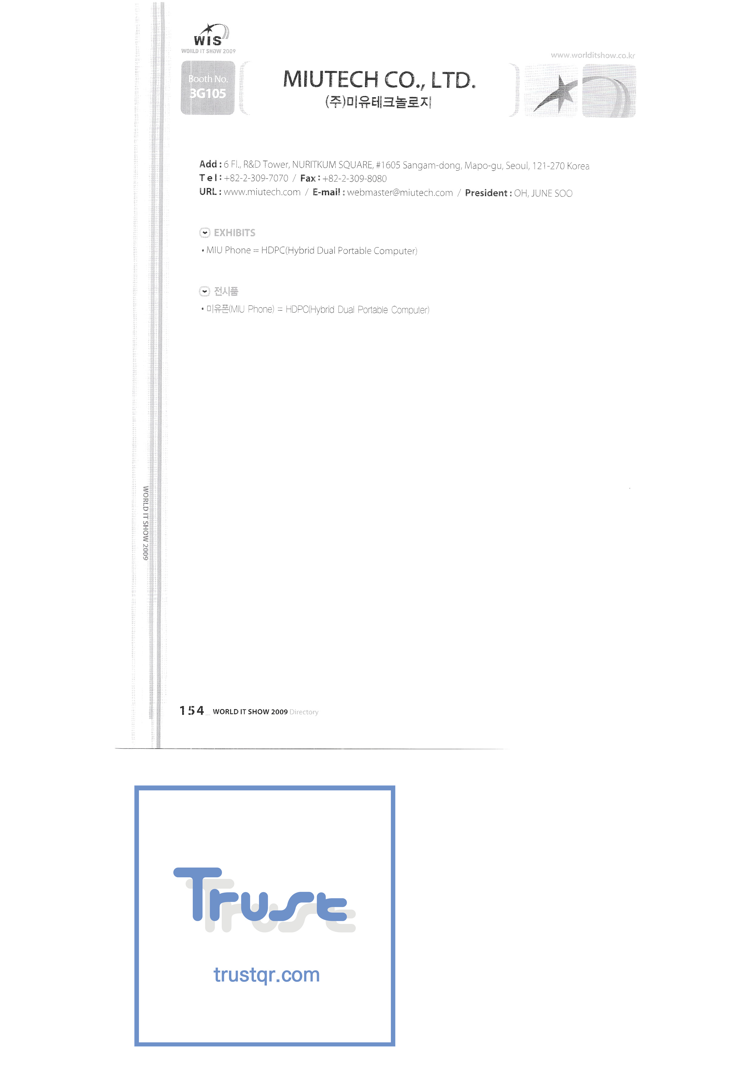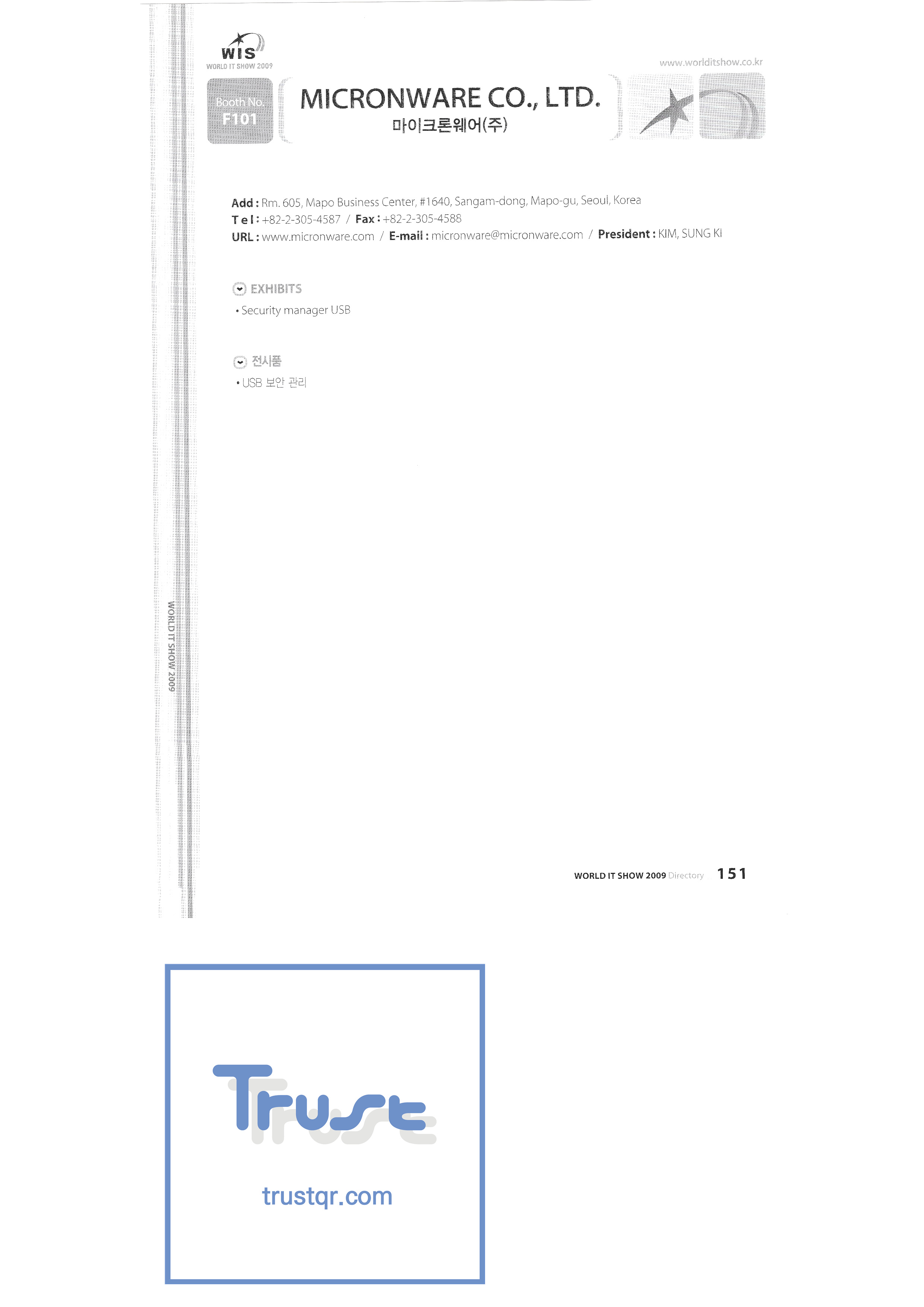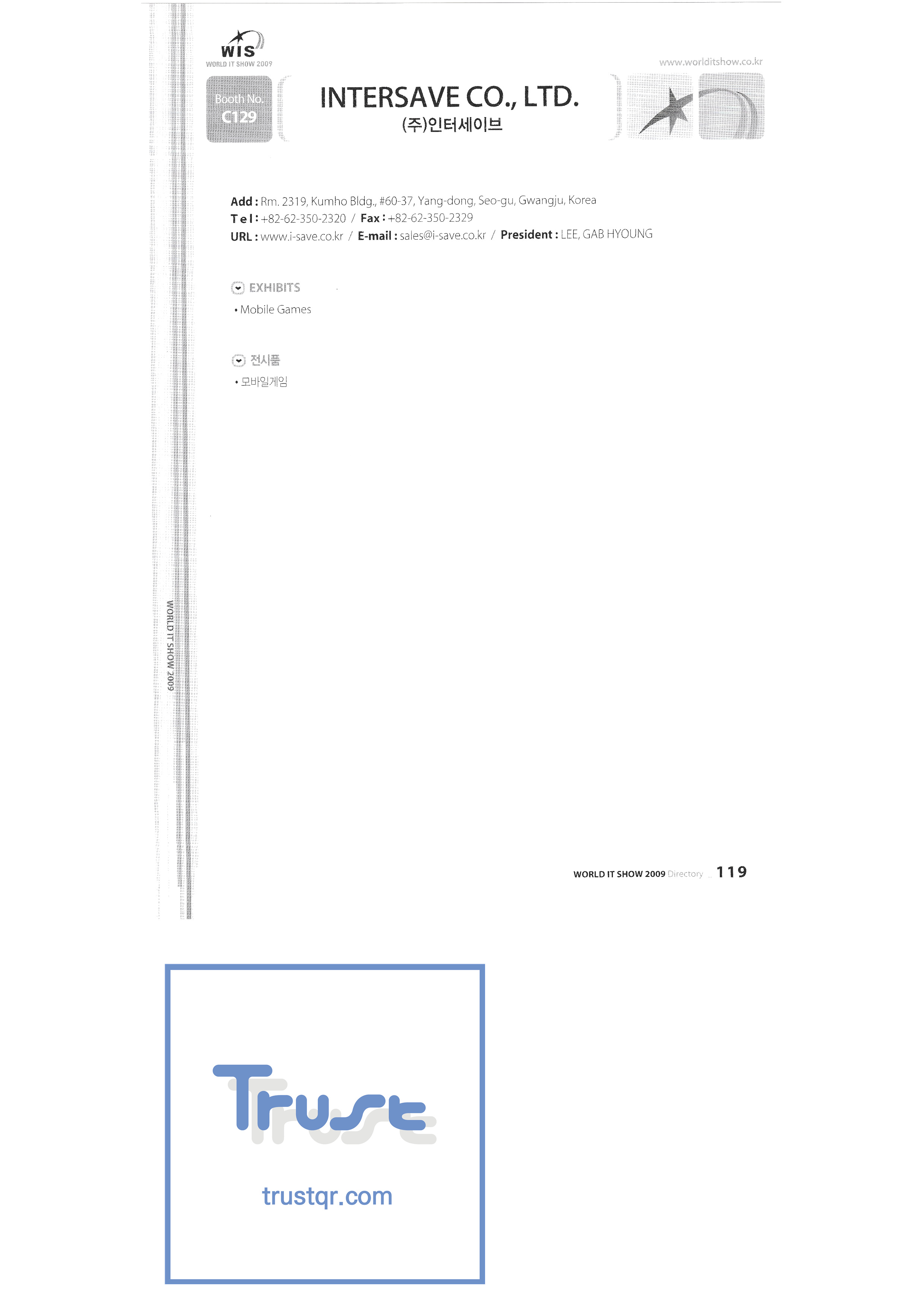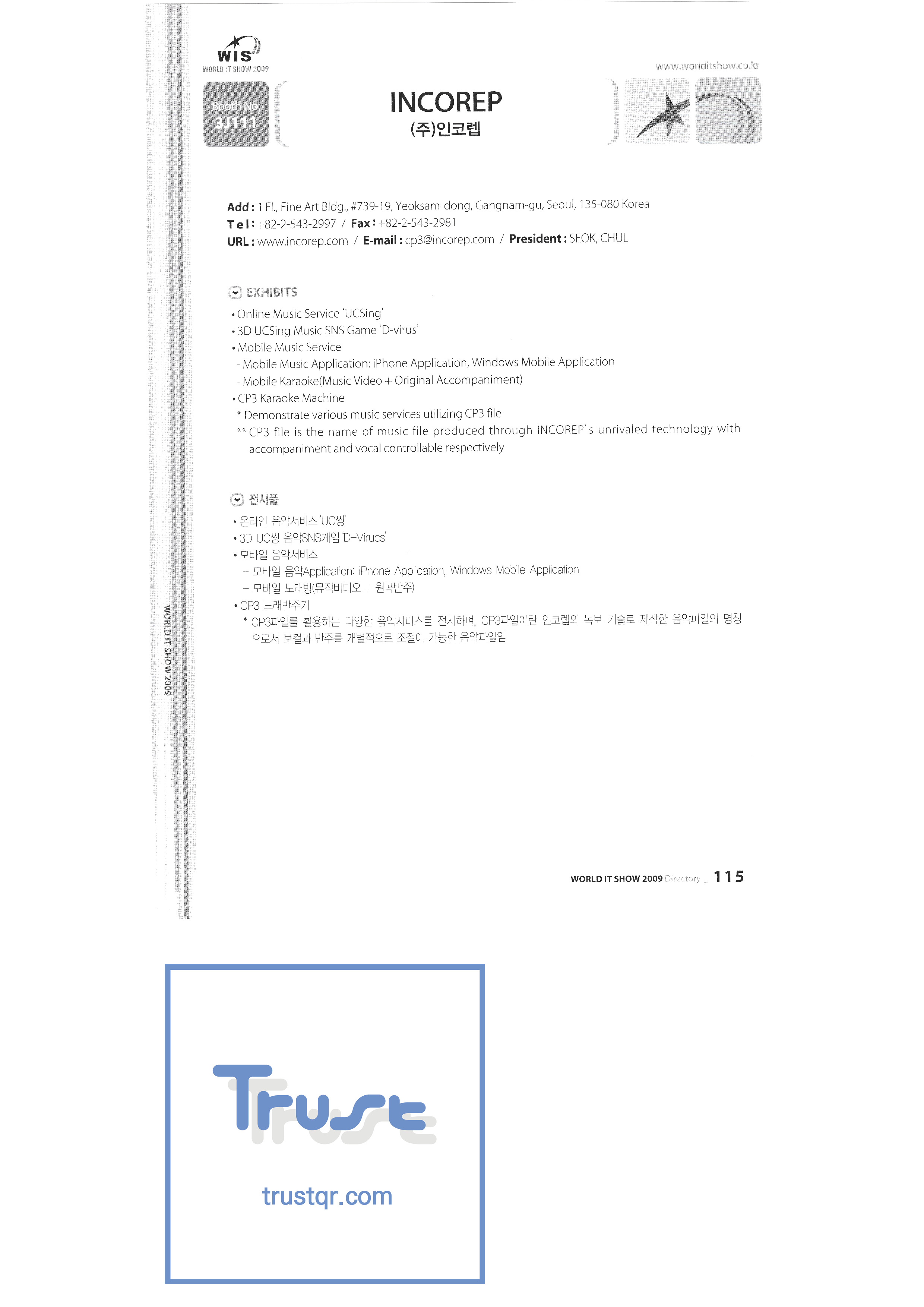 WORLD IT SHOW 2009-4 Incore Co., Ltd. Keimyung University Industry-Academic Cooperation Foundation FTB Project Group Inno Touch Technology Intellian Systems InterSave Co., Ltd. Intratech Intrikat INUS Technology Irutec ISA Tech Co., Ltd. IT Health Co., Ltd. Euncom Jo Jisung I&C JP Sun Co., Ltd. JRT Networks Co., Ltd. K2C Soft Co., Ltd. Kines Co., Ltd. KD Tech Knet Co., Ltd. Know-How Bank Co., Ltd. Kodak Korea KOT Co., Ltd. Korea Radio Promotion Agency Cotrox KT KTS Optonics Co., Ltd. LG Electronics Rivertron Co., Ltd. Lightcom Inc. Log Co., Ltd. M2Soft Co., Ltd. Mapo-gu, Seoul Maxcon Mega Searchnet Memoret World Mantech Micronware Co., Ltd. MIK21 Minsung Electronics Miyu Technology Co., Ltd. |