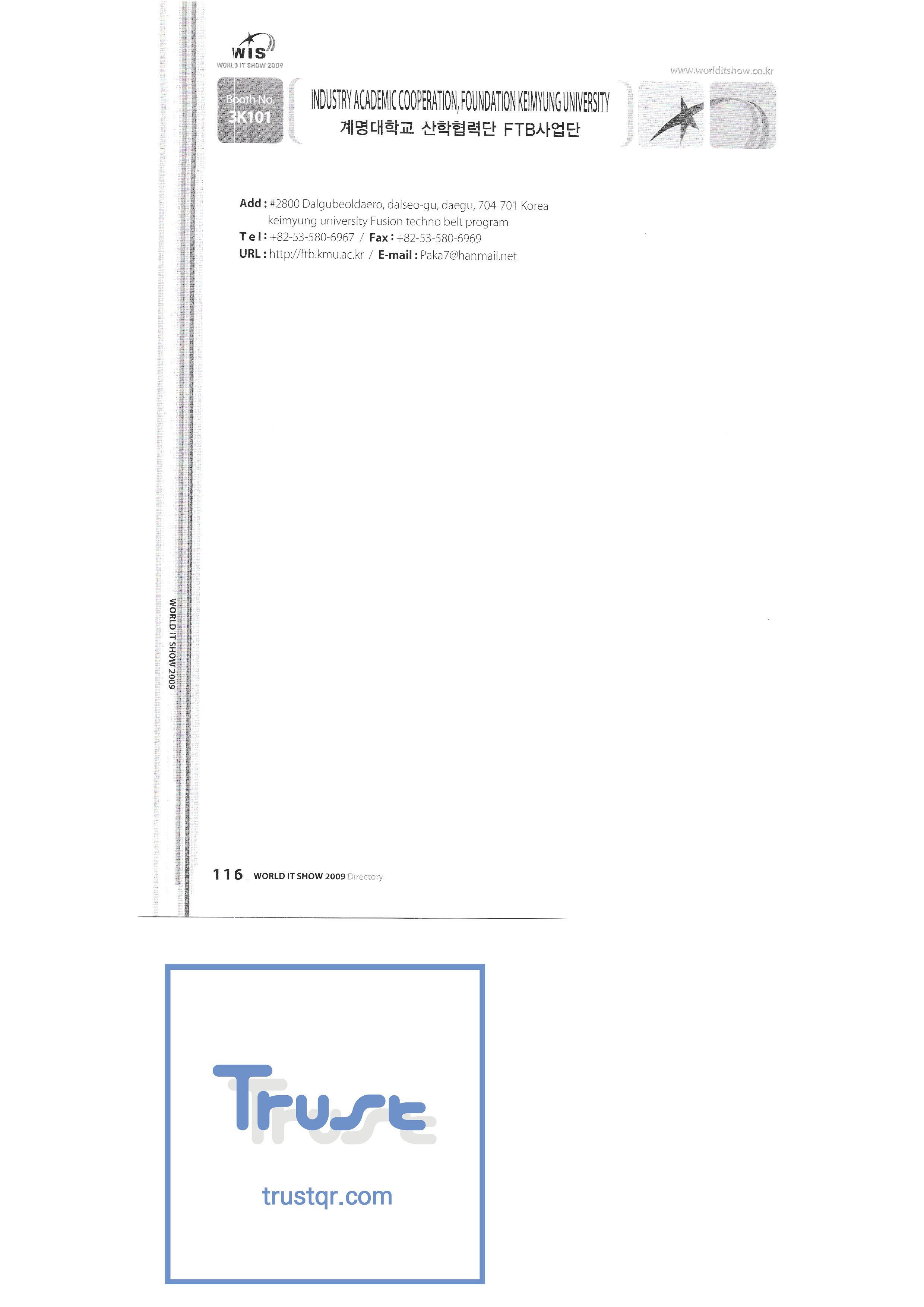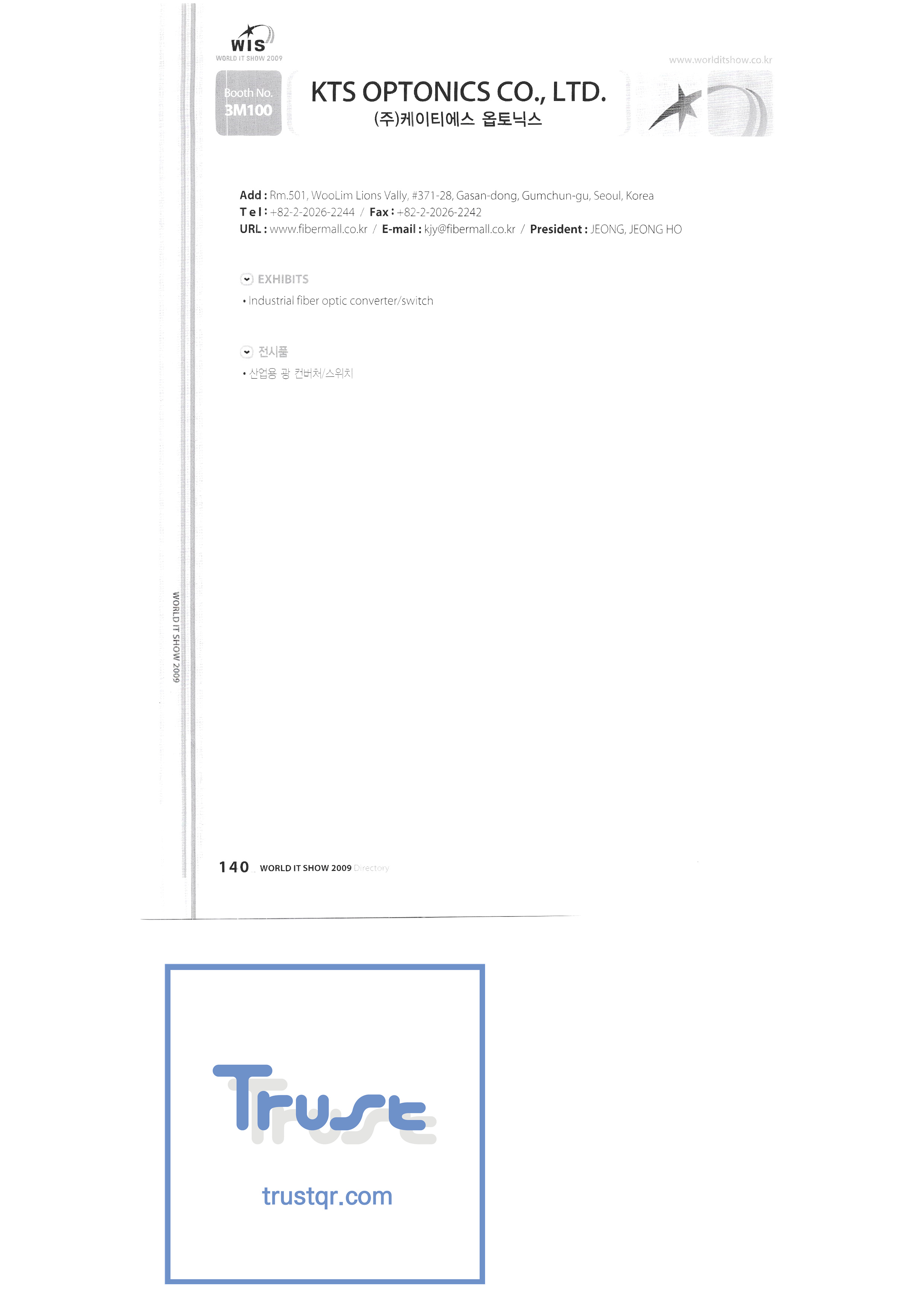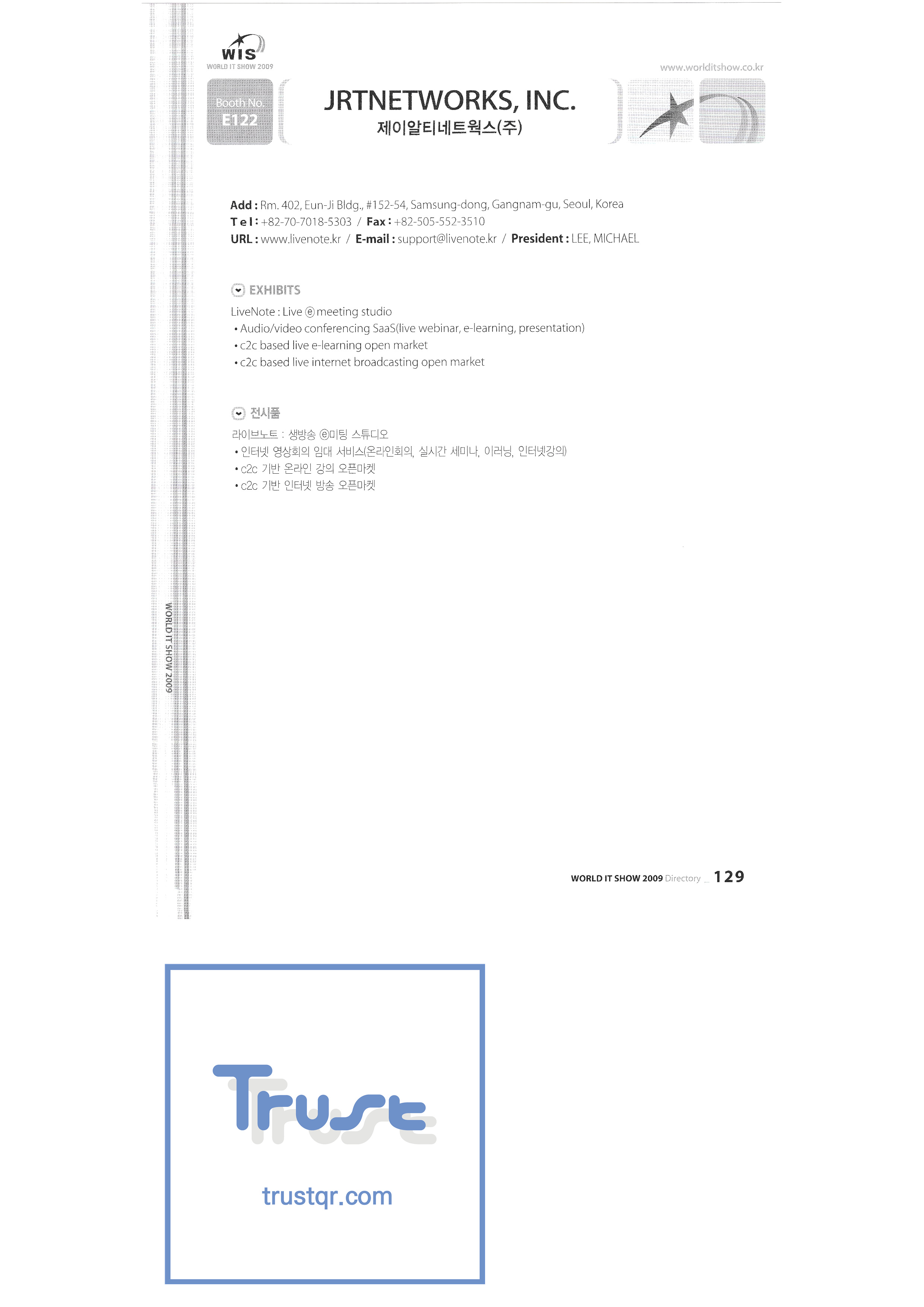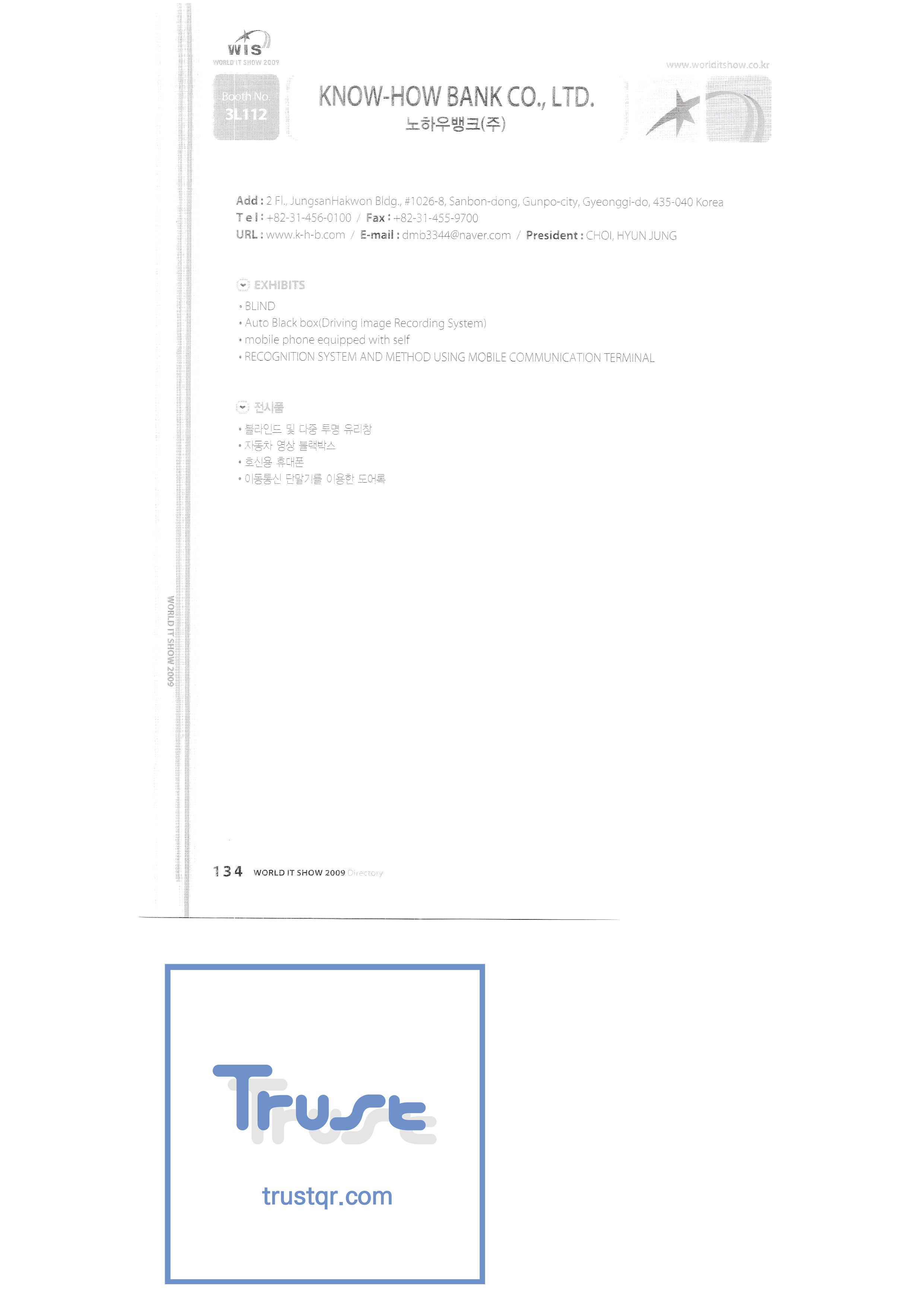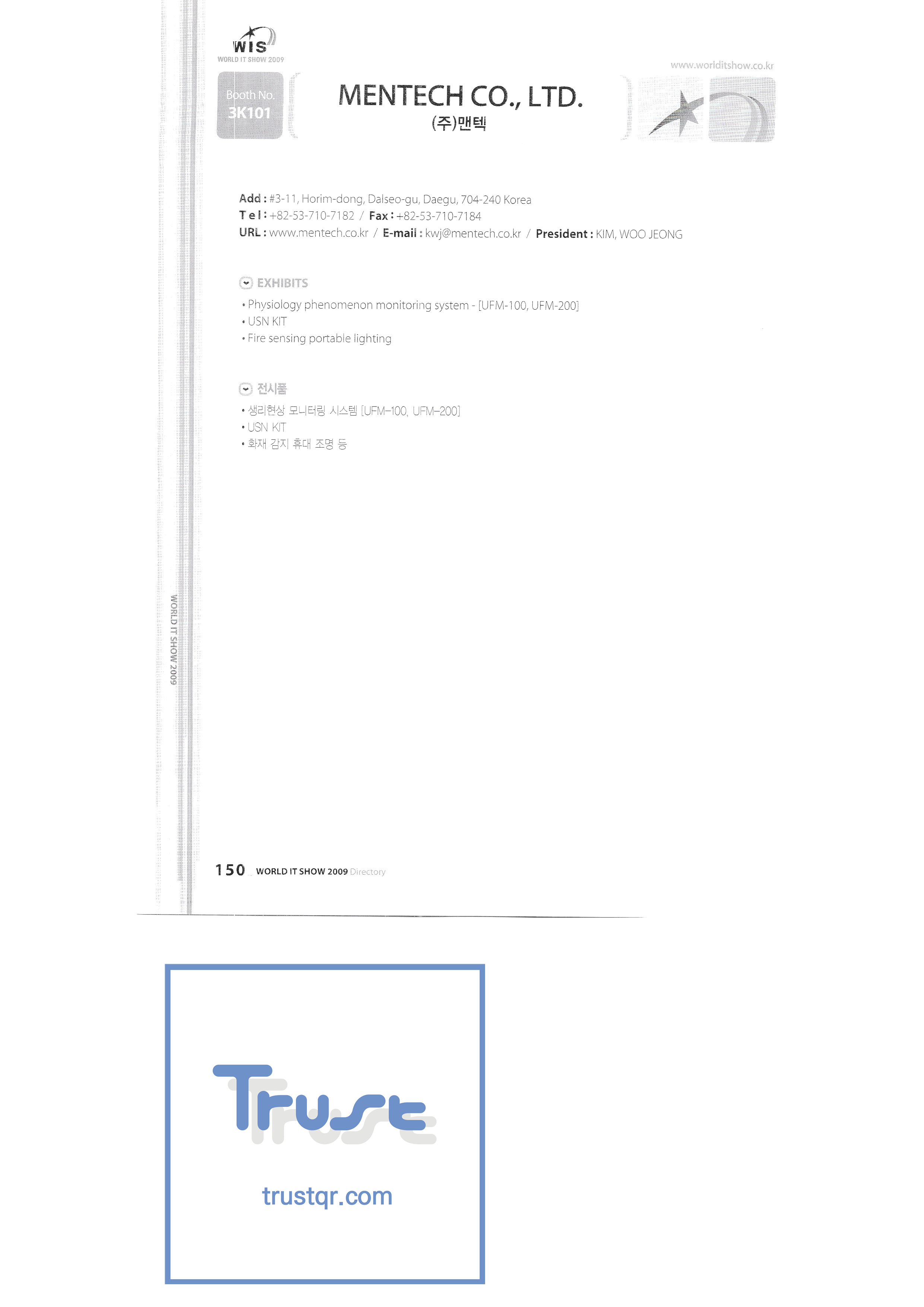 WORLD IT SHOW 2009-4 Incore Co., Ltd. Keimyung University Industry-Academic Cooperation Foundation FTB Project Group Inno Touch Technology Intellian Systems InterSave Co., Ltd. Intratech Intrikat INUS Technology Irutec ISA Tech Co., Ltd. IT Health Co., Ltd. Euncom Jo Jisung I&C JP Sun Co., Ltd. JRT Networks Co., Ltd. K2C Soft Co., Ltd. Kines Co., Ltd. KD Tech Knet Co., Ltd. Know-How Bank Co., Ltd. Kodak Korea KOT Co., Ltd. Korea Radio Promotion Agency Cotrox KT KTS Optonics Co., Ltd. LG Electronics Rivertron Co., Ltd. Lightcom Inc. Log Co., Ltd. M2Soft Co., Ltd. Mapo-gu, Seoul Maxcon Mega Searchnet Memoret World Mantech Micronware Co., Ltd. MIK21 Minsung Electronics Miyu Technology Co., Ltd. |