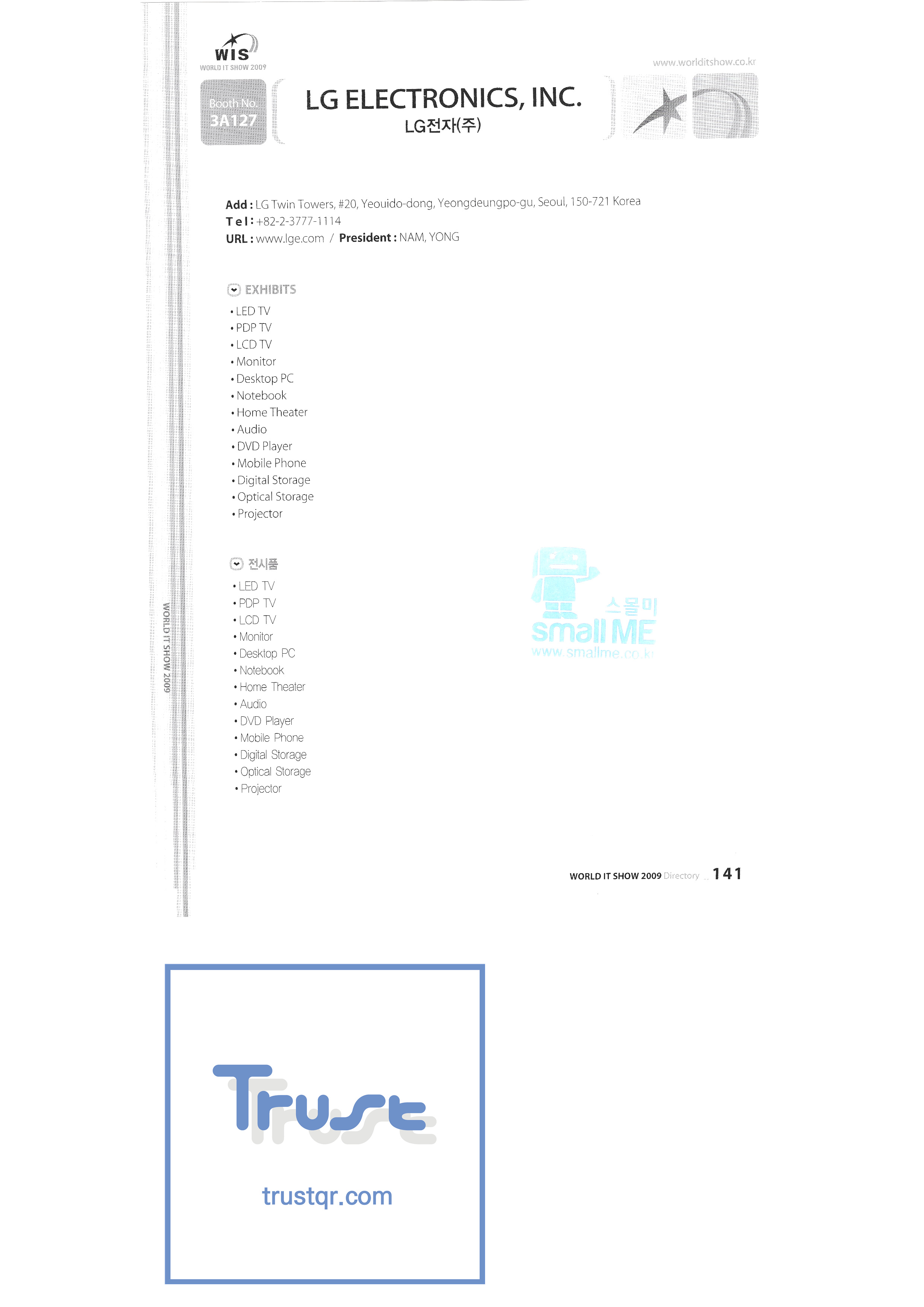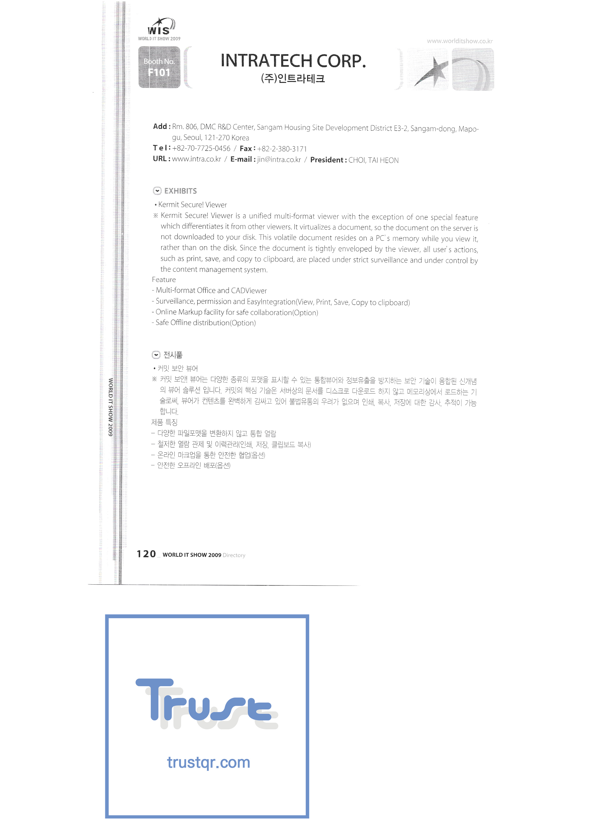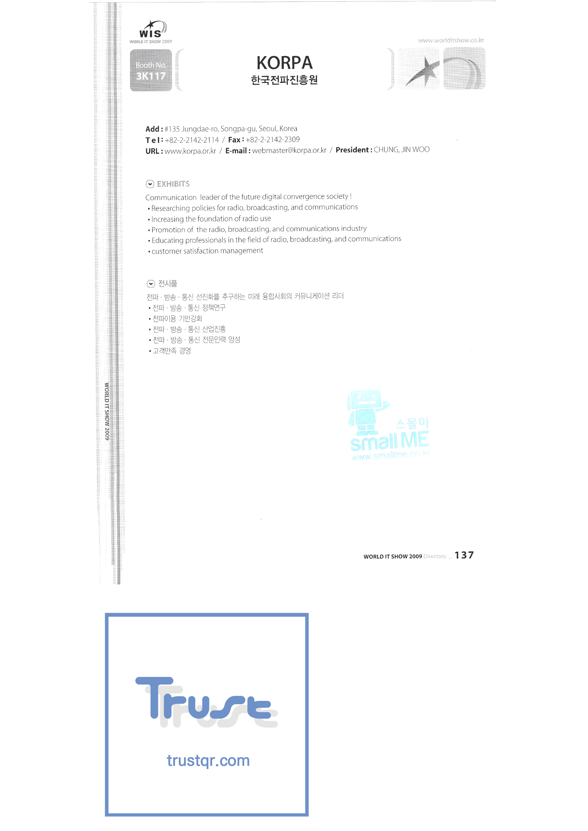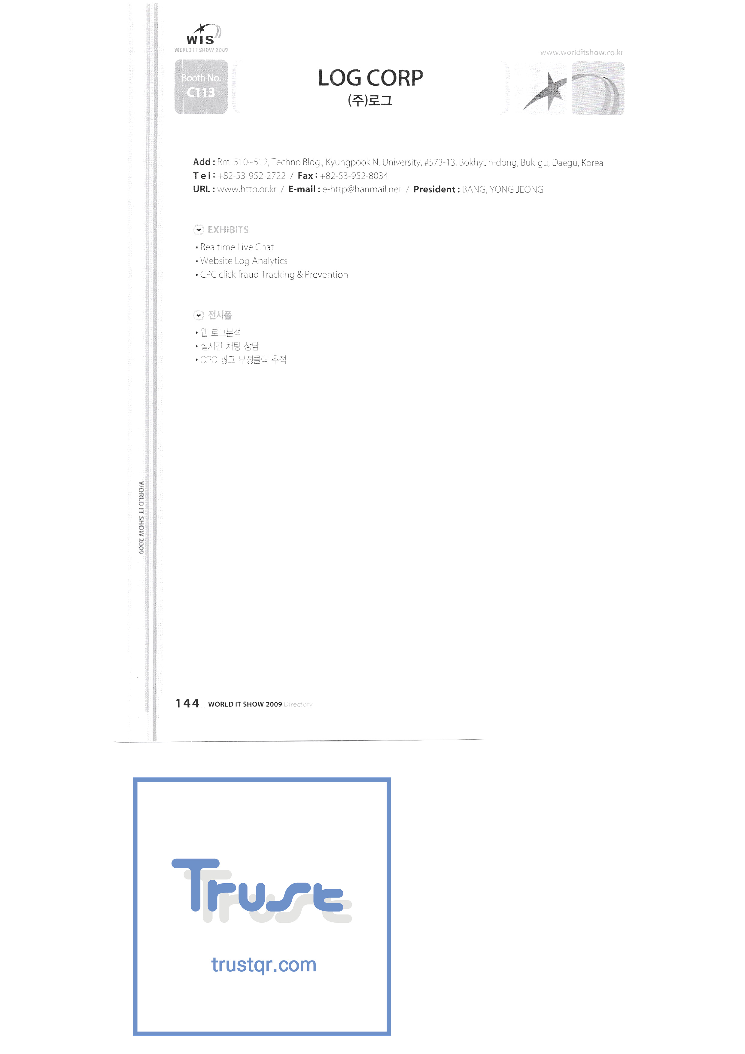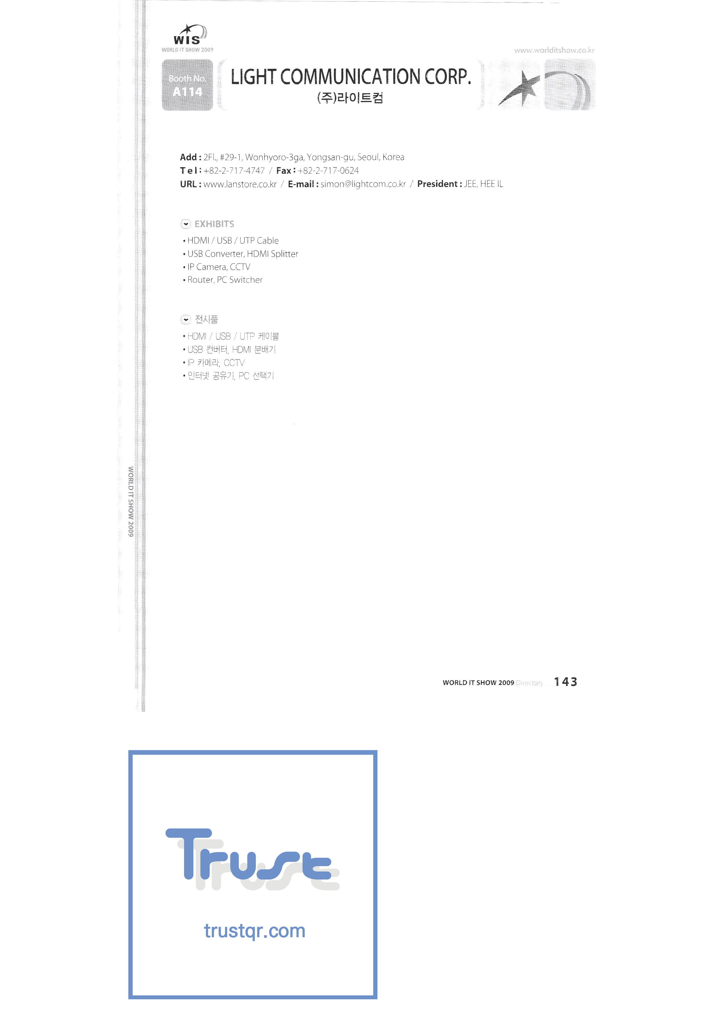 WORLD IT SHOW 2009-4 Incore Co., Ltd. Keimyung University Industry-Academic Cooperation Foundation FTB Project Group Inno Touch Technology Intellian Systems InterSave Co., Ltd. Intratech Intrikat INUS Technology Irutec ISA Tech Co., Ltd. IT Health Co., Ltd. Euncom Jo Jisung I&C JP Sun Co., Ltd. JRT Networks Co., Ltd. K2C Soft Co., Ltd. Kines Co., Ltd. KD Tech Knet Co., Ltd. Know-How Bank Co., Ltd. Kodak Korea KOT Co., Ltd. Korea Radio Promotion Agency Cotrox KT KTS Optonics Co., Ltd. LG Electronics Rivertron Co., Ltd. Lightcom Inc. Log Co., Ltd. M2Soft Co., Ltd. Mapo-gu, Seoul Maxcon Mega Searchnet Memoret World Mantech Micronware Co., Ltd. MIK21 Minsung Electronics Miyu Technology Co., Ltd. |