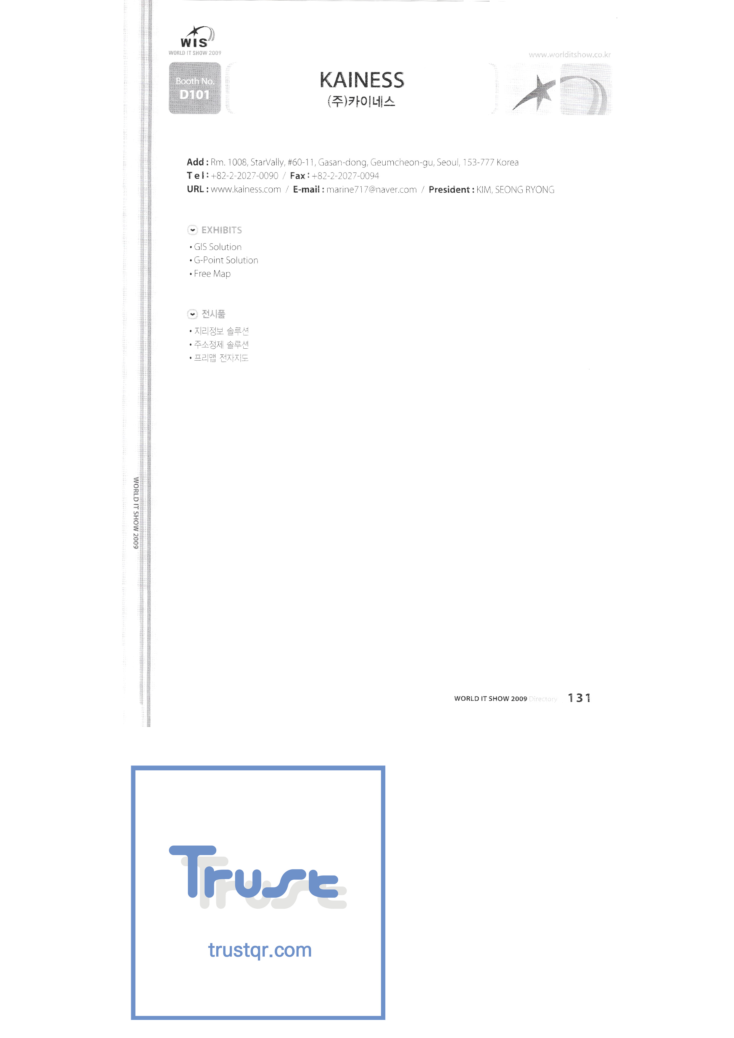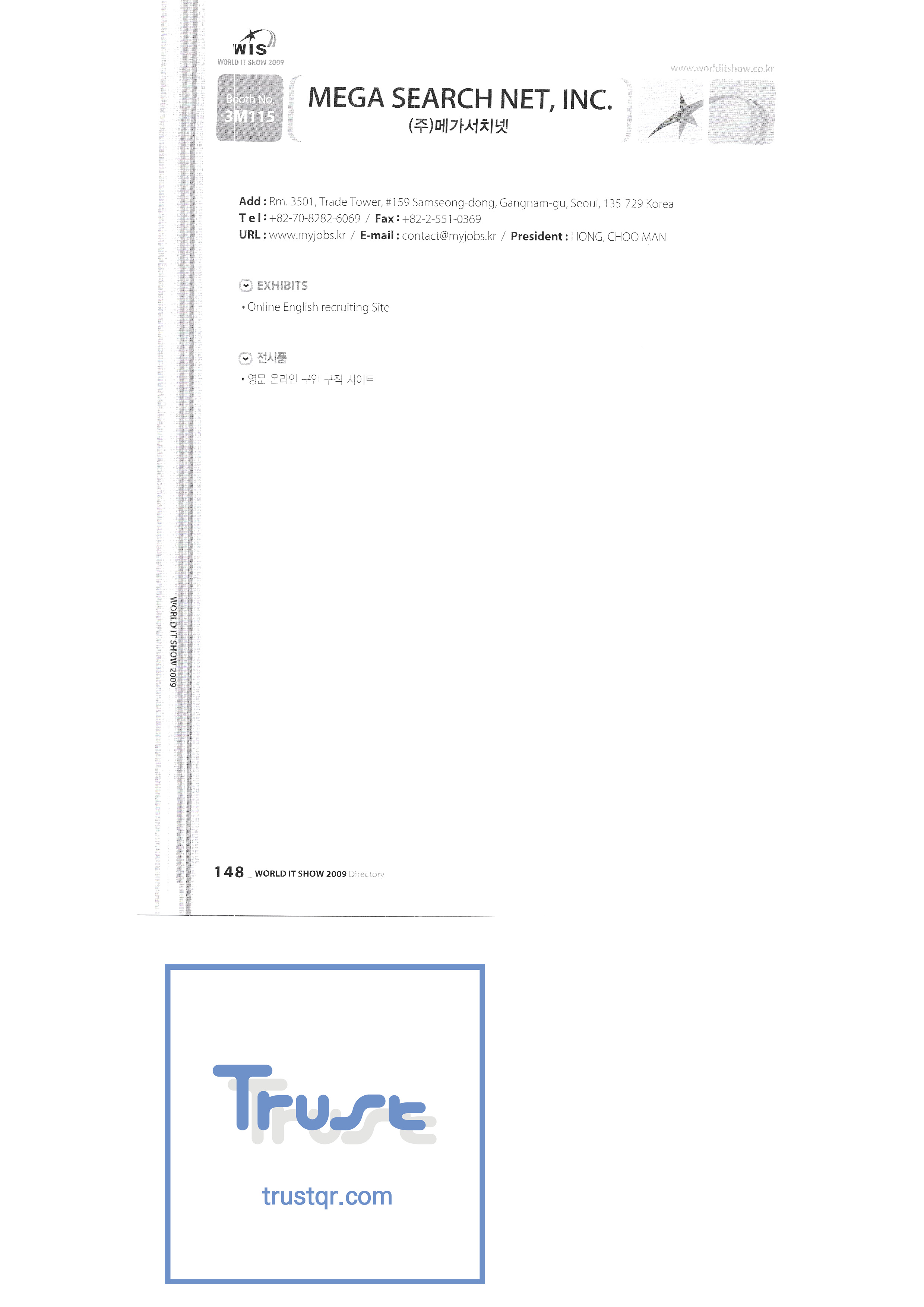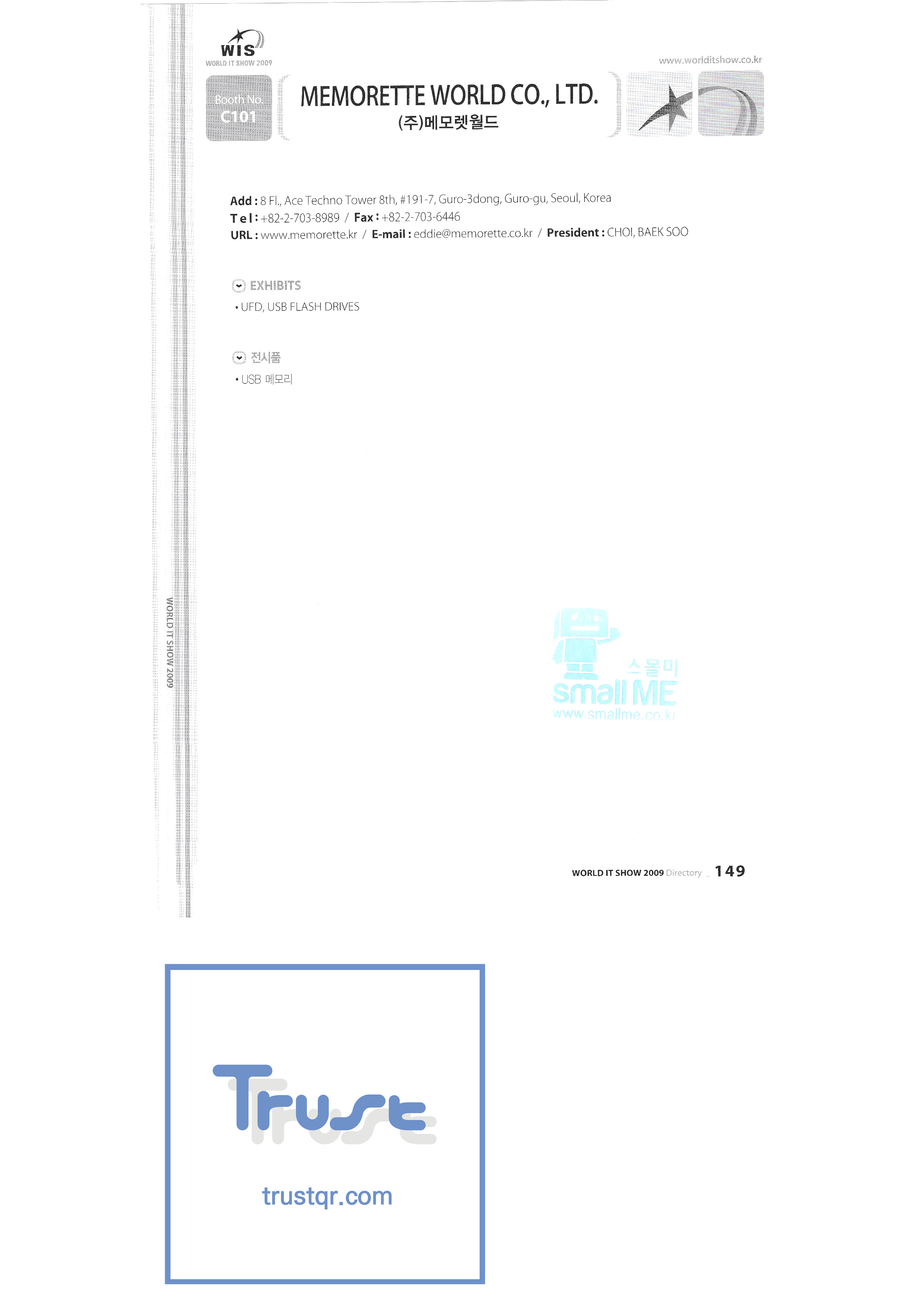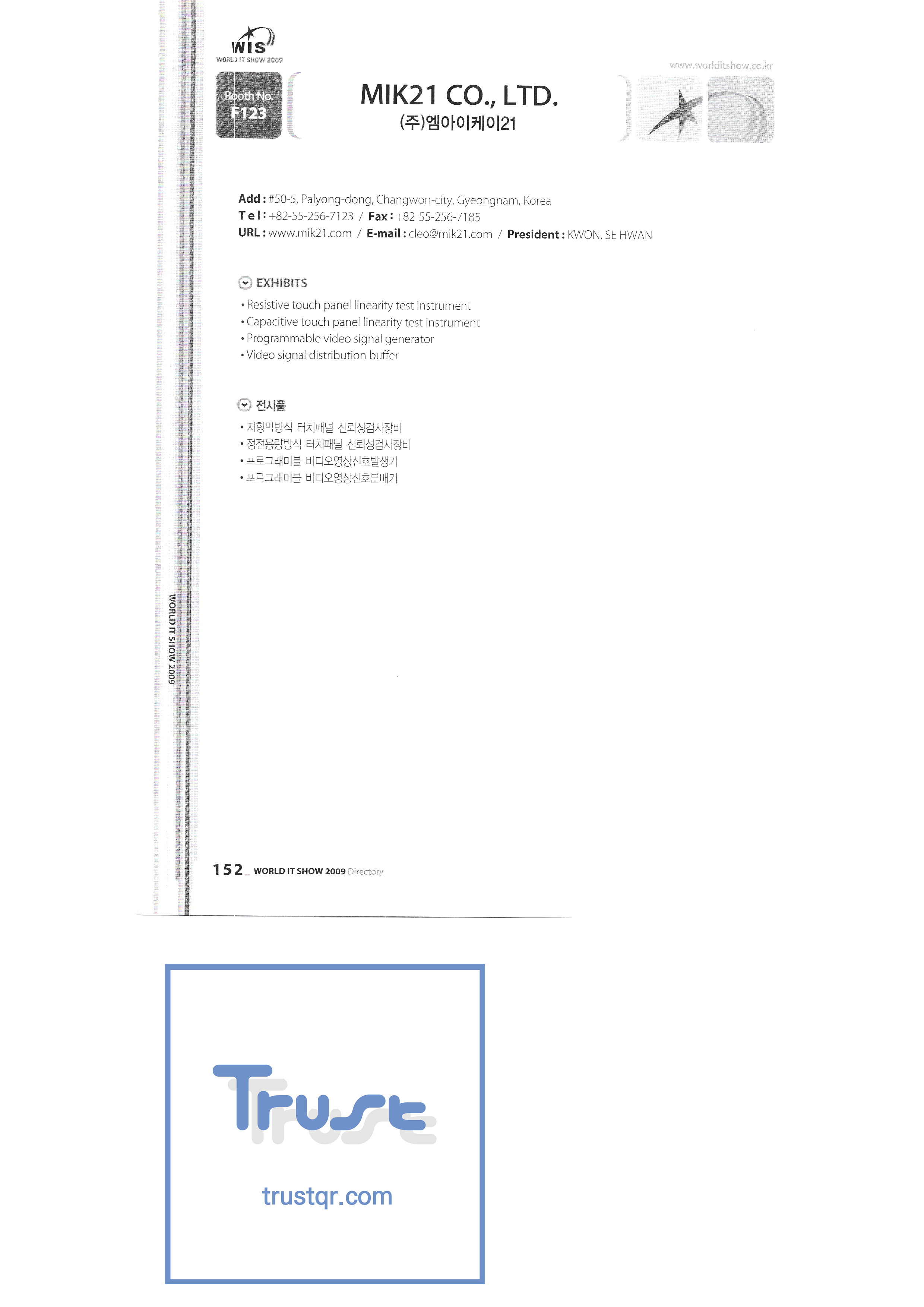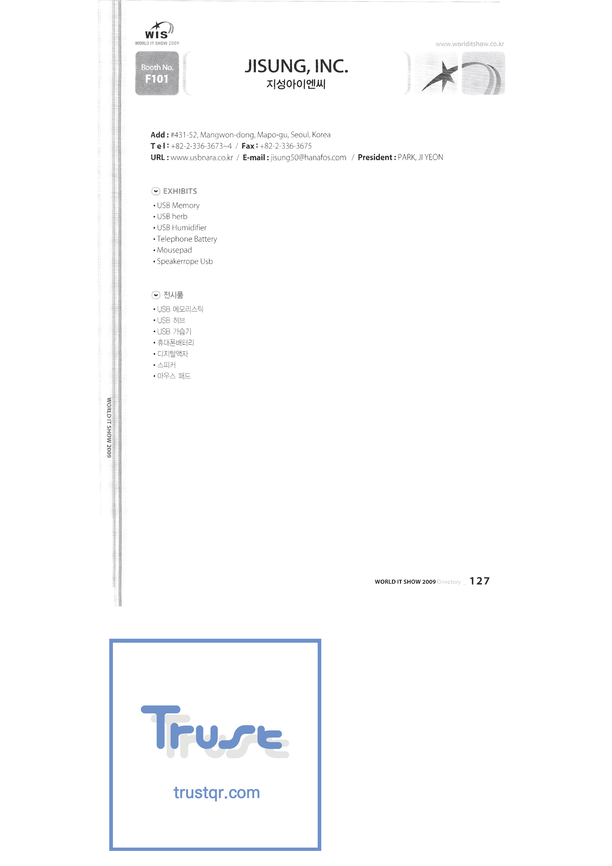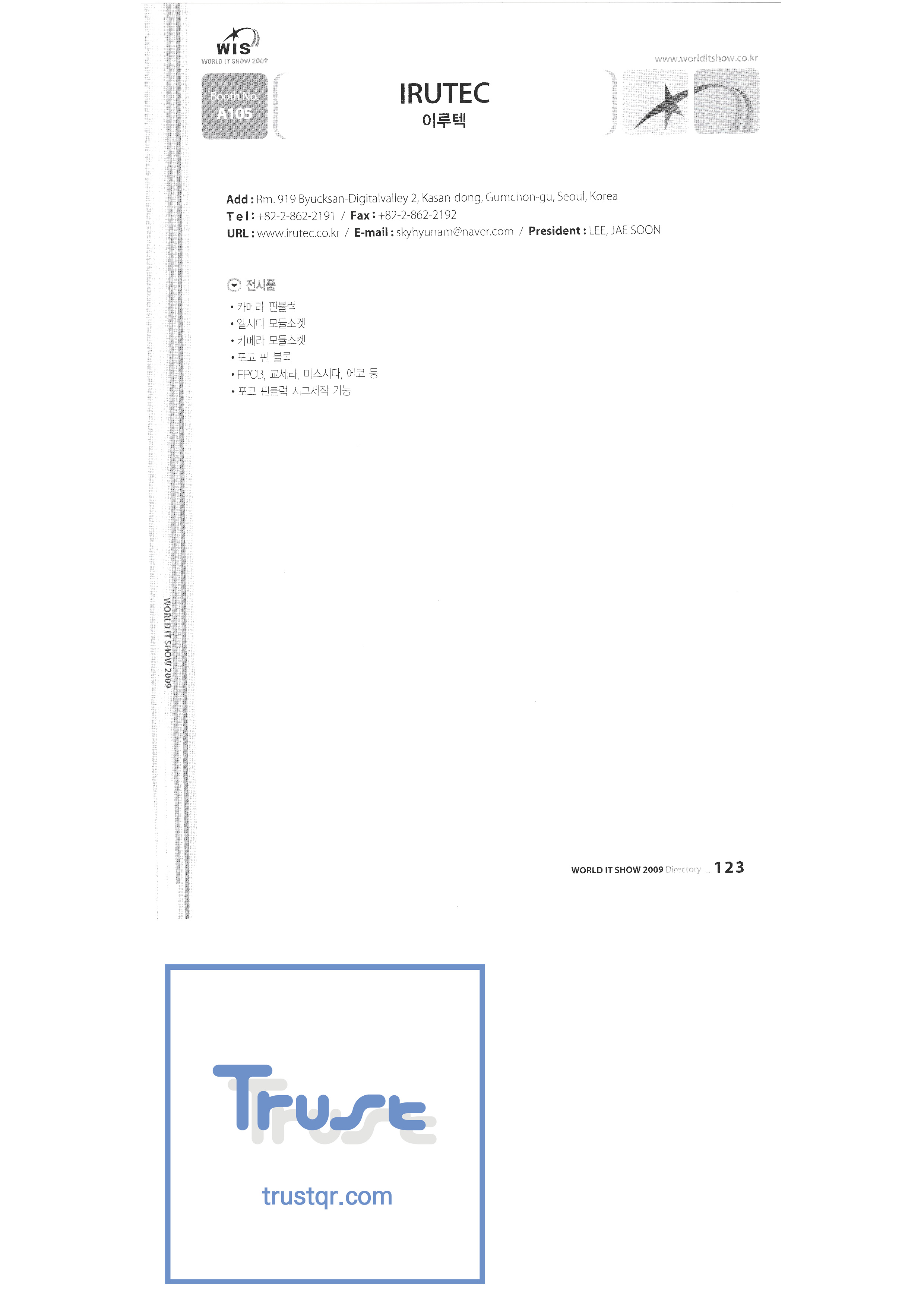 WORLD IT SHOW 2009-4 Incore Co., Ltd. Keimyung University Industry-Academic Cooperation Foundation FTB Project Group Inno Touch Technology Intellian Systems InterSave Co., Ltd. Intratech Intrikat INUS Technology Irutec ISA Tech Co., Ltd. IT Health Co., Ltd. Euncom Jo Jisung I&C JP Sun Co., Ltd. JRT Networks Co., Ltd. K2C Soft Co., Ltd. Kines Co., Ltd. KD Tech Knet Co., Ltd. Know-How Bank Co., Ltd. Kodak Korea KOT Co., Ltd. Korea Radio Promotion Agency Cotrox KT KTS Optonics Co., Ltd. LG Electronics Rivertron Co., Ltd. Lightcom Inc. Log Co., Ltd. M2Soft Co., Ltd. Mapo-gu, Seoul Maxcon Mega Searchnet Memoret World Mantech Micronware Co., Ltd. MIK21 Minsung Electronics Miyu Technology Co., Ltd. |