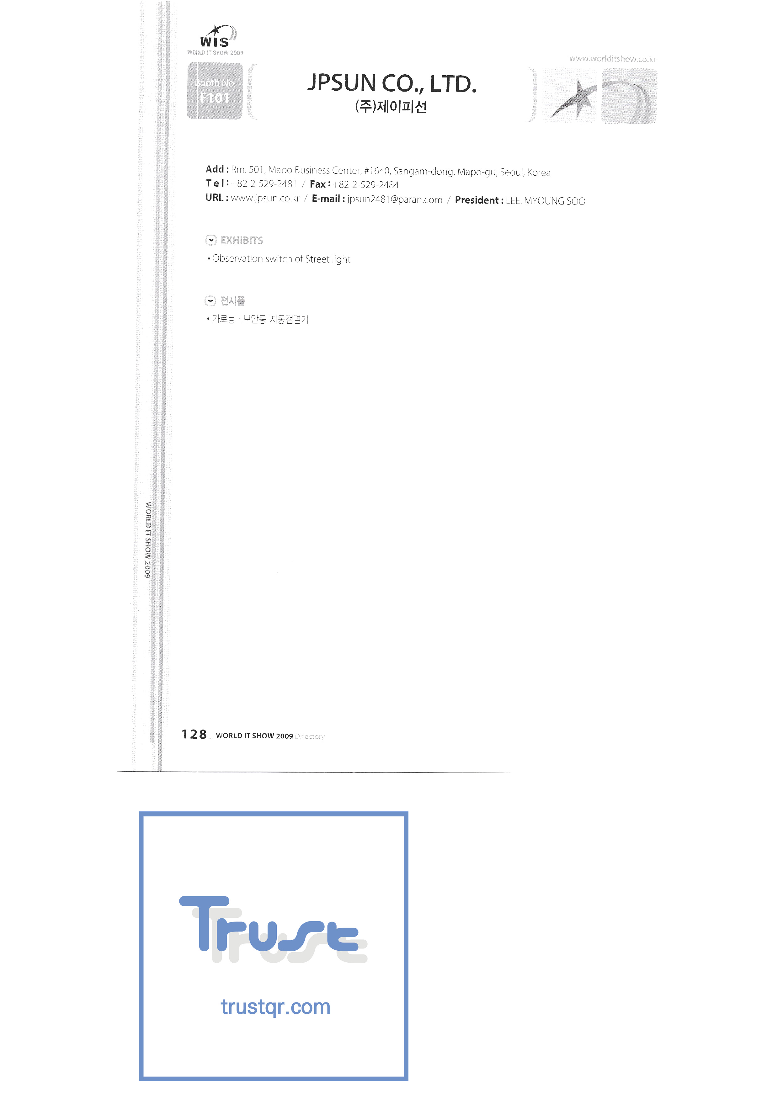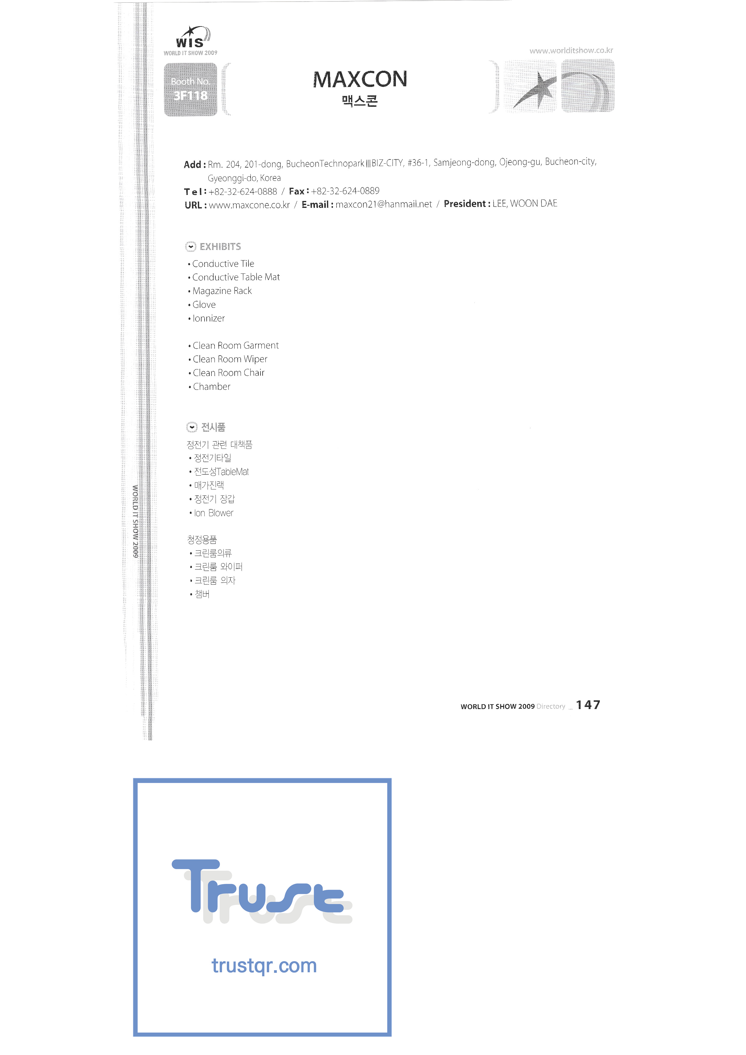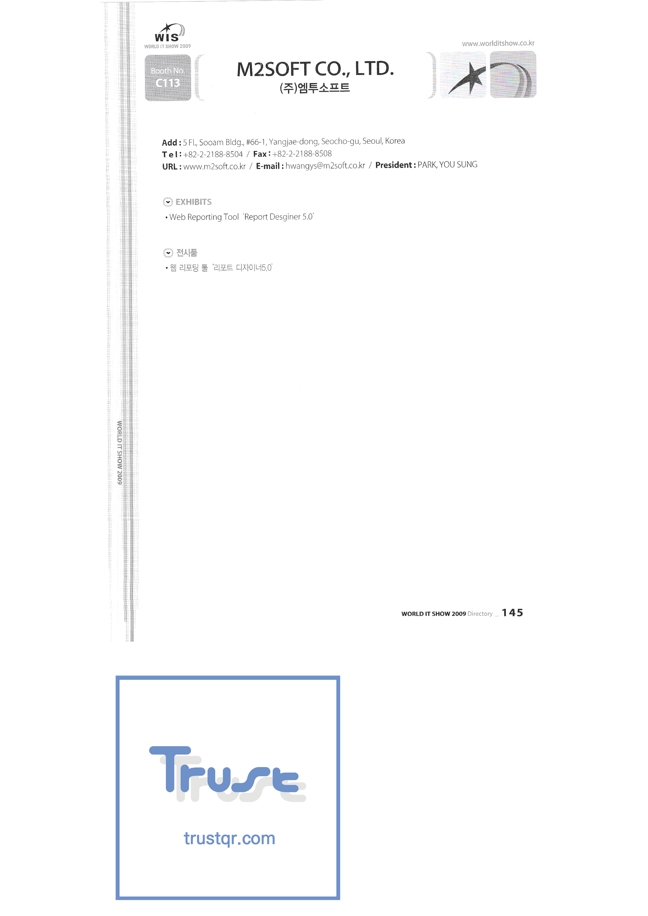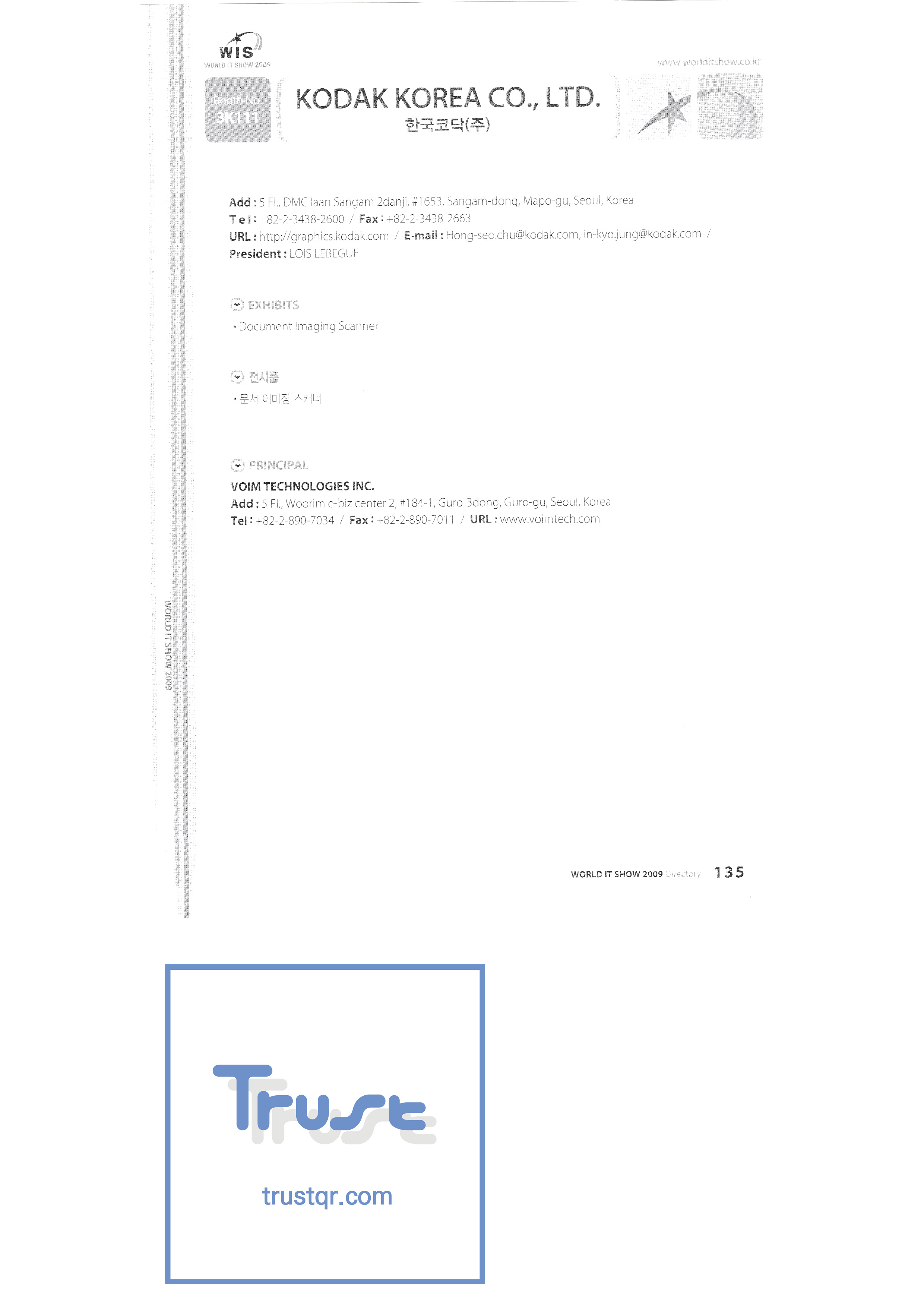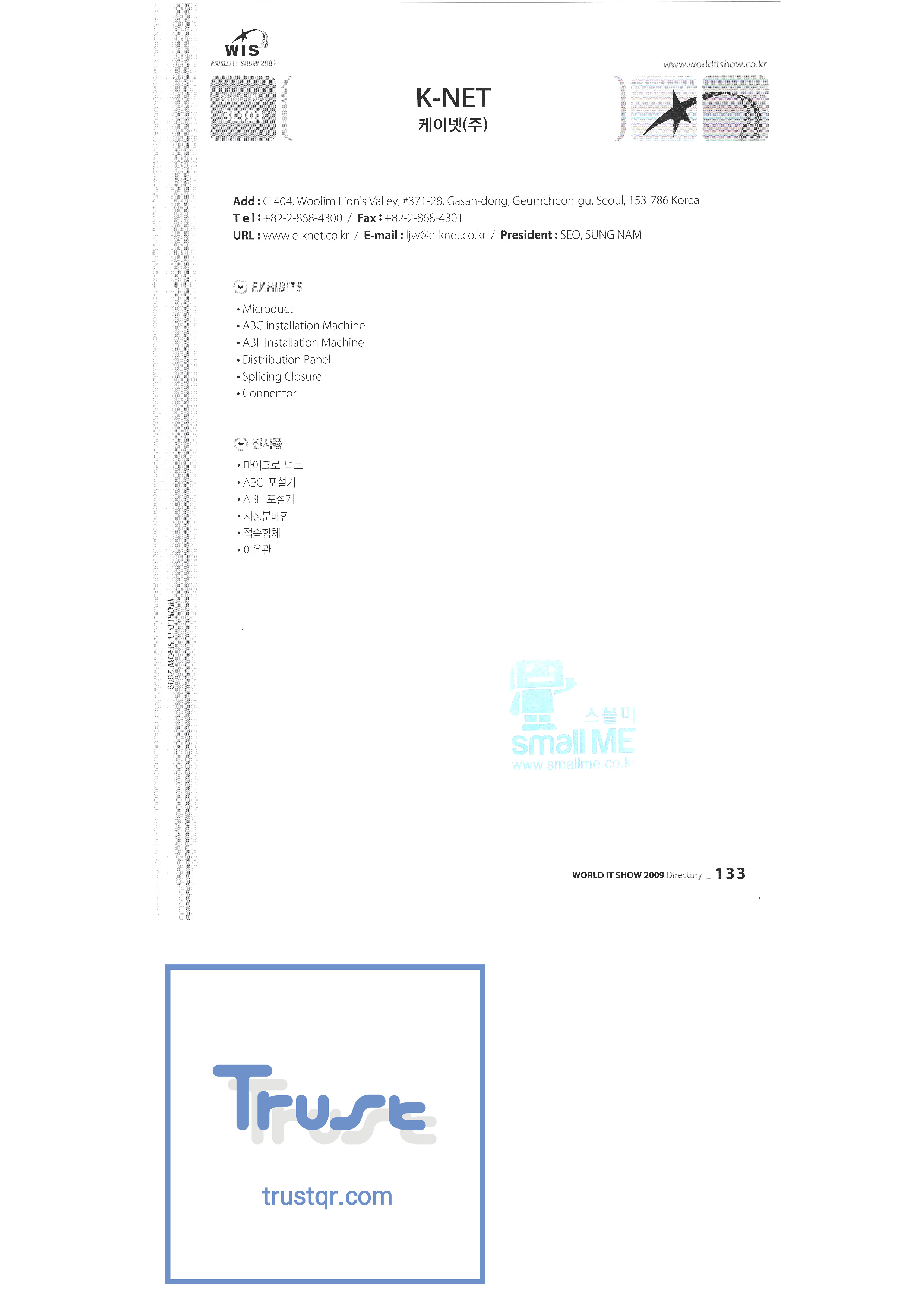 WORLD IT SHOW 2009-4 Incore Co., Ltd. Keimyung University Industry-Academic Cooperation Foundation FTB Project Group Inno Touch Technology Intellian Systems InterSave Co., Ltd. Intratech Intrikat INUS Technology Irutec ISA Tech Co., Ltd. IT Health Co., Ltd. Euncom Jo Jisung I&C JP Sun Co., Ltd. JRT Networks Co., Ltd. K2C Soft Co., Ltd. Kines Co., Ltd. KD Tech Knet Co., Ltd. Know-How Bank Co., Ltd. Kodak Korea KOT Co., Ltd. Korea Radio Promotion Agency Cotrox KT KTS Optonics Co., Ltd. LG Electronics Rivertron Co., Ltd. Lightcom Inc. Log Co., Ltd. M2Soft Co., Ltd. Mapo-gu, Seoul Maxcon Mega Searchnet Memoret World Mantech Micronware Co., Ltd. MIK21 Minsung Electronics Miyu Technology Co., Ltd. |