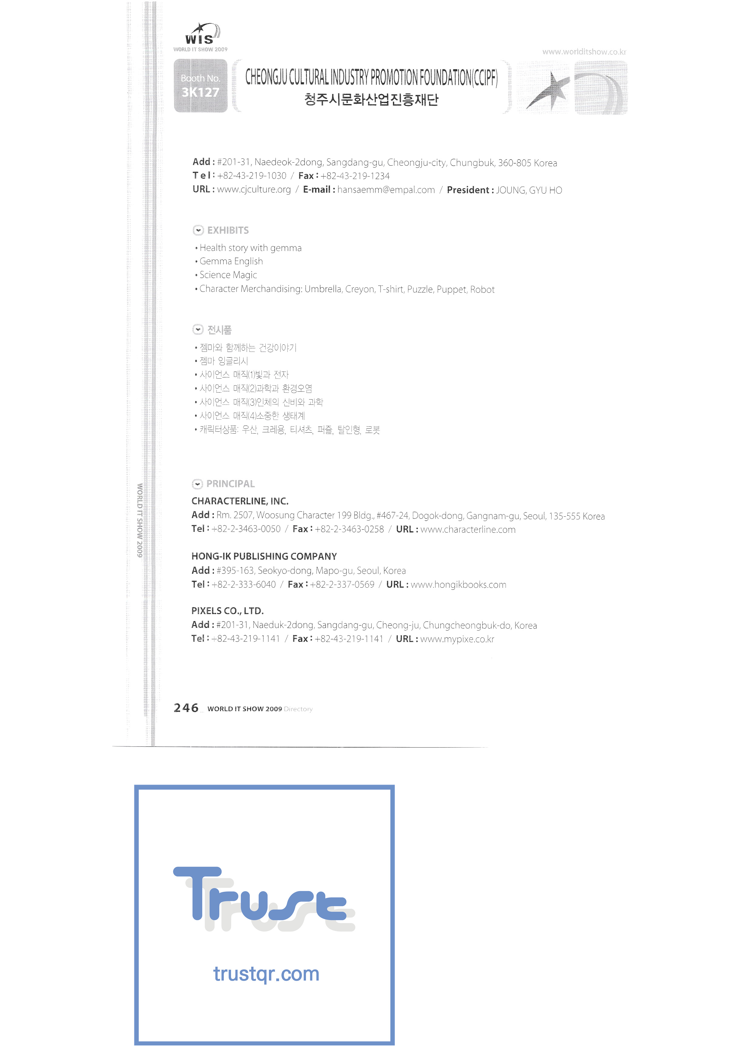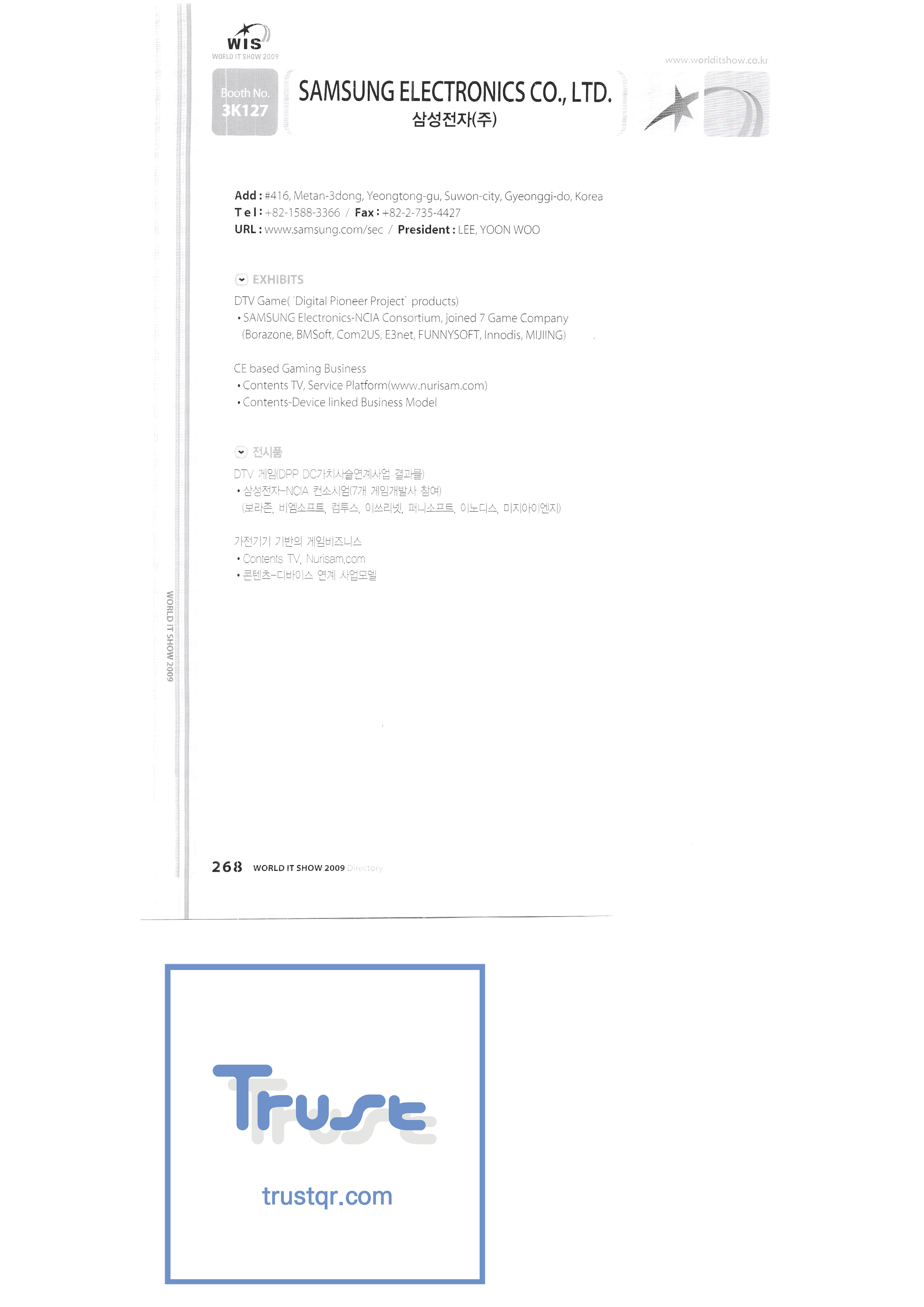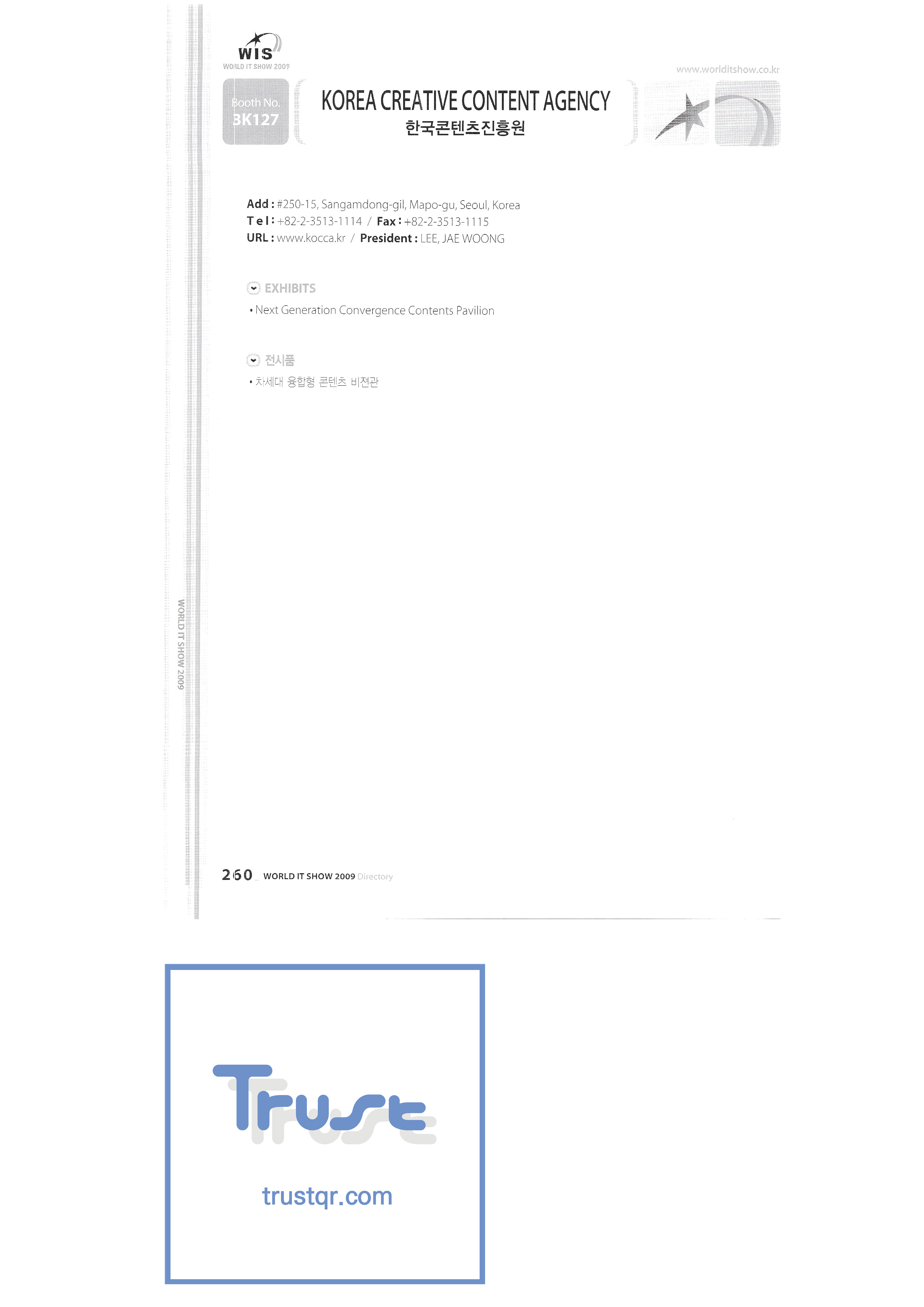 WORLD IT SHOW 2009-7 Wisjang Joint Patent Law Firm YHB Yookyung Youhost Co., Ltd. Yujin Robot Co., Ltd. Zaall Soft Co., Ltd. XicoAD Co., Ltd. Asadal Co., Ltd. Big I Entertainment Co., Ltd. Cheongju Cultural Industry Promotion Foundation Chungnam Cultural Industry Promotion Agency Cross Film Co., Ltd. Digital Oasis Co., Ltd. Ethreenet Co., Ltd. Edu Shipbuilding Electronics and Telecommunications Research Institute Pantalog Interactive Co., Ltd. Gangwon Information and Culture Promotion Agency Golf Zone Co., Ltd. Gravity Co., Ltd. Hansol DK Korea Contents Industry Association Nak Media Co., Ltd. Korea Creative Content Agency Korea Virtual Realization Co., Ltd. LG CNS Metacon Modern Nsis NAPO Next Generation Convergence Contents Industry Association Nexeasy Samsung Electronics |