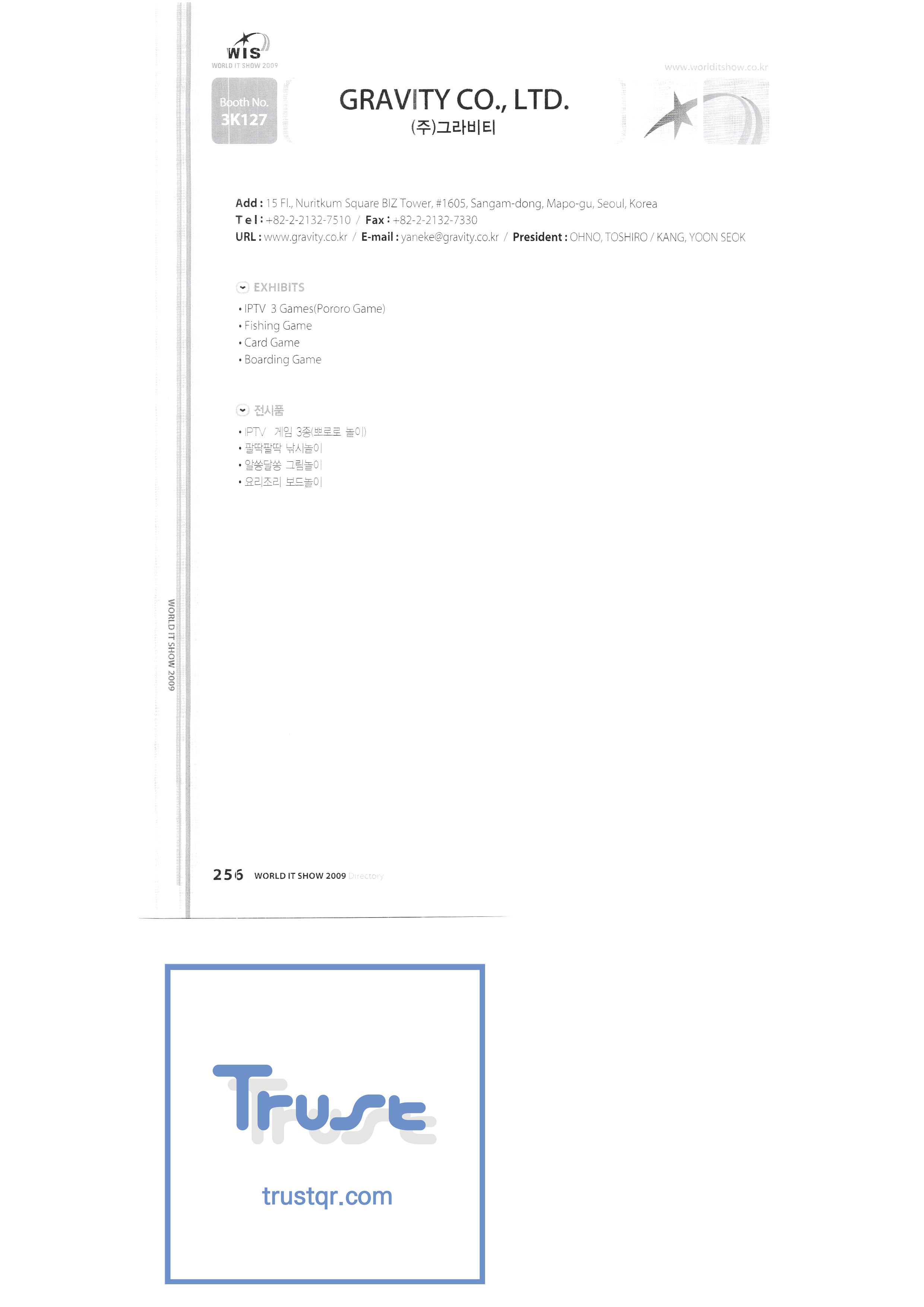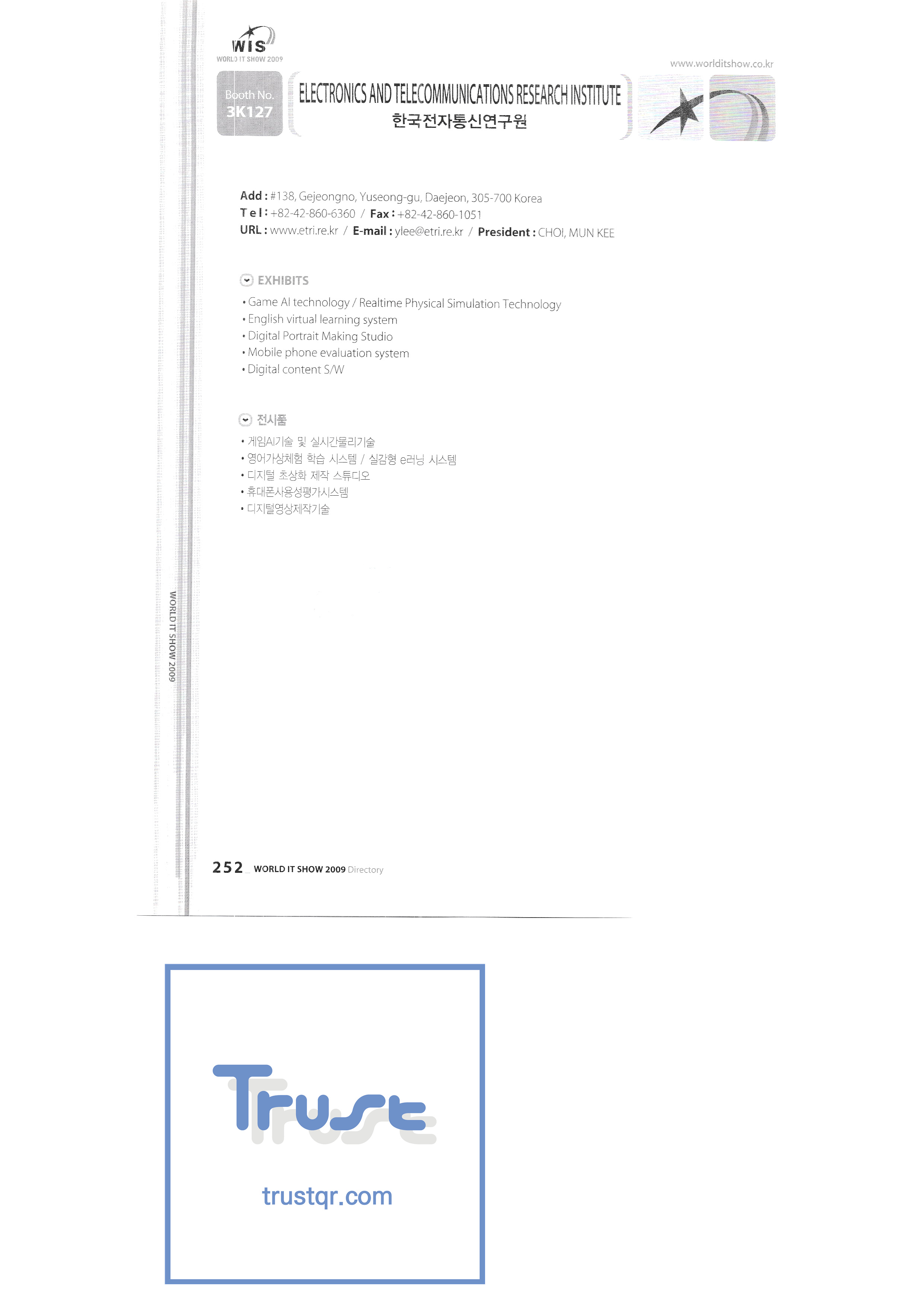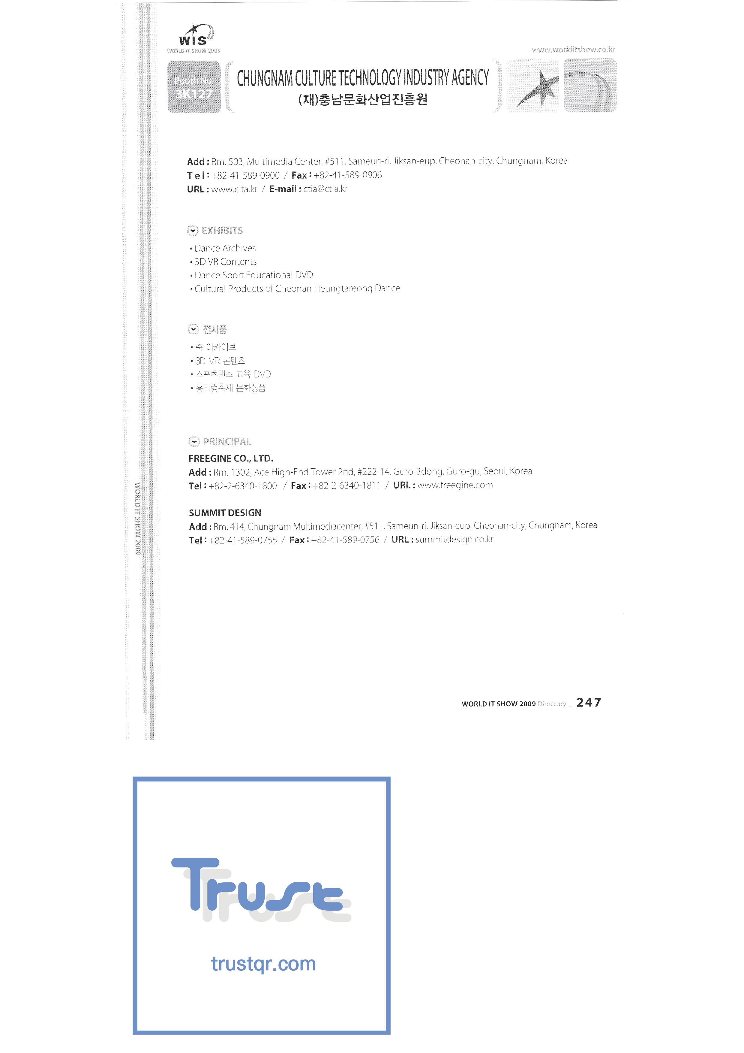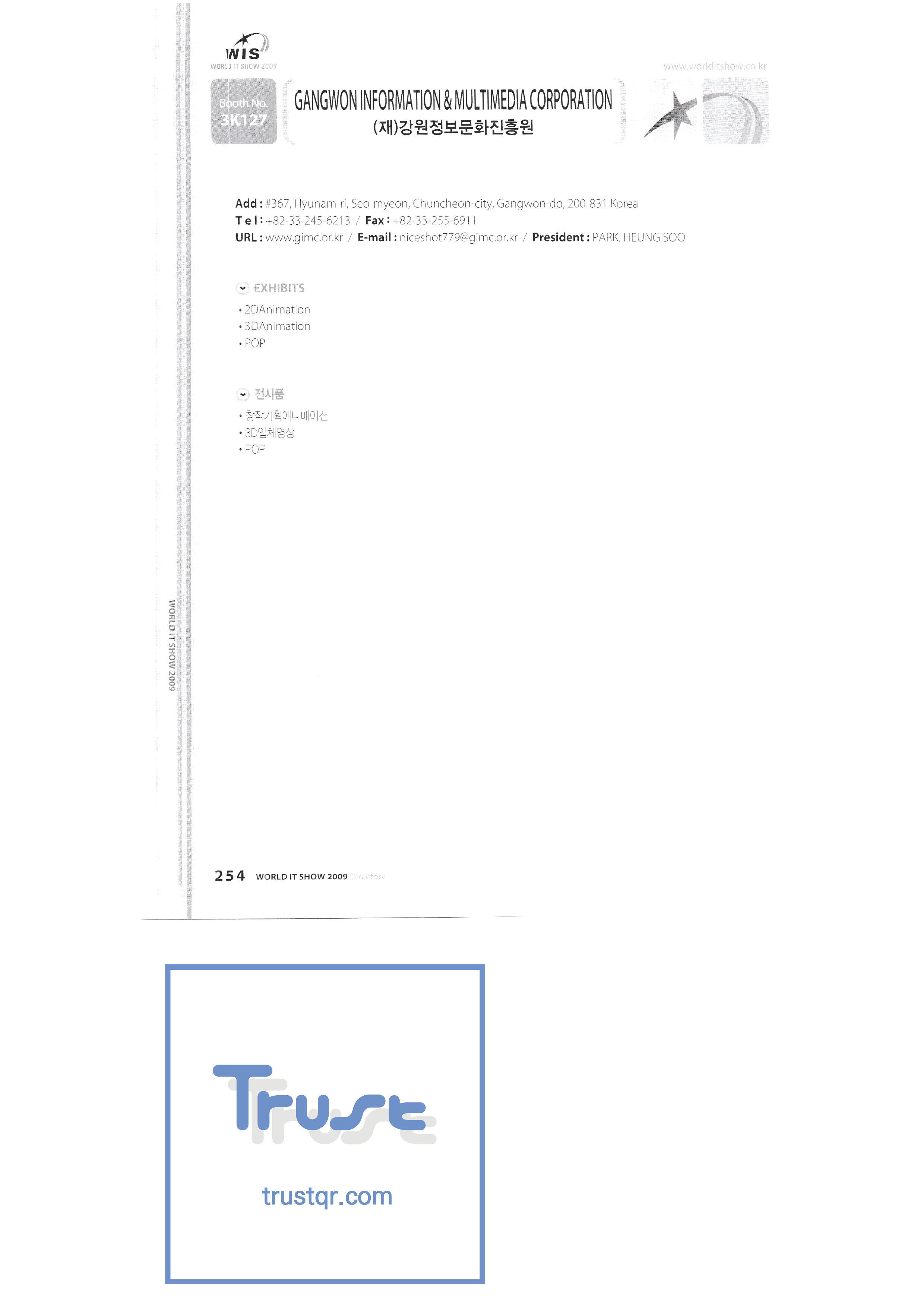 | WORLD IT SHOW 2009-7 Wisjang บริษัท กฎหมายสิทธิบัตรร่วม YHB ยูคยอง ยูโฮสต์บจก. Yujin Robot Co. , Ltd. Zaall Soft Co. , Ltd. XicoAD Co. , Ltd. บจก. อัษฎาล บจก. บิ๊กไอเอ็นเตอร์เทนเม้นท์ มูลนิธิส่งเสริมอุตสาหกรรมวัฒนธรรมชองจู สำนักงานส่งเสริมอุตสาหกรรมวัฒนธรรมชุงนาม บจก. ครอสฟิล์ม บจก. ดิจิตอลโอเอซิส เอ ธ กรีเนตบจก. การต่อเรือ Edu สถาบันวิจัยอิเล็กทรอนิกส์และโทรคมนาคม บริษัท แพนตาล็อกอินเตอร์แอคทีฟ จำกัด สำนักงานส่งเสริมข้อมูลและวัฒนธรรมกังวอน กอล์ฟโซนบจก. กราวิตี้บจก. ฮันซอลดีเค Korea Contents Industry Association บจก. นาคมีเดีย Korea Creative Content Agency Korea Virtual Realization Co. , Ltd. LG CNS Metacon Nsis สมัยใหม่ สพป Next Generation Convergence Contents Industry Association Nexeasy Samsung Electronics |