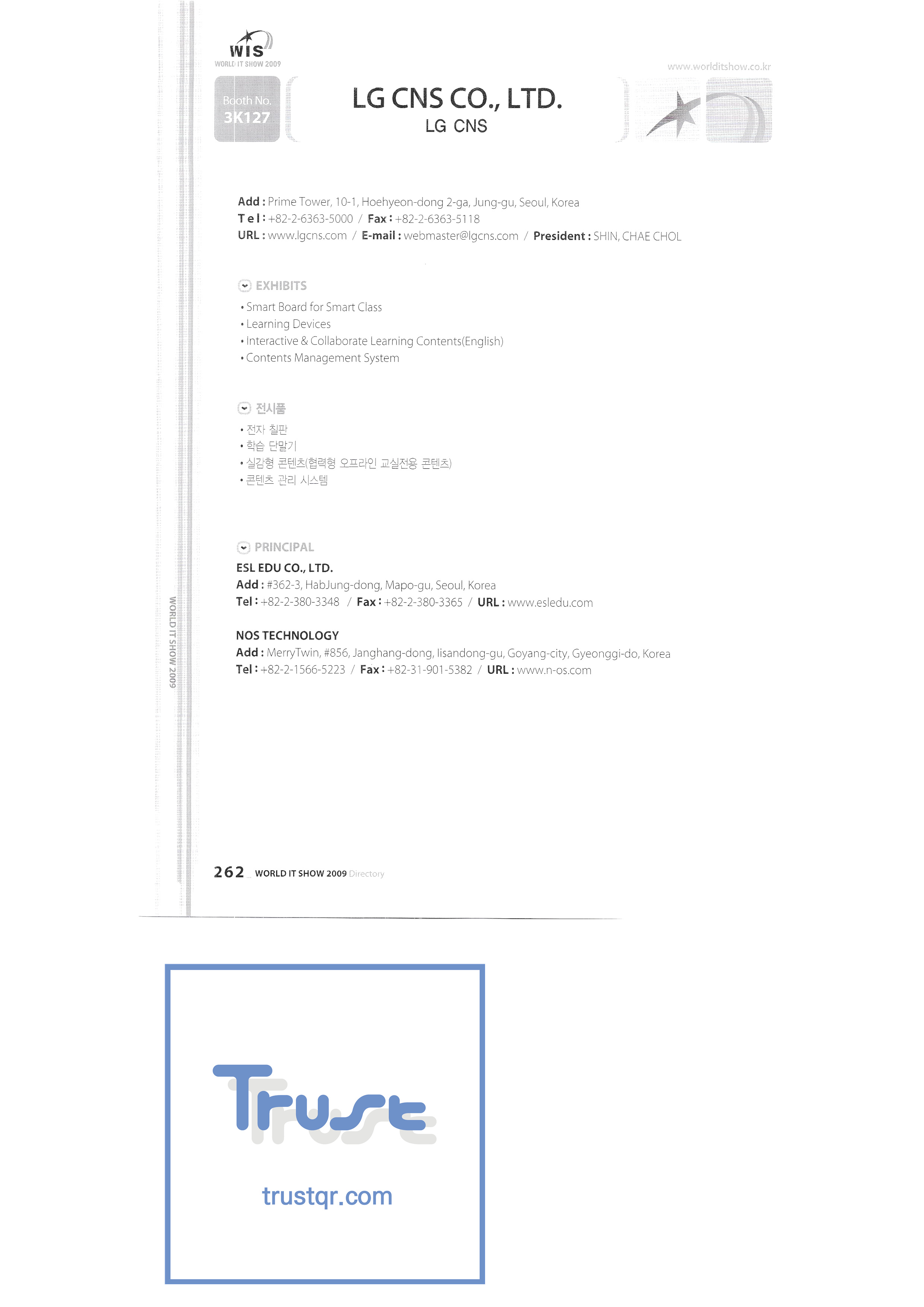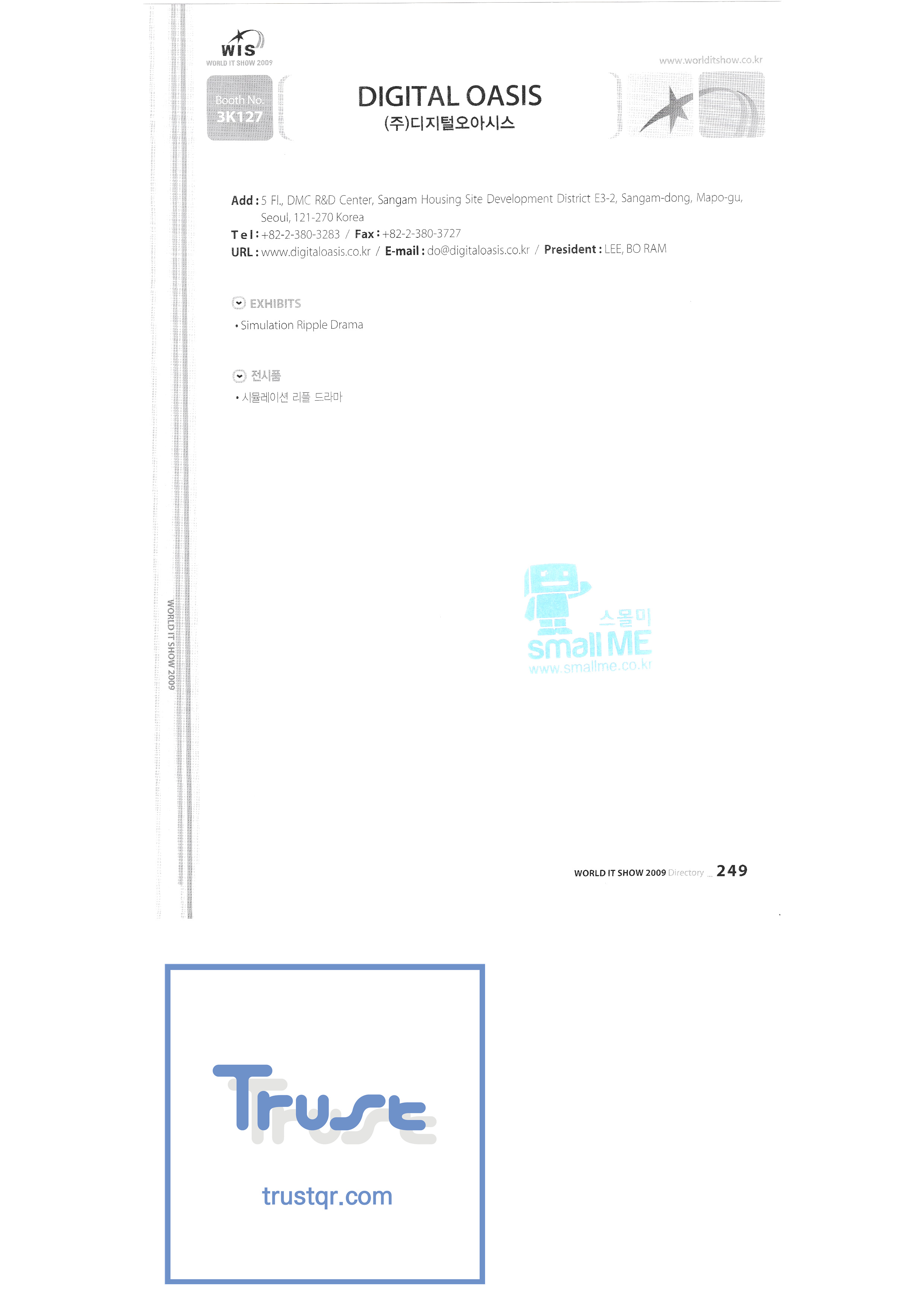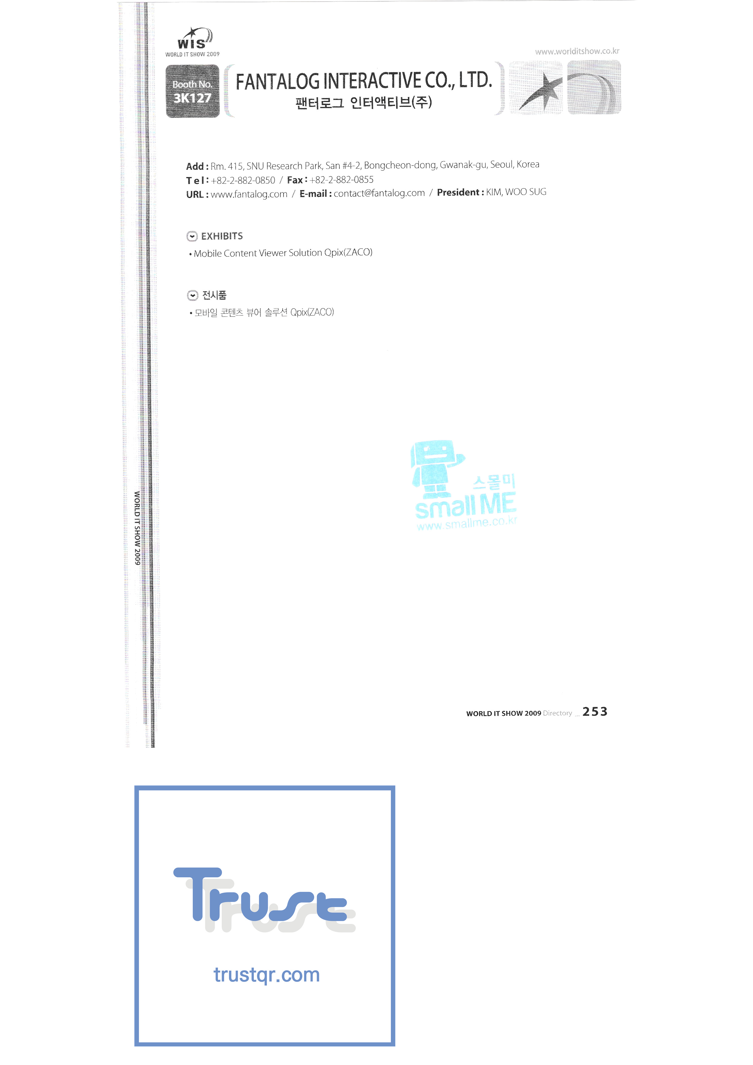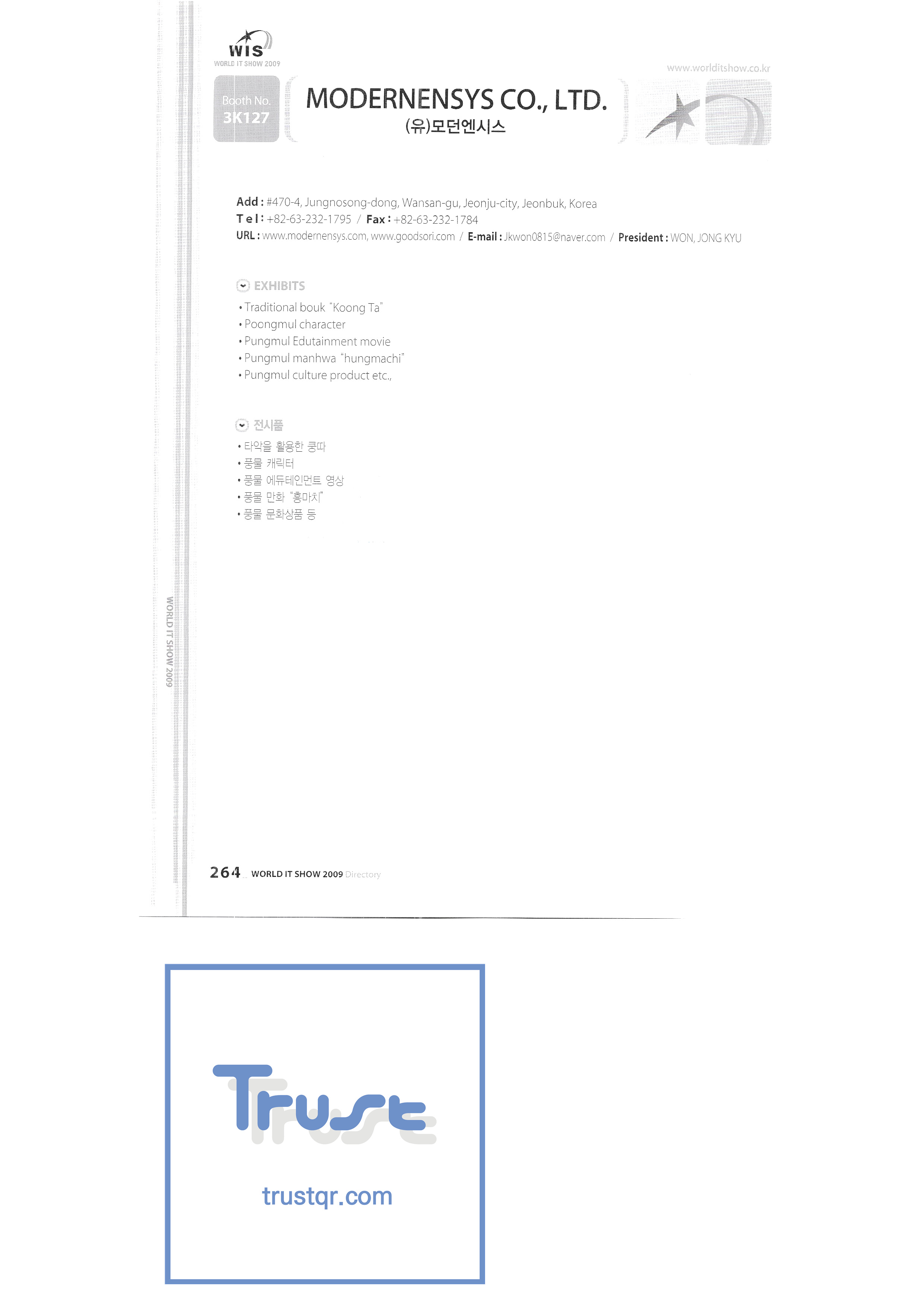 | WORLD IT SHOW 2009-7 Wisjang บริษัท กฎหมายสิทธิบัตรร่วม YHB ยูคยอง ยูโฮสต์บจก. Yujin Robot Co. , Ltd. Zaall Soft Co. , Ltd. XicoAD Co. , Ltd. บจก. อัษฎาล บจก. บิ๊กไอเอ็นเตอร์เทนเม้นท์ มูลนิธิส่งเสริมอุตสาหกรรมวัฒนธรรมชองจู สำนักงานส่งเสริมอุตสาหกรรมวัฒนธรรมชุงนาม บจก. ครอสฟิล์ม บจก. ดิจิตอลโอเอซิส เอ ธ กรีเนตบจก. การต่อเรือ Edu สถาบันวิจัยอิเล็กทรอนิกส์และโทรคมนาคม บริษัท แพนตาล็อกอินเตอร์แอคทีฟ จำกัด สำนักงานส่งเสริมข้อมูลและวัฒนธรรมกังวอน กอล์ฟโซนบจก. กราวิตี้บจก. ฮันซอลดีเค Korea Contents Industry Association บจก. นาคมีเดีย Korea Creative Content Agency Korea Virtual Realization Co. , Ltd. LG CNS Metacon Nsis สมัยใหม่ สพป Next Generation Convergence Contents Industry Association Nexeasy Samsung Electronics |