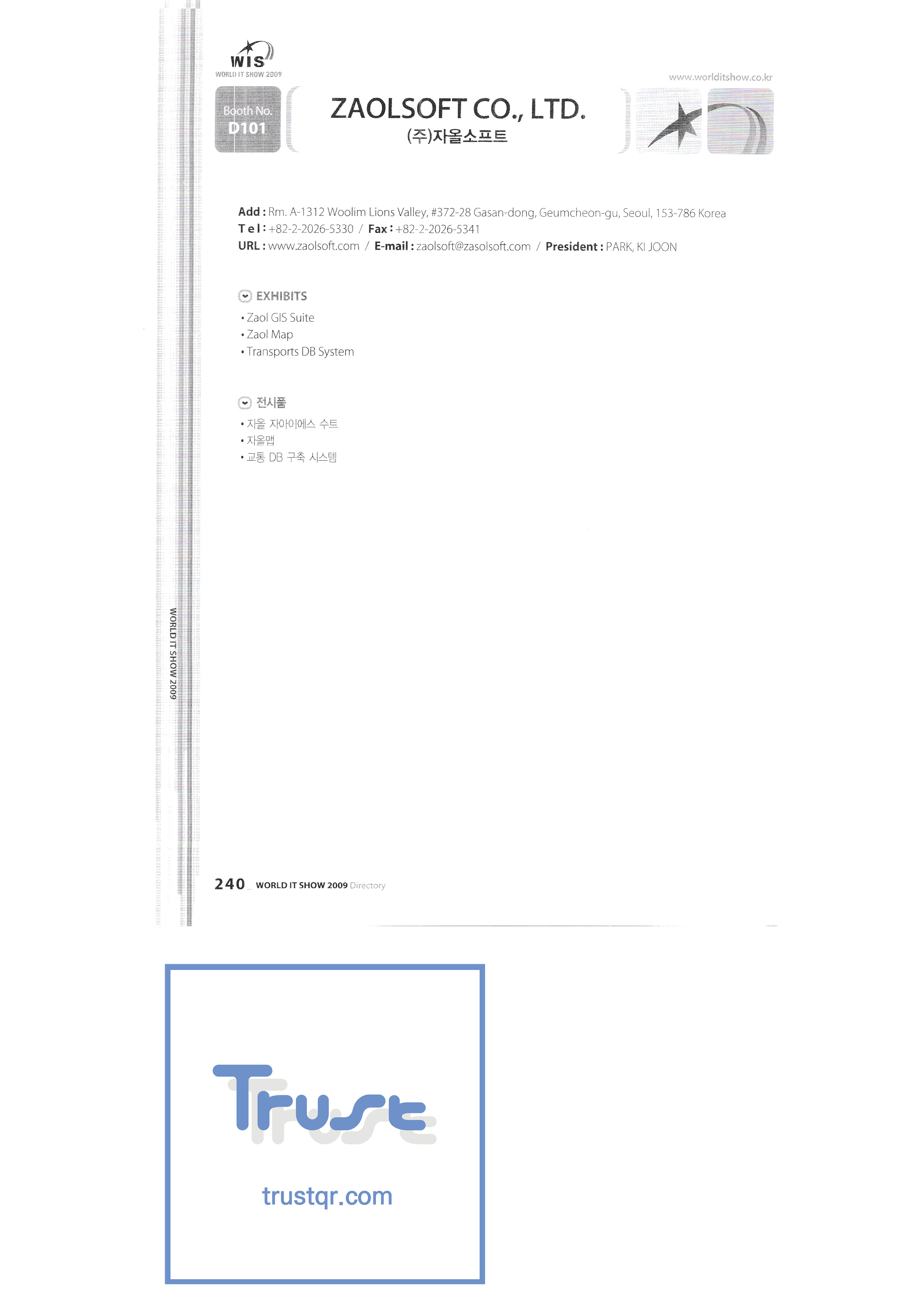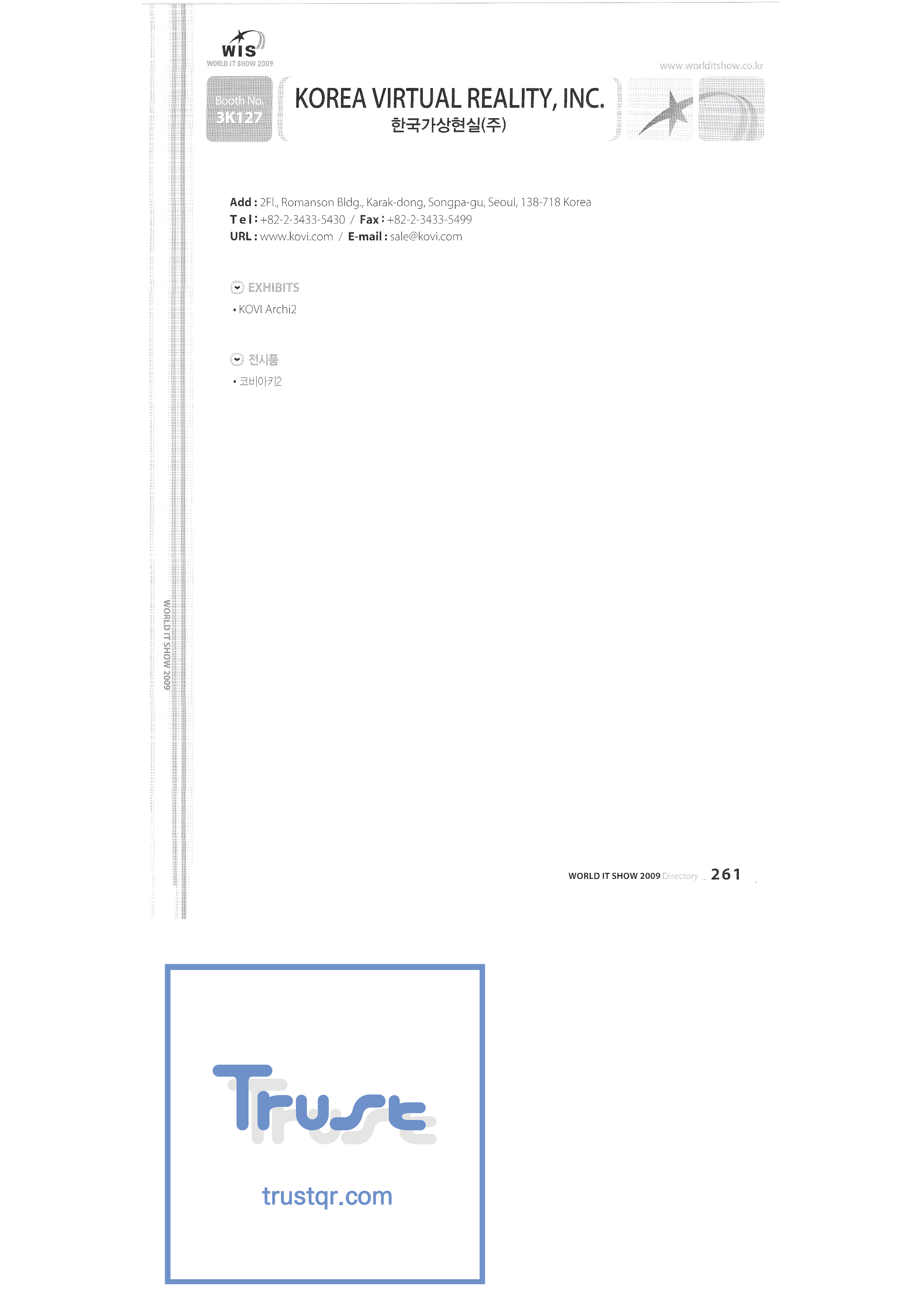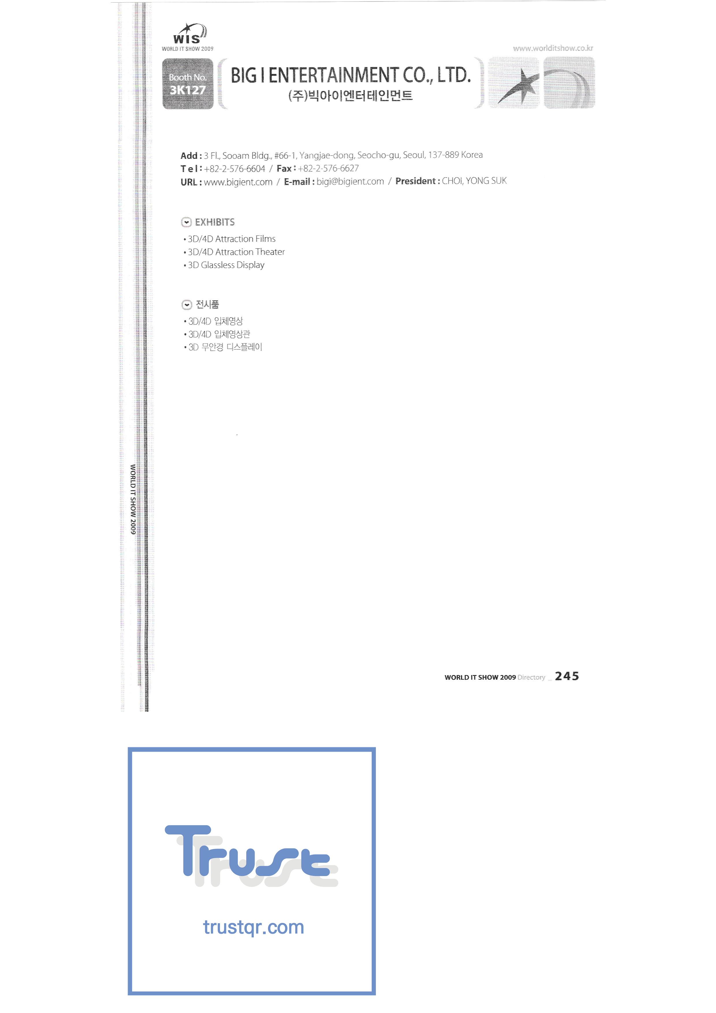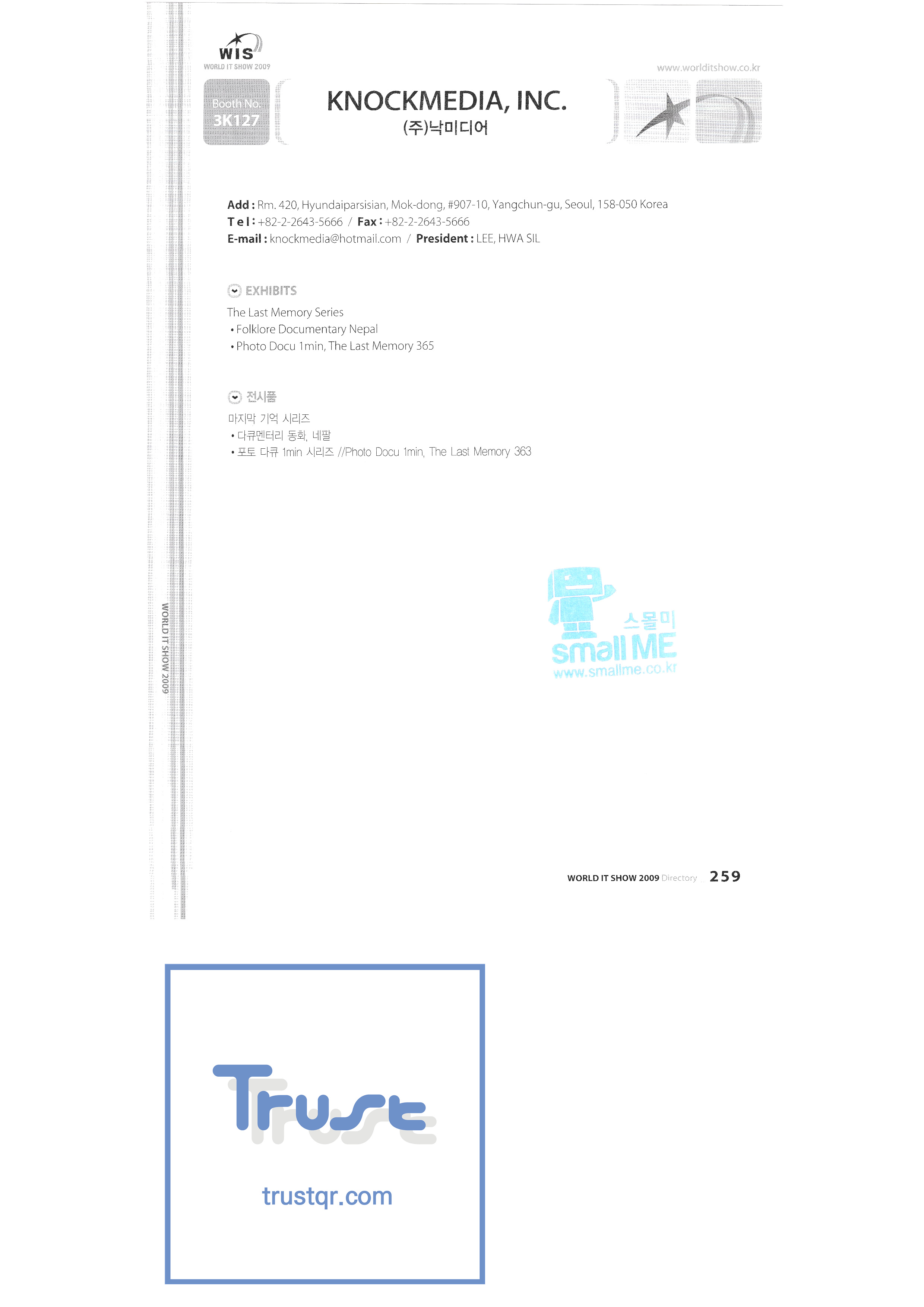 | WORLD IT SHOW 2009-7 Wisjang บริษัท กฎหมายสิทธิบัตรร่วม YHB ยูคยอง ยูโฮสต์บจก. Yujin Robot Co. , Ltd. Zaall Soft Co. , Ltd. XicoAD Co. , Ltd. บจก. อัษฎาล บจก. บิ๊กไอเอ็นเตอร์เทนเม้นท์ มูลนิธิส่งเสริมอุตสาหกรรมวัฒนธรรมชองจู สำนักงานส่งเสริมอุตสาหกรรมวัฒนธรรมชุงนาม บจก. ครอสฟิล์ม บจก. ดิจิตอลโอเอซิส เอ ธ กรีเนตบจก. การต่อเรือ Edu สถาบันวิจัยอิเล็กทรอนิกส์และโทรคมนาคม บริษัท แพนตาล็อกอินเตอร์แอคทีฟ จำกัด สำนักงานส่งเสริมข้อมูลและวัฒนธรรมกังวอน กอล์ฟโซนบจก. กราวิตี้บจก. ฮันซอลดีเค Korea Contents Industry Association บจก. นาคมีเดีย Korea Creative Content Agency Korea Virtual Realization Co. , Ltd. LG CNS Metacon Nsis สมัยใหม่ สพป Next Generation Convergence Contents Industry Association Nexeasy Samsung Electronics |