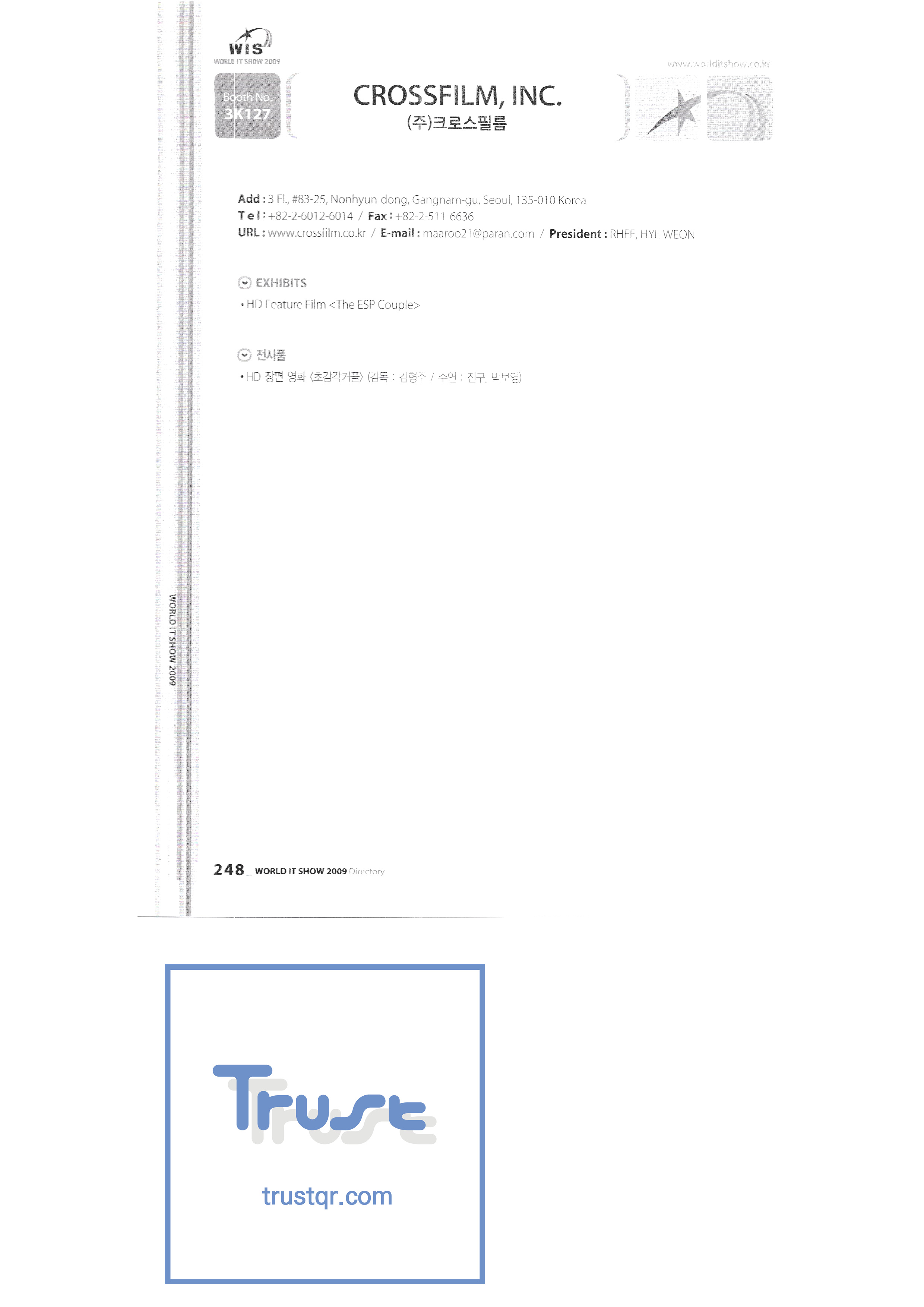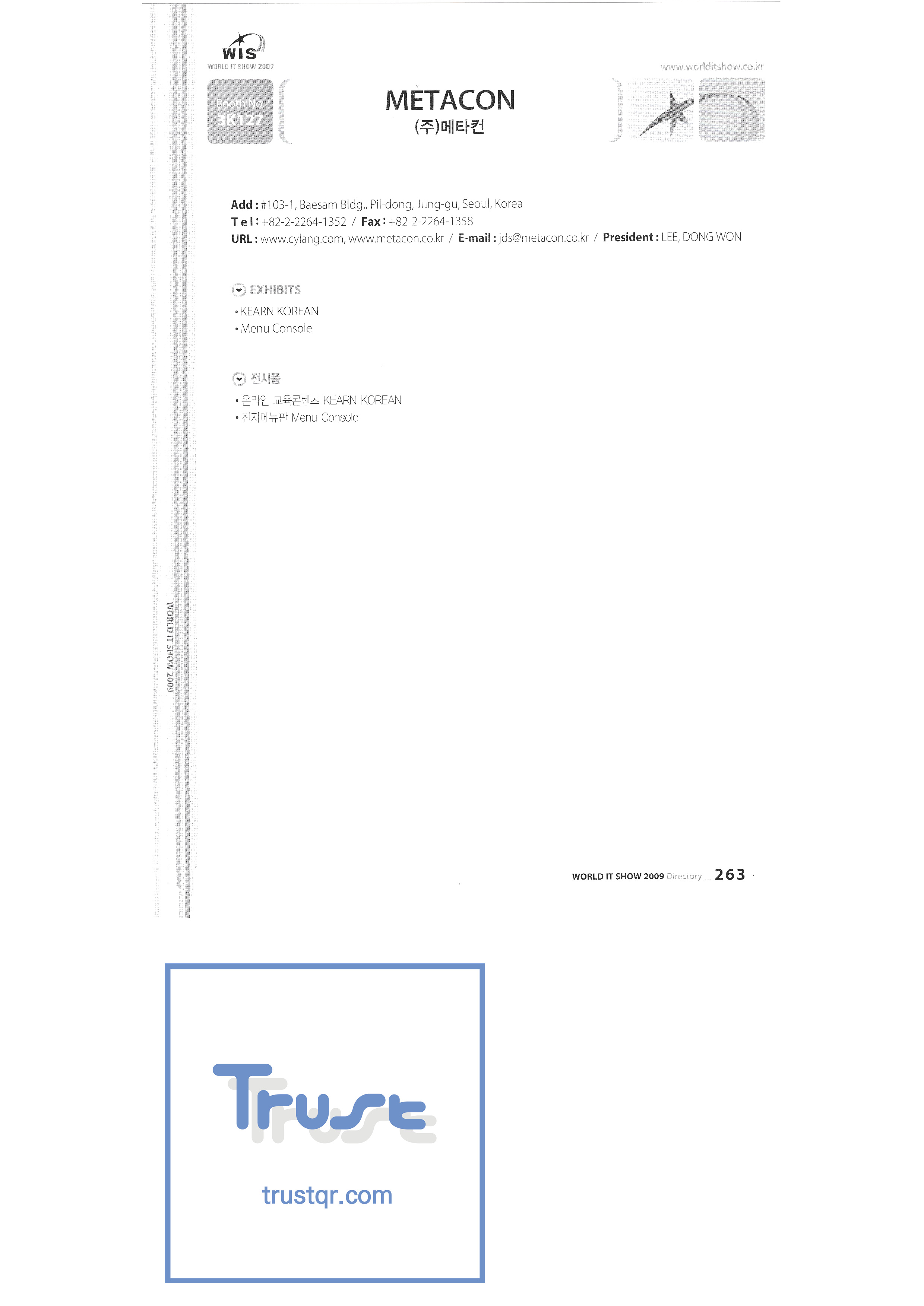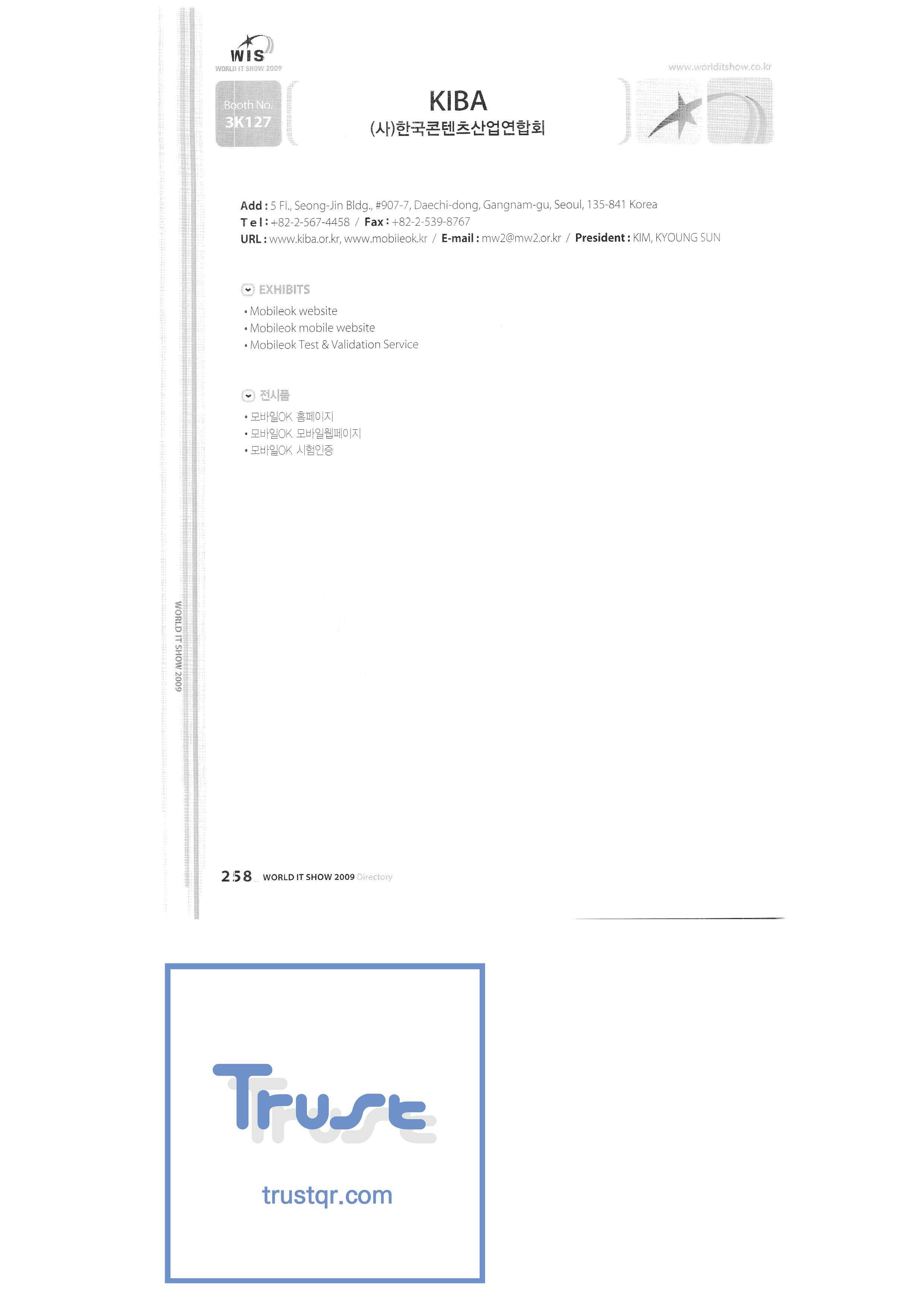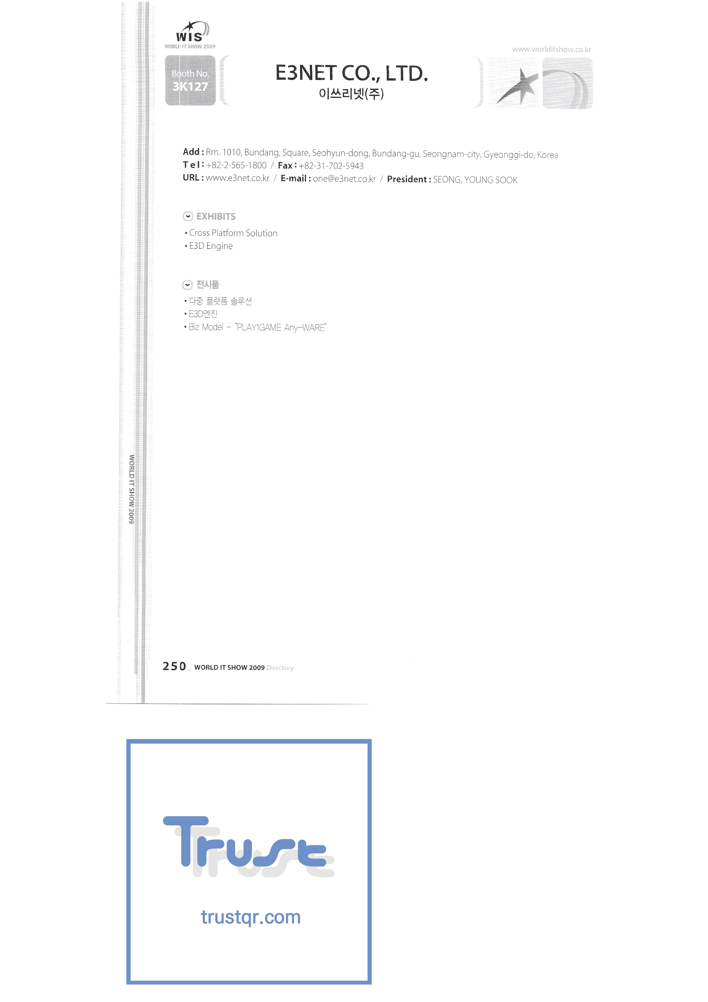 | WORLD IT SHOW 2009-7 Wisjang บริษัท กฎหมายสิทธิบัตรร่วม YHB ยูคยอง ยูโฮสต์บจก. Yujin Robot Co. , Ltd. Zaall Soft Co. , Ltd. XicoAD Co. , Ltd. บจก. อัษฎาล บจก. บิ๊กไอเอ็นเตอร์เทนเม้นท์ มูลนิธิส่งเสริมอุตสาหกรรมวัฒนธรรมชองจู สำนักงานส่งเสริมอุตสาหกรรมวัฒนธรรมชุงนาม บจก. ครอสฟิล์ม บจก. ดิจิตอลโอเอซิส เอ ธ กรีเนตบจก. การต่อเรือ Edu สถาบันวิจัยอิเล็กทรอนิกส์และโทรคมนาคม บริษัท แพนตาล็อกอินเตอร์แอคทีฟ จำกัด สำนักงานส่งเสริมข้อมูลและวัฒนธรรมกังวอน กอล์ฟโซนบจก. กราวิตี้บจก. ฮันซอลดีเค Korea Contents Industry Association บจก. นาคมีเดีย Korea Creative Content Agency Korea Virtual Realization Co. , Ltd. LG CNS Metacon Nsis สมัยใหม่ สพป Next Generation Convergence Contents Industry Association Nexeasy Samsung Electronics |