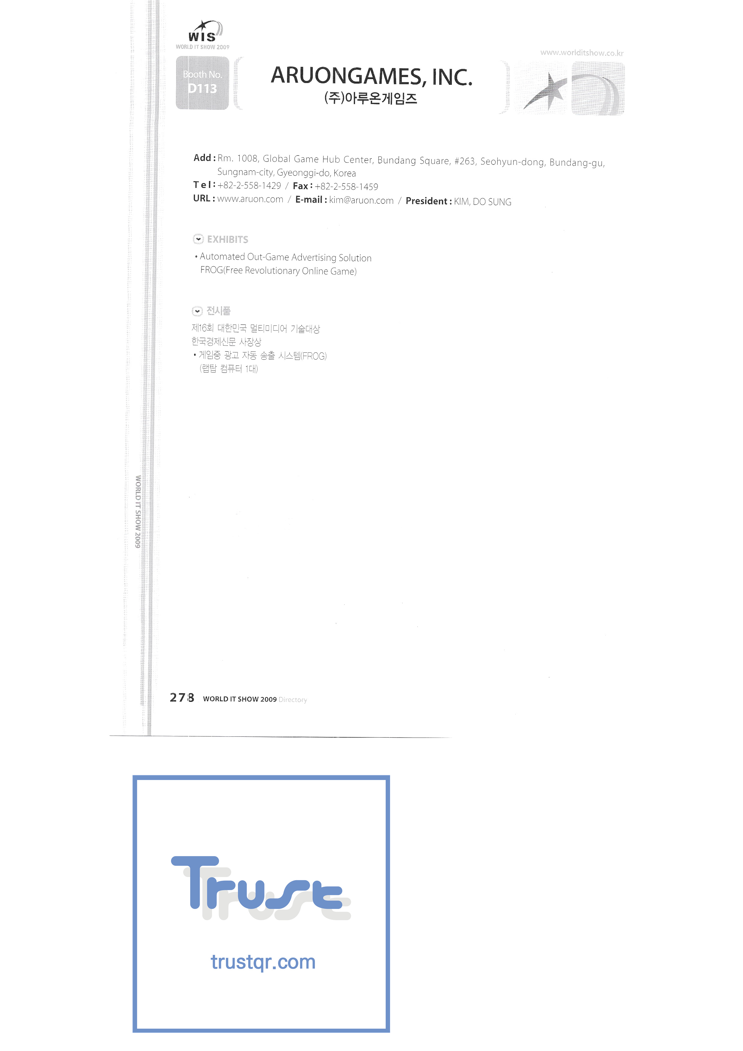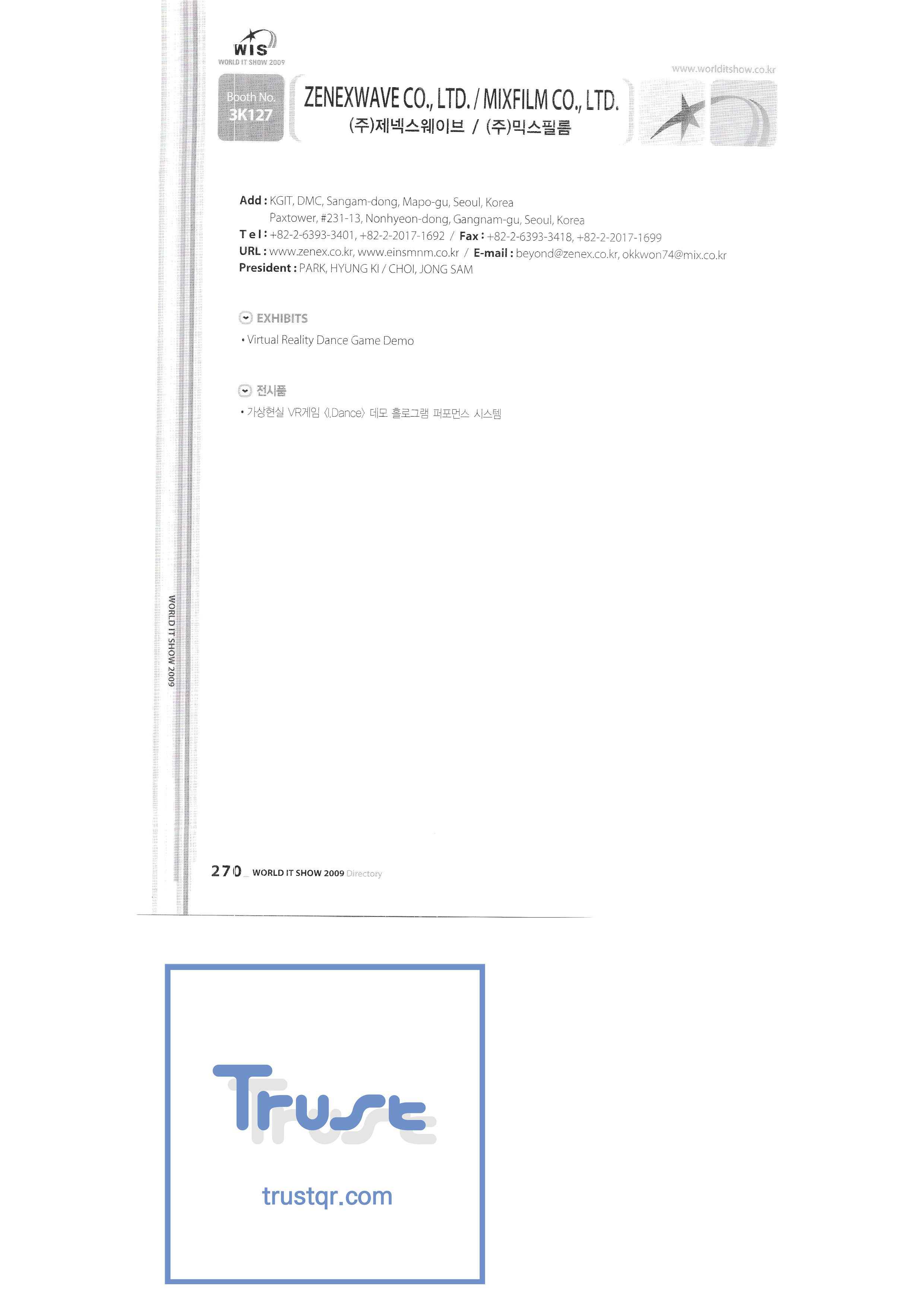 2009-8年世界IT展 欧拉有限公司 Genex Wave有限公司/ Mix电影有限公司 三星电子 LG电子 电视风暴 三星 Onnuri Electronics Co.,Ltd. 拼图切割有限公司 Arion Games Co.,Ltd. Live ABC Co.,Ltd./ PoC Soft Co.,Ltd. |
