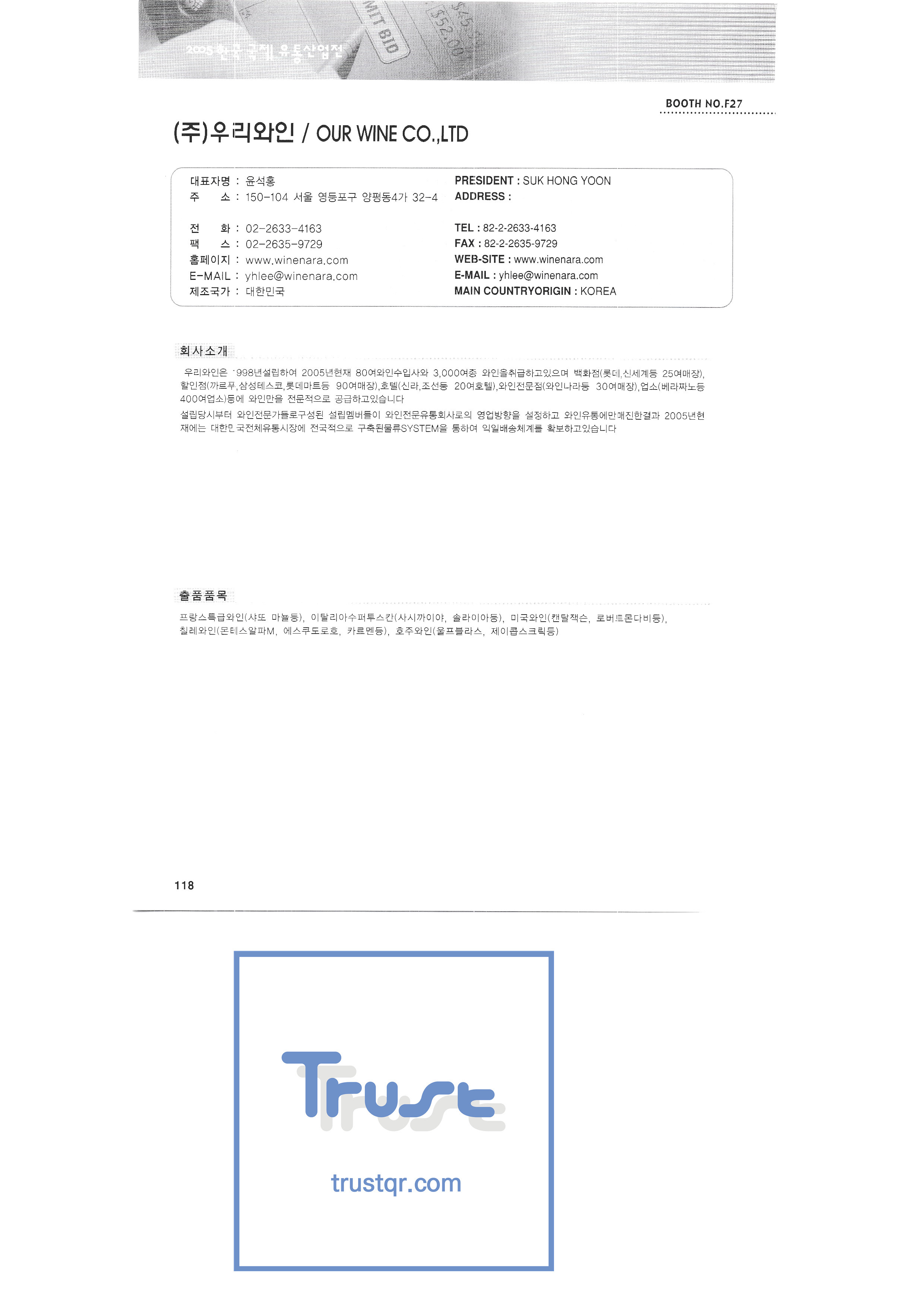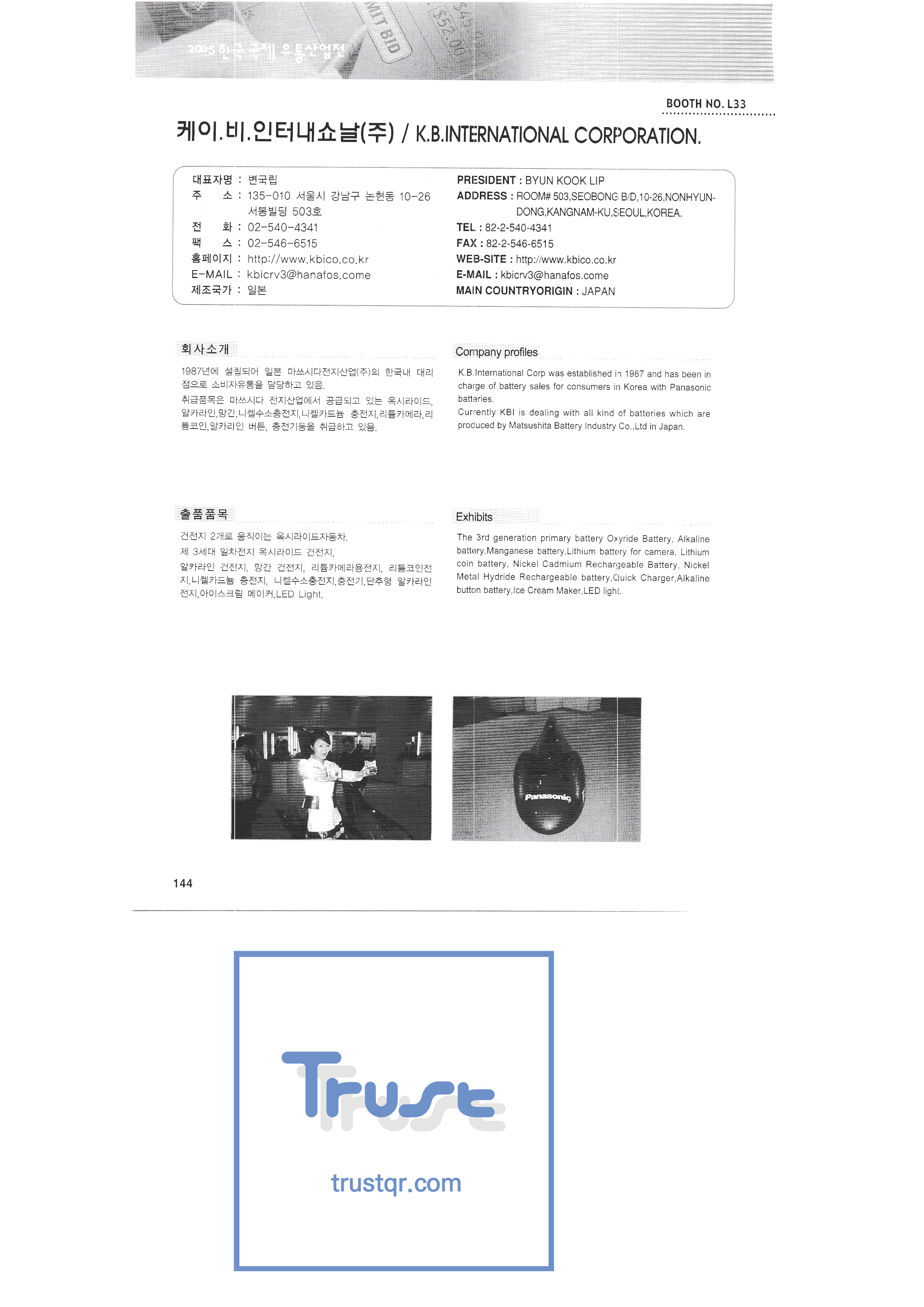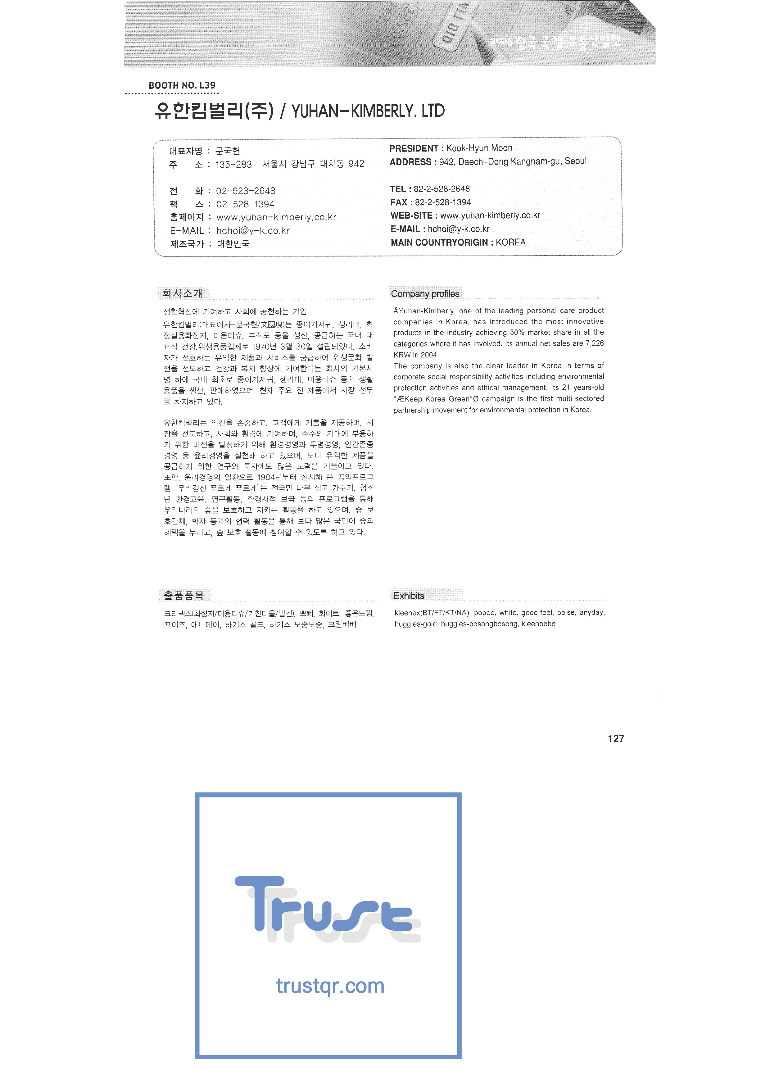 | 2005 한국 국제유통산업전 - 4 오렌지나라 오리온 오비맥주 오픈베이스 옥스포드 옥시레킷벤키저 옥천 우리와인 우성하이텍 우신엔티아이주식회사 월간 식품산업 윙스텍 유니레버코리아 서울지 유니참주식회사 유니코이엔지 유한엠엔시 유한킴벌리 인성캐스터 인터토이 인투텍 일등수산 전원식품 정우교역 제너럴밀스코리아 주식회사 제이엔에프 제주도 주연인트룹 지에스지엠 질레트코리아(유) 천하종합 첨단 청산유통 카렐코리아 케이.비.인터내쇼날 케이에스넷 케이제이지엘에스 케이티 코텍전자 코튼클럽 |