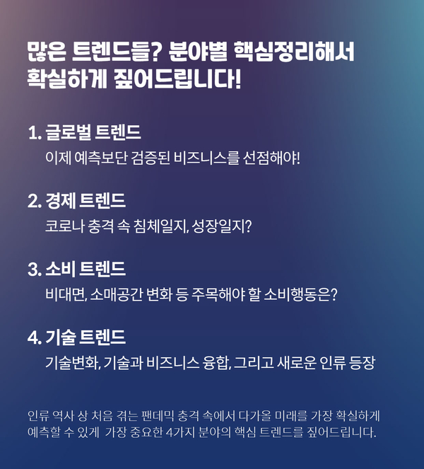 비즈니스 트렌드는 많은 기회와 영감을 제시합니다. 그중 해외, 경제, 소비, 기술 트렌드는 현재의 위기 극복과 미래 예측에 많은 도움이 됩니다.