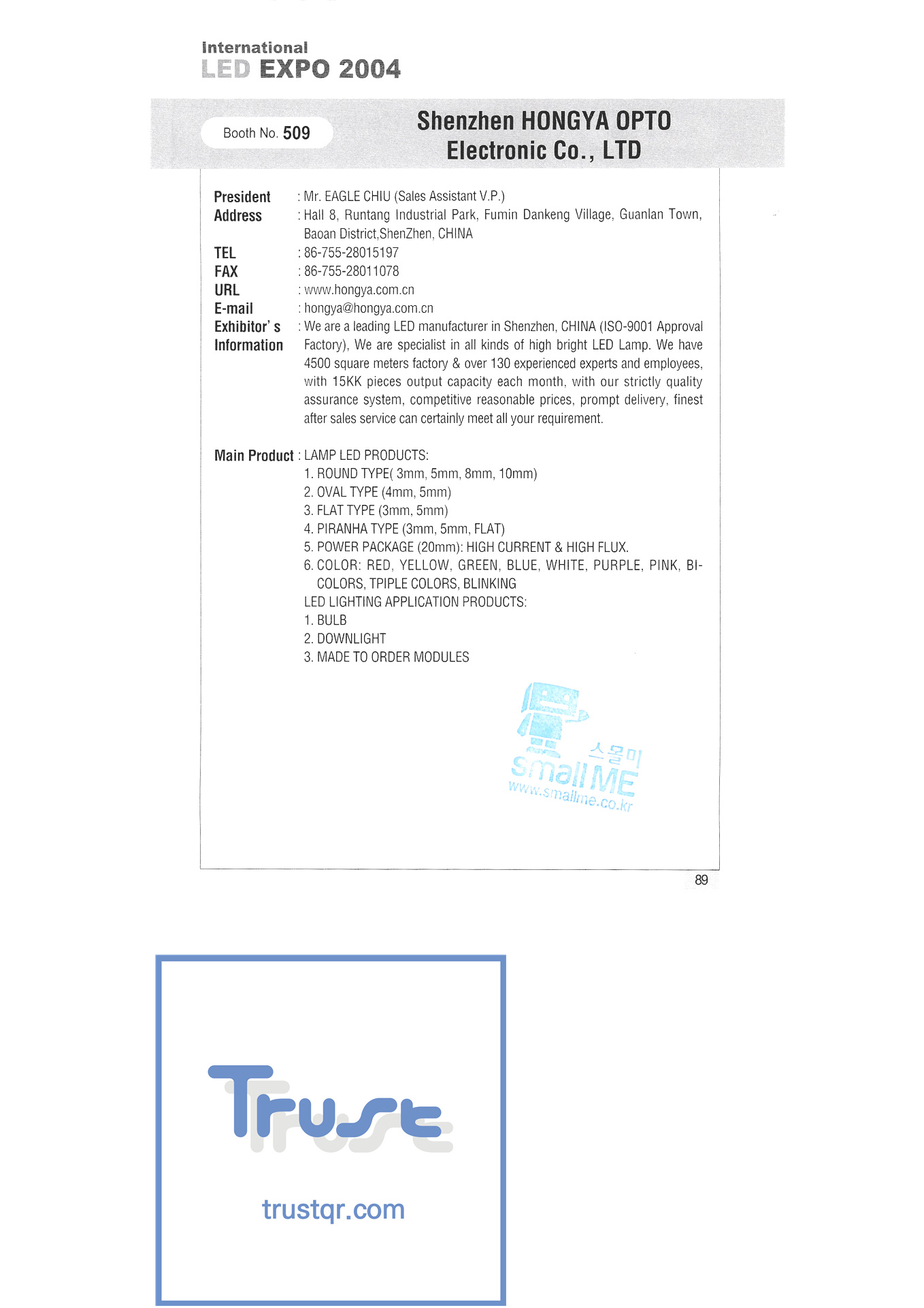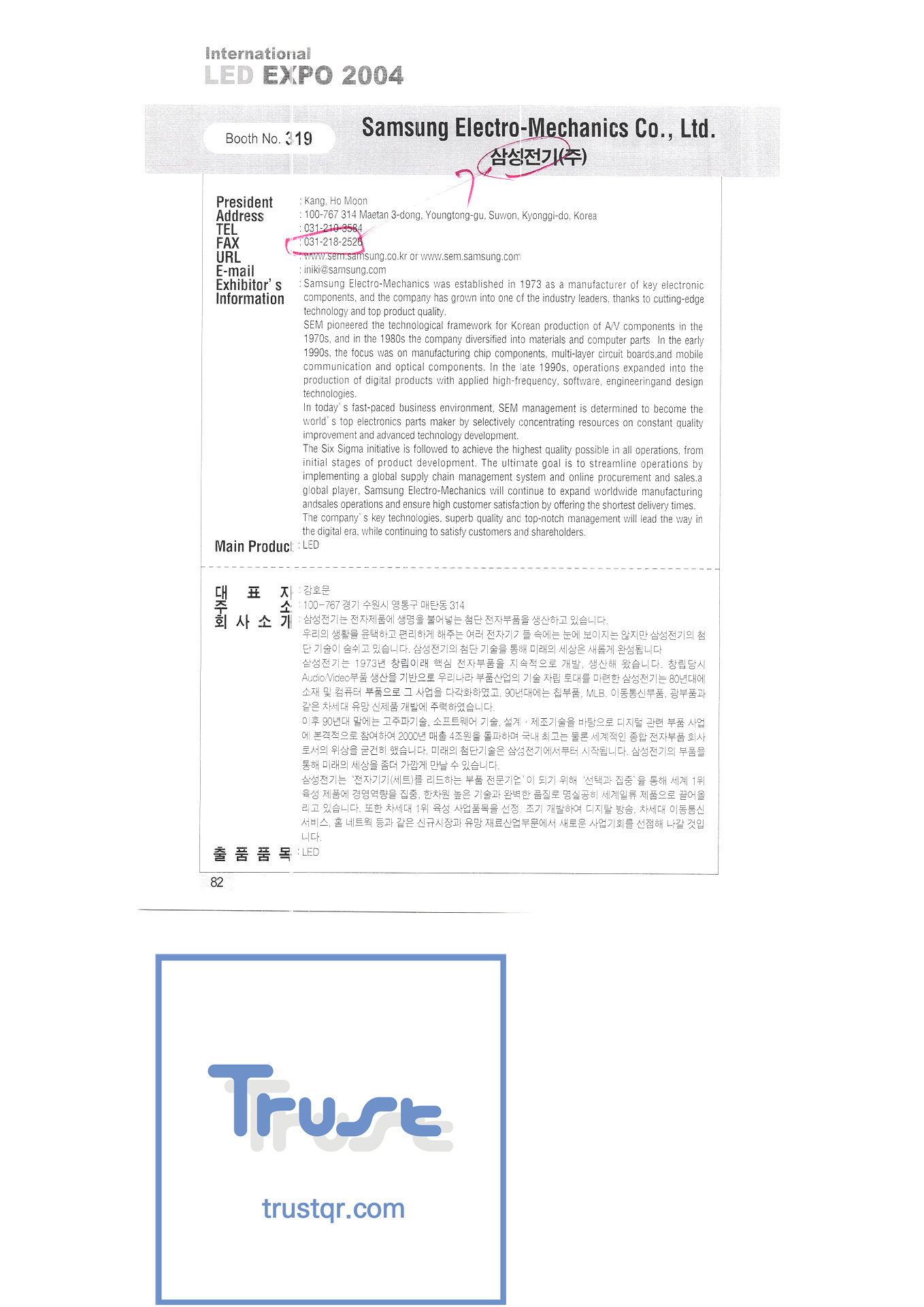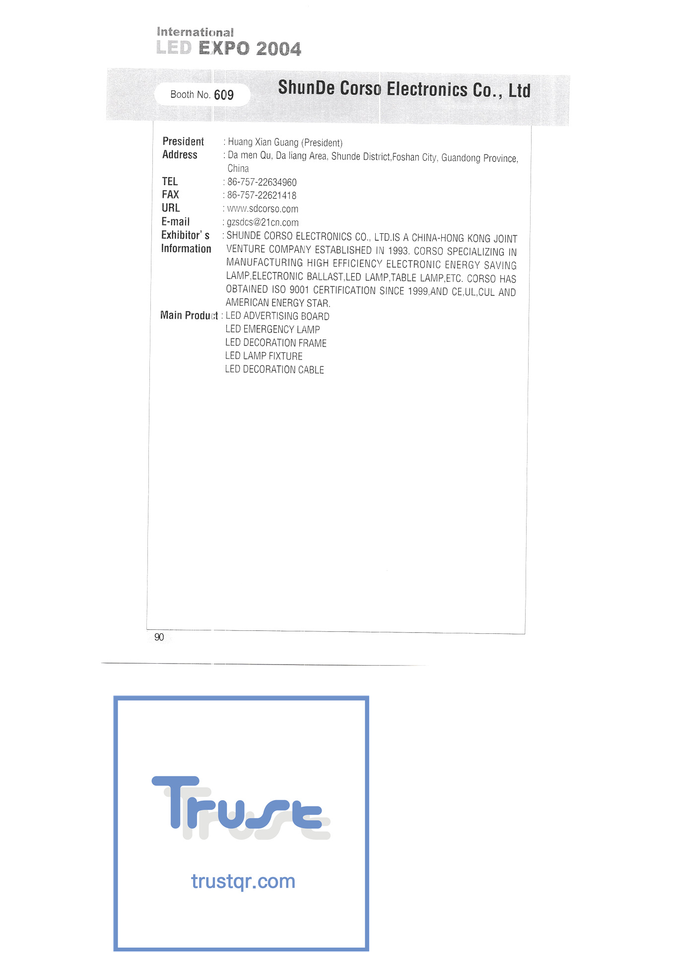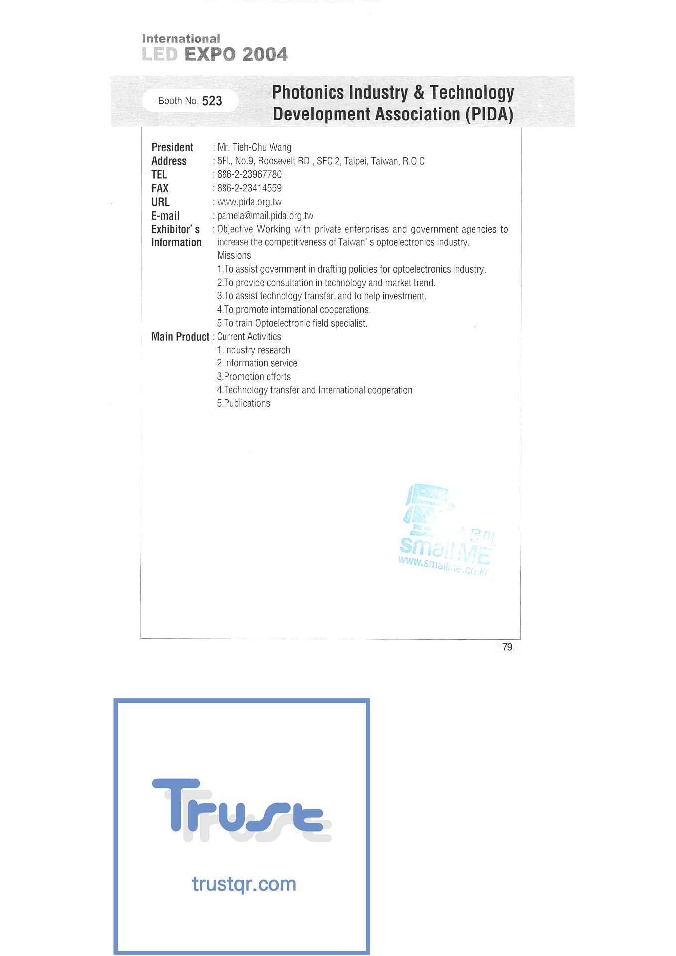 | "อุตสาหกรรมและเทคโนโลยีโฟโตนิกส์ สมาคมพัฒนาฯ (PIDA)” POPSIGN บจก. บจก. สายร่อน Samsung Electro-Mechanics เซมิคอน Semyung Ever Energy SHARP LIGHT OPTO ELECTRONICS Co. , Ltd "เสินเจิ้นเป๊ปนิซออป บริษัท อิเลคโทรนิคส์เทคโนโลยี จำกัด " เซินเจิ้น BOE Intelligent Display Technology Co. , Ltd "แหล่งกำเนิดแสงพระจันทร์สีทองเซินเจิ้น บริษัท เทคโนโลยีพัฒนา จำกัด " เซินเจิ้น HONGYA OPTO Electronic Co. , Ltd ShunDe Corso Electronics Co. , Ltd ลงชื่อ Telecom บริษัท ชินโกะ จำกัด SNU Precision Co. , Ltd. บริษัท ซันนี่เทคเทรดดิ้ง จำกัด แทจง E.S.T. บริษัท ไต้หวันโอเอซิสเทคโนโลยี จำกัด เทคเวิลด์บจก. Territech มุ้ง Tongzhou Puri Lighting Co. , Ltd บจก. ทีเอสอี บจก. ทีเอสทีเน็ตเวิร์ค Bitsaem Electronics Co. , Ltd. | “光子产业与技术 发展协会(PIDA)” POPSIGN有限公司 赛隆有限公司 三星机电 半导体 世明永恒能源 夏普光电光电有限公司 “深圳Pepnice光电 电子科技有限公司” 深圳市京东方智能显示技术有限公司 “深圳金月亮光源 科技发展有限公司” 深圳市鸿亚光电电子有限公司 顺德科索电子有限公司 签约电信 新光株式会社 SNU Precision Co.,Ltd. 阳光科技贸易有限公司 太宗E.S.T. 台湾绿洲科技股份有限公司 科技世界有限公司 Territech 网队 通州普立照明有限公司 TSE有限公司 尖沙咀网络有限公司 Bitsaem电子有限公司 |