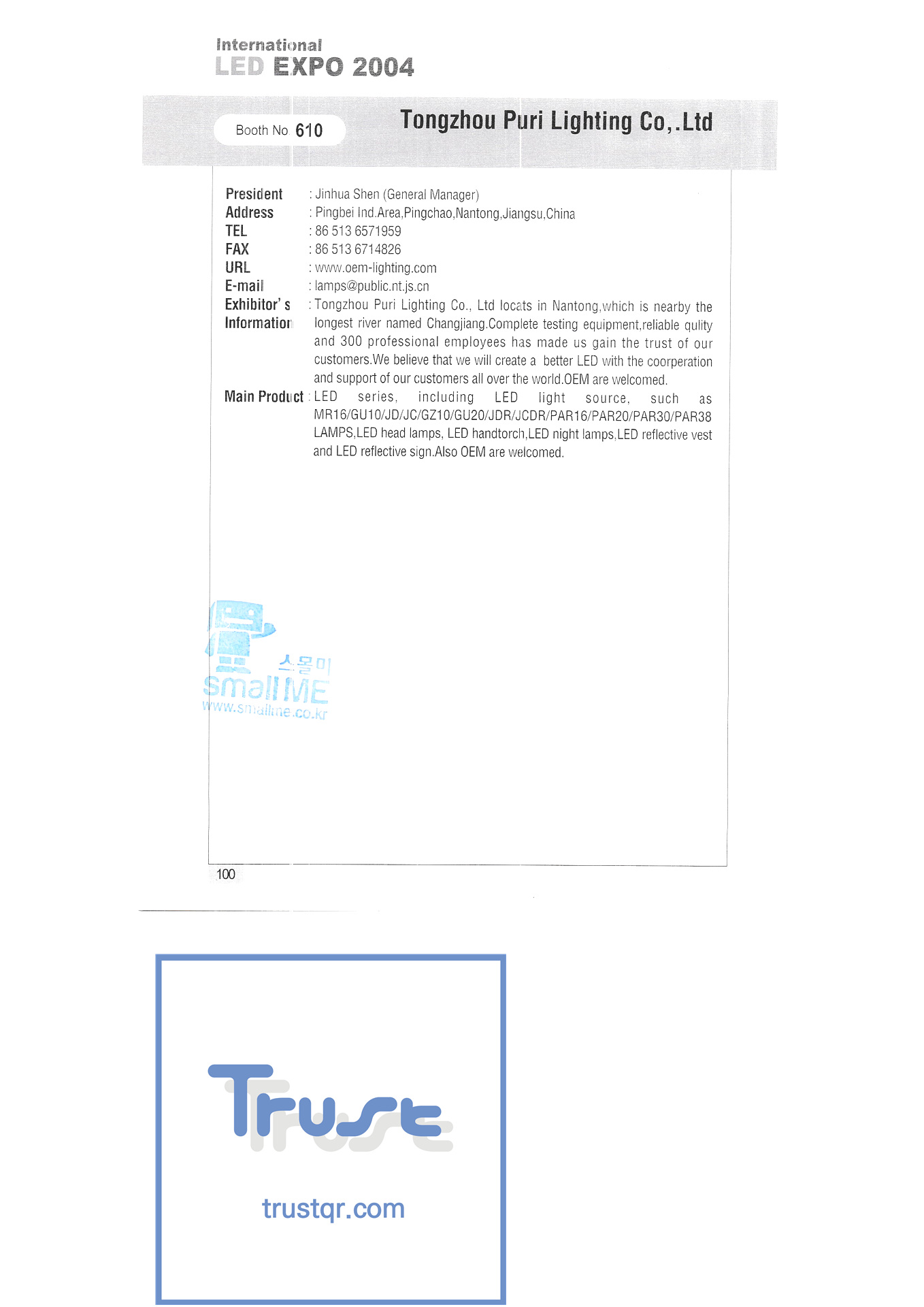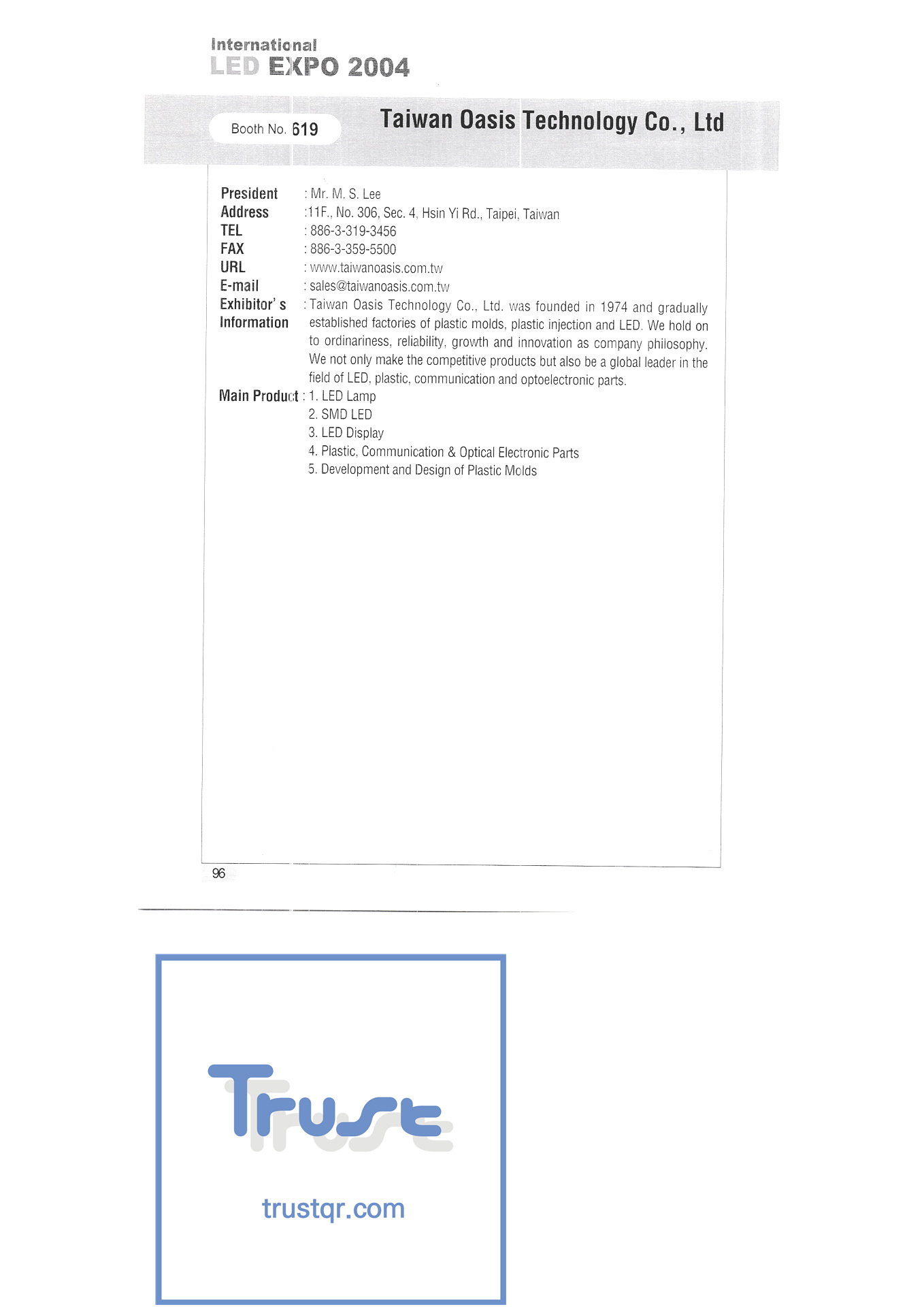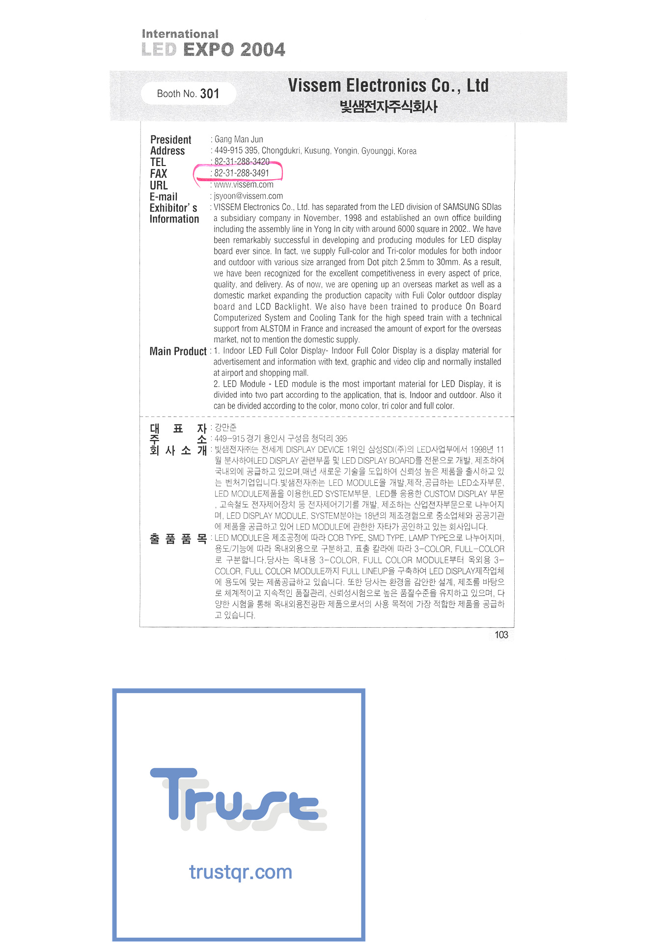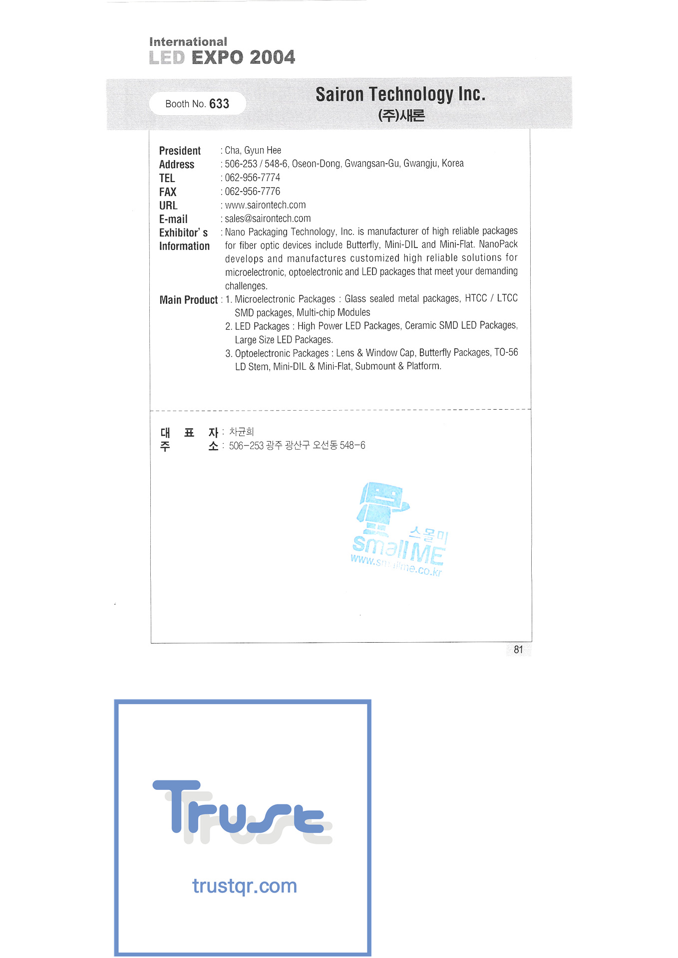 | "อุตสาหกรรมและเทคโนโลยีโฟโตนิกส์ สมาคมพัฒนาฯ (PIDA)” POPSIGN บจก. บจก. สายร่อน Samsung Electro-Mechanics เซมิคอน Semyung Ever Energy SHARP LIGHT OPTO ELECTRONICS Co. , Ltd "เสินเจิ้นเป๊ปนิซออป บริษัท อิเลคโทรนิคส์เทคโนโลยี จำกัด " เซินเจิ้น BOE Intelligent Display Technology Co. , Ltd "แหล่งกำเนิดแสงพระจันทร์สีทองเซินเจิ้น บริษัท เทคโนโลยีพัฒนา จำกัด " เซินเจิ้น HONGYA OPTO Electronic Co. , Ltd ShunDe Corso Electronics Co. , Ltd ลงชื่อ Telecom บริษัท ชินโกะ จำกัด SNU Precision Co. , Ltd. บริษัท ซันนี่เทคเทรดดิ้ง จำกัด แทจง E.S.T. บริษัท ไต้หวันโอเอซิสเทคโนโลยี จำกัด เทคเวิลด์บจก. Territech มุ้ง Tongzhou Puri Lighting Co. , Ltd บจก. ทีเอสอี บจก. ทีเอสทีเน็ตเวิร์ค Bitsaem Electronics Co. , Ltd. | “光子产业与技术 发展协会(PIDA)” POPSIGN有限公司 赛隆有限公司 三星机电 半导体 世明永恒能源 夏普光电光电有限公司 “深圳Pepnice光电 电子科技有限公司” 深圳市京东方智能显示技术有限公司 “深圳金月亮光源 科技发展有限公司” 深圳市鸿亚光电电子有限公司 顺德科索电子有限公司 签约电信 新光株式会社 SNU Precision Co.,Ltd. 阳光科技贸易有限公司 太宗E.S.T. 台湾绿洲科技股份有限公司 科技世界有限公司 Territech 网队 通州普立照明有限公司 TSE有限公司 尖沙咀网络有限公司 Bitsaem电子有限公司 |