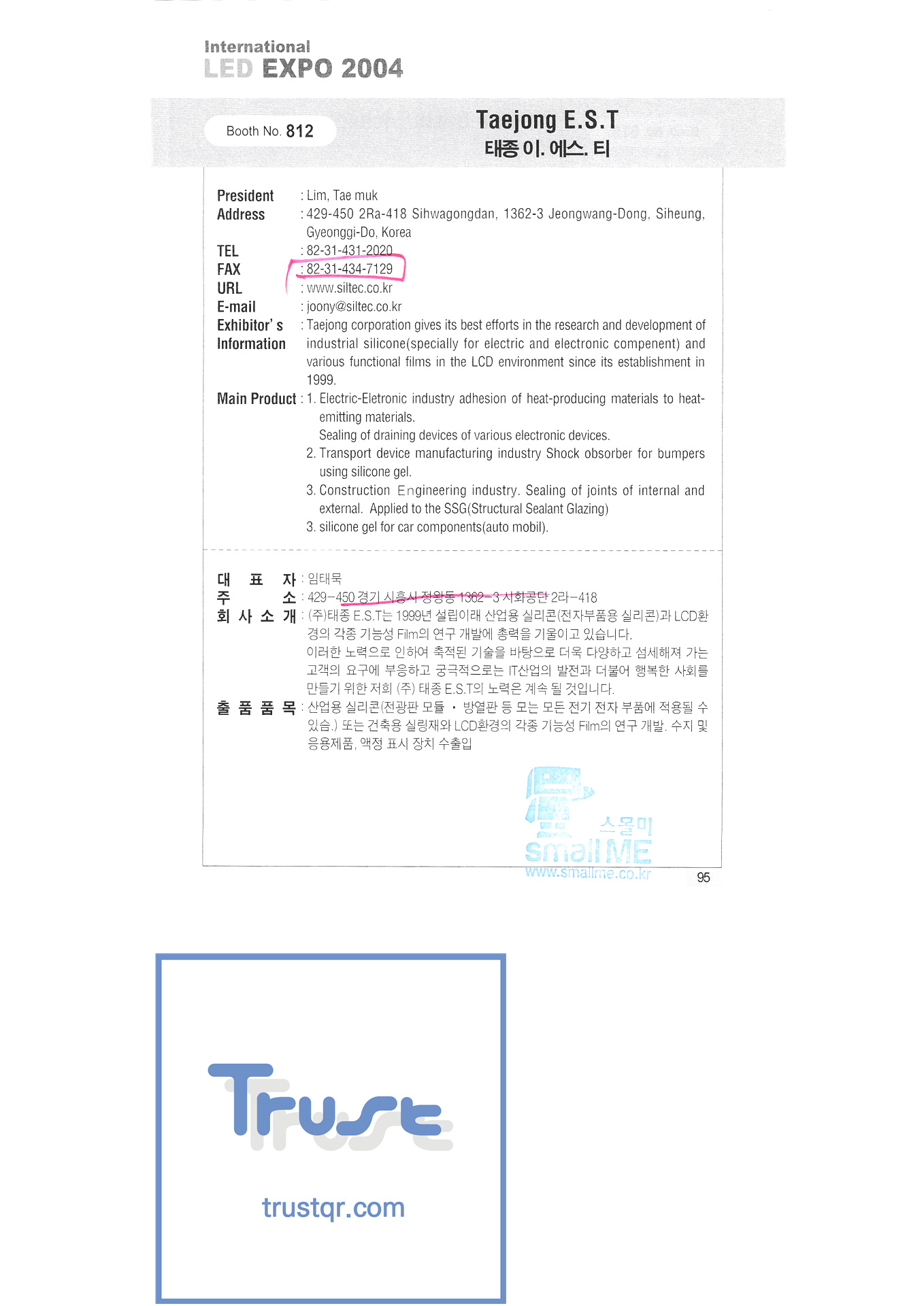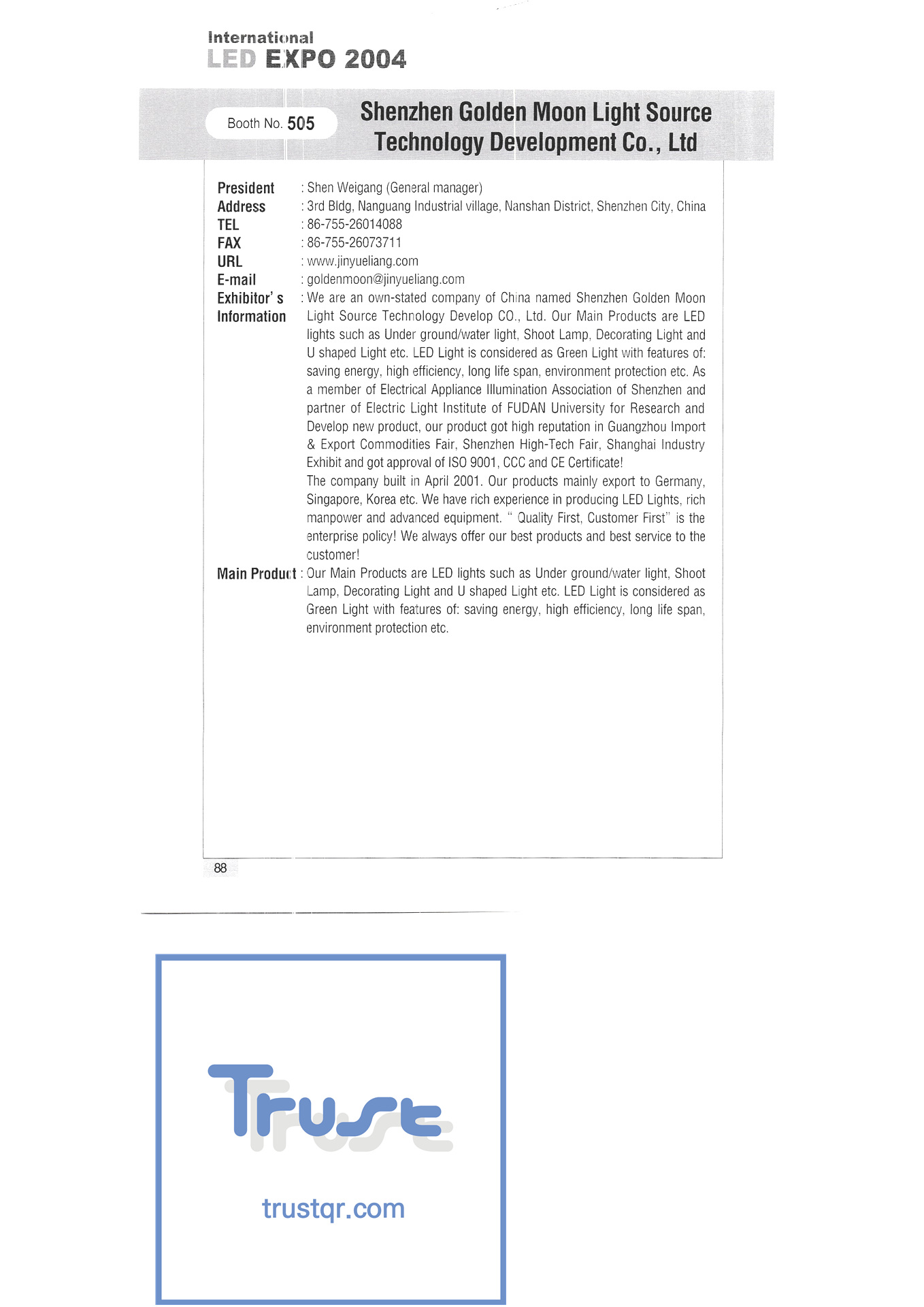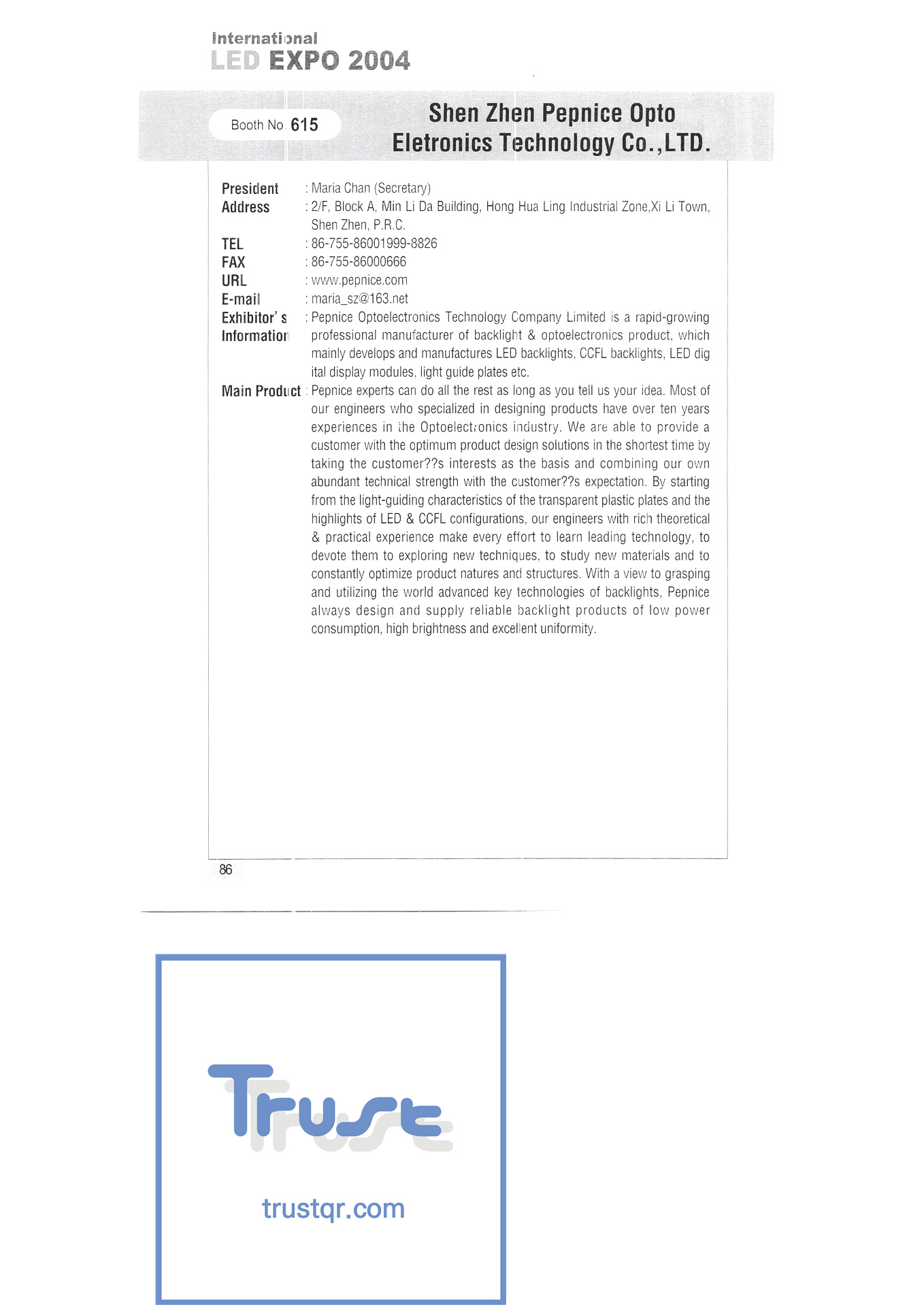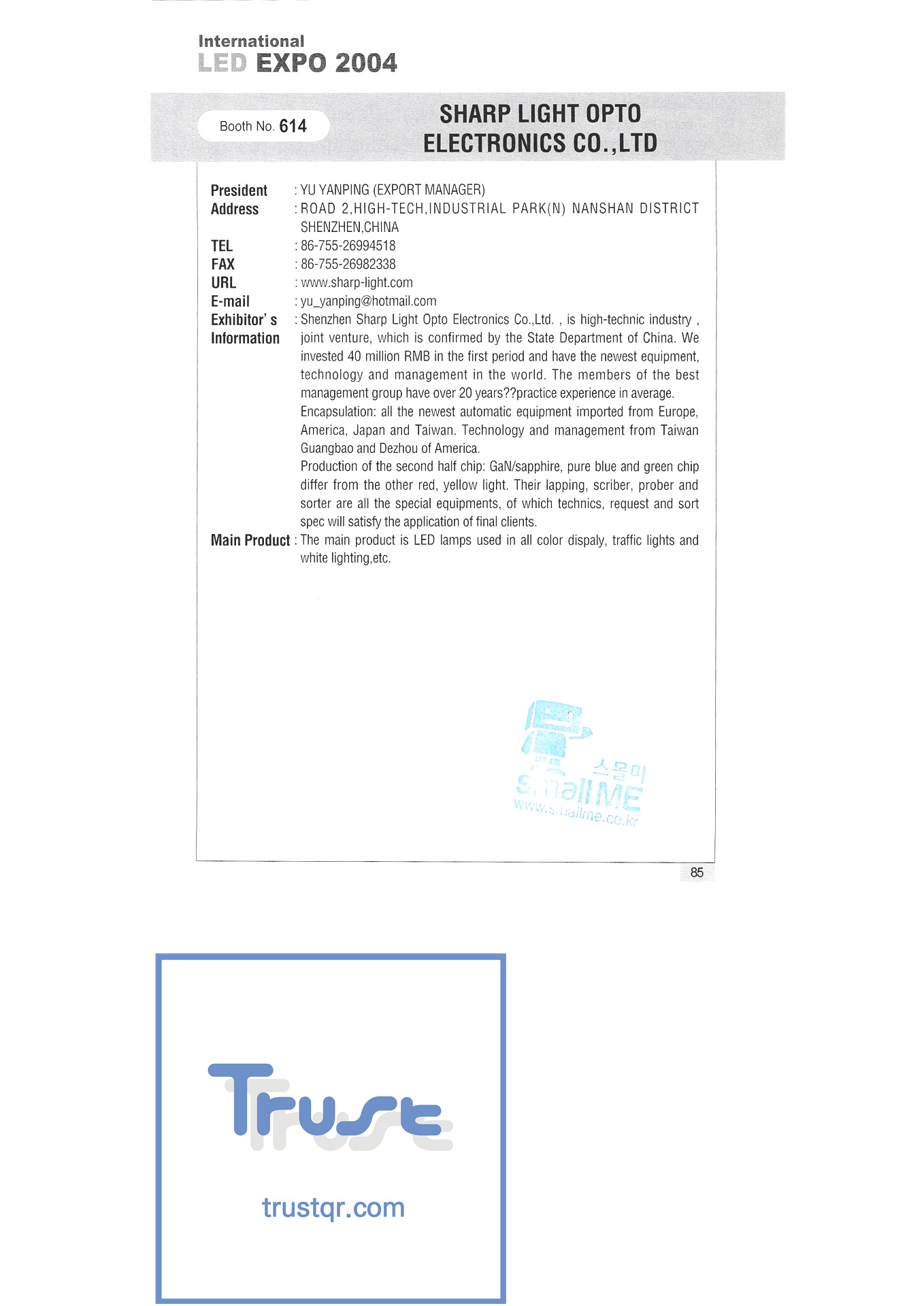 | "อุตสาหกรรมและเทคโนโลยีโฟโตนิกส์ สมาคมพัฒนาฯ (PIDA)” POPSIGN บจก. บจก. สายร่อน Samsung Electro-Mechanics เซมิคอน Semyung Ever Energy SHARP LIGHT OPTO ELECTRONICS Co. , Ltd "เสินเจิ้นเป๊ปนิซออป บริษัท อิเลคโทรนิคส์เทคโนโลยี จำกัด " เซินเจิ้น BOE Intelligent Display Technology Co. , Ltd "แหล่งกำเนิดแสงพระจันทร์สีทองเซินเจิ้น บริษัท เทคโนโลยีพัฒนา จำกัด " เซินเจิ้น HONGYA OPTO Electronic Co. , Ltd ShunDe Corso Electronics Co. , Ltd ลงชื่อ Telecom บริษัท ชินโกะ จำกัด SNU Precision Co. , Ltd. บริษัท ซันนี่เทคเทรดดิ้ง จำกัด แทจง E.S.T. บริษัท ไต้หวันโอเอซิสเทคโนโลยี จำกัด เทคเวิลด์บจก. Territech มุ้ง Tongzhou Puri Lighting Co. , Ltd บจก. ทีเอสอี บจก. ทีเอสทีเน็ตเวิร์ค Bitsaem Electronics Co. , Ltd. | “光子产业与技术 发展协会(PIDA)” POPSIGN有限公司 赛隆有限公司 三星机电 半导体 世明永恒能源 夏普光电光电有限公司 “深圳Pepnice光电 电子科技有限公司” 深圳市京东方智能显示技术有限公司 “深圳金月亮光源 科技发展有限公司” 深圳市鸿亚光电电子有限公司 顺德科索电子有限公司 签约电信 新光株式会社 SNU Precision Co.,Ltd. 阳光科技贸易有限公司 太宗E.S.T. 台湾绿洲科技股份有限公司 科技世界有限公司 Territech 网队 通州普立照明有限公司 TSE有限公司 尖沙咀网络有限公司 Bitsaem电子有限公司 |
