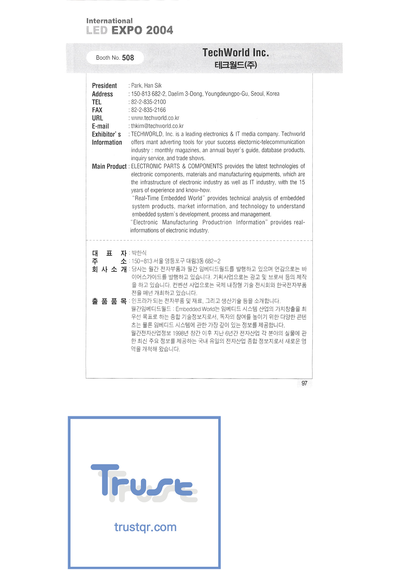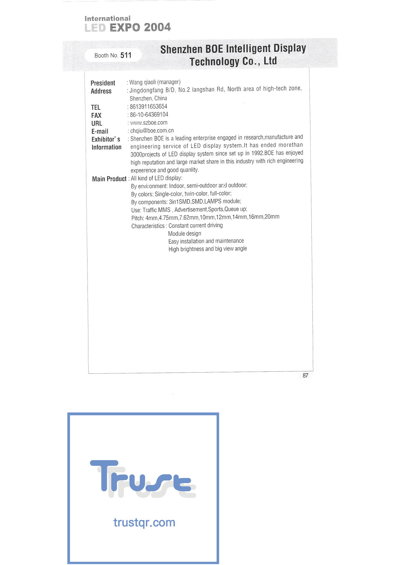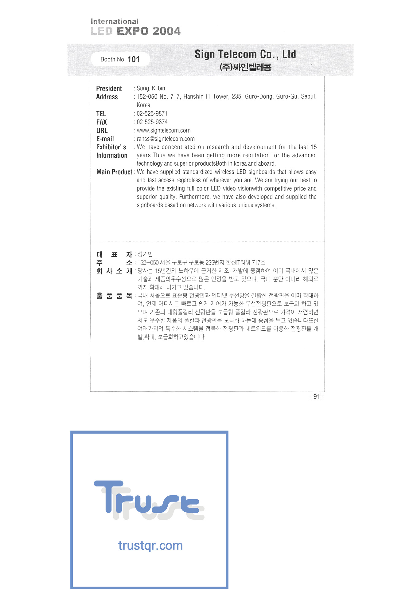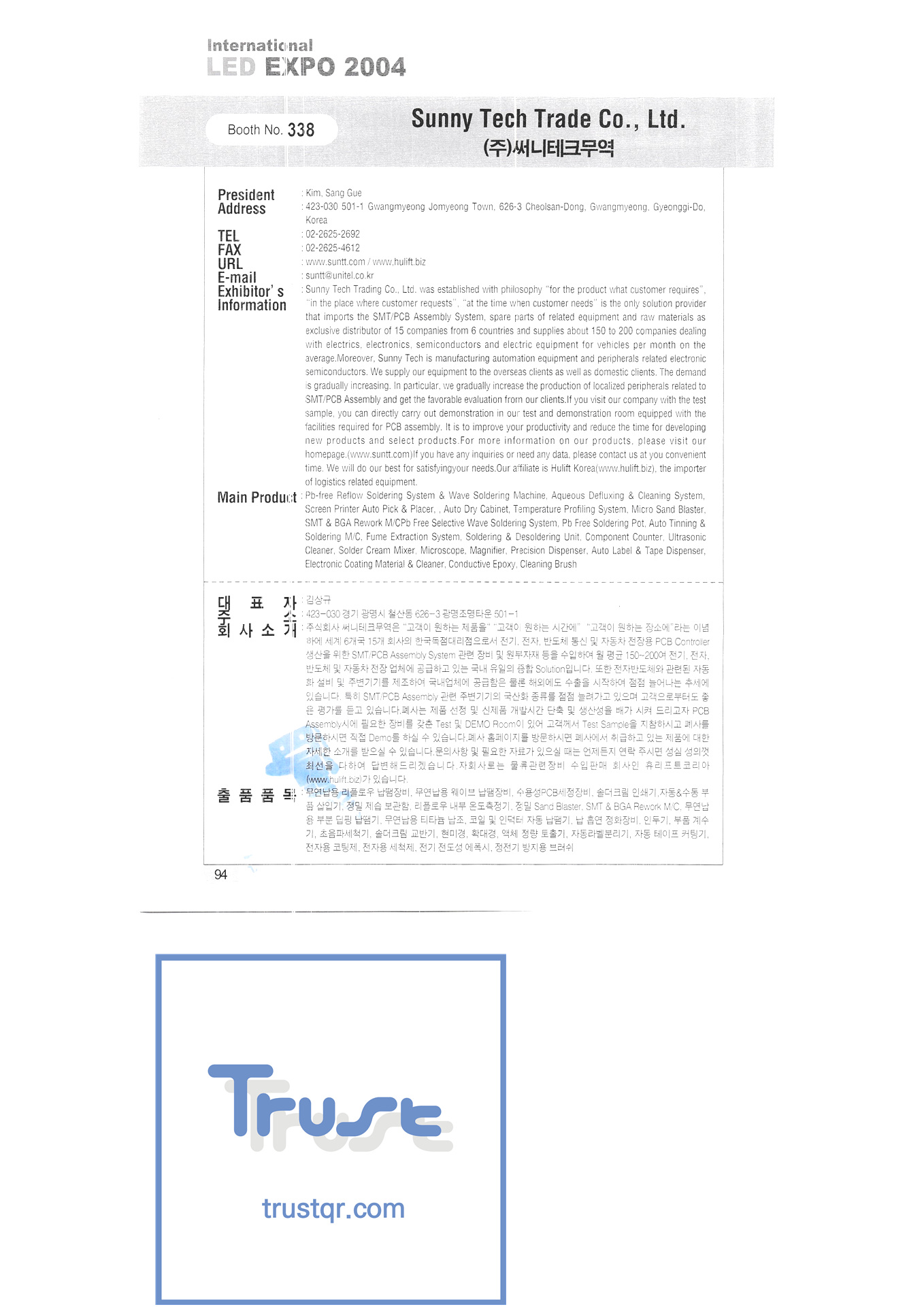 | "อุตสาหกรรมและเทคโนโลยีโฟโตนิกส์ สมาคมพัฒนาฯ (PIDA)” POPSIGN บจก. บจก. สายร่อน Samsung Electro-Mechanics เซมิคอน Semyung Ever Energy SHARP LIGHT OPTO ELECTRONICS Co. , Ltd "เสินเจิ้นเป๊ปนิซออป บริษัท อิเลคโทรนิคส์เทคโนโลยี จำกัด " เซินเจิ้น BOE Intelligent Display Technology Co. , Ltd "แหล่งกำเนิดแสงพระจันทร์สีทองเซินเจิ้น บริษัท เทคโนโลยีพัฒนา จำกัด " เซินเจิ้น HONGYA OPTO Electronic Co. , Ltd ShunDe Corso Electronics Co. , Ltd ลงชื่อ Telecom บริษัท ชินโกะ จำกัด SNU Precision Co. , Ltd. บริษัท ซันนี่เทคเทรดดิ้ง จำกัด แทจง E.S.T. บริษัท ไต้หวันโอเอซิสเทคโนโลยี จำกัด เทคเวิลด์บจก. Territech มุ้ง Tongzhou Puri Lighting Co. , Ltd บจก. ทีเอสอี บจก. ทีเอสทีเน็ตเวิร์ค Bitsaem Electronics Co. , Ltd. | “光子产业与技术 发展协会(PIDA)” POPSIGN有限公司 赛隆有限公司 三星机电 半导体 世明永恒能源 夏普光电光电有限公司 “深圳Pepnice光电 电子科技有限公司” 深圳市京东方智能显示技术有限公司 “深圳金月亮光源 科技发展有限公司” 深圳市鸿亚光电电子有限公司 顺德科索电子有限公司 签约电信 新光株式会社 SNU Precision Co.,Ltd. 阳光科技贸易有限公司 太宗E.S.T. 台湾绿洲科技股份有限公司 科技世界有限公司 Territech 网队 通州普立照明有限公司 TSE有限公司 尖沙咀网络有限公司 Bitsaem电子有限公司 |