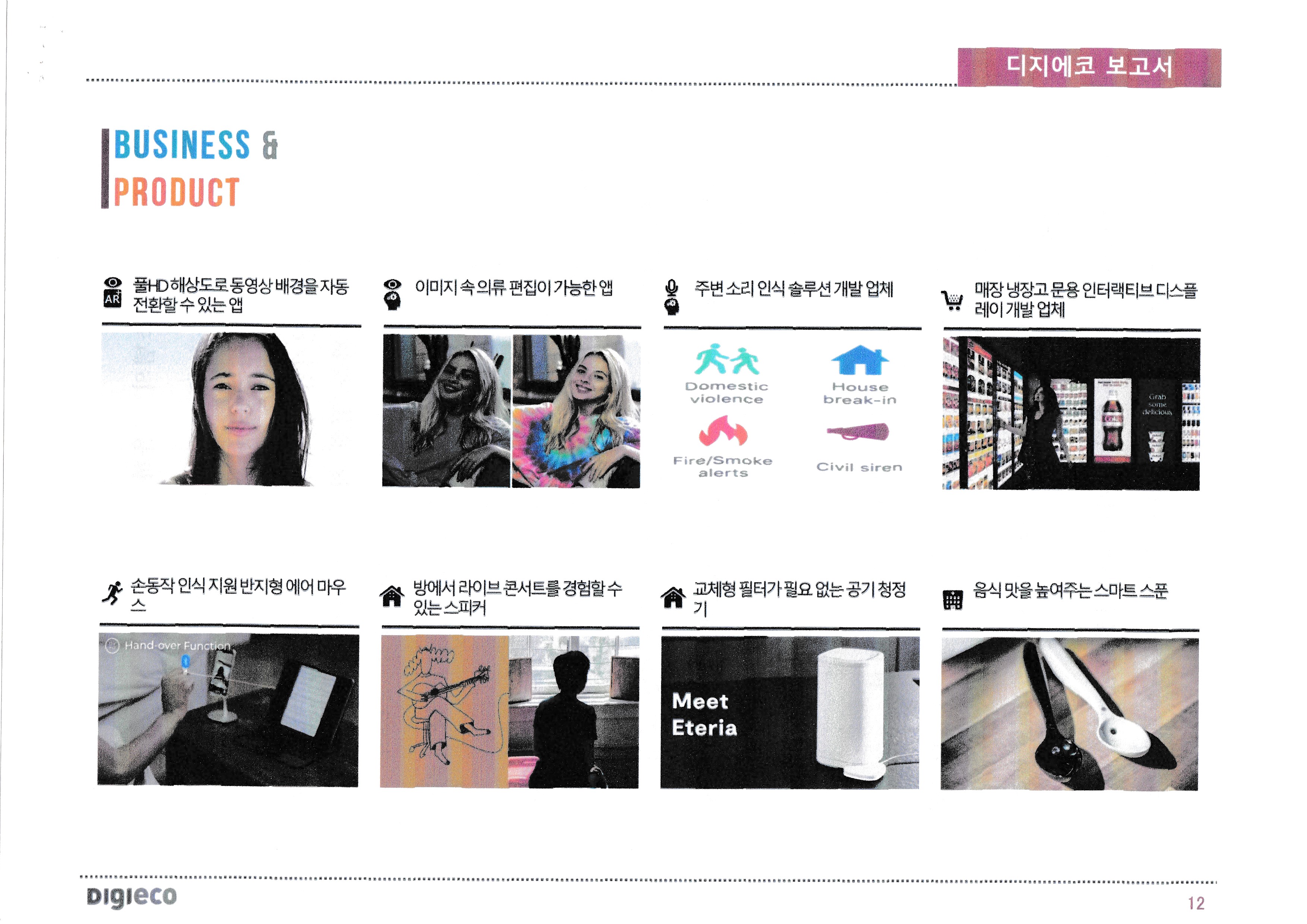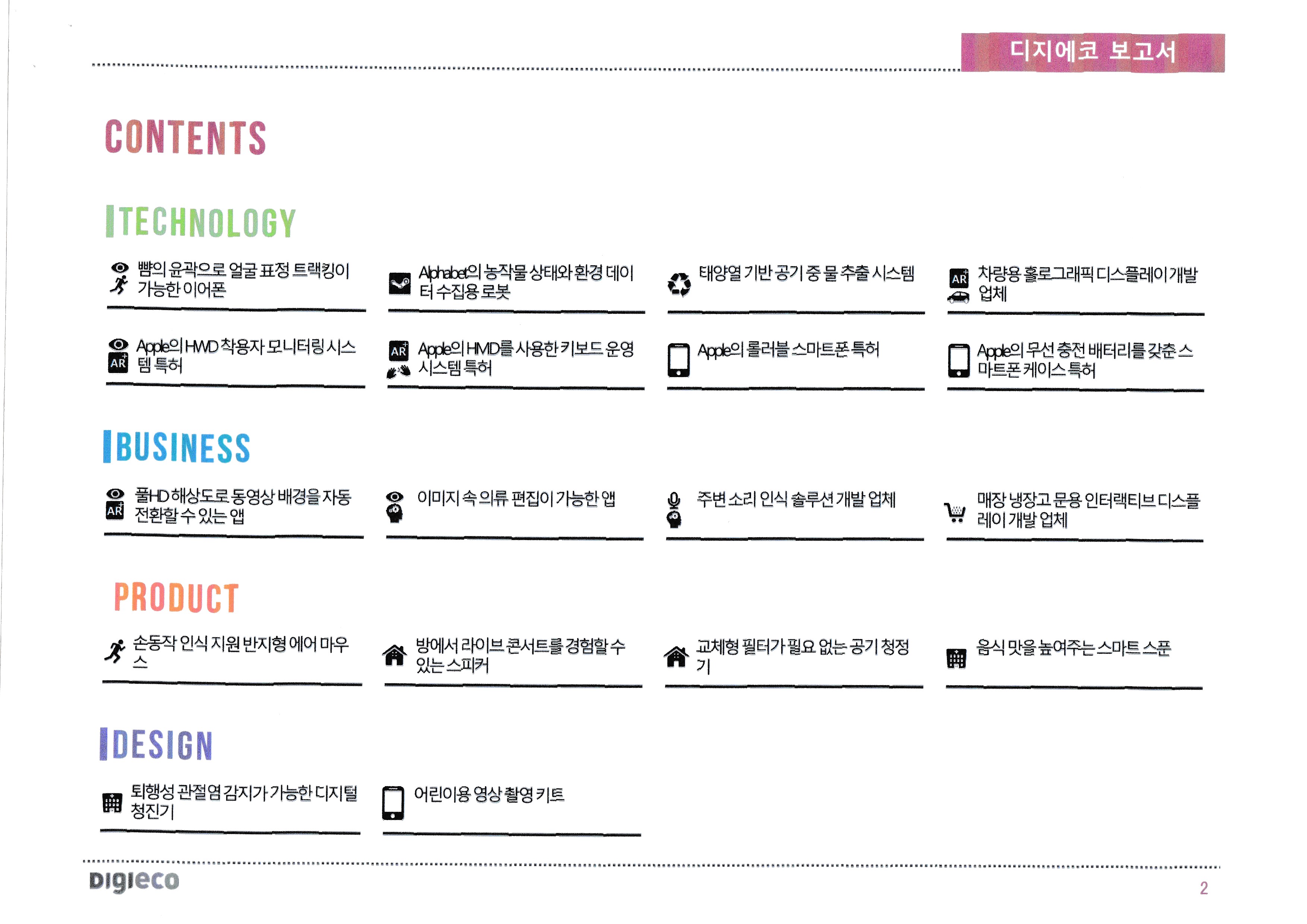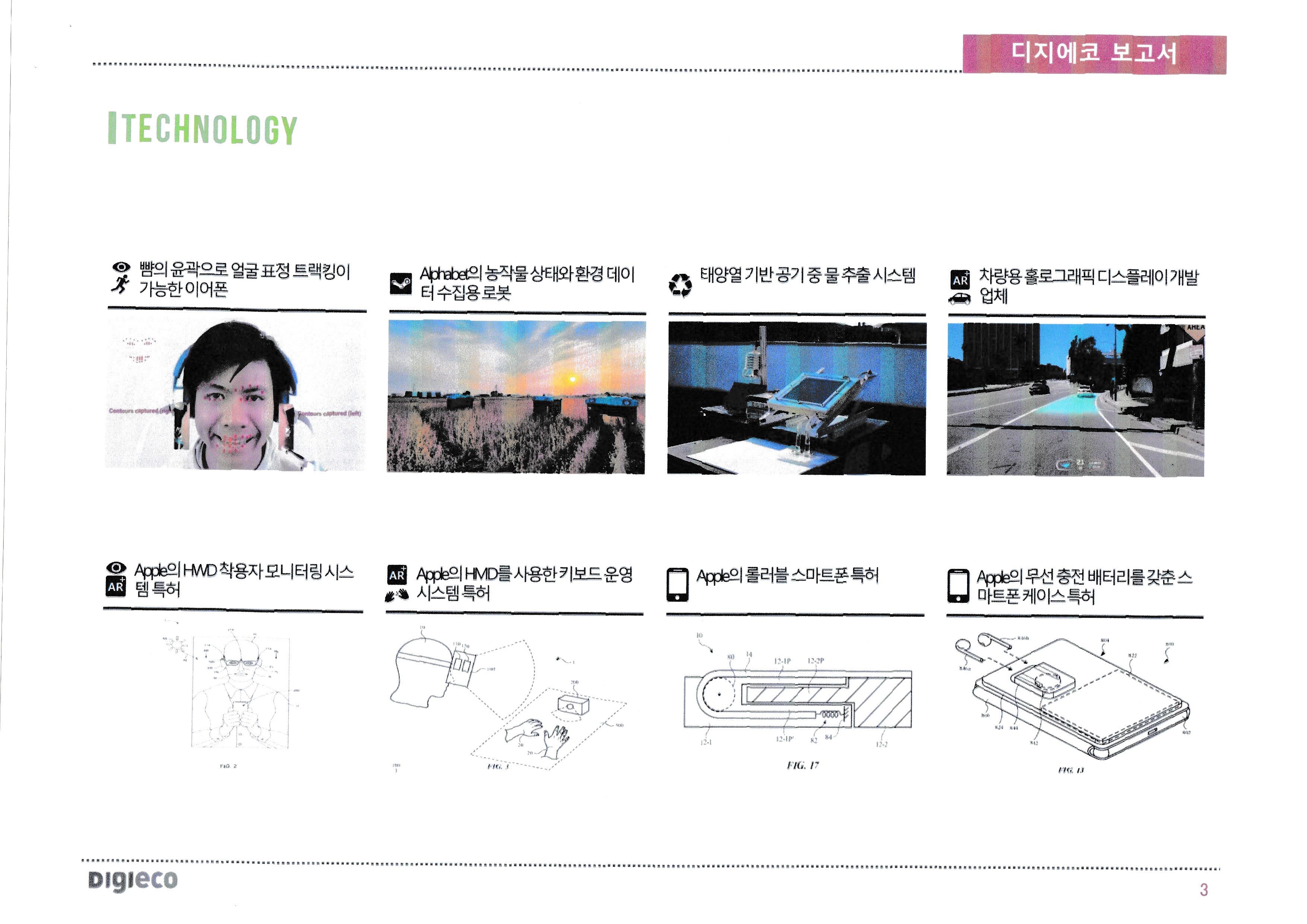 | 뺨 윤곽으로 얼굴표정 트래킹 가능한 이어폰, 농작물상태, 환경데이터 수집용 로봇, 태양열기반 공기중 물 추출 시스템 ★★★★★ 차량용 홀로그래픽, 애플, 롤러블 스마트폰, 이미지 속, 의류편집 가능한 앱, 주변 소리 인식 솔루션 개발업체, 냉장고 문, 인터랙티브 디스플레이, |