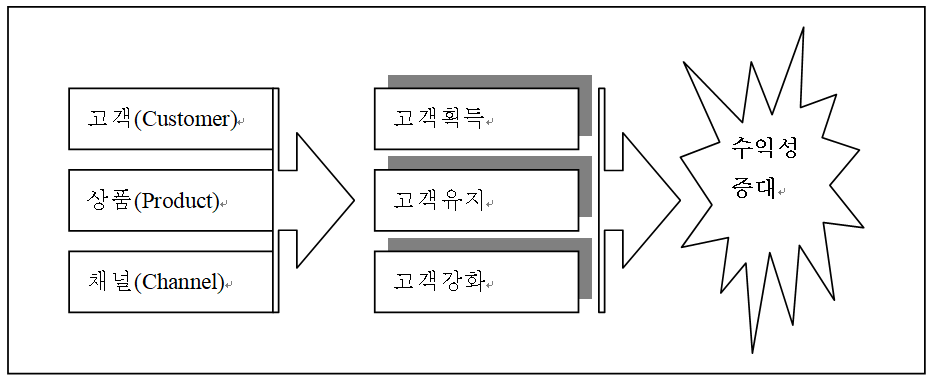 ▶신규 고객획득, 기존고객 유지 및 고객수익성을 증대시키기 위하여 지속적 커뮤니케이션을 통해 고객행동을 이해하고 구매행동에 영향을 주기 위한 광범위한 접근이다.
