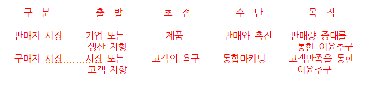 ① 고객지향주의: 소비자 욕구의 발견 및 창조, 표적시장의 탐색, 마케팅 전략의 차 별화와 같은 관리적 요소들이 고려되어야 하고, 기업관리자나 최고경영자의 사고 도 판매지향에서 고객중심으로 바뀌어야 한다.