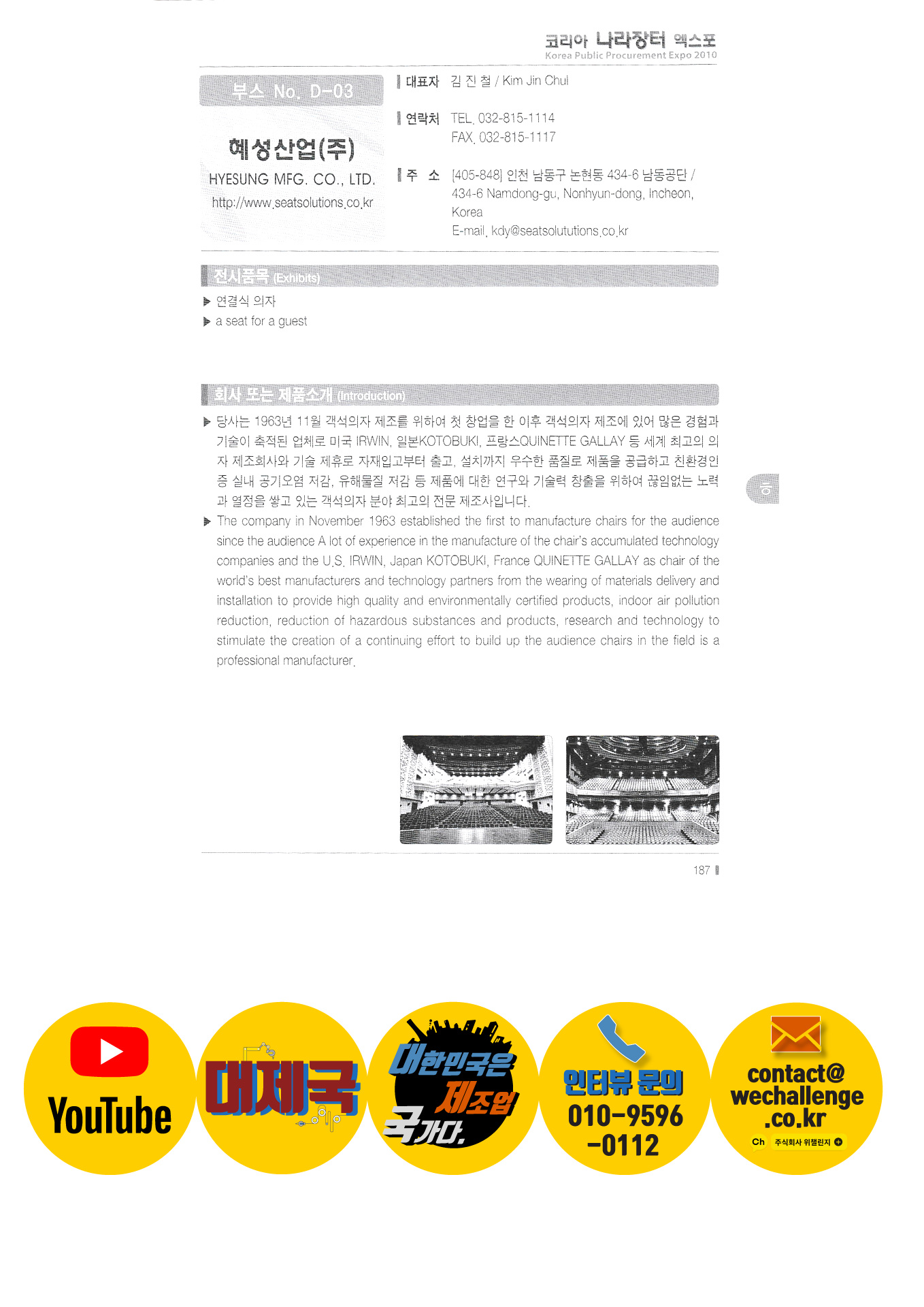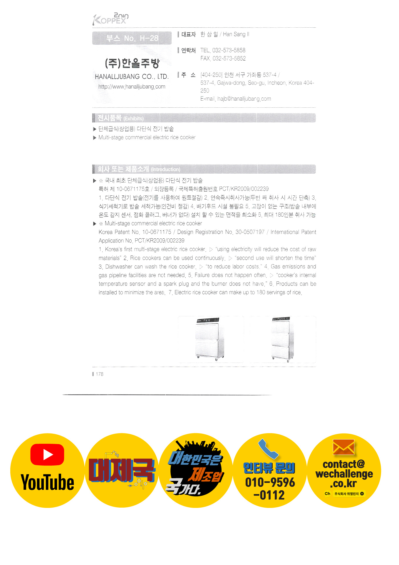Korea Oki Systems Co., Ltd. Korea Frau Daechang Industry Korea Fiber Co., Ltd. Hanmac IPS Hansam Co., Ltd. Hanyang Engineering Co., Ltd. Hanol Kitchen Co., Ltd. Hanil Electric Hanjin Tech Co., Ltd. Hap Plus Haegwang Ad Housing Management Company Overseas market entry hall HEPAS Hepciba Co., Ltd. Hyundai IT Hydeok Co., Ltd. Hyesung Industrial Co., Ltd. Hwayang Heavy Industries Co., Ltd. Fine System Co., Ltd. Earth Love119 DSENG KC Industrial Development Co., Ltd. LG Electronics |