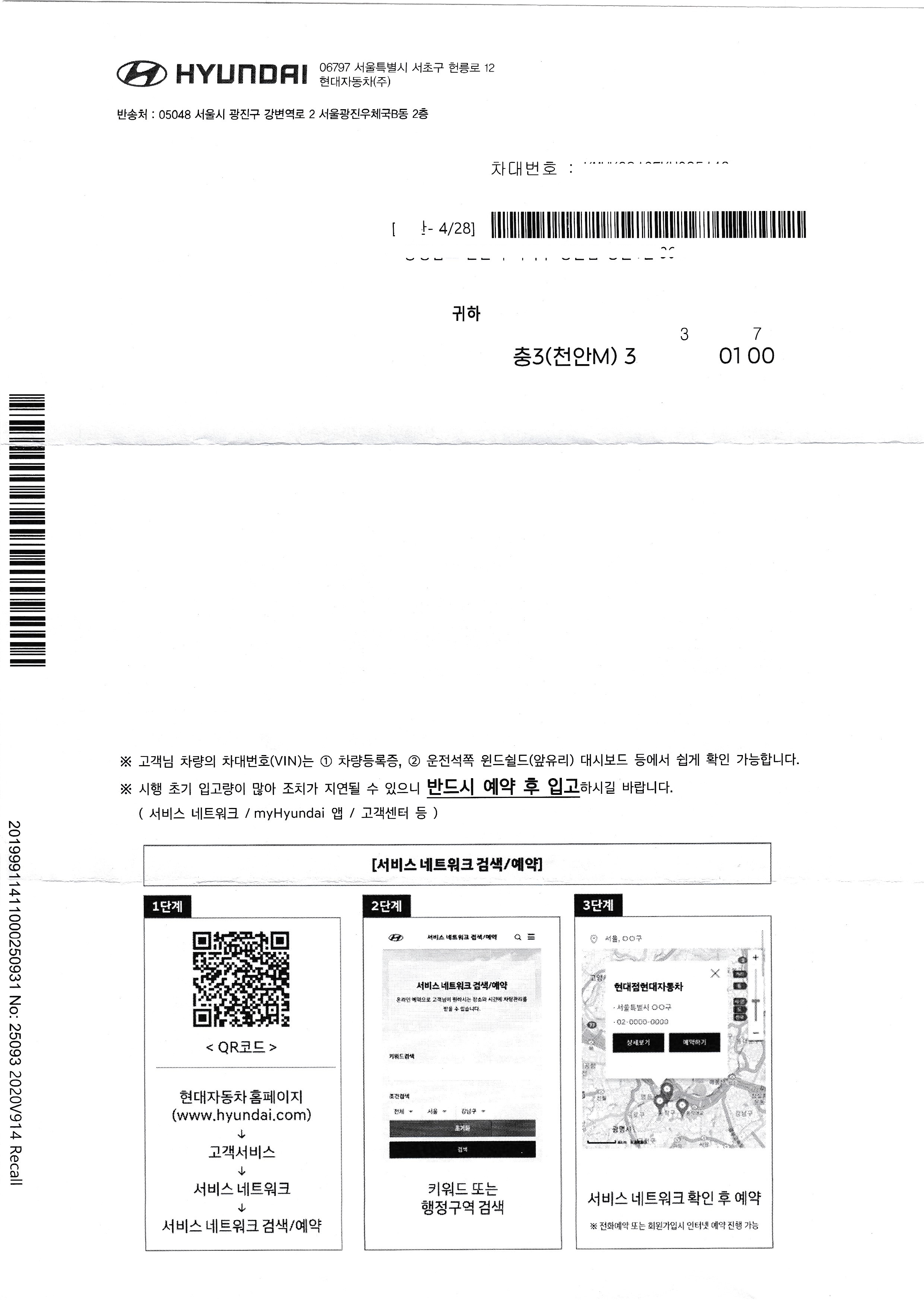 아래 사진은 "전기차 코나.... 동작그만" 하기 직전에 받은 리콜 안내서이다.